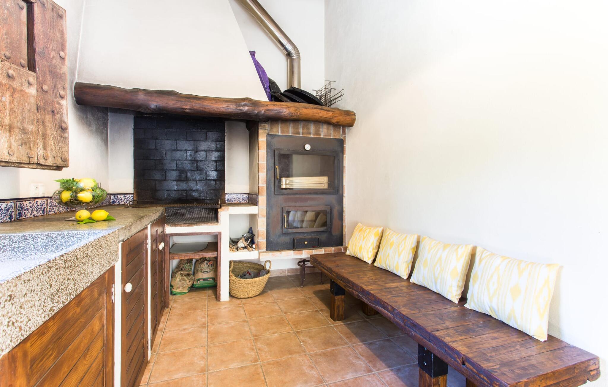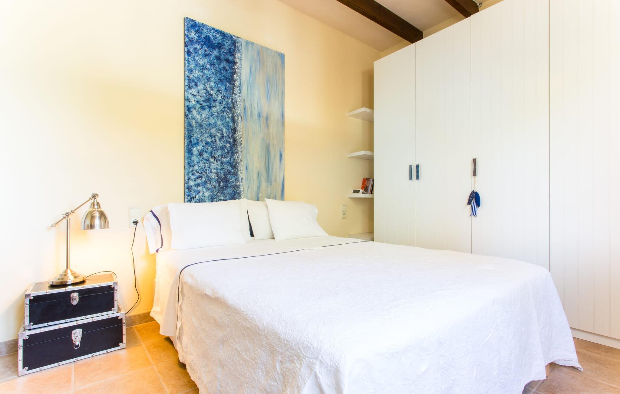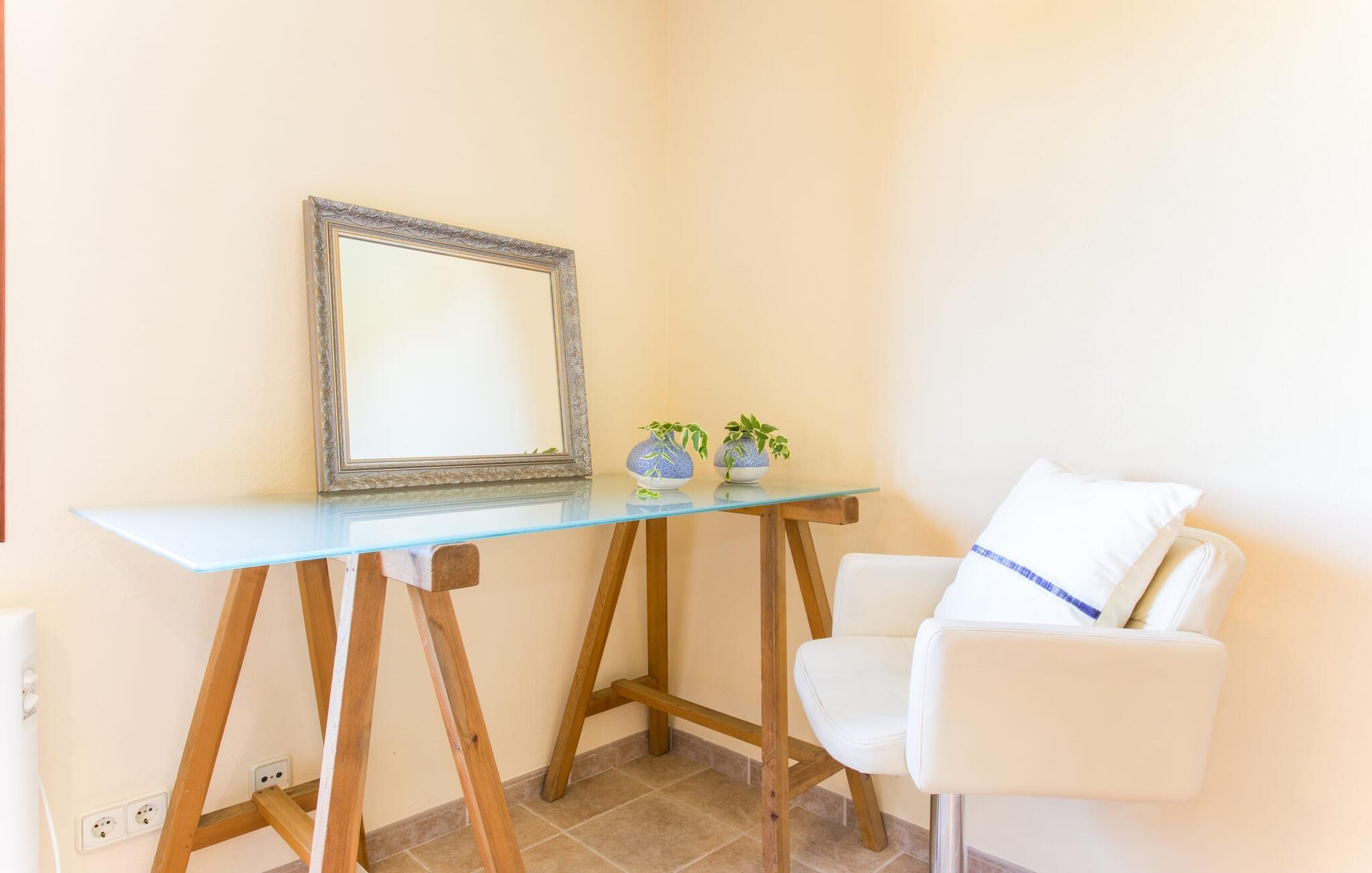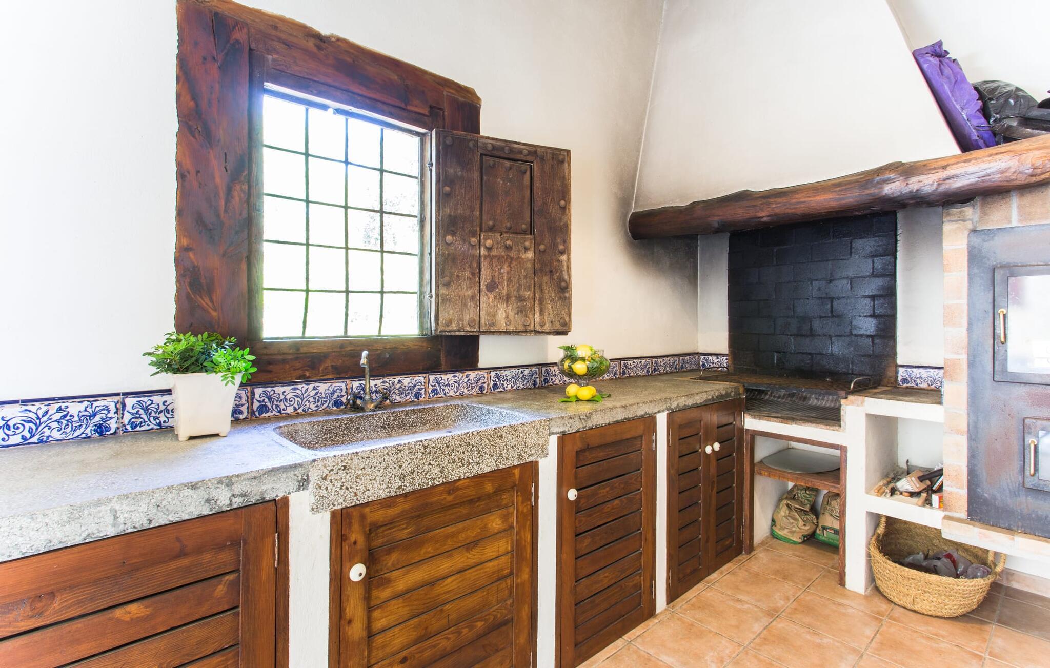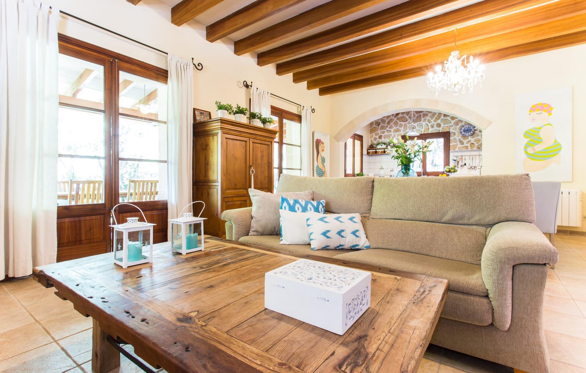 Du kan stadig se dem i det fjerne: ved foden af Tramuntana-bjergene, efterfulgt af de grønne toppe af fyrre-, mandel- og oliventræer. Villaen "Sa Garrigueta" ligger lige i midten. Med hans opmærksomhed på detaljer vil I blive fortryllet fra første øjeblik. Udendørsområdet er allerede en drøm: For eksempel er der talrige individuelt designede sidde- og loungeområder, der sikrer en ren feriefølelse. Disse er dekoreret med sommerlige turkise puder, hvis farve passer perfekt til vandet i den smukke pool og giver en kærkommen forfriskning på varme dage. Et andet højdepunkt ved denne villa er det overdækkede udekøkken med grill og spisebord. Det giver huset et meget landligt og rustikt præg og er det ideelle sted for en lækker BBQ med mallorcanske specialiteter. Men de små gæster går heller ikke glip af det: For at der ikke er chance for kedsomhed med den fred og ro, der tilbydes her, har villaen sit eget bordtennisbord og en basketballkurv. Det betyder, at alle er glade – og intet står i vejen for jeres afslappende pause. Om aftenen er det tid til at tænde stearinlysene i de stilfulde hvide lanterner og skabe en romantisk atmosfære på ingen tid. Føl jer godt tilpas på den luksuriøse liggestol og lyt til kvidren fra græshopperne, mens nattehimlen over jer er dekoreret med stjernerne på middelhavsbreddegrader. Når I træder ind i villaen for første gang, vil I straks føle jer hjemme, da indretningen er lys, venlig og slet ikke lyst eller påtrængende. Loftsbjælkerne er fritlagt i store dele af indretningen og formidler en dejlig rustik atmosfære, der harmonerer rigtig godt med de bløde cremefarvede toner på vægge og stoffer. I stuen er der et loungeområde med komfortable sofaer og nok underholdningsmuligheder for unge og gamle med et fjernsyn, iPod-dockingstation og, hvis vejret ikke er godt, en dvd-afspiller. Fra dette værelse har I direkte adgang til det åbne, moderne og fuldt udstyret køkken med Nespresso-maskine, som byder på alt, hvad en selvforplejningsmands hjerte begærer. Et rigtigt blikfang er den delvist frilagte stenmur på vinduessiden af rummet. Der er også en ægte atmosfære i soveværelserne: de flydende stoffer harmonerer harmonisk med de varme gule toner på væggene og de attraktive skodder lavet af mørkt træ. En skøn nattesøvn er garanteret, ikke mindst takket være de helt nye madrasser, som alle senge er udstyret med. De tre badeværelser i huset er også komfortable og praktiske; en af dem har eget badeværelse. I vil virkelig ikke forlade dette lille stykke af himlen. Har I stadig lyst til at skifte, kan I tage en tur til den nærliggende by Inca, hvor I skal holde øje med de højkvalitets læderprodukter, som traditionelt fremstilles her. I bør bestemt prøve en af de lækre Quely cookies lavet på den lokale fabrik. De betragtes som en meget vigtig del af inkaarven. På det ugentlige marked, som finder sted om torsdagen, finder I lædervarer samt keramik og kunsthåndværk samt egnsvarer fra økologiske landmænd. Der er masser af svømmesjov på stranden Playa de Muro, omkring 24 km væk; På grund af strandens blide hældning ned i vandet er den velegnet til familier. Den familievenlige og stilfulde villa "Sa Garrigueta" er omgivet af grønne områder og har en absolut afsondret beliggenhed. Blot 2,4 km væk ligger Inca, Mallorcas tredjestørste by. Der vil I finde supermarkeder, apoteker, bagerier, et ugentligt marked og restauranter til at dække jeres daglige behov. En 30 minutters kørsel tager jer til de populære hvide sandstrande i Playa de Muro eller Alcúdia.
