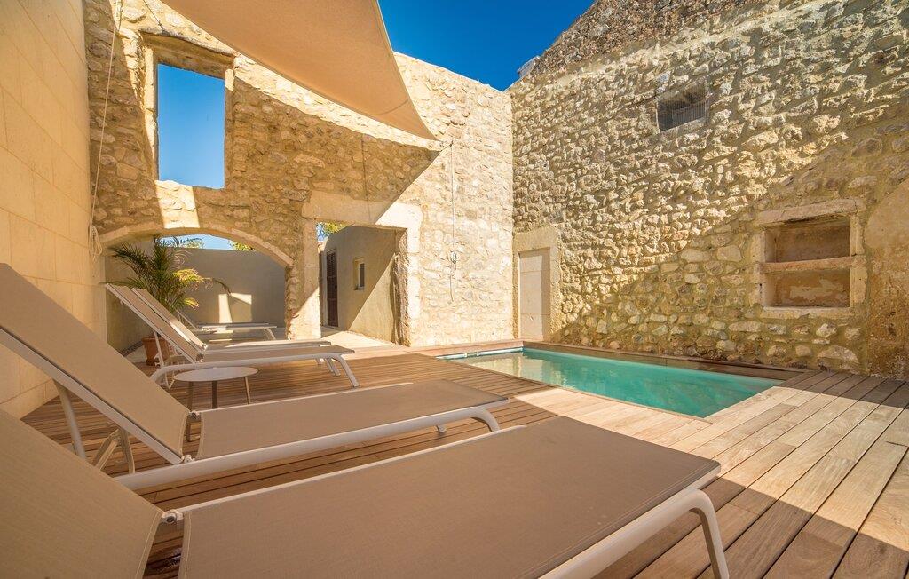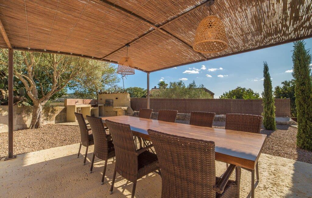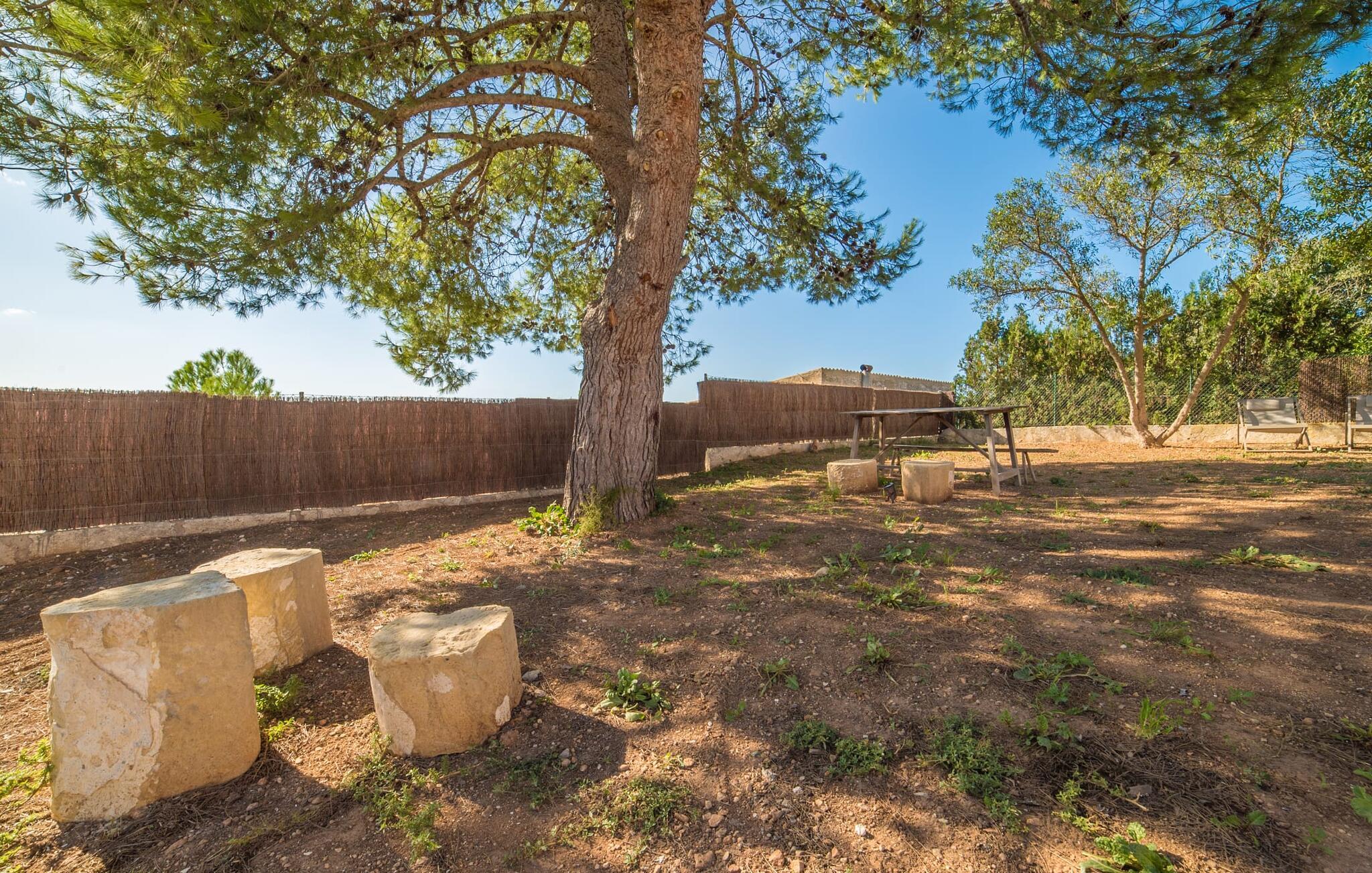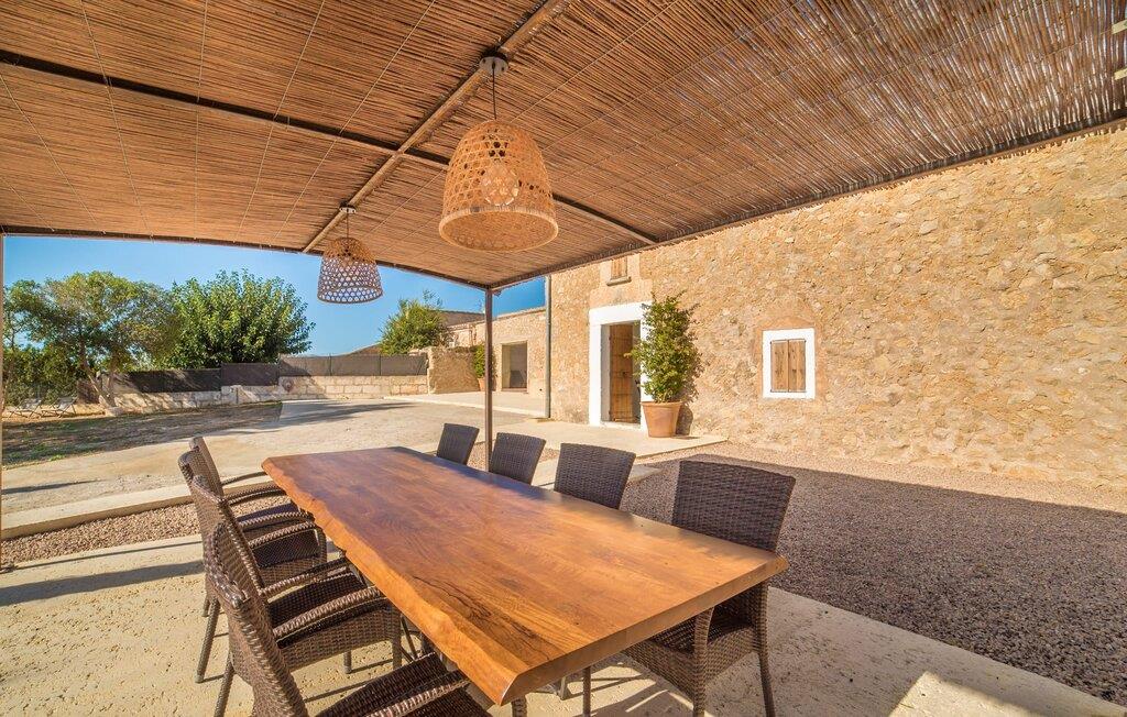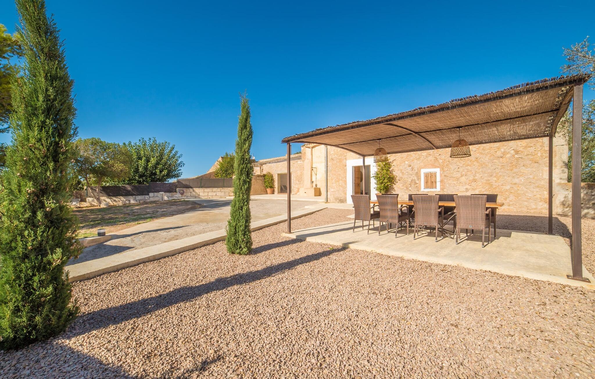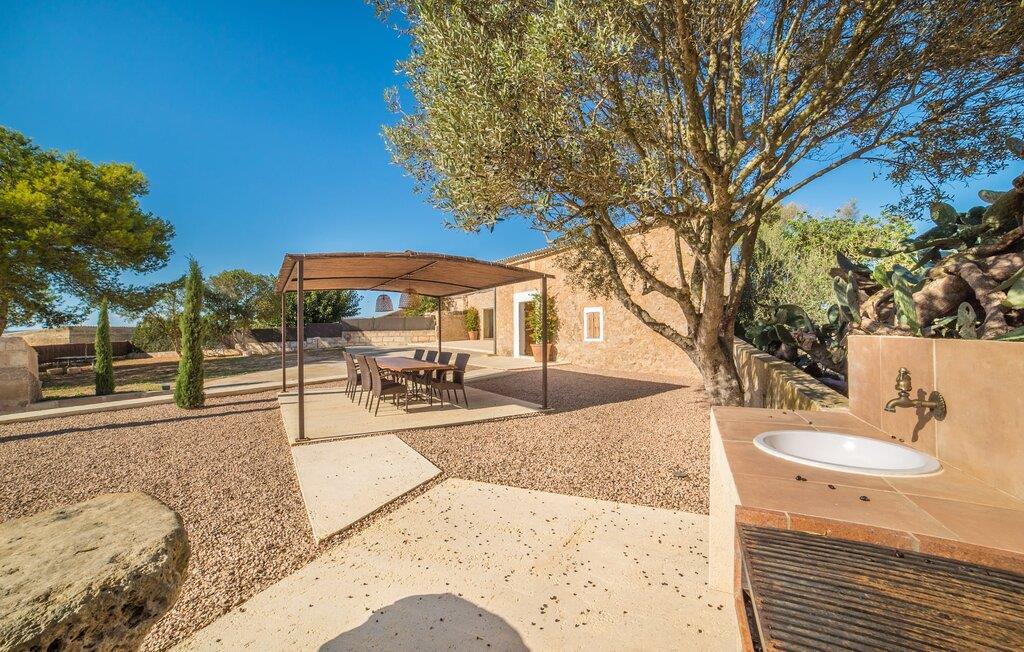 Den smukke feriefinca "Son Granada" er beliggende i det idylliske landskab i den østlige del af Mallorca. Her møder traditionel mallorcinsk arkitektur et elegant iscenesat udendørsområde. Slap af i det omhyggeligt designede poolområde, i læ for vinden og omgivet af høje sandstensvægge. Trægulvet, stilfulde markiser, overdådige liggestole og en indbydende udendørs bruser skaber en atmosfære, der inviterer jer til helt at slappe af. Haven er udformet som en rummelig terrasse: natursten og grus harmonerer med bygningens lyse natursten. I midten og smagfuldt overdækket er en skøn spiseplads med tilstødende udekøkken og kulgrill - det perfekte sted at nyde de lune sommernætter ved Middelhavet med venner og familie. Det 215 m² store indre af stuehuset, bygget i 1850, er kendetegnet ved en vellykket kombination af originale elementer og moderne komfort. Værelserne er behageligt kølige selv ved høje temperaturer og er tilgængelige via to separate indgange. I stueetagen er der udover opholdsstuen med flere siddepladser en spiseplads med bord og to køkkener, hvoraf det ene har et andet spisebord. Fire af de fem soveværelser er i stueetagen; På et galleri på øverste etage er der endnu et soveværelse til to gæster med eget badeværelse. I højre side af huset er der to soveværelser til hver to personer, mens der til venstre er et dobbeltværelse og et enkeltværelse. Moderne badeværelser med store brusekabiner er integreret i begge områder. Et af værelserne har en lille privat terrasse. Feriehuset er udstyret med WiFi og stabil mobiltelefonmodtagelse. Villaen "Son Granada" er omgivet af marker og græsgange og har en misundelsesværdig beliggenhed mellem Manacor og Felanitx i centrum af øen. Herfra har I adgang til hele øen; En direkte forbindelse til Palma samt let tilgængelige strande og klippefyldte bugter på østkysten gør denne ejendom til et ideelt udgangspunkt for en uforglemmelig ferie. Regionen er populær blandt vandrere og cyklister, mens Manacor byder på forskellige shoppingmuligheder.