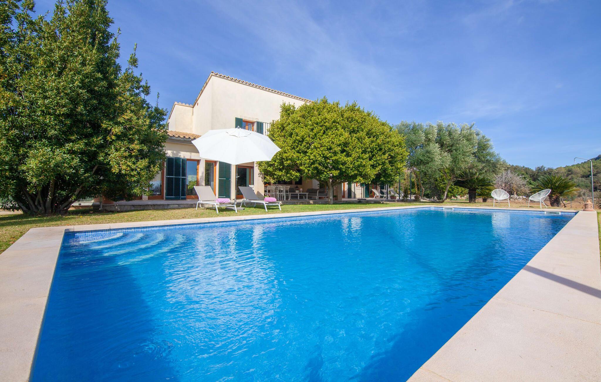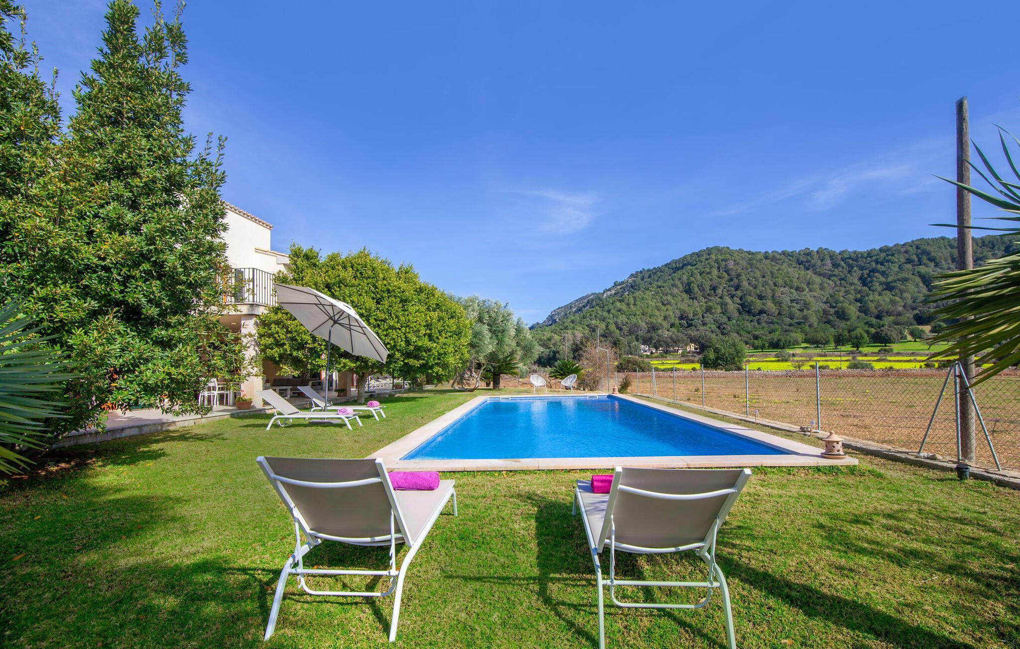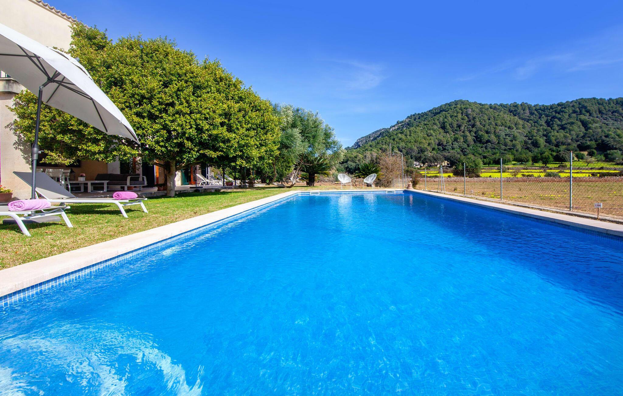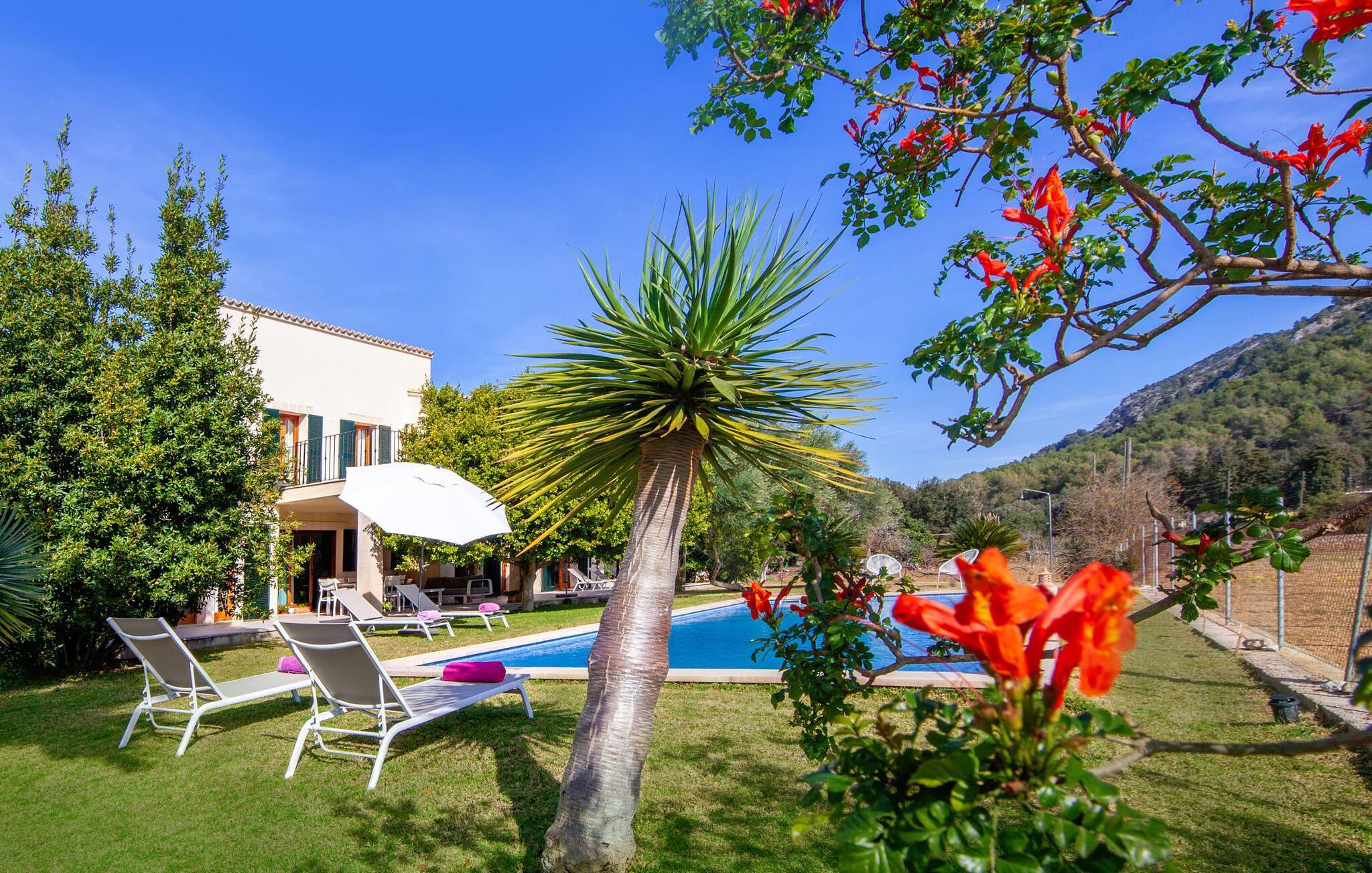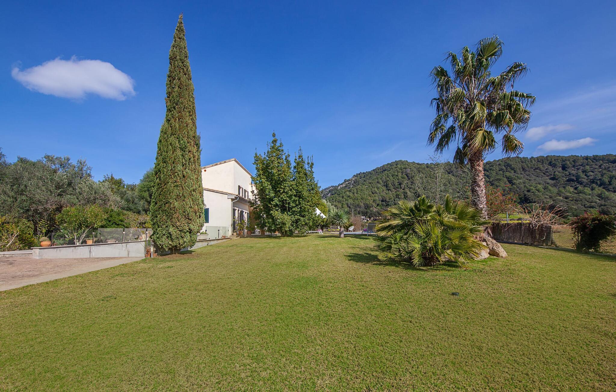 Dette smukke feriehus på Mallorca er omgivet af vidunderligt frodige træer og udsigten fra forsiden af det omkringliggende landskab kunne næsten ikke være mere fortryllende. Du får straks lyst til at slå lejr ved siden af det høje palmetræ og nyde en bog og din yndlingsdrink på en af de komfortable liggestole. Fortsætte! Der er masser af plads på græsplænen til lange timers afslapning, og de børn, der er kommet med, vil helt sikkert nyde pladsen til at løbe rundt! På varme dage er der naturligvis ingen stop for en forfriskning, den lange pool inviterer dig til at tage et par omgange eller plaske rundt. Poolen er meget nem at nå via en hjørnetrappe og skråner derefter behageligt ned. Svømning med udsigt over bjergene! De stilfuldt indrettede, åbne eller overdækkede terrasseområder inviterer til afslapning lige ved siden af huset. Her er afstandene til køkken mm korte uden at gå på kompromis med udsigten til landskabet. Dette er et Fincallorca feriehus. Husets indretning er også indbydende: megen harmoni i form af absolut harmonisk arrangerede former, materialer og farver samt mange lyse, gulv-til-loft vinduer skaber en atmosfære af ren komfort. Komfortable polstrede møbler inviterer dig til at fejre afslapning indendørs med en smuk udsigt udenfor. Om pejsen eller fjernsynet (eller begge dele) giver komfort på en kølig aften er helt op til dig. Måske er det en god snak og et lækkert glas rødvin, der gør samværet endnu sjovere? Herfra er der glidende overgang til spisepladsen og det tilstødende, fuldt udstyrede køkken, hvor alt er til rådighed til selvforplejning. På denne nederste etage er der også et soveværelse med dobbeltseng og et badeværelse. På øverste etage er der yderligere tre soveværelser og to badeværelser, hvoraf det ene er en suite. Soveværelserne scorer også point med gulv til loft vinduer og en vidunderlig udsigt. Nu burde det stå klart: Hvis du værdsætter stil og komfort og ønsker at nyde den smukkeste landskabsudsigt på din ferie, er denne finca på Mallorca det rigtige sted for dig! Et drømmehus på Mallorca med en bekvem beliggenhed til attraktive udflugtsmål og stranden? Her er det! Herfra kan du nemt rejse i forskellige retninger og samtidig føle dig hjemme i den meget smagfuldt indrettede finca og nyde den smukke have. Der er godt 5 km til byen for shopping. Alcúdia-bugten med dens 16 km lange kæde af strande ligger også kun en kort køretur væk og byder på et varieret program.