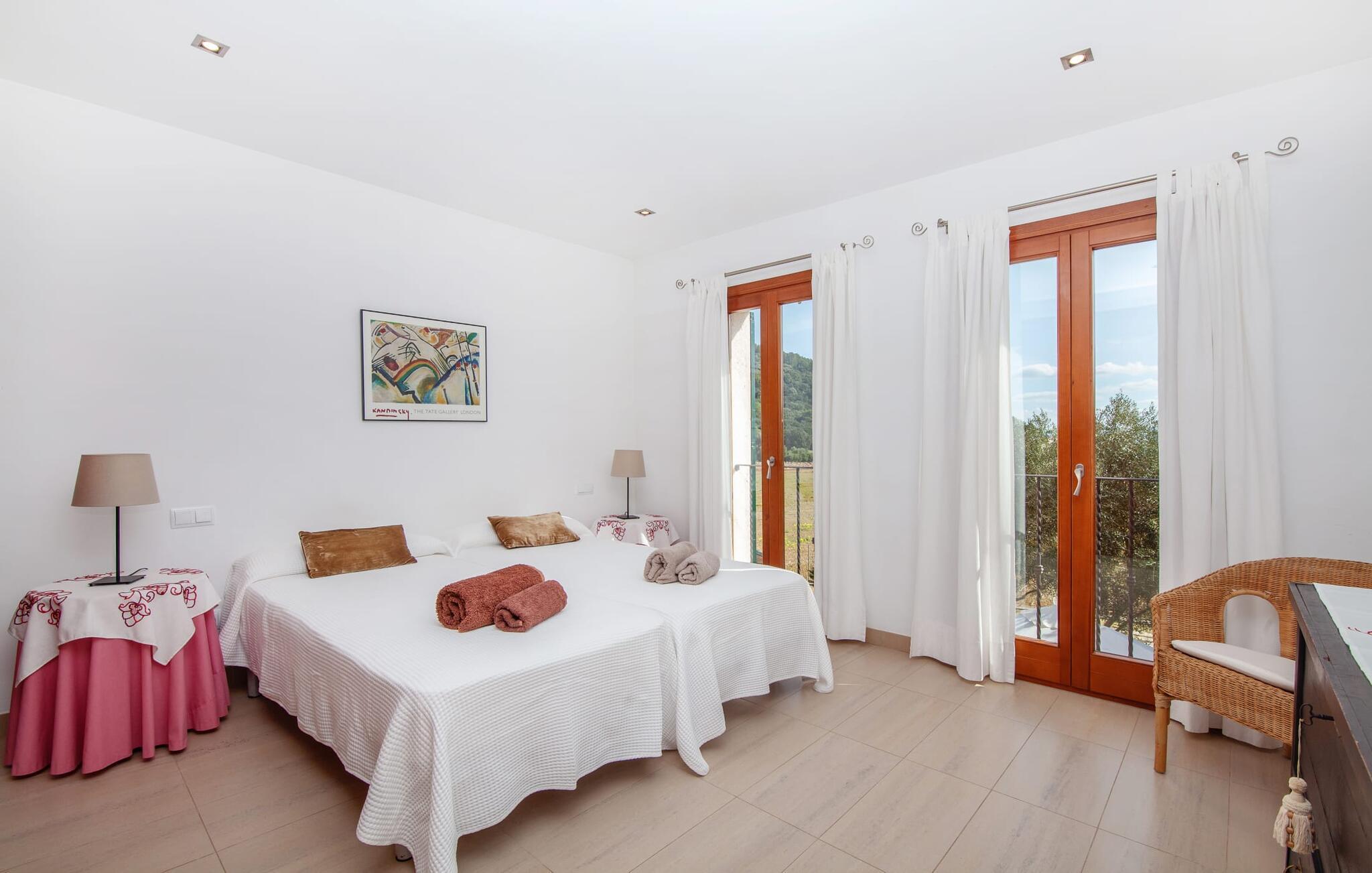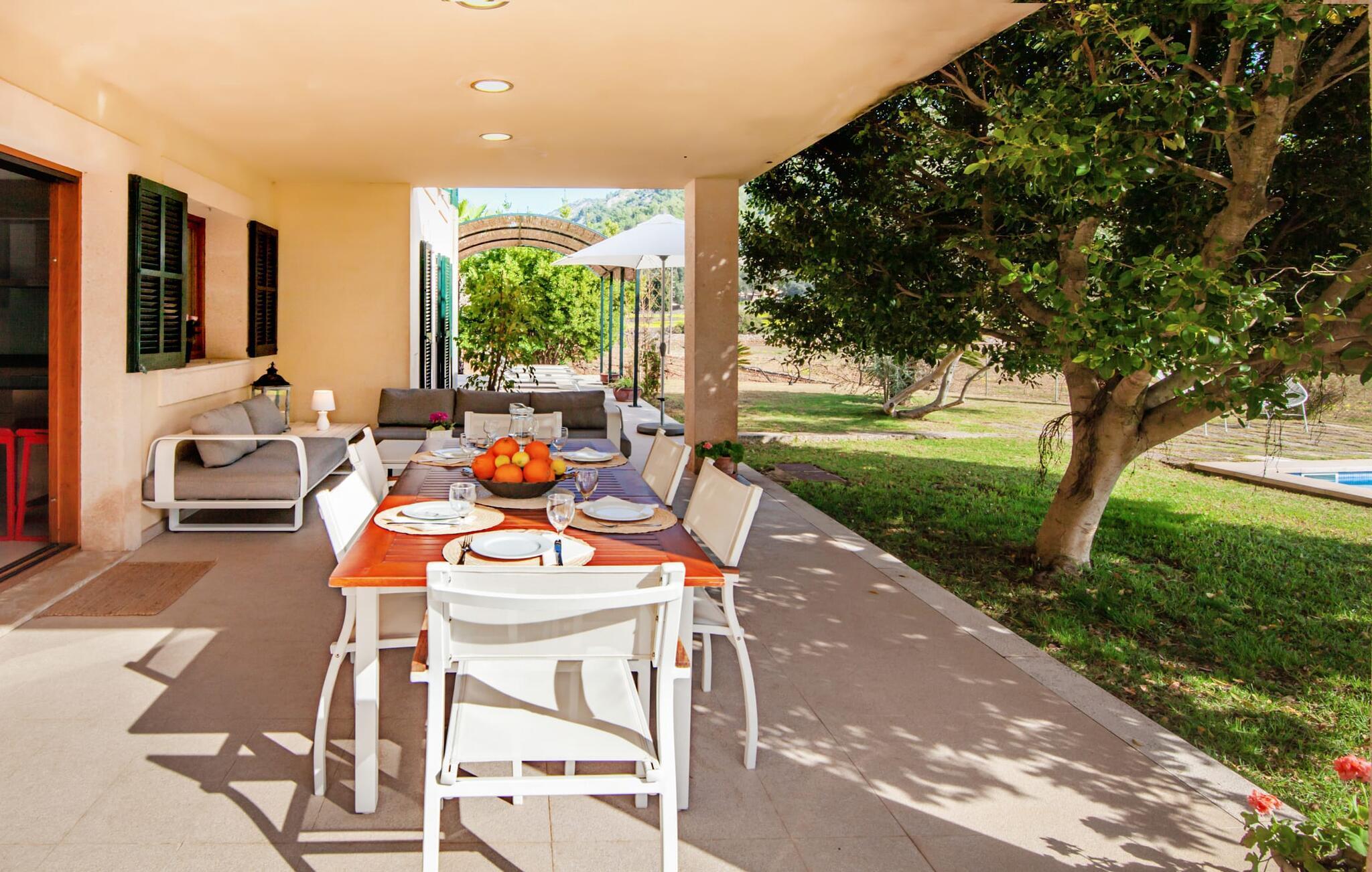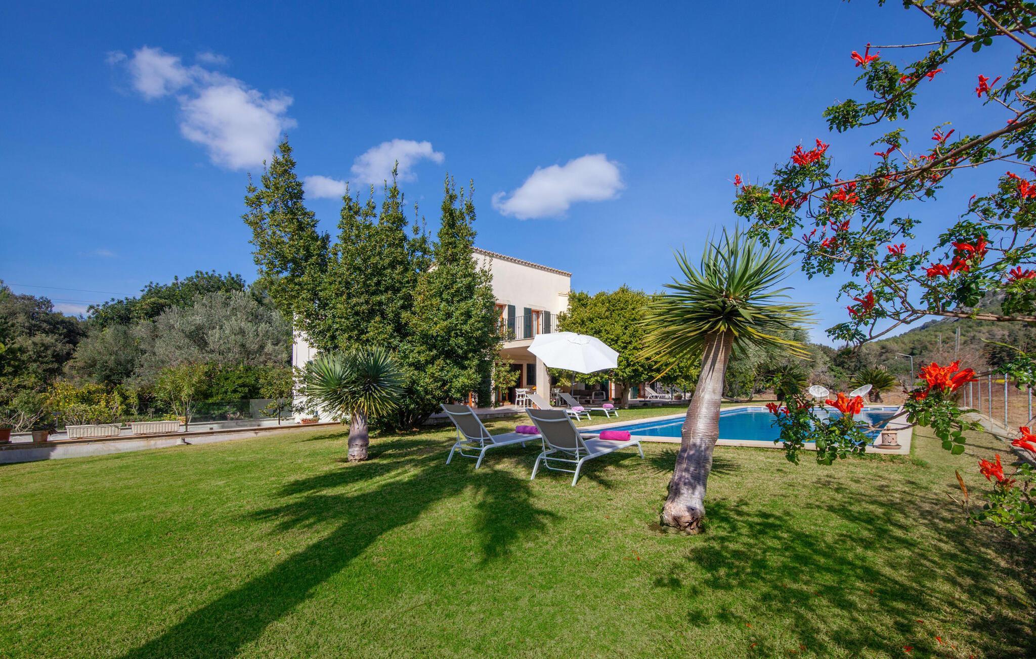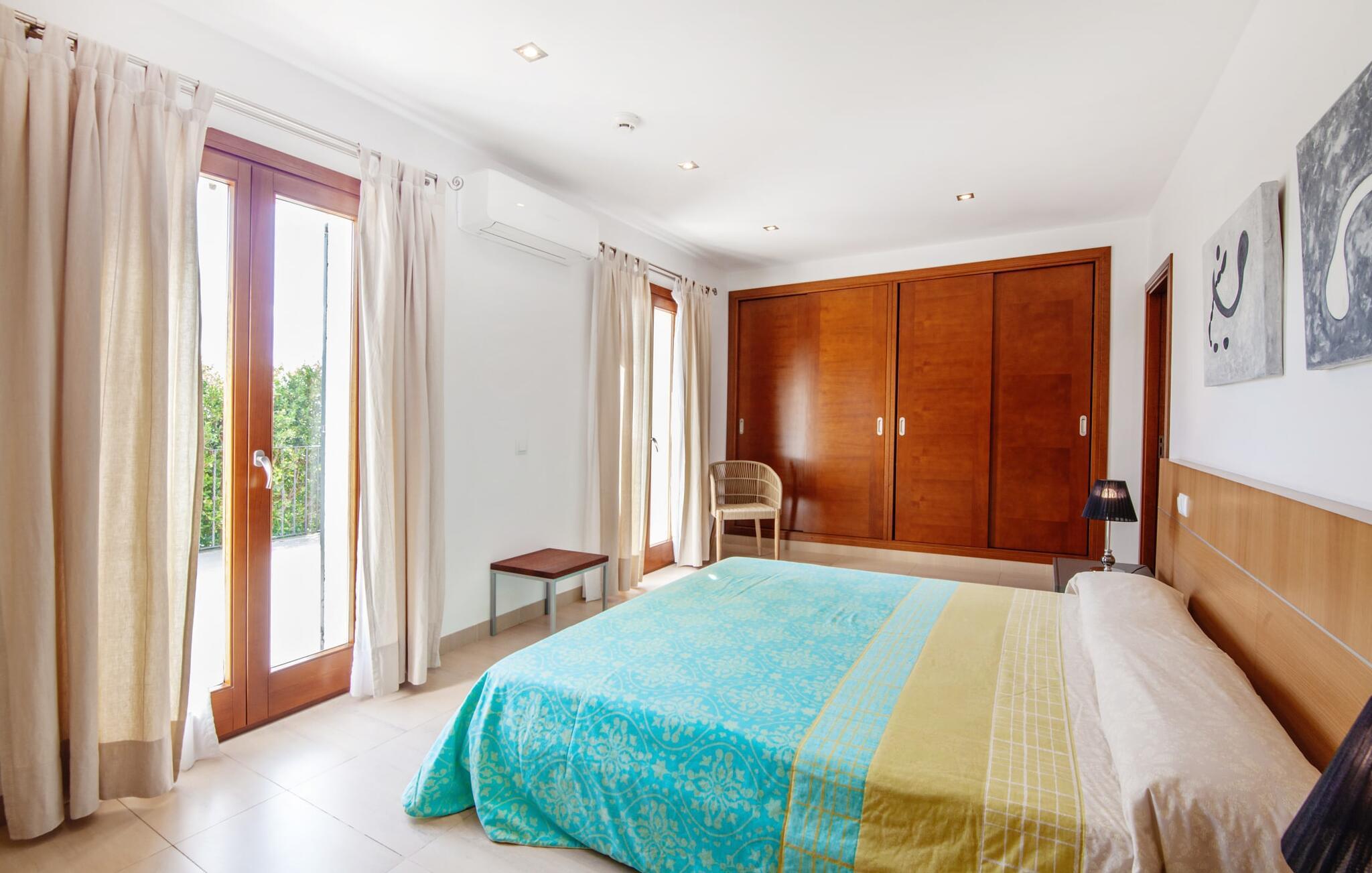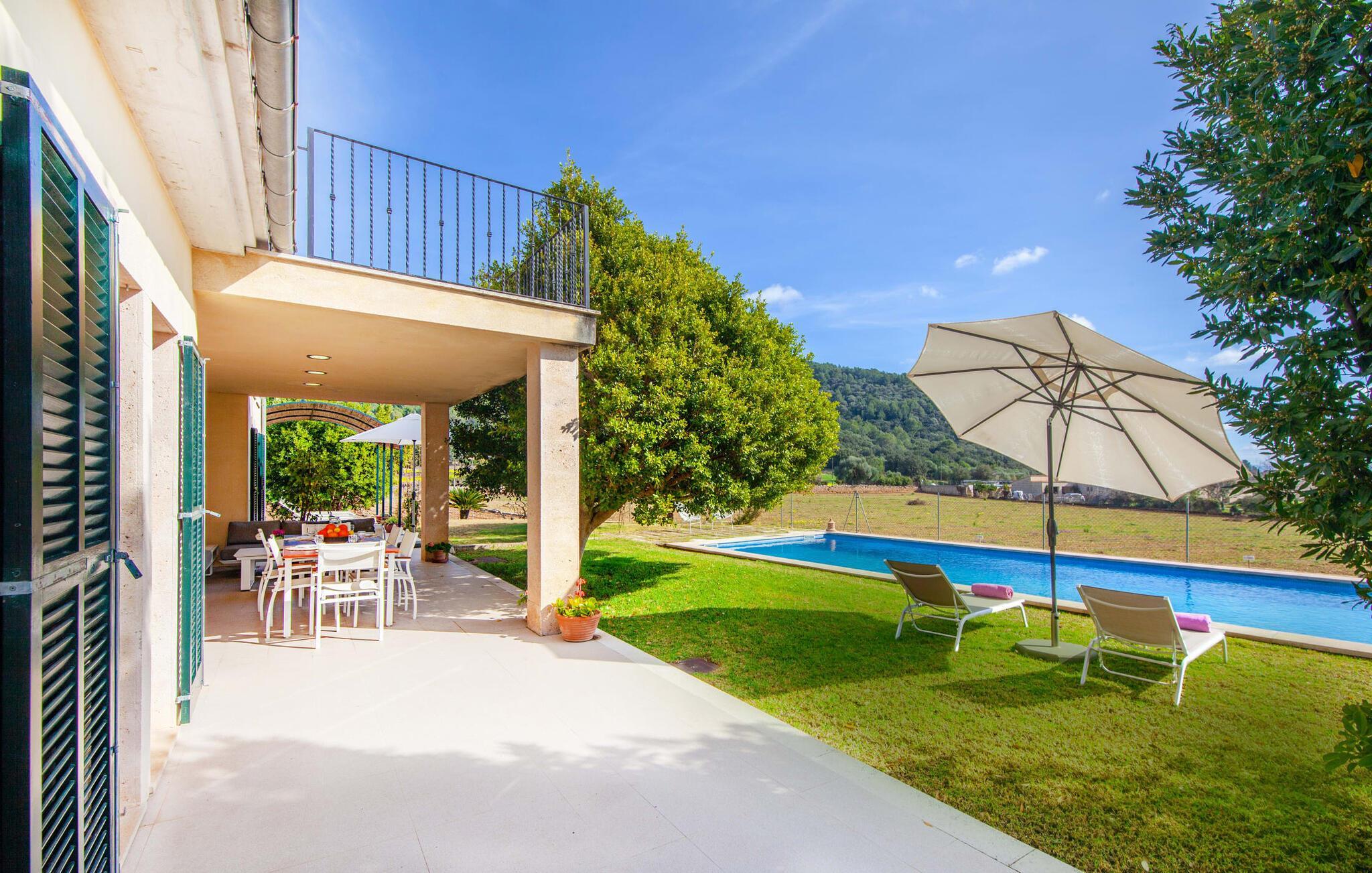 Dette smukke feriehus på Mallorca er omgivet af vidunderligt frodige træer og udsigten fra forsiden af det omkringliggende landskab kunne næsten ikke være mere fortryllende. Du får straks lyst til at slå lejr ved siden af det høje palmetræ og nyde en bog og din yndlingsdrink på en af de komfortable liggestole. Fortsætte! Der er masser af plads på græsplænen til lange timers afslapning, og de børn, der er kommet med, vil helt sikkert nyde pladsen til at løbe rundt! På varme dage er der naturligvis ingen stop for en forfriskning, den lange pool inviterer dig til at tage et par omgange eller plaske rundt. Poolen er meget nem at nå via en hjørnetrappe og skråner derefter behageligt ned. Svømning med udsigt over bjergene! De stilfuldt indrettede, åbne eller overdækkede terrasseområder inviterer til afslapning lige ved siden af huset. Her er afstandene til køkken mm korte uden at gå på kompromis med udsigten til landskabet. Dette er et Fincallorca feriehus. Husets indretning er også indbydende: megen harmoni i form af absolut harmonisk arrangerede former, materialer og farver samt mange lyse, gulv-til-loft vinduer skaber en atmosfære af ren komfort. Komfortable polstrede møbler inviterer dig til at fejre afslapning indendørs med en smuk udsigt udenfor. Om pejsen eller fjernsynet (eller begge dele) giver komfort på en kølig aften er helt op til dig. Måske er det en god snak og et lækkert glas rødvin, der gør samværet endnu sjovere? Herfra er der glidende overgang til spisepladsen og det tilstødende, fuldt udstyrede køkken, hvor alt er til rådighed til selvforplejning. På denne nederste etage er der også et soveværelse med dobbeltseng og et badeværelse. På øverste etage er der yderligere tre soveværelser og to badeværelser, hvoraf det ene er en suite. Soveværelserne scorer også point med gulv til loft vinduer og en vidunderlig udsigt. Nu burde det stå klart: Hvis du værdsætter stil og komfort og ønsker at nyde den smukkeste landskabsudsigt på din ferie, er denne finca på Mallorca det rigtige sted for dig! Et drømmehus på Mallorca med en bekvem beliggenhed til attraktive udflugtsmål og stranden? Her er det! Herfra kan du nemt rejse i forskellige retninger og samtidig føle dig hjemme i den meget smagfuldt indrettede finca og nyde den smukke have. Der er godt 5 km til byen for shopping. Alcúdia-bugten med dens 16 km lange kæde af strande ligger også kun en kort køretur væk og byder på et varieret program.
