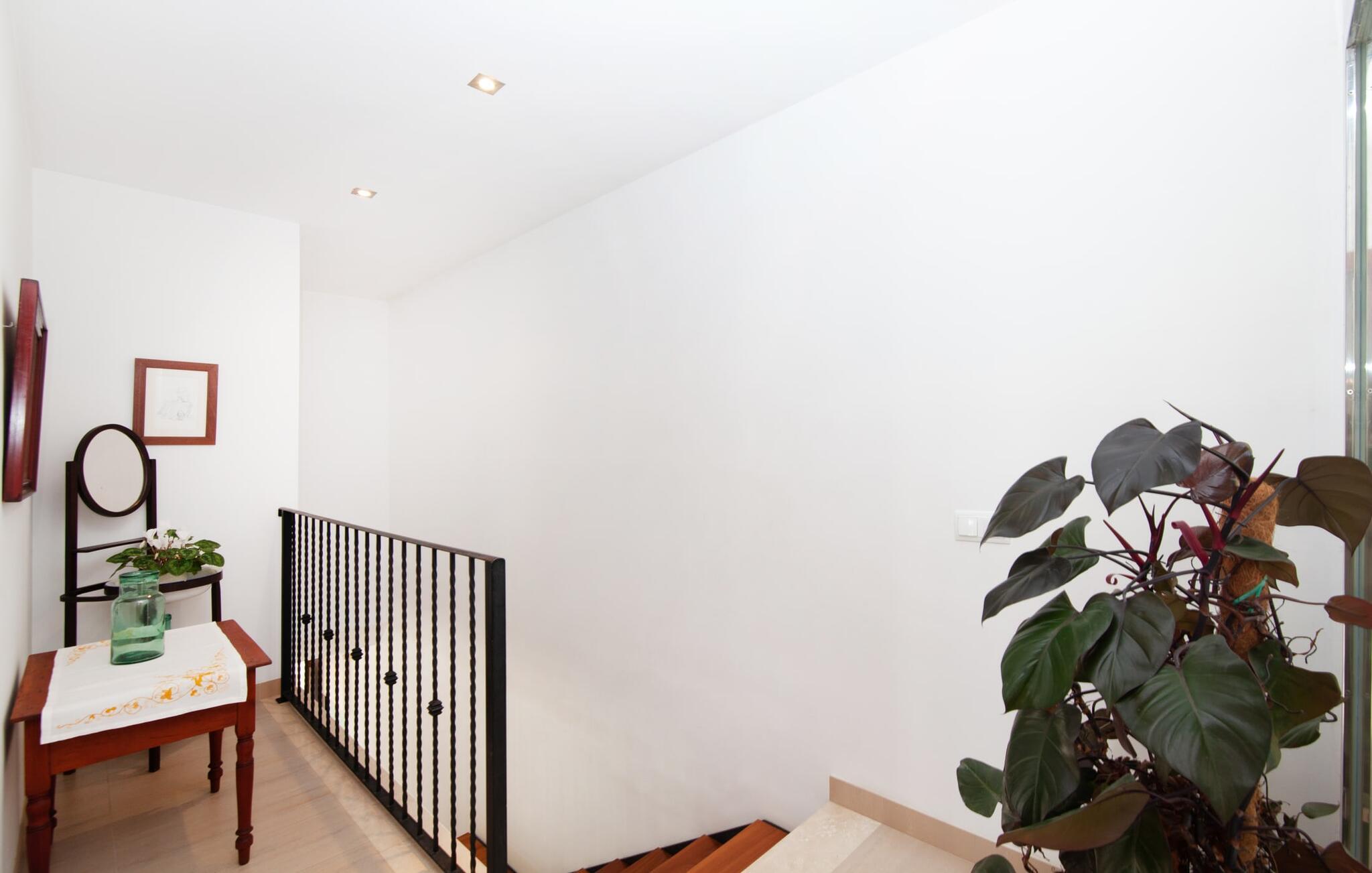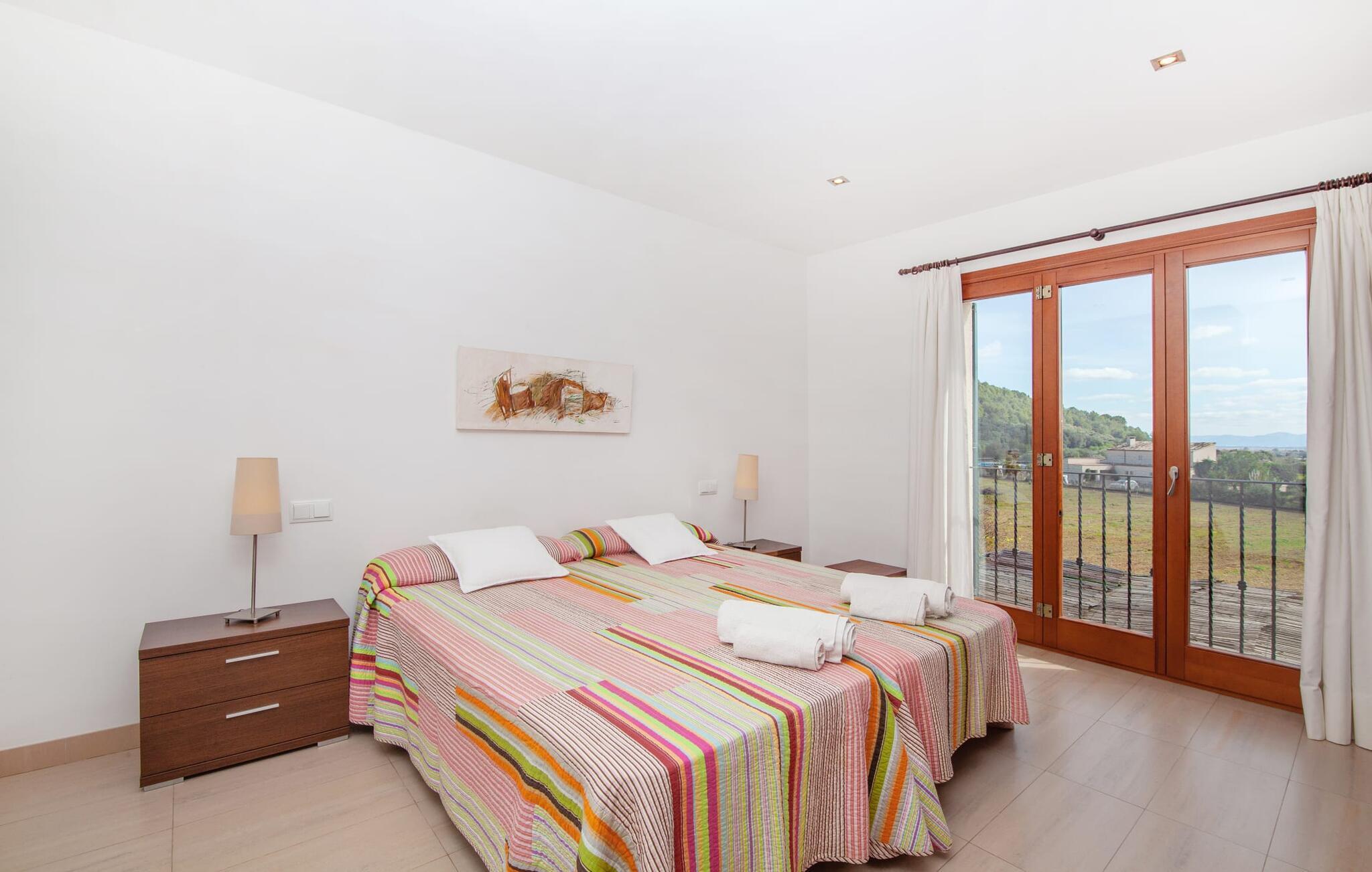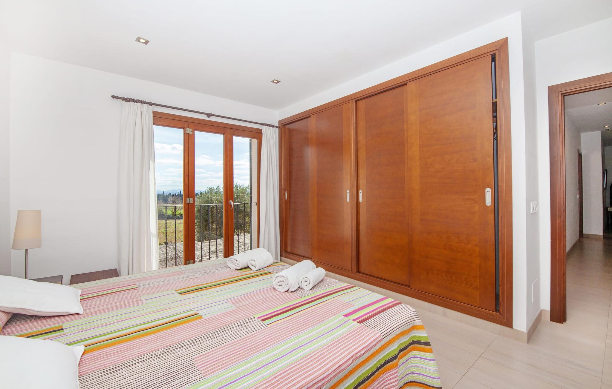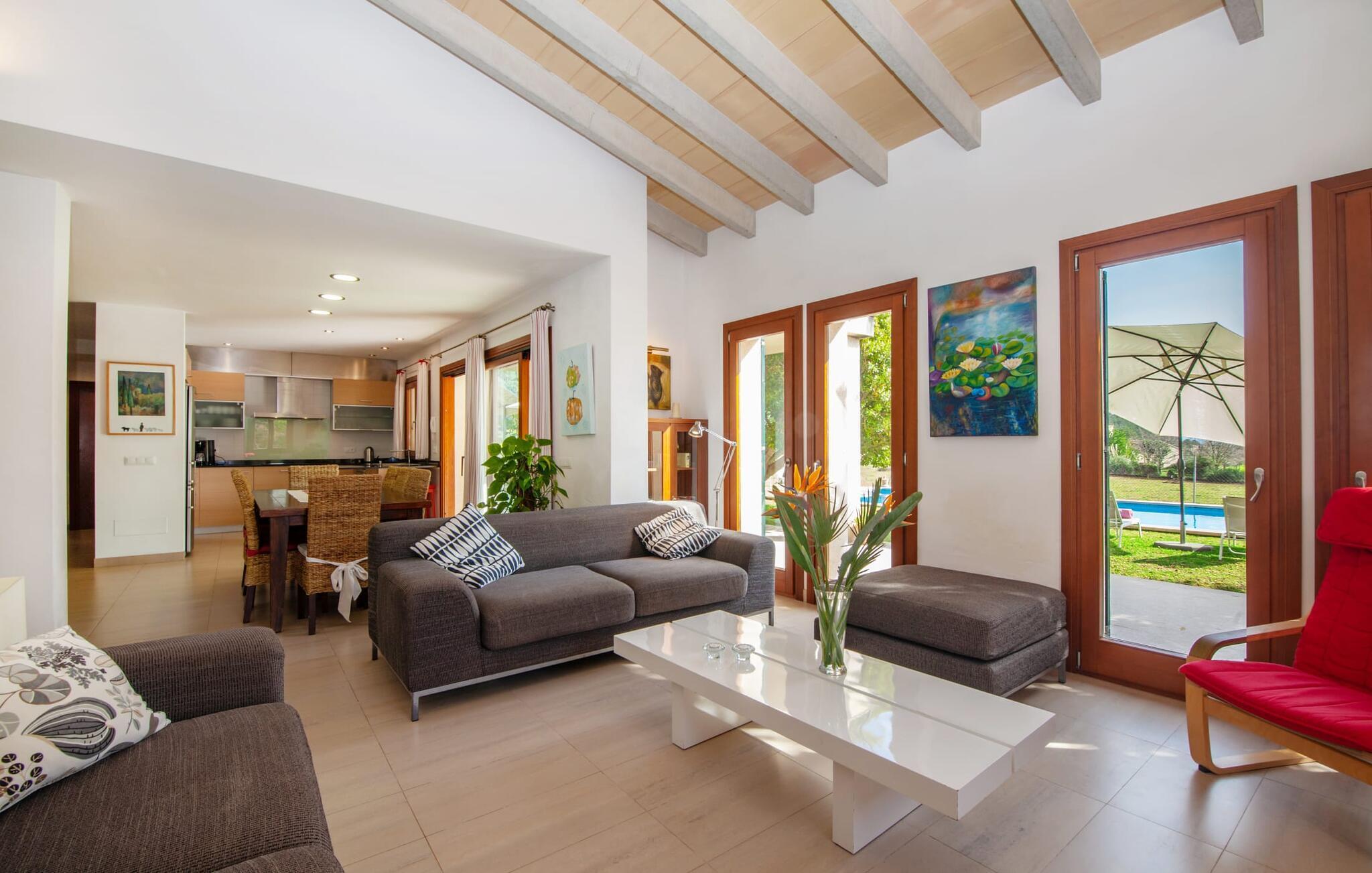Dette smukke feriehus på Mallorca er omgivet af vidunderligt frodige træer og udsigten fra forsiden af det omkringliggende landskab kunne næsten ikke være mere fortryllende. Du får straks lyst til at slå lejr ved siden af det høje palmetræ og nyde en bog og din yndlingsdrink på en af de komfortable liggestole. Fortsætte! Der er masser af plads på græsplænen til lange timers afslapning, og de børn, der er kommet med, vil helt sikkert nyde pladsen til at løbe rundt! På varme dage er der naturligvis ingen stop for en forfriskning, den lange pool inviterer dig til at tage et par omgange eller plaske rundt. Poolen er meget nem at nå via en hjørnetrappe og skråner derefter behageligt ned. Svømning med udsigt over bjergene! De stilfuldt indrettede, åbne eller overdækkede terrasseområder inviterer til afslapning lige ved siden af huset. Her er afstandene til køkken mm korte uden at gå på kompromis med udsigten til landskabet. Dette er et Fincallorca feriehus. Husets indretning er også indbydende: megen harmoni i form af absolut harmonisk arrangerede former, materialer og farver samt mange lyse, gulv-til-loft vinduer skaber en atmosfære af ren komfort. Komfortable polstrede møbler inviterer dig til at fejre afslapning indendørs med en smuk udsigt udenfor. Om pejsen eller fjernsynet (eller begge dele) giver komfort på en kølig aften er helt op til dig. Måske er det en god snak og et lækkert glas rødvin, der gør samværet endnu sjovere? Herfra er der glidende overgang til spisepladsen og det tilstødende, fuldt udstyrede køkken, hvor alt er til rådighed til selvforplejning. På denne nederste etage er der også et soveværelse med dobbeltseng og et badeværelse. På øverste etage er der yderligere tre soveværelser og to badeværelser, hvoraf det ene er en suite. Soveværelserne scorer også point med gulv til loft vinduer og en vidunderlig udsigt. Nu burde det stå klart: Hvis du værdsætter stil og komfort og ønsker at nyde den smukkeste landskabsudsigt på din ferie, er denne finca på Mallorca det rigtige sted for dig! Et drømmehus på Mallorca med en bekvem beliggenhed til attraktive udflugtsmål og stranden? Her er det! Herfra kan du nemt rejse i forskellige retninger og samtidig føle dig hjemme i den meget smagfuldt indrettede finca og nyde den smukke have. Der er godt 5 km til byen for shopping. Alcúdia-bugten med dens 16 km lange kæde af strande ligger også kun en kort køretur væk og byder på et varieret program.