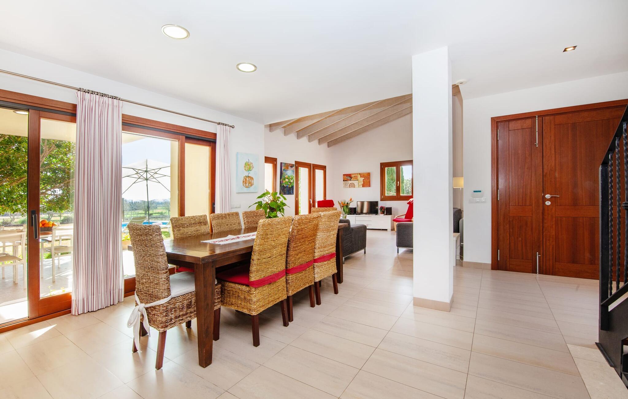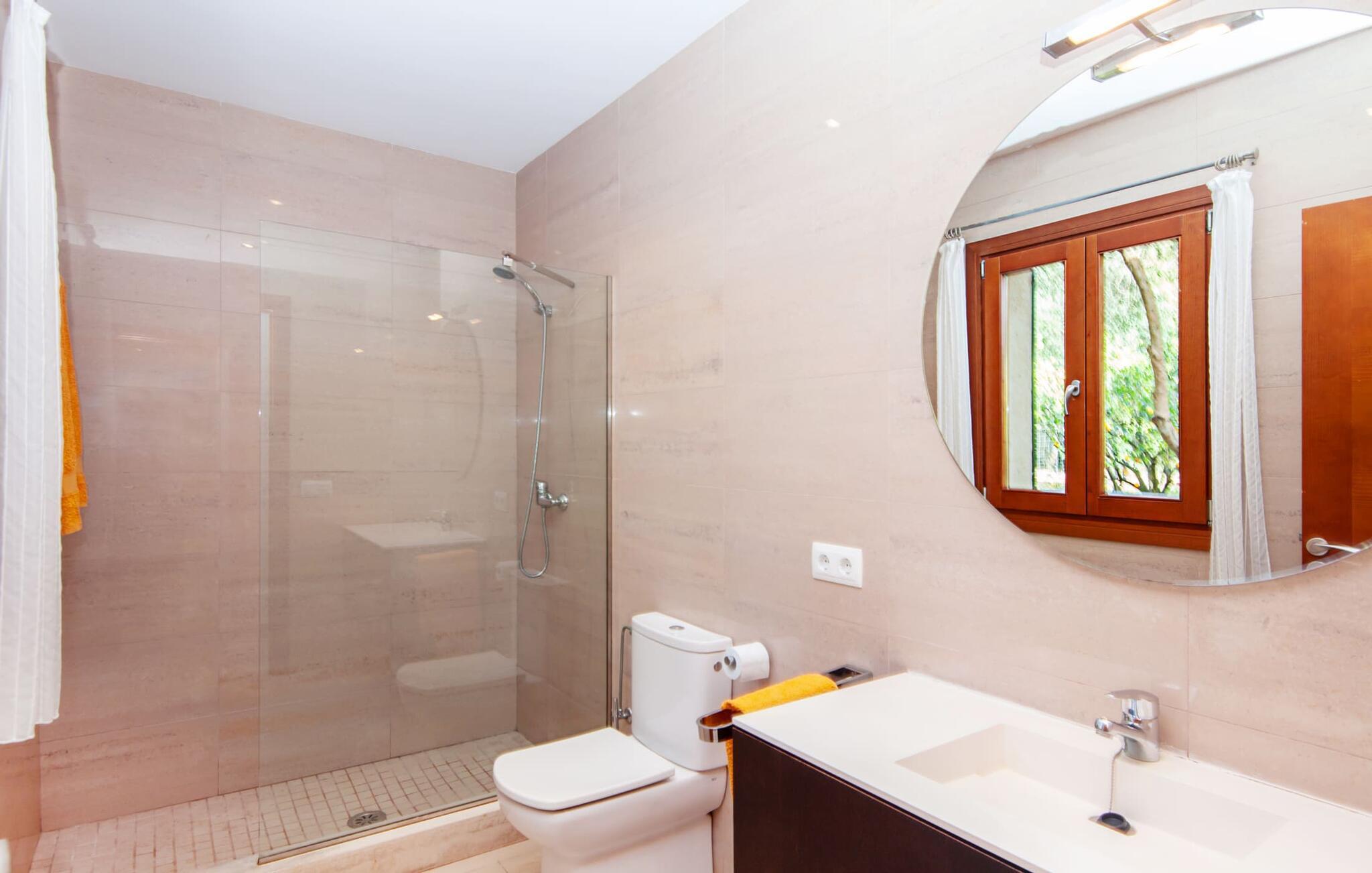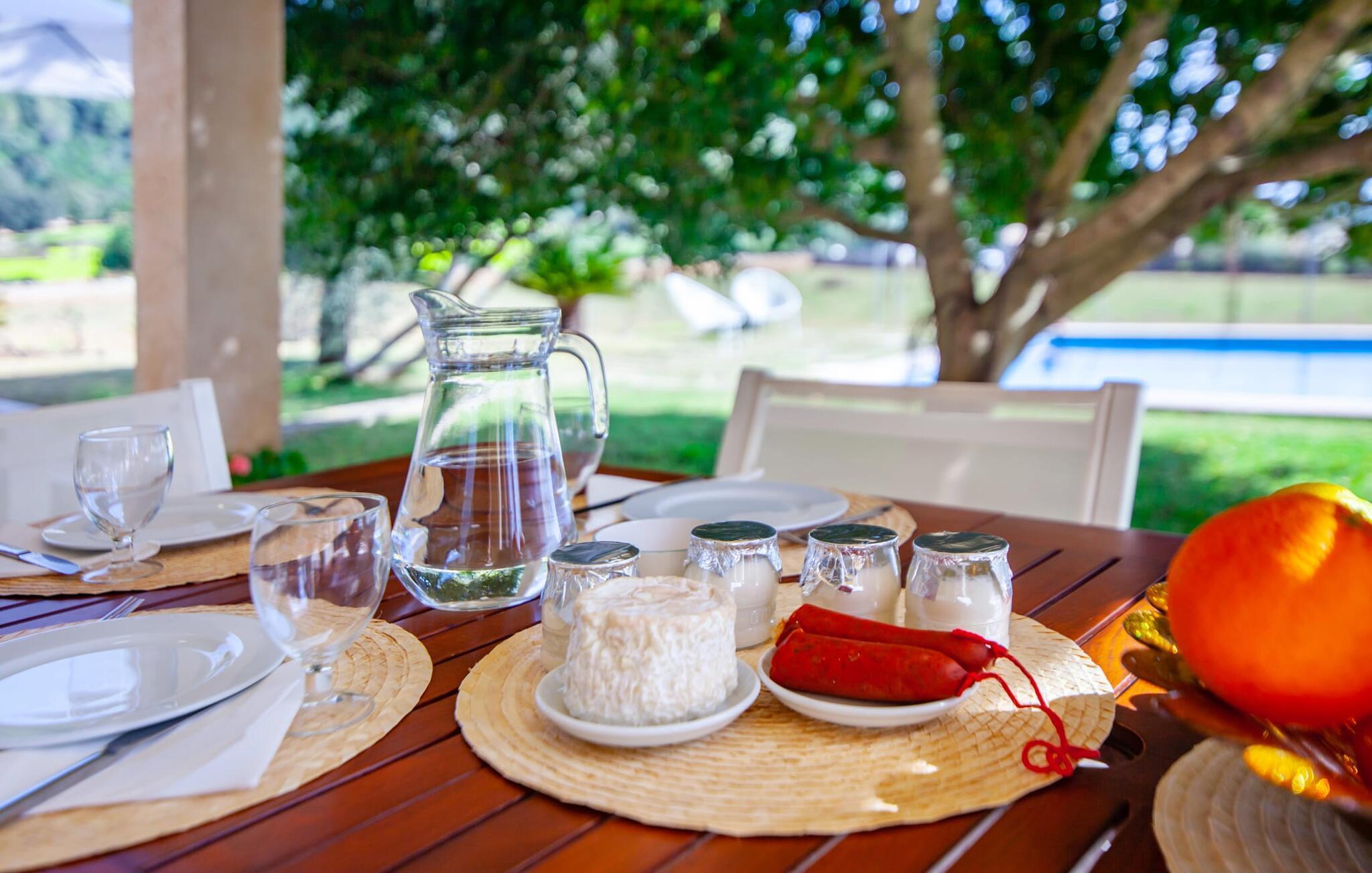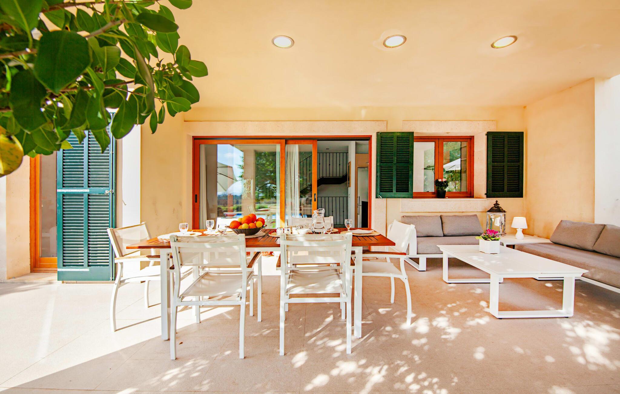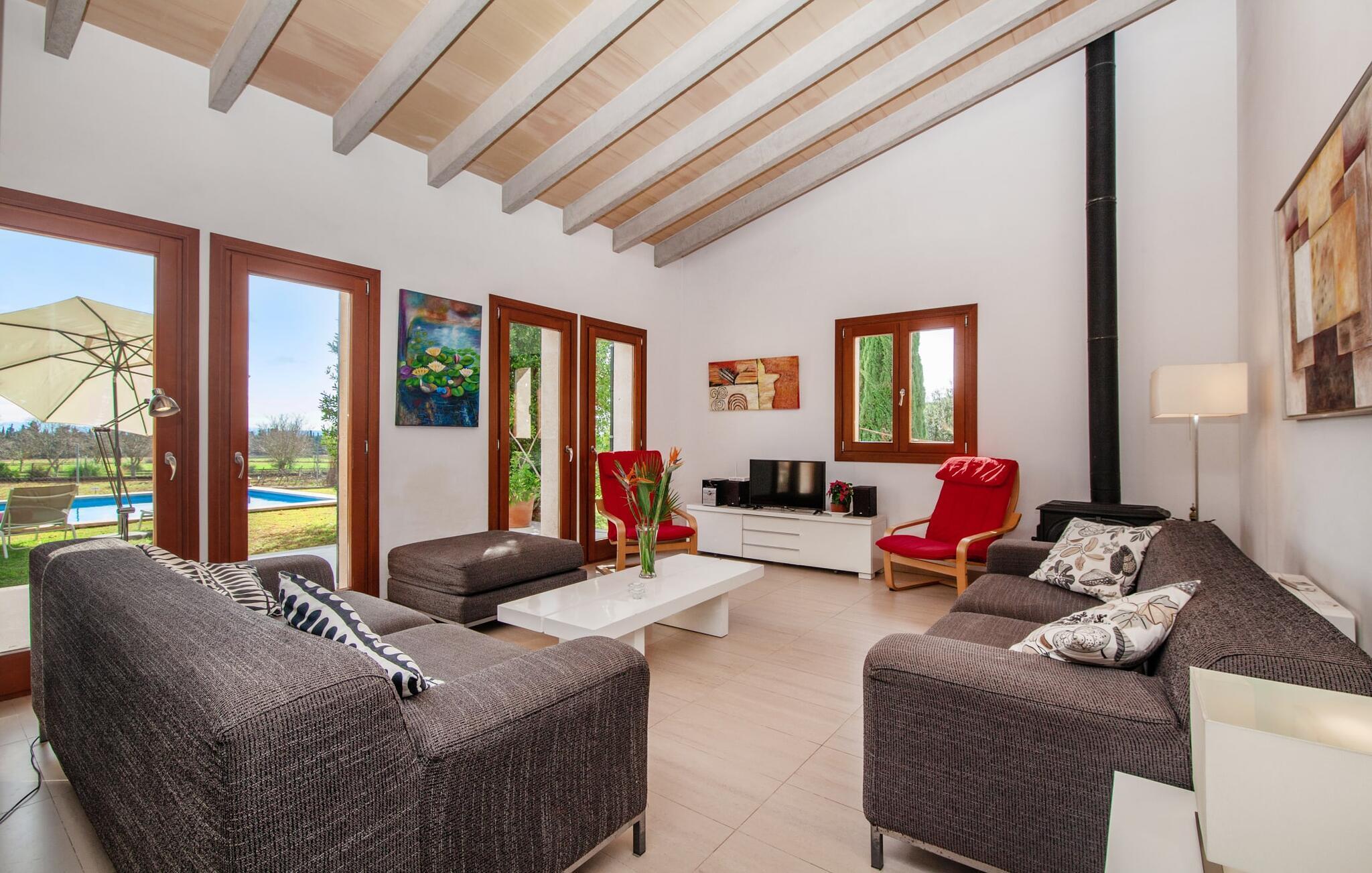 Dette smukke feriehus på Mallorca er omgivet af vidunderligt frodige træer og udsigten fra forsiden af det omkringliggende landskab kunne næsten ikke være mere fortryllende. Du får straks lyst til at slå lejr ved siden af det høje palmetræ og nyde en bog og din yndlingsdrink på en af de komfortable liggestole. Fortsætte! Der er masser af plads på græsplænen til lange timers afslapning, og de børn, der er kommet med, vil helt sikkert nyde pladsen til at løbe rundt! På varme dage er der naturligvis ingen stop for en forfriskning, den lange pool inviterer dig til at tage et par omgange eller plaske rundt. Poolen er meget nem at nå via en hjørnetrappe og skråner derefter behageligt ned. Svømning med udsigt over bjergene! De stilfuldt indrettede, åbne eller overdækkede terrasseområder inviterer til afslapning lige ved siden af huset. Her er afstandene til køkken mm korte uden at gå på kompromis med udsigten til landskabet. Dette er et Fincallorca feriehus. Husets indretning er også indbydende: megen harmoni i form af absolut harmonisk arrangerede former, materialer og farver samt mange lyse, gulv-til-loft vinduer skaber en atmosfære af ren komfort. Komfortable polstrede møbler inviterer dig til at fejre afslapning indendørs med en smuk udsigt udenfor. Om pejsen eller fjernsynet (eller begge dele) giver komfort på en kølig aften er helt op til dig. Måske er det en god snak og et lækkert glas rødvin, der gør samværet endnu sjovere? Herfra er der glidende overgang til spisepladsen og det tilstødende, fuldt udstyrede køkken, hvor alt er til rådighed til selvforplejning. På denne nederste etage er der også et soveværelse med dobbeltseng og et badeværelse. På øverste etage er der yderligere tre soveværelser og to badeværelser, hvoraf det ene er en suite. Soveværelserne scorer også point med gulv til loft vinduer og en vidunderlig udsigt. Nu burde det stå klart: Hvis du værdsætter stil og komfort og ønsker at nyde den smukkeste landskabsudsigt på din ferie, er denne finca på Mallorca det rigtige sted for dig! Et drømmehus på Mallorca med en bekvem beliggenhed til attraktive udflugtsmål og stranden? Her er det! Herfra kan du nemt rejse i forskellige retninger og samtidig føle dig hjemme i den meget smagfuldt indrettede finca og nyde den smukke have. Der er godt 5 km til byen for shopping. Alcúdia-bugten med dens 16 km lange kæde af strande ligger også kun en kort køretur væk og byder på et varieret program.