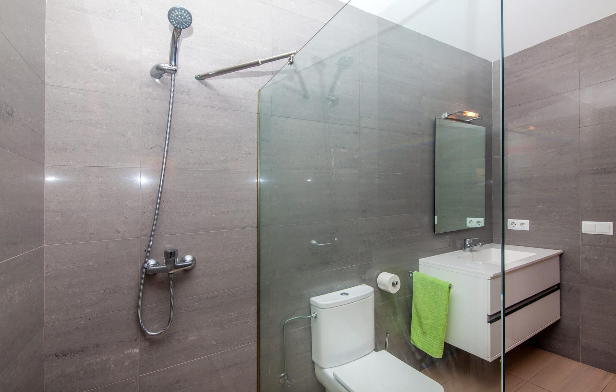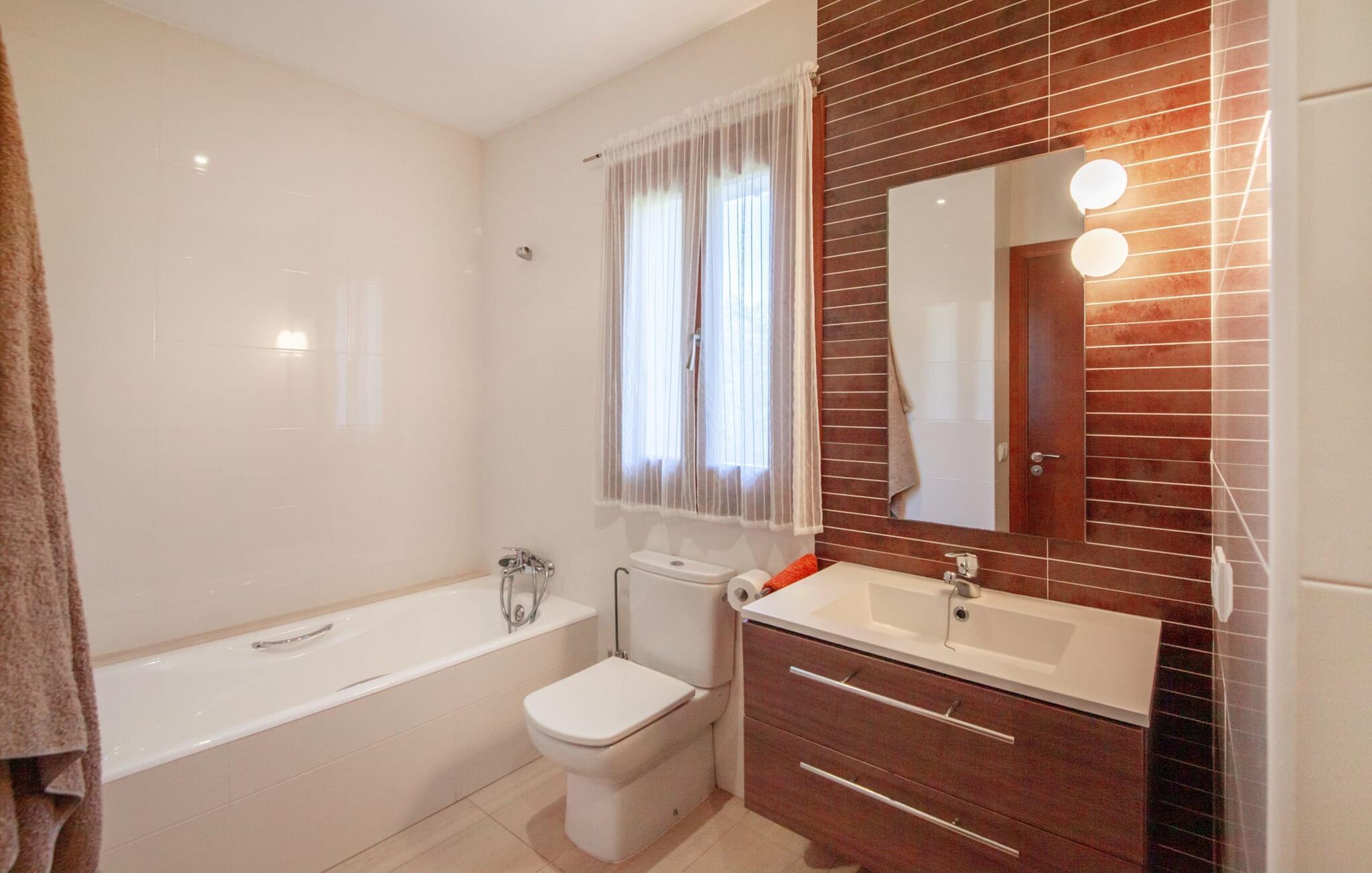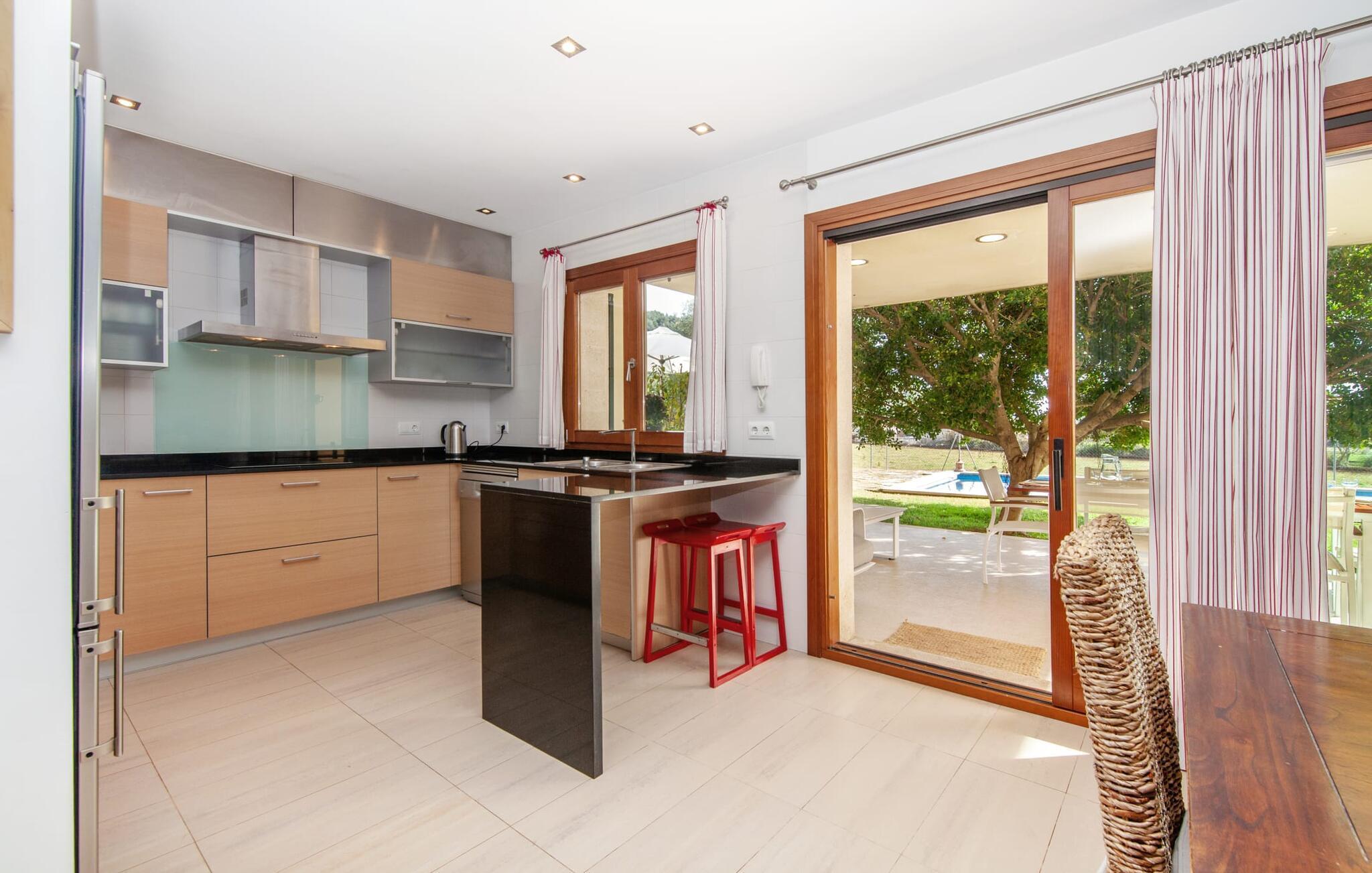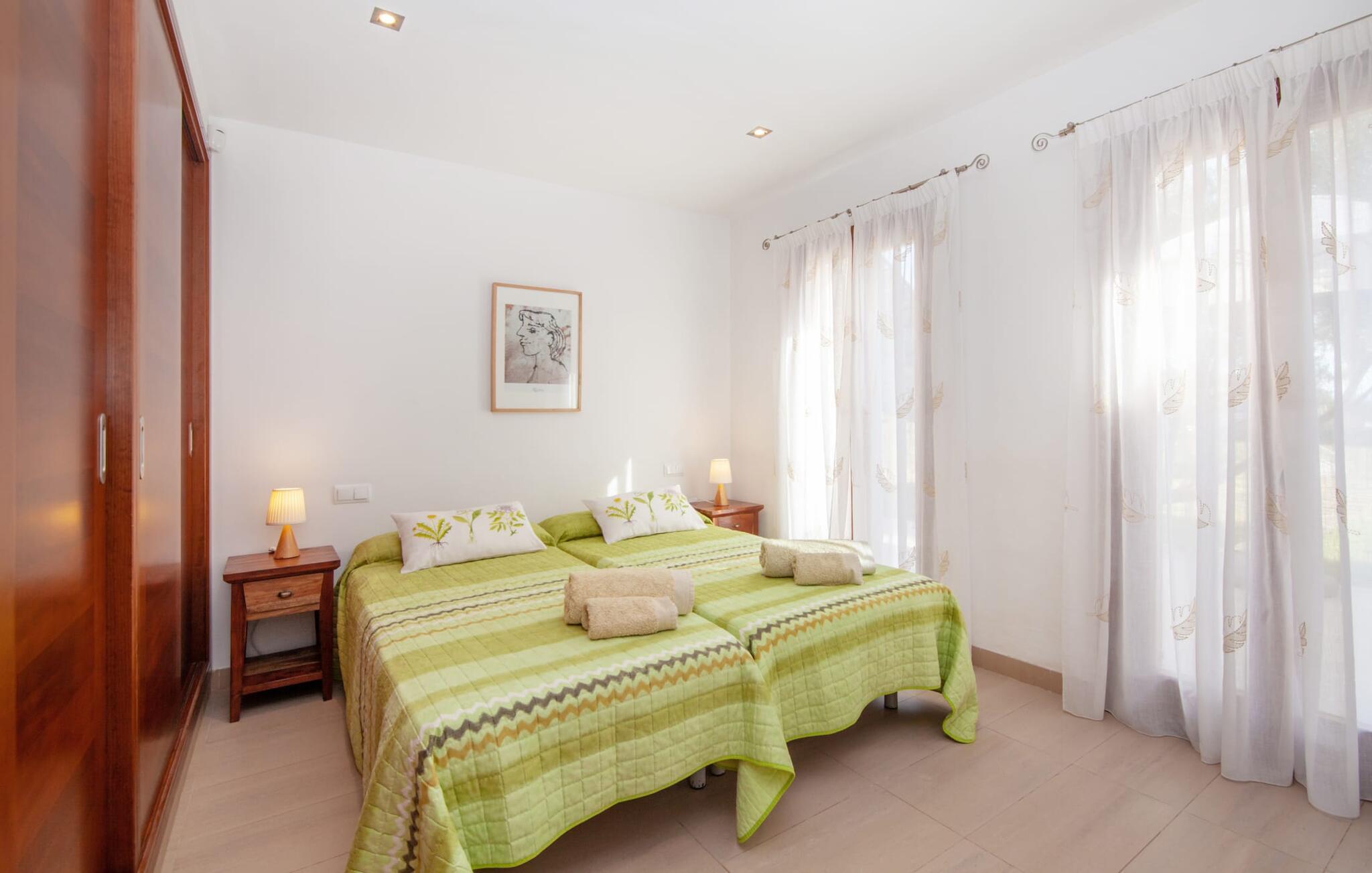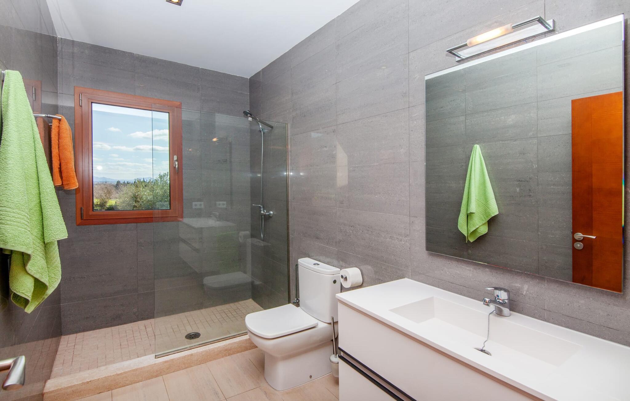Dette smukke feriehus på Mallorca er omgivet af vidunderligt frodige træer og udsigten fra forsiden af det omkringliggende landskab kunne næsten ikke være mere fortryllende. Du får straks lyst til at slå lejr ved siden af det høje palmetræ og nyde en bog og din yndlingsdrink på en af de komfortable liggestole. Fortsætte! Der er masser af plads på græsplænen til lange timers afslapning, og de børn, der er kommet med, vil helt sikkert nyde pladsen til at løbe rundt! På varme dage er der naturligvis ingen stop for en forfriskning, den lange pool inviterer dig til at tage et par omgange eller plaske rundt. Poolen er meget nem at nå via en hjørnetrappe og skråner derefter behageligt ned. Svømning med udsigt over bjergene! De stilfuldt indrettede, åbne eller overdækkede terrasseområder inviterer til afslapning lige ved siden af huset. Her er afstandene til køkken mm korte uden at gå på kompromis med udsigten til landskabet. Dette er et Fincallorca feriehus. Husets indretning er også indbydende: megen harmoni i form af absolut harmonisk arrangerede former, materialer og farver samt mange lyse, gulv-til-loft vinduer skaber en atmosfære af ren komfort. Komfortable polstrede møbler inviterer dig til at fejre afslapning indendørs med en smuk udsigt udenfor. Om pejsen eller fjernsynet (eller begge dele) giver komfort på en kølig aften er helt op til dig. Måske er det en god snak og et lækkert glas rødvin, der gør samværet endnu sjovere? Herfra er der glidende overgang til spisepladsen og det tilstødende, fuldt udstyrede køkken, hvor alt er til rådighed til selvforplejning. På denne nederste etage er der også et soveværelse med dobbeltseng og et badeværelse. På øverste etage er der yderligere tre soveværelser og to badeværelser, hvoraf det ene er en suite. Soveværelserne scorer også point med gulv til loft vinduer og en vidunderlig udsigt. Nu burde det stå klart: Hvis du værdsætter stil og komfort og ønsker at nyde den smukkeste landskabsudsigt på din ferie, er denne finca på Mallorca det rigtige sted for dig! Et drømmehus på Mallorca med en bekvem beliggenhed til attraktive udflugtsmål og stranden? Her er det! Herfra kan du nemt rejse i forskellige retninger og samtidig føle dig hjemme i den meget smagfuldt indrettede finca og nyde den smukke have. Der er godt 5 km til byen for shopping. Alcúdia-bugten med dens 16 km lange kæde af strande ligger også kun en kort køretur væk og byder på et varieret program.