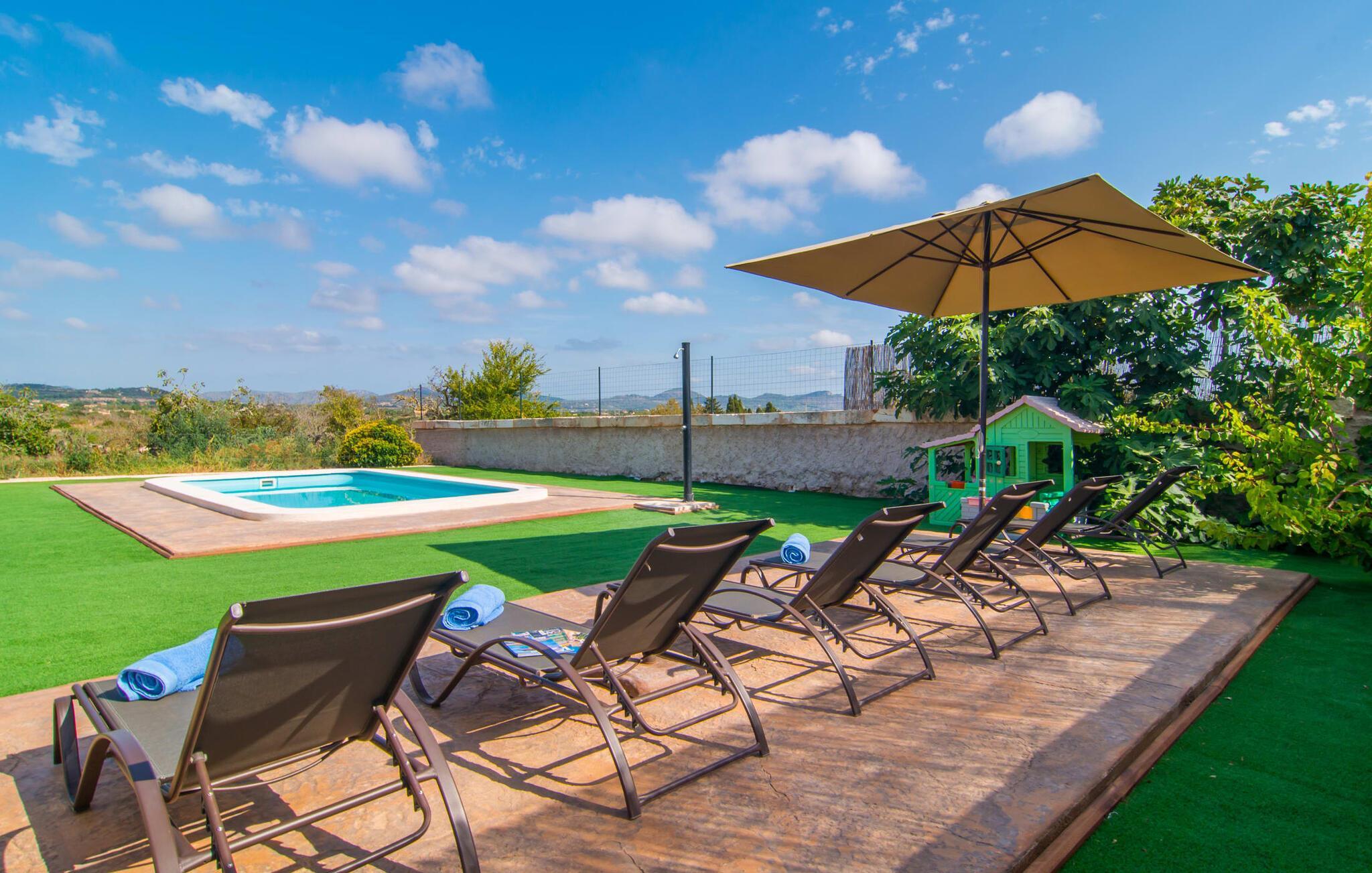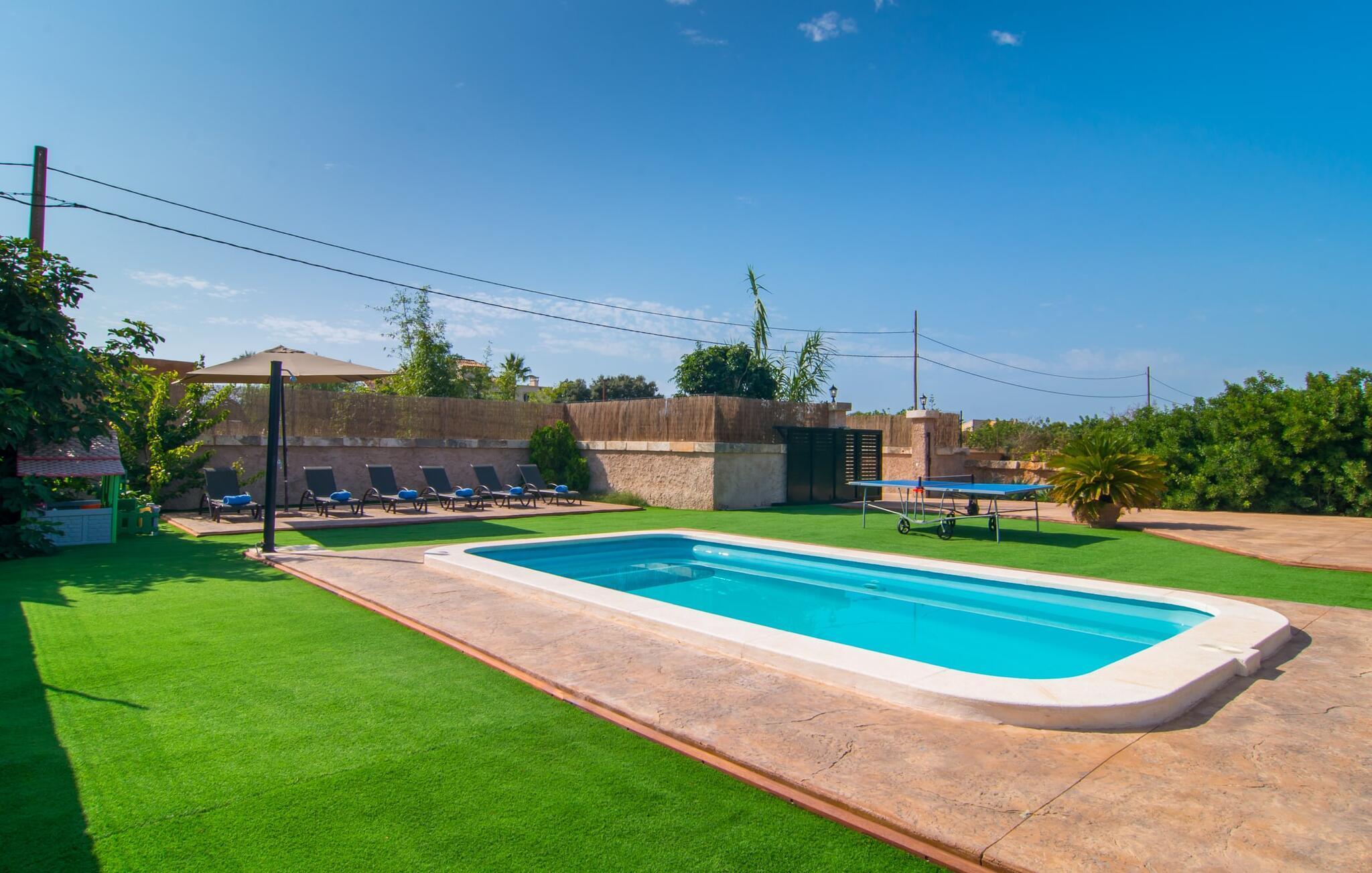 Villaen "Sa Pedrera d'es Turó" er en oase tæt på havet og byder på en masse variation på østkysten. Det gælder også for selve villaen: Det rummelige udendørsareal lokker jer til at tilbringe tidløse, solrige eftermiddage med en vidunderlig forfriskende pool. Omgivet af frodigt grønt kunstgræs kan I efter at have plasket rundt gøre jer godt tilpas på en af de komfortable liggestole, indtil den varme brise tørrer jeres solbeskinnede hud, og I måske får lyst til at spille bordtennis. Den overdækkede verandaterrasse byder på en hængekøje, en gyngestol, en verandagynge og et afslappende opholdsområde - attraktive steder at slappe af i den afslappende ro. Der er også en indbygget grill til jeres rådighed, så I kan bruge meget tid i den friske luft. Selve huset er smukt og komfortabelt indrettet. Et rustikt værelse med accent af mørke trætoner er udstyret med et sofahjørne, hvorfra I kan se en film sidst på dagen. Der er også et spisebord og, noget adskilt, et fremragende udstyret køkken med gaskomfur, så jeres opvaske bliver helt rigtige. Udover et badeværelse med et luksuriøst badekar byder stueetagen på et soveværelse med dobbeltseng. De yderligere to soveværelser med dobbeltsenge er placeret på øverste etage og har hver en børneseng, så unge familier vil finde ideelle ferieforhold i villaen. Der er også et badeværelse på denne etage. Diskrete kunstværker på væggene skaber en behagelig, behagelig atmosfære i hele huset. I kan blot snuppe en af cyklerne ved Villa "Sa Pedrera d'es Turó" for at køre de 1,5 km til Porto Cristo. Fra den smukke promenade er skuet af lystyachter og sejlbåde, der kommer og går, fascinerende at se. Der er en vej i nærheden af villaen, som nogle gange kan høres, men som giver god adgang til infrastruktur. I kan hurtigt nå smukke, fine sandstrande, hvoraf de fleste har en lavvandet indgang til havet, så familier kan tilbringe dejlige dage ved vandet. Manacor, 13 km væk, er en glimrende mulighed, hvis I ønsker at tilbringe en dag med shopping og caféer. I kan selvfølgelig også køre til øens hovedstad Palma, en time væk. Den søde villa "Sa Pedrera d'es Turó" er kun en kilometer væk fra en strand, og Porto Cristo, 2 km væk, lover maritim flair på jeres ferie. Her kan I slentre langs havnepromenaden og planlægge, hvilken af de attraktive østkyststrande, I gerne vil besøge næste gang. Om søndagen vækker det farverige ugentlige marked på Passeig de la Sirena opsigt.