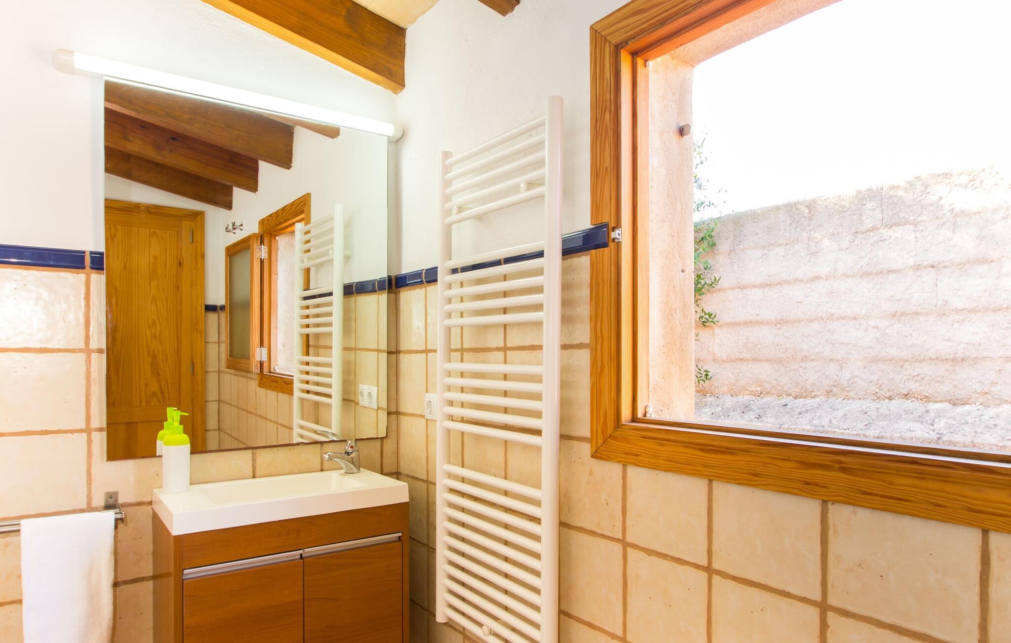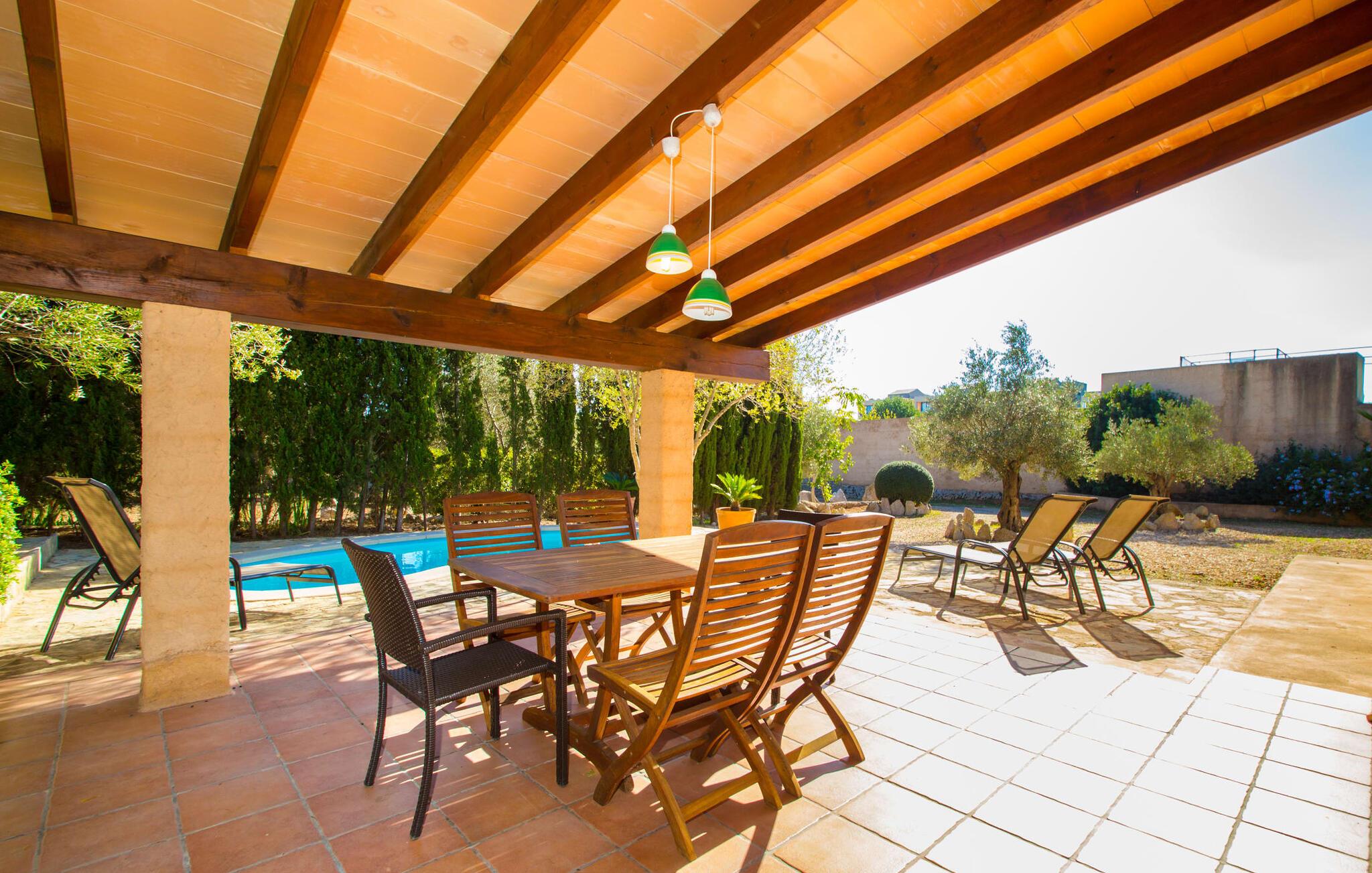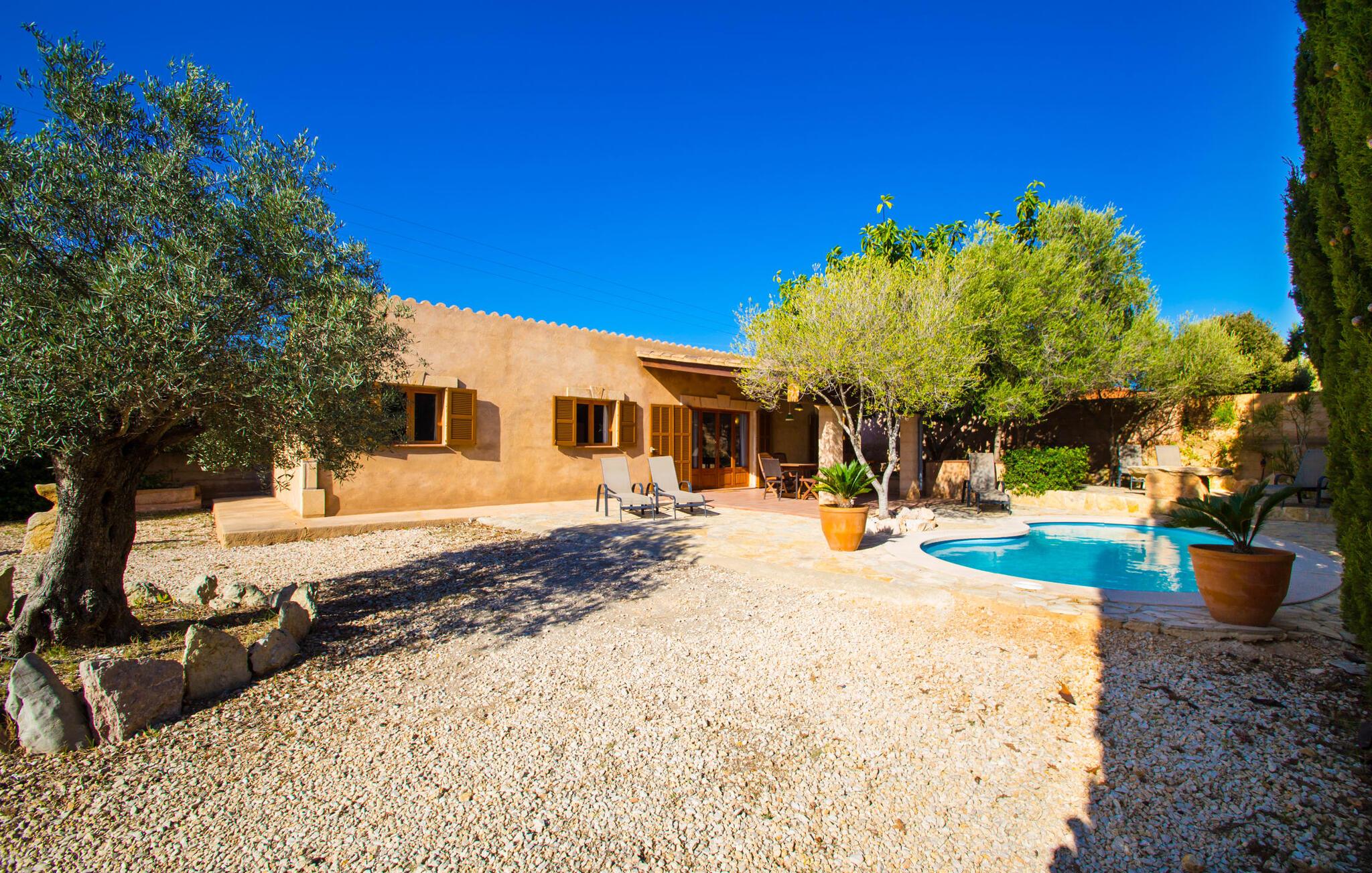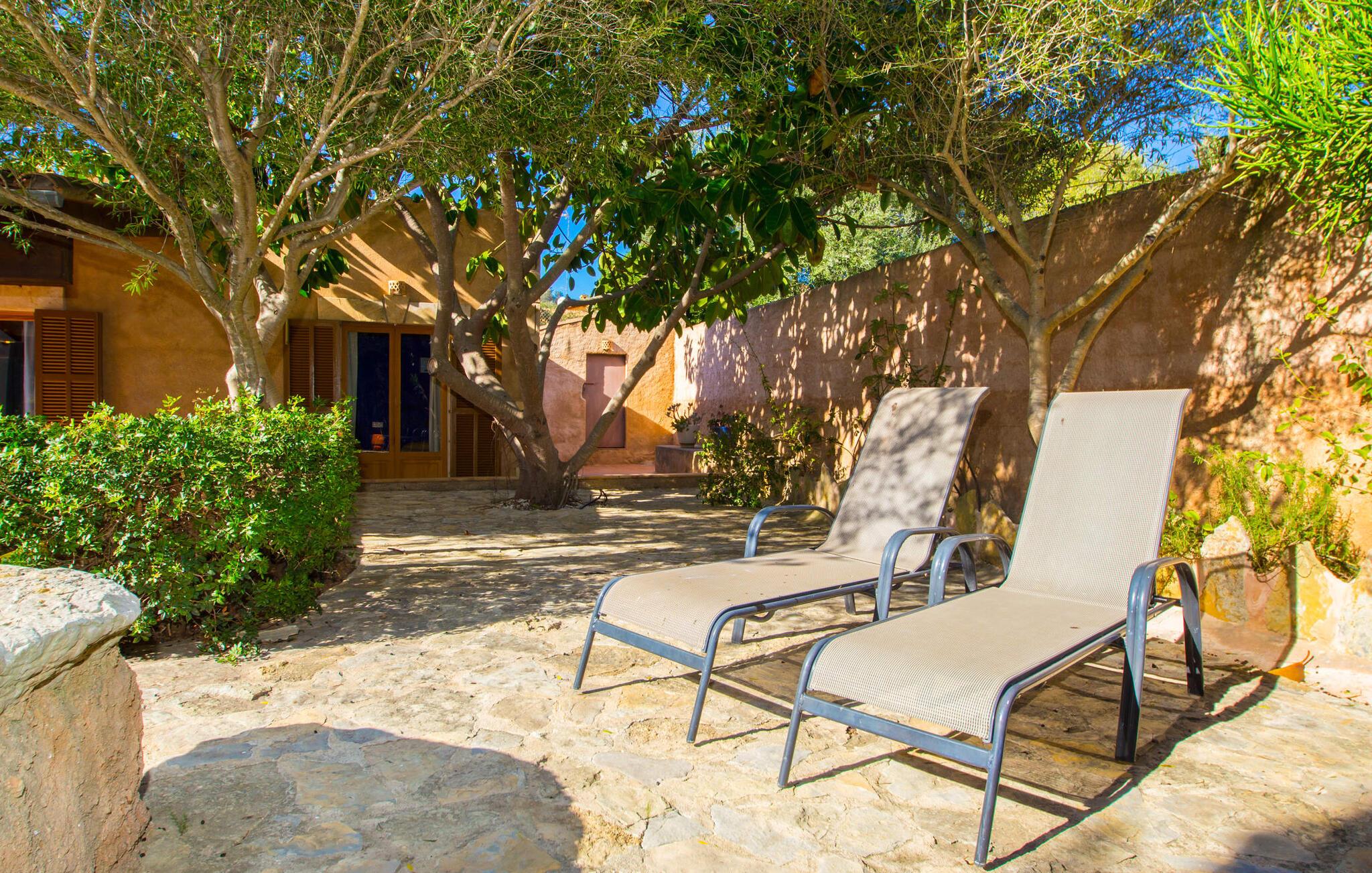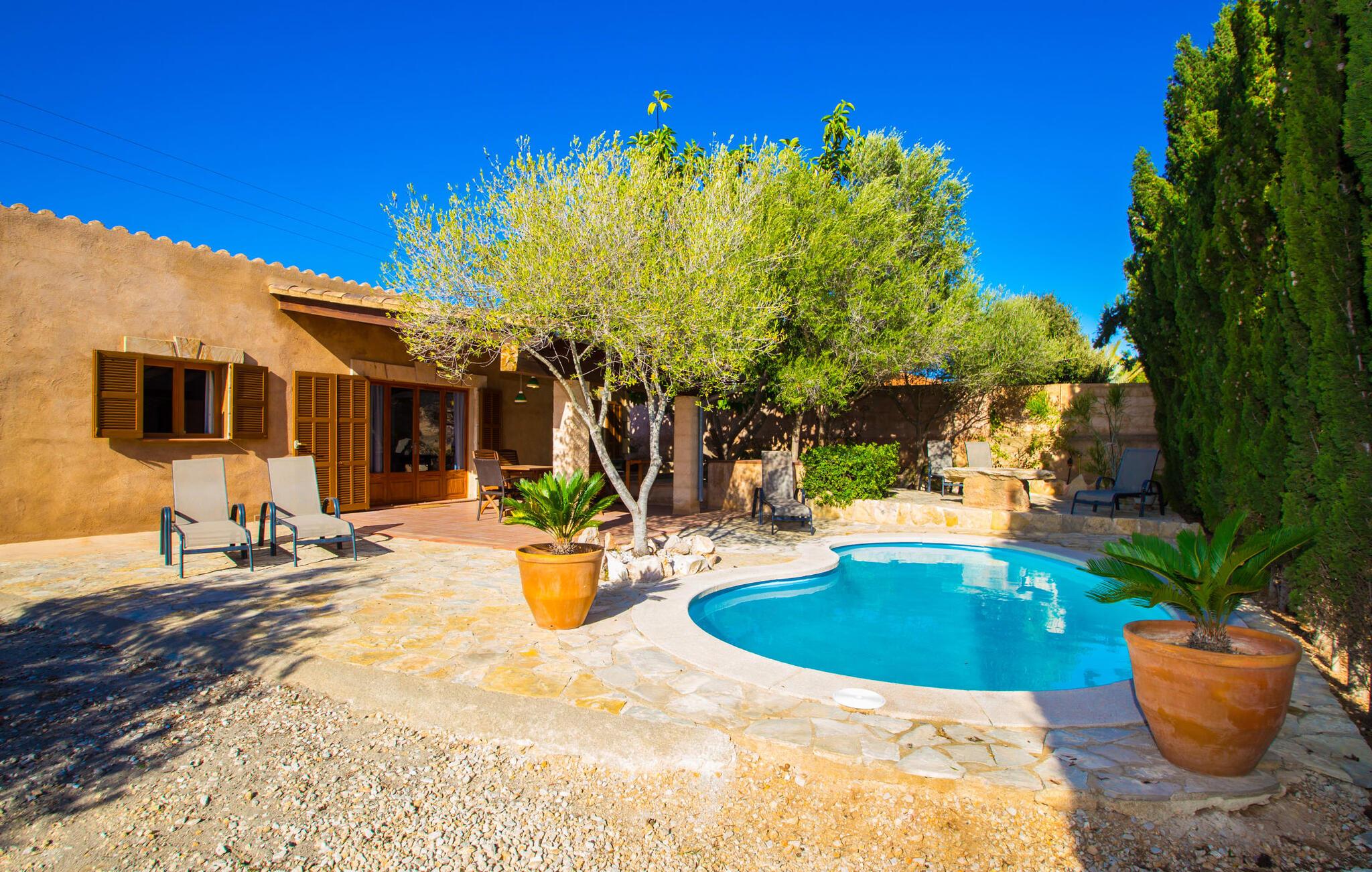 Denne ferievilla har en rolig beliggenhed med en fuldstændig indhegnet, smuk have: en fantastisk legeplads for børn og et sted, hvor I kan slappe af uforstyrret. Foran den 25 m² store overdækkede terrasse er der en 3 x 6 m nyreformet pool, hvor I kan forfriske jer til hjertens lyst på varme dage. Poolen har en praktisk trinindgang på den ene side. Selvfølgelig er der komfortable liggestole og havemøbler til rådighed, som I kan slappe af på. Den mobile gasgrill inviterer til kulinariske grillaftener, hvor I kan nyde lækre regionale delikatesser i en venlig atmosfære. Bag huset til venstre er der en to meter høj mur, der markerer starten på skrænten. Haven til nabovillaen begynder bag denne mur. Villaen "Sa Plana" har tre soveværelser, to badeværelser, et veludstyret køkken og en stue med spisebord. Villaen er velegnet til seks personer, og en barneseng eller babyseng kan nemt sættes op. Huset er udstyret med elektriske vægvarmere, mens stue og soveværelser på modsatte etage også har aircondition. Begge badeværelser er flisebelagt. En hurtig internetforbindelse er gratis tilgængelig for gæster. I kommer konventionelt ind i villaen via terrassen og kommer ind i den hyggelige stue, der er udstyret med komfortable sofaer, satellit-tv og et spisebord til seks personer. Køkkenet i ferievillaen er fuldt udstyret med opvaskemaskine, dobbeltvask, keramisk kogeplade, ovn, emhætte, køleskab med fryser, mikroovn, kaffemaskine, brødrister, blender og elkedel. I kan nyde en dyb og afslappende søvn i de hyggelige og venlige soveværelser. Det første soveværelse har en 1,80 mx 2,00 m dobbeltseng, det andet har to 0,90 mx 2,00 m senge. Badeværelset har badekar, toilet, bidet og håndvask, samt komfortable håndklæderadiatorer. Brusebadet er uden for huset. Adgang sker via udvendig dør til køkkenet. I kan også få adgang til den direkte fra poolen. Der er ingen grund til at pakke en hårtørrer hjemmefra, da den til enhver tid er klar til jer. En vaskemaskine, strygejern, strygebræt og en tøjhest er tilgængelige i et tilstødende rum. Den nærliggende Port Vell-strand er ca. 250 m lang og op til 20 m bred. I stormvejr anbefaler vi at tage til Canyamel eller Cala Millor (ca. 5 km væk) for at svømme. Cala Millor-bugten er omkring 9 km lang. Derudover ligger sandstranden "Cala sa Marjal" 2 km fra villaen. Omkring 10 km væk ligger den smukke by Artà, omkring 5 km fra Son Servera. Placeringen af Villa "Sa Plana" er også ideel for golfspillere, da Son Servera golfbanen kun ligger 2 km væk, mens Pula Golf er omkring 4 km væk. Den smukke villa "Sa Plana" ligger ved siden af Son Servera, på den nordøstlige del af øen, cirka tre minutters gang fra havet (Port Vell) og 2 km fra sandstranden. Omgivelserne i villaen, beliggende i en smuk have, er rolige. Køreturen mellem Palma de Mallorca Lufthavn og feriehuset tager cirka en time.