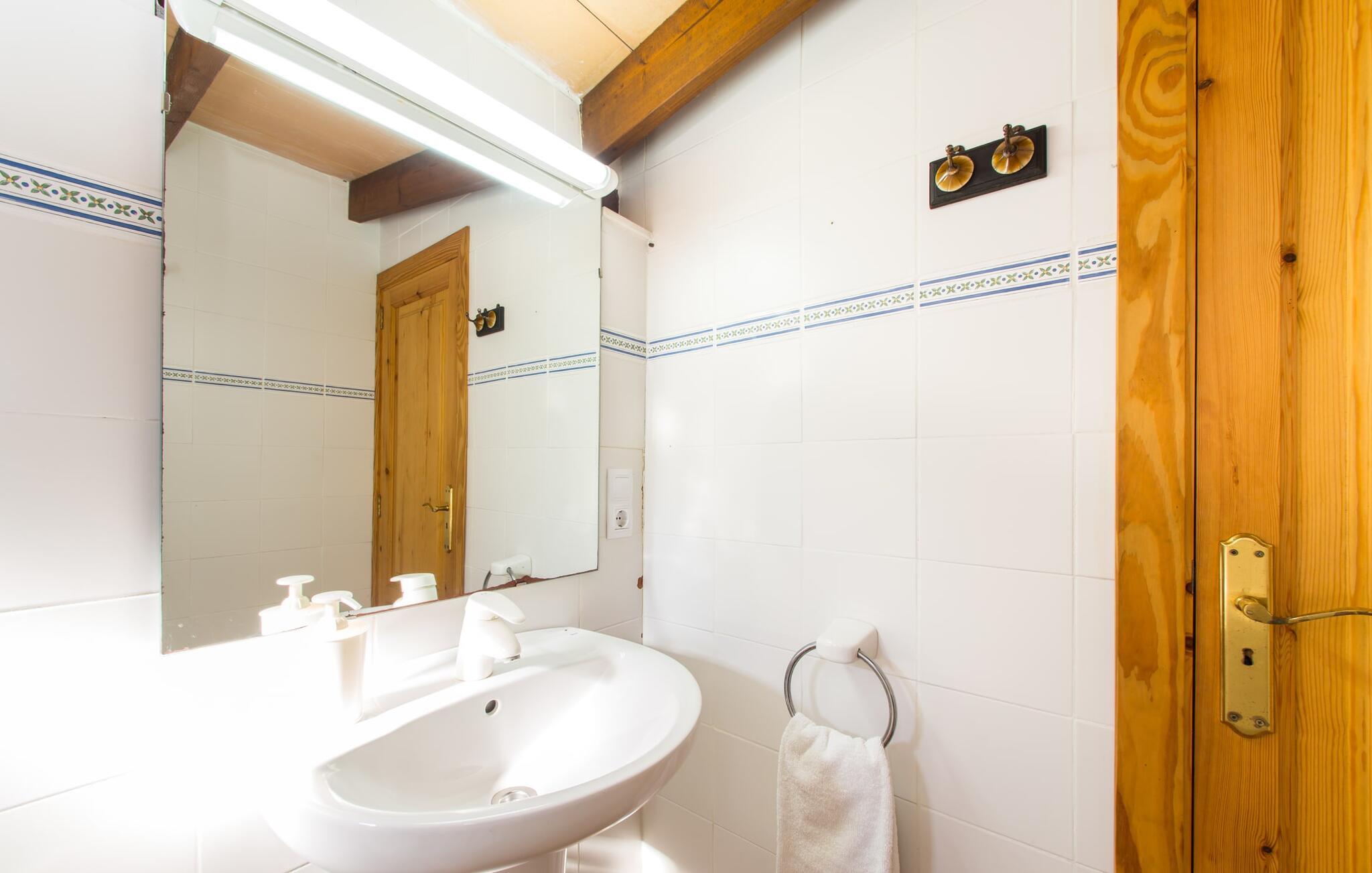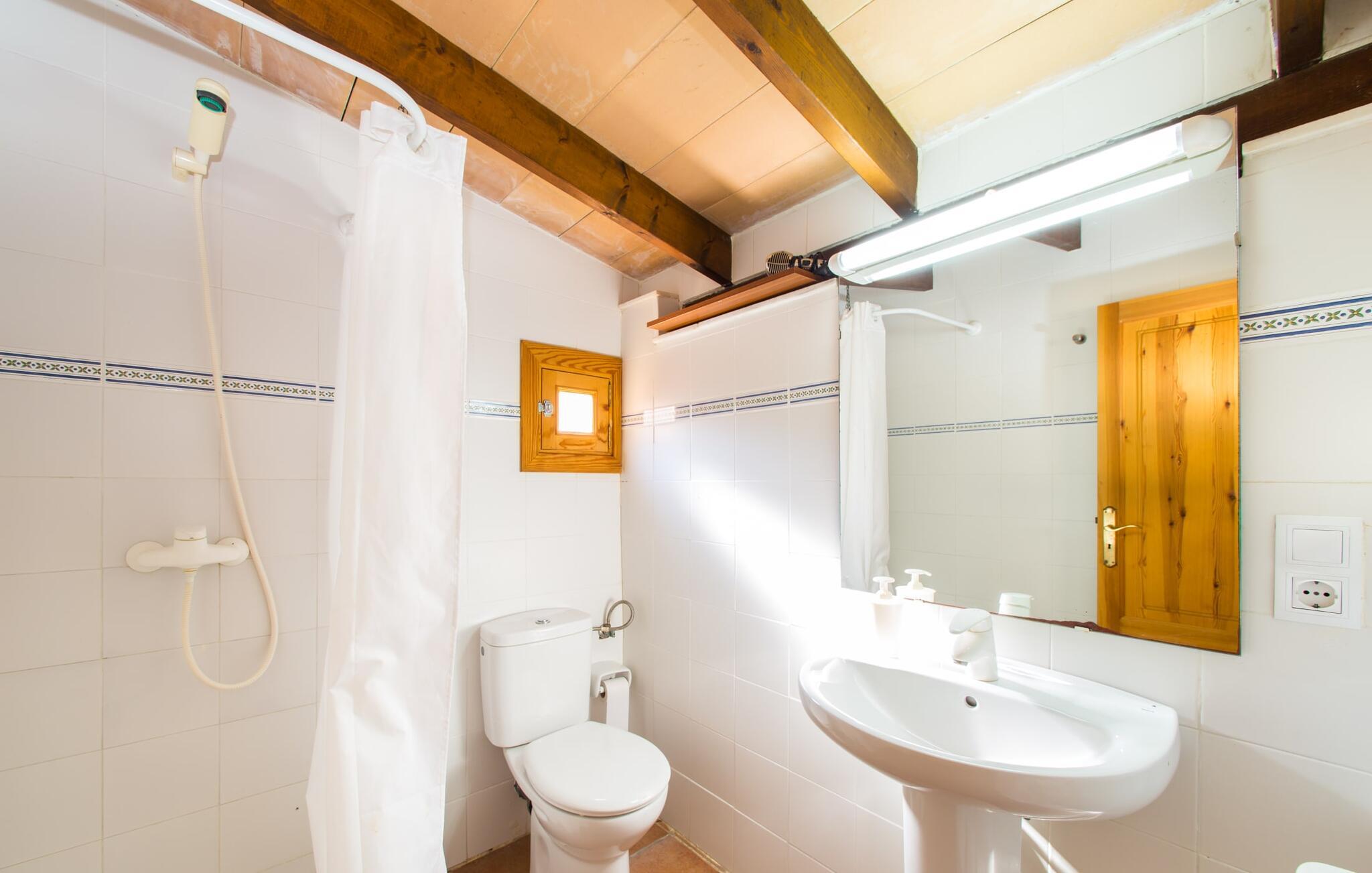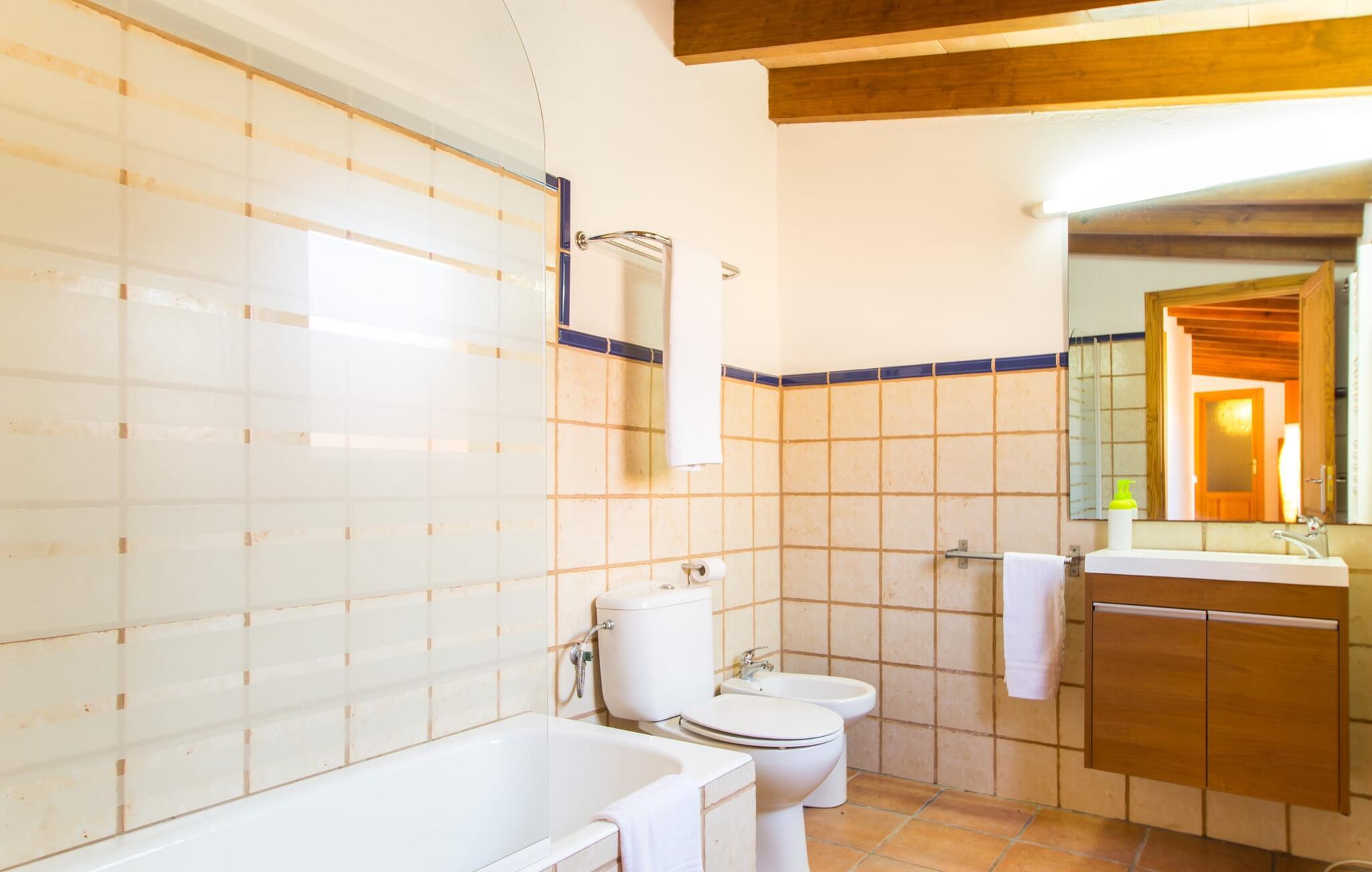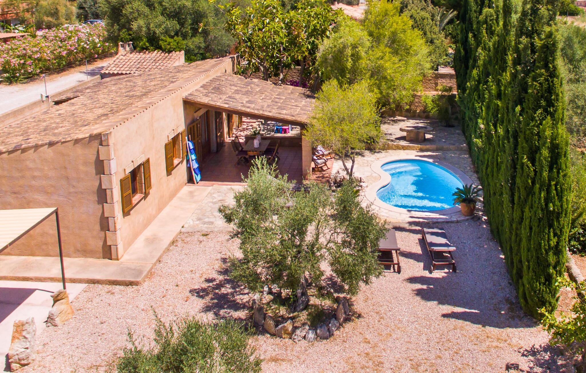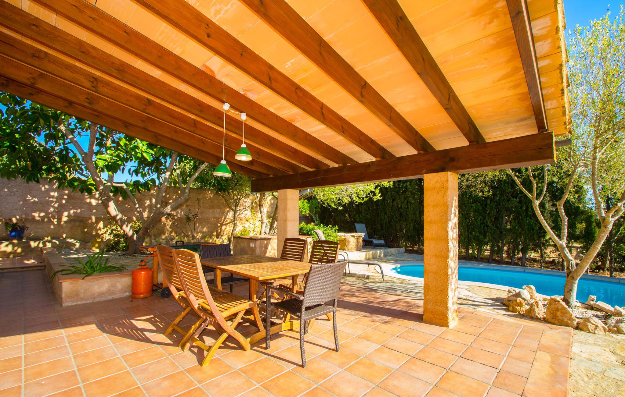 Denne ferievilla har en rolig beliggenhed med en fuldstændig indhegnet, smuk have: en fantastisk legeplads for børn og et sted, hvor I kan slappe af uforstyrret. Foran den 25 m² store overdækkede terrasse er der en 3 x 6 m nyreformet pool, hvor I kan forfriske jer til hjertens lyst på varme dage. Poolen har en praktisk trinindgang på den ene side. Selvfølgelig er der komfortable liggestole og havemøbler til rådighed, som I kan slappe af på. Den mobile gasgrill inviterer til kulinariske grillaftener, hvor I kan nyde lækre regionale delikatesser i en venlig atmosfære. Bag huset til venstre er der en to meter høj mur, der markerer starten på skrænten. Haven til nabovillaen begynder bag denne mur. Villaen "Sa Plana" har tre soveværelser, to badeværelser, et veludstyret køkken og en stue med spisebord. Villaen er velegnet til seks personer, og en barneseng eller babyseng kan nemt sættes op. Huset er udstyret med elektriske vægvarmere, mens stue og soveværelser på modsatte etage også har aircondition. Begge badeværelser er flisebelagt. En hurtig internetforbindelse er gratis tilgængelig for gæster. I kommer konventionelt ind i villaen via terrassen og kommer ind i den hyggelige stue, der er udstyret med komfortable sofaer, satellit-tv og et spisebord til seks personer. Køkkenet i ferievillaen er fuldt udstyret med opvaskemaskine, dobbeltvask, keramisk kogeplade, ovn, emhætte, køleskab med fryser, mikroovn, kaffemaskine, brødrister, blender og elkedel. I kan nyde en dyb og afslappende søvn i de hyggelige og venlige soveværelser. Det første soveværelse har en 1,80 mx 2,00 m dobbeltseng, det andet har to 0,90 mx 2,00 m senge. Badeværelset har badekar, toilet, bidet og håndvask, samt komfortable håndklæderadiatorer. Brusebadet er uden for huset. Adgang sker via udvendig dør til køkkenet. I kan også få adgang til den direkte fra poolen. Der er ingen grund til at pakke en hårtørrer hjemmefra, da den til enhver tid er klar til jer. En vaskemaskine, strygejern, strygebræt og en tøjhest er tilgængelige i et tilstødende rum. Den nærliggende Port Vell-strand er ca. 250 m lang og op til 20 m bred. I stormvejr anbefaler vi at tage til Canyamel eller Cala Millor (ca. 5 km væk) for at svømme. Cala Millor-bugten er omkring 9 km lang. Derudover ligger sandstranden "Cala sa Marjal" 2 km fra villaen. Omkring 10 km væk ligger den smukke by Artà, omkring 5 km fra Son Servera. Placeringen af Villa "Sa Plana" er også ideel for golfspillere, da Son Servera golfbanen kun ligger 2 km væk, mens Pula Golf er omkring 4 km væk. Den smukke villa "Sa Plana" ligger ved siden af Son Servera, på den nordøstlige del af øen, cirka tre minutters gang fra havet (Port Vell) og 2 km fra sandstranden. Omgivelserne i villaen, beliggende i en smuk have, er rolige. Køreturen mellem Palma de Mallorca Lufthavn og feriehuset tager cirka en time.