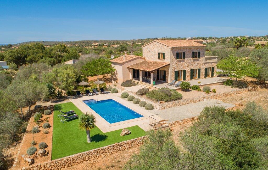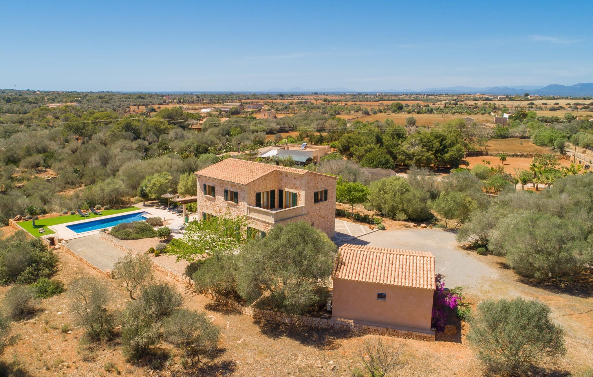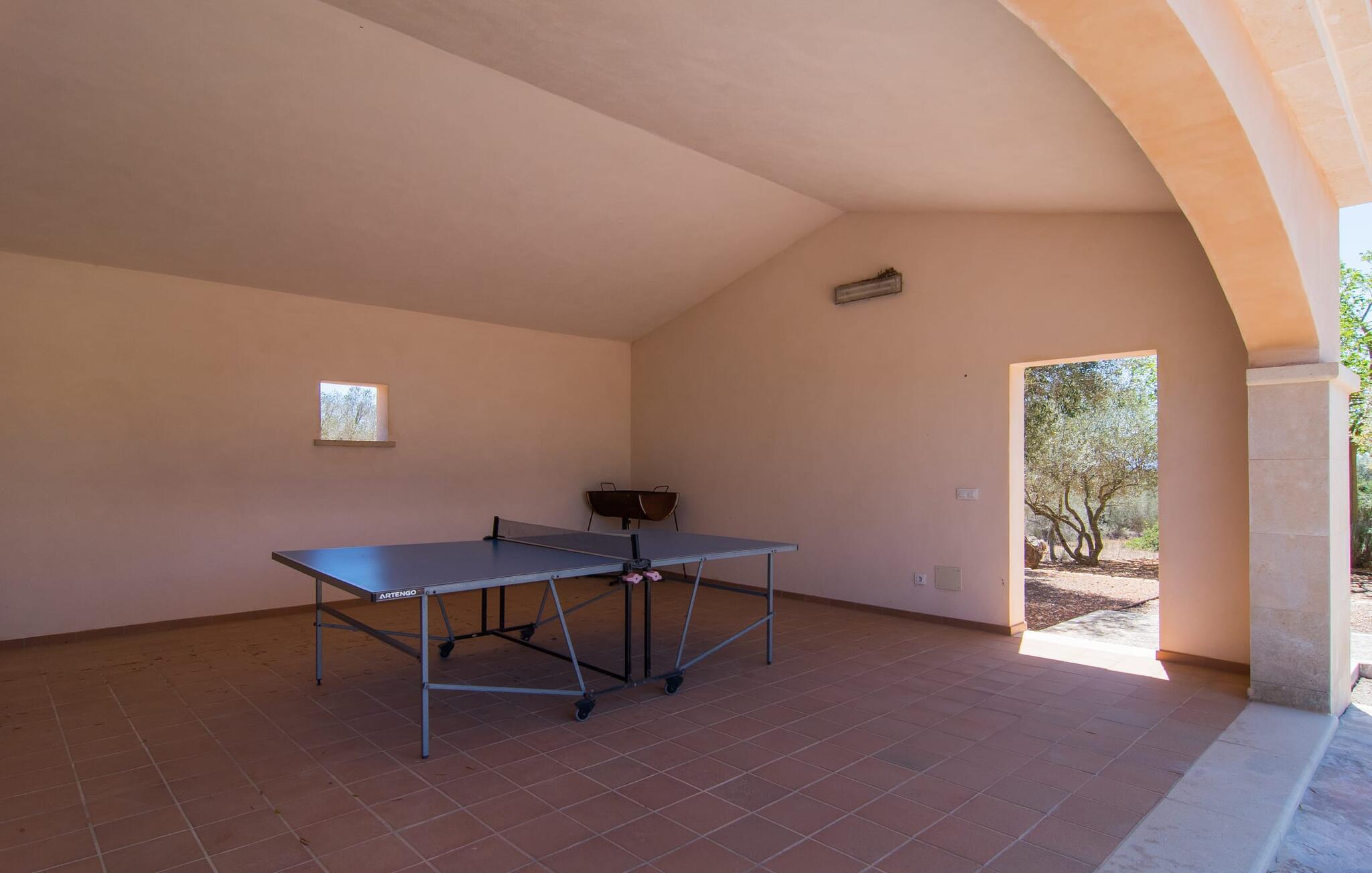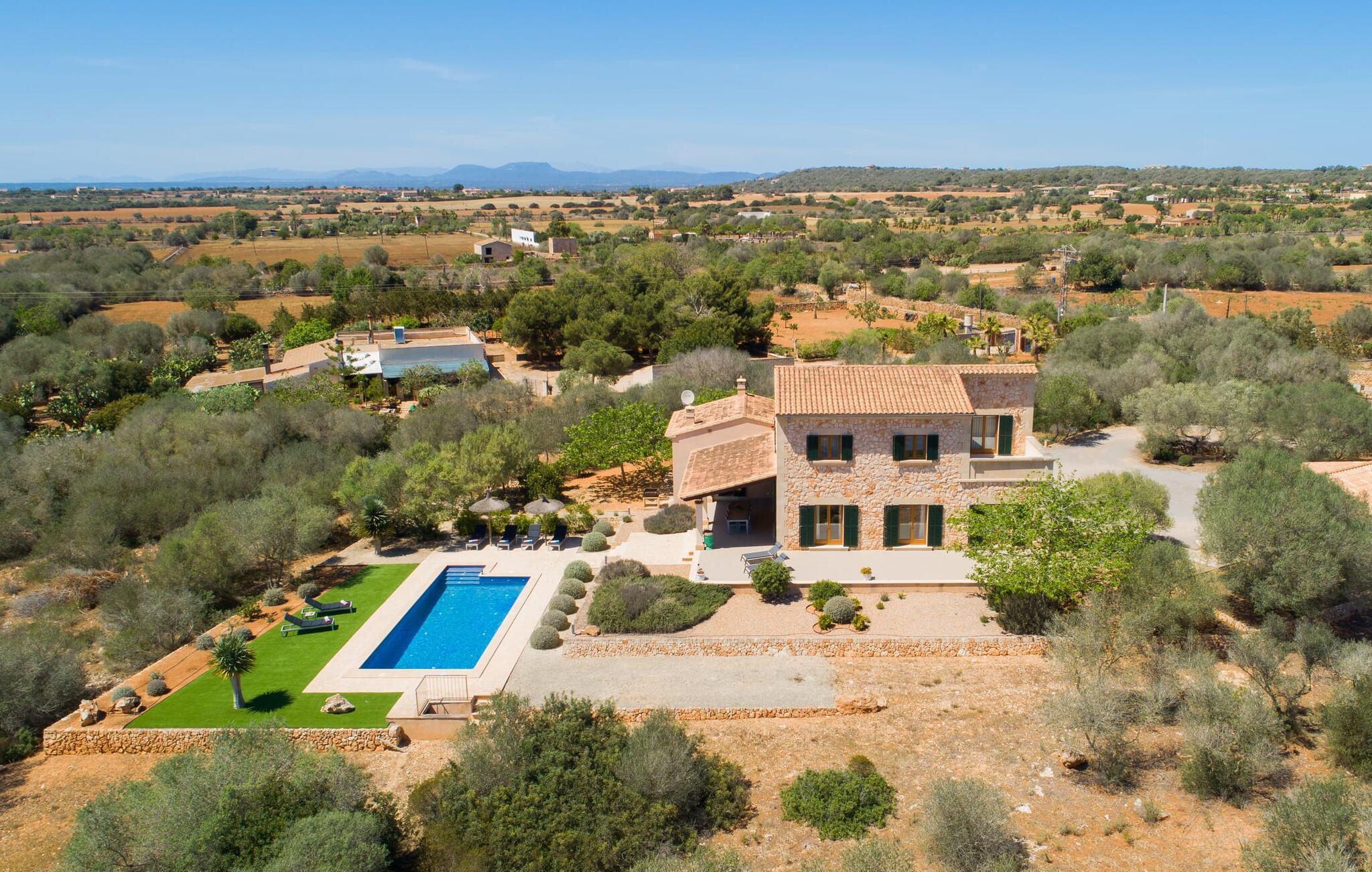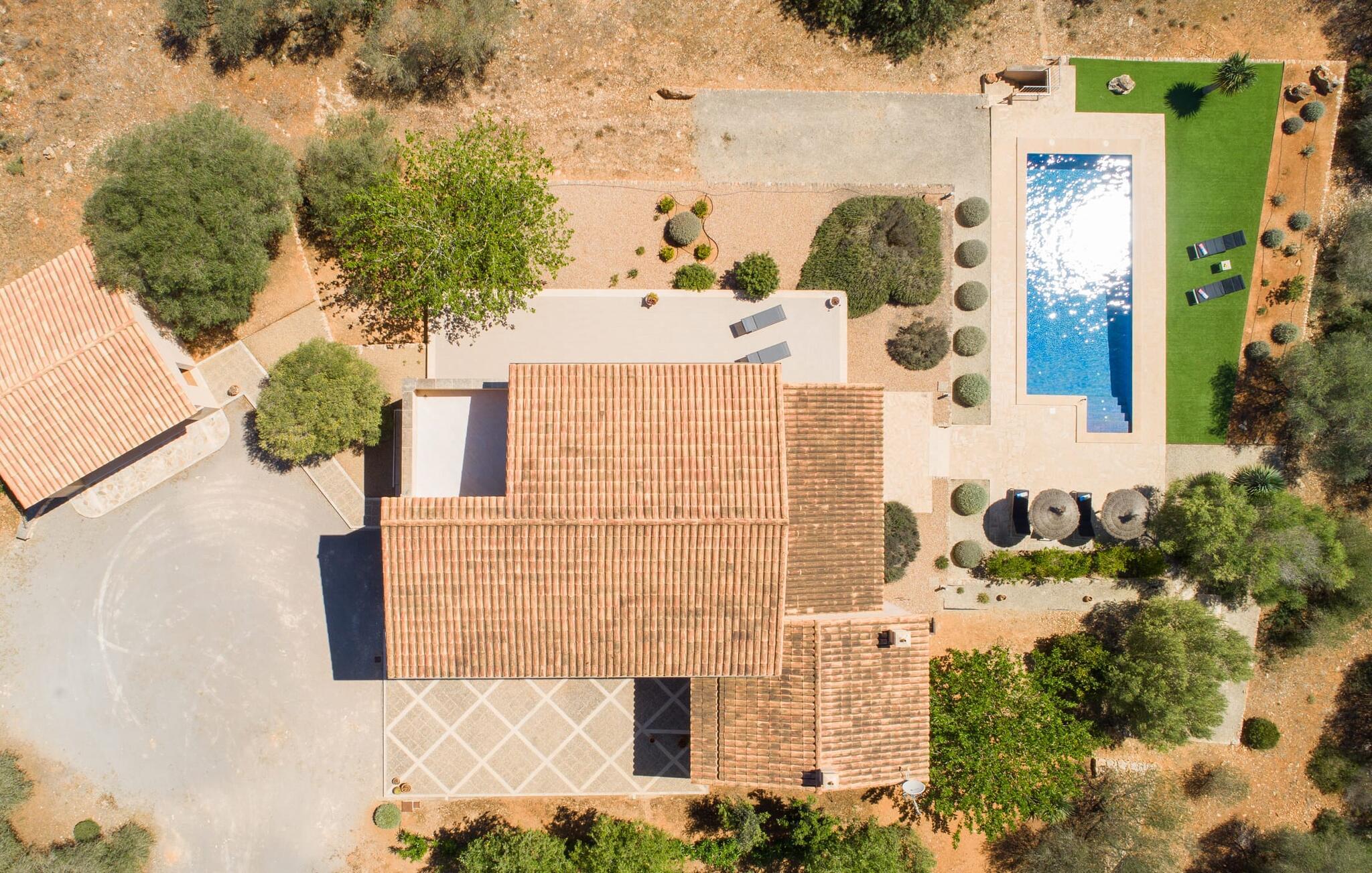 "Sa Pleta Petita" er et smukt vedligeholdt landsted i den sydlige del af Mallorca, der tilbyder plads nok og privatliv til op til otte gæster. Stuehuset i natursten ligger på en rummelig 14.000 m² stor grund og er omgivet af oliventræer og middelhavsflora, ideel til afslappede gåture. Den overdækkede terrasse har et langt spisebord til udendørs spisning, mens forskellige solbeskinnede områder, herunder en tagterrasse med liggestole, er ideelle til at slappe af. Nyd en forfriskende svømmetur i den store rektangulære pool eller deltag i venskabelige spil i det overdækkede bordtennisområde. Interiøret kombinerer elegance med bondehuscharme, der viser lys, naturlige farver og fine trædetaljer. I stueetagen er der en rummelig stue og spisestue i åbent plan, et smart køkken med udgang til terrassen og et soveværelse med dobbeltseng med et moderne badeværelse. Ovenpå er der tre ekstra soveværelser, herunder et med eget badeværelse, samt to separate badeværelser, hvilket sikrer komfort for alle gæster. Ses Selines ligger kun omkring 1,4 km væk med udlejningsbil. Og forskellige strande som den smukke naturlige strand Can Curt eller Platja des Port, den lille bystrand Colonia de Sant Jordi, er mindre end 5 km væk fra jeres feriehus. Aircondition i soveværelserne er inkluderet i prisen, men brugen er begrænset til mellem kl. 21.00 og 09.00. Gebyret afregnes herefter kontant på stedet.