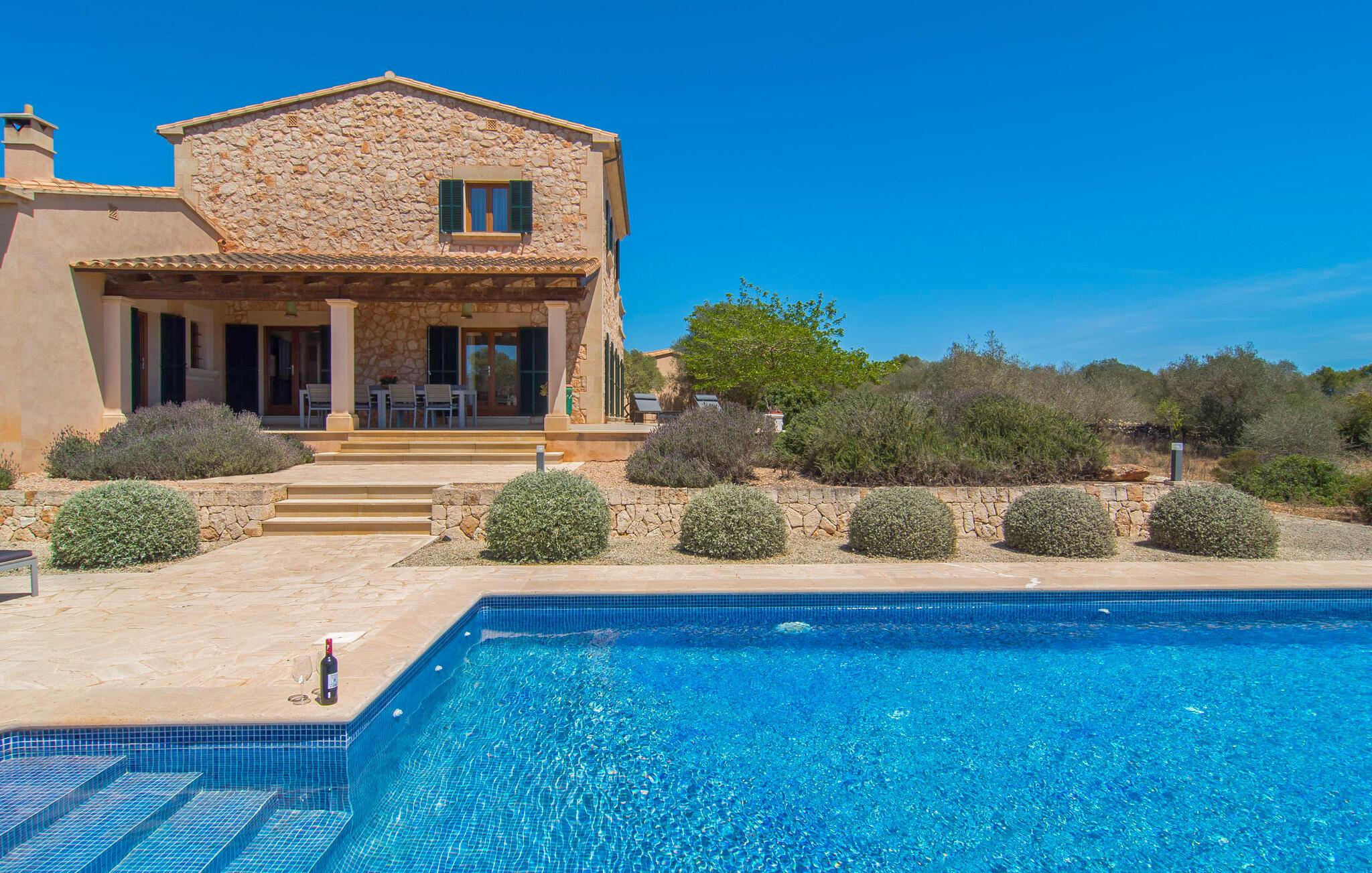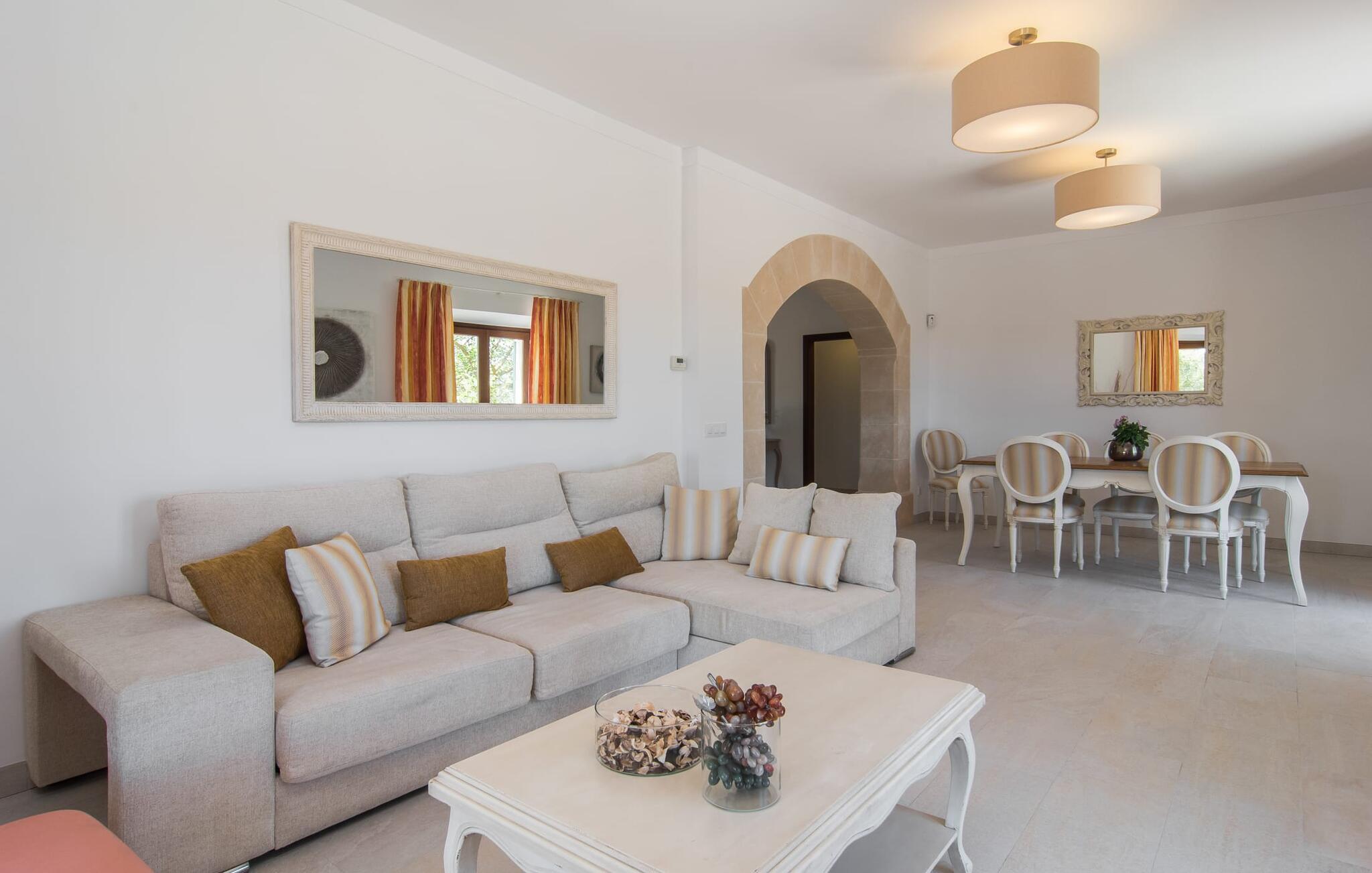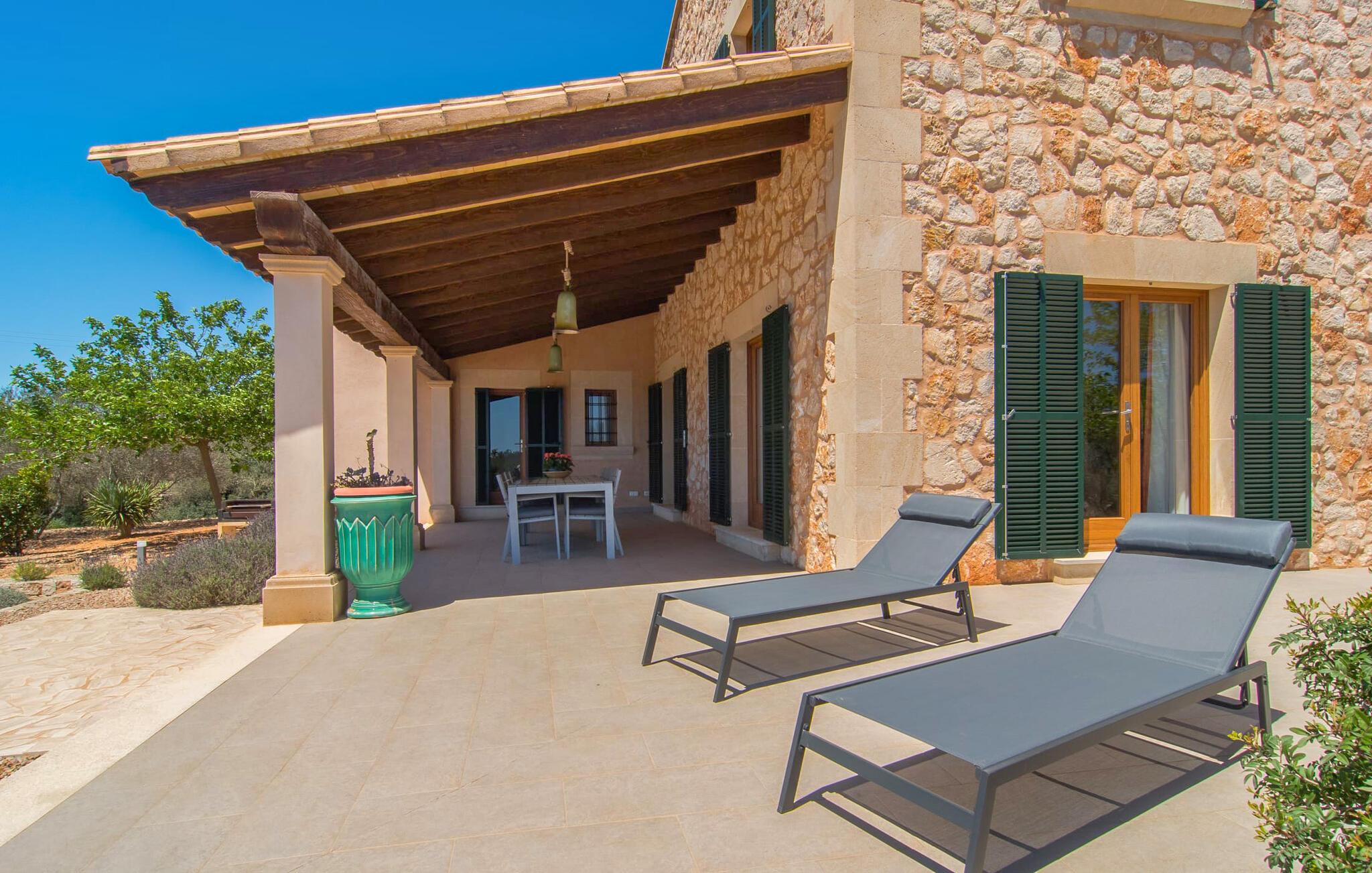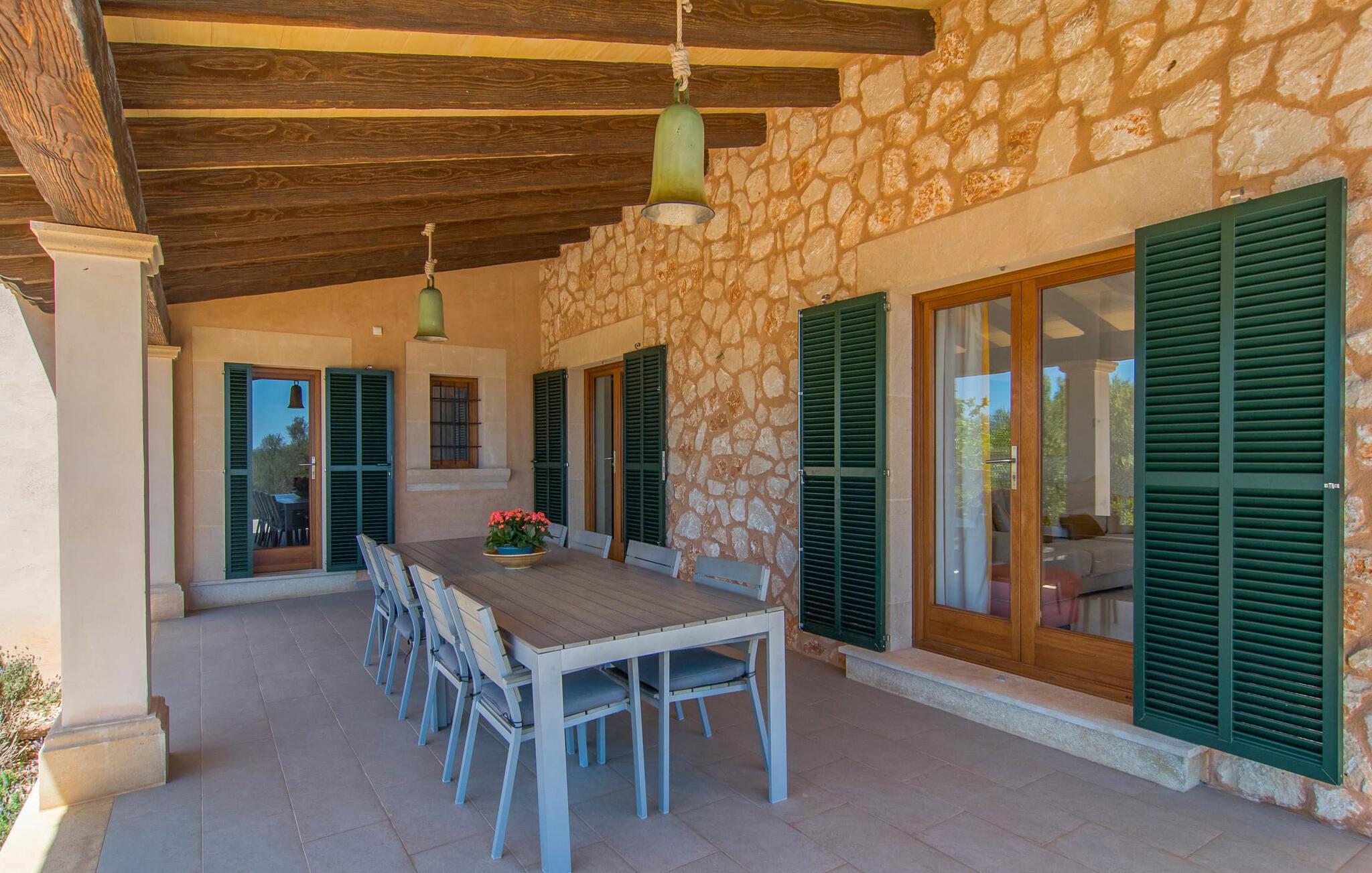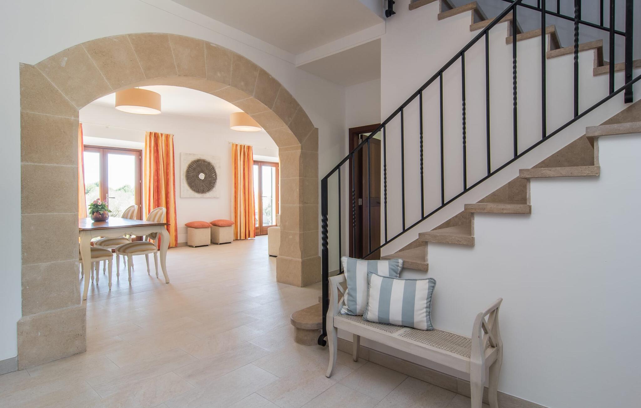 "Sa Pleta Petita" er et smukt vedligeholdt landsted i den sydlige del af Mallorca, der tilbyder plads nok og privatliv til op til otte gæster. Stuehuset i natursten ligger på en rummelig 14.000 m² stor grund og er omgivet af oliventræer og middelhavsflora, ideel til afslappede gåture. Den overdækkede terrasse har et langt spisebord til udendørs spisning, mens forskellige solbeskinnede områder, herunder en tagterrasse med liggestole, er ideelle til at slappe af. Nyd en forfriskende svømmetur i den store rektangulære pool eller deltag i venskabelige spil i det overdækkede bordtennisområde. Interiøret kombinerer elegance med bondehuscharme, der viser lys, naturlige farver og fine trædetaljer. I stueetagen er der en rummelig stue og spisestue i åbent plan, et smart køkken med udgang til terrassen og et soveværelse med dobbeltseng med et moderne badeværelse. Ovenpå er der tre ekstra soveværelser, herunder et med eget badeværelse, samt to separate badeværelser, hvilket sikrer komfort for alle gæster. Ses Selines ligger kun omkring 1,4 km væk med udlejningsbil. Og forskellige strande som den smukke naturlige strand Can Curt eller Platja des Port, den lille bystrand Colonia de Sant Jordi, er mindre end 5 km væk fra jeres feriehus. Aircondition i soveværelserne er inkluderet i prisen, men brugen er begrænset til mellem kl. 21.00 og 09.00. Gebyret afregnes herefter kontant på stedet.