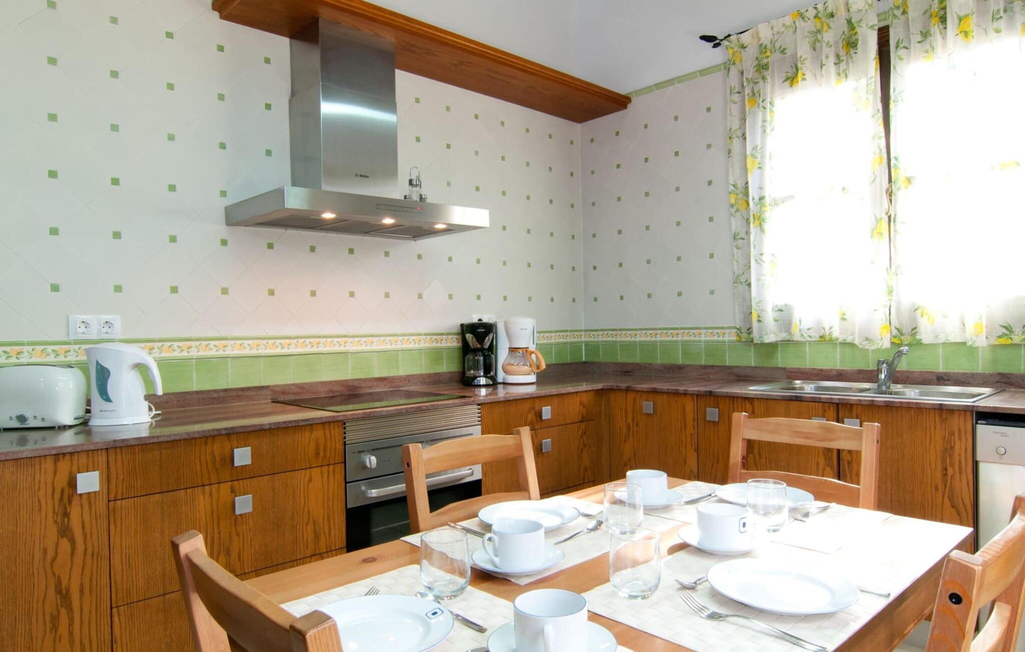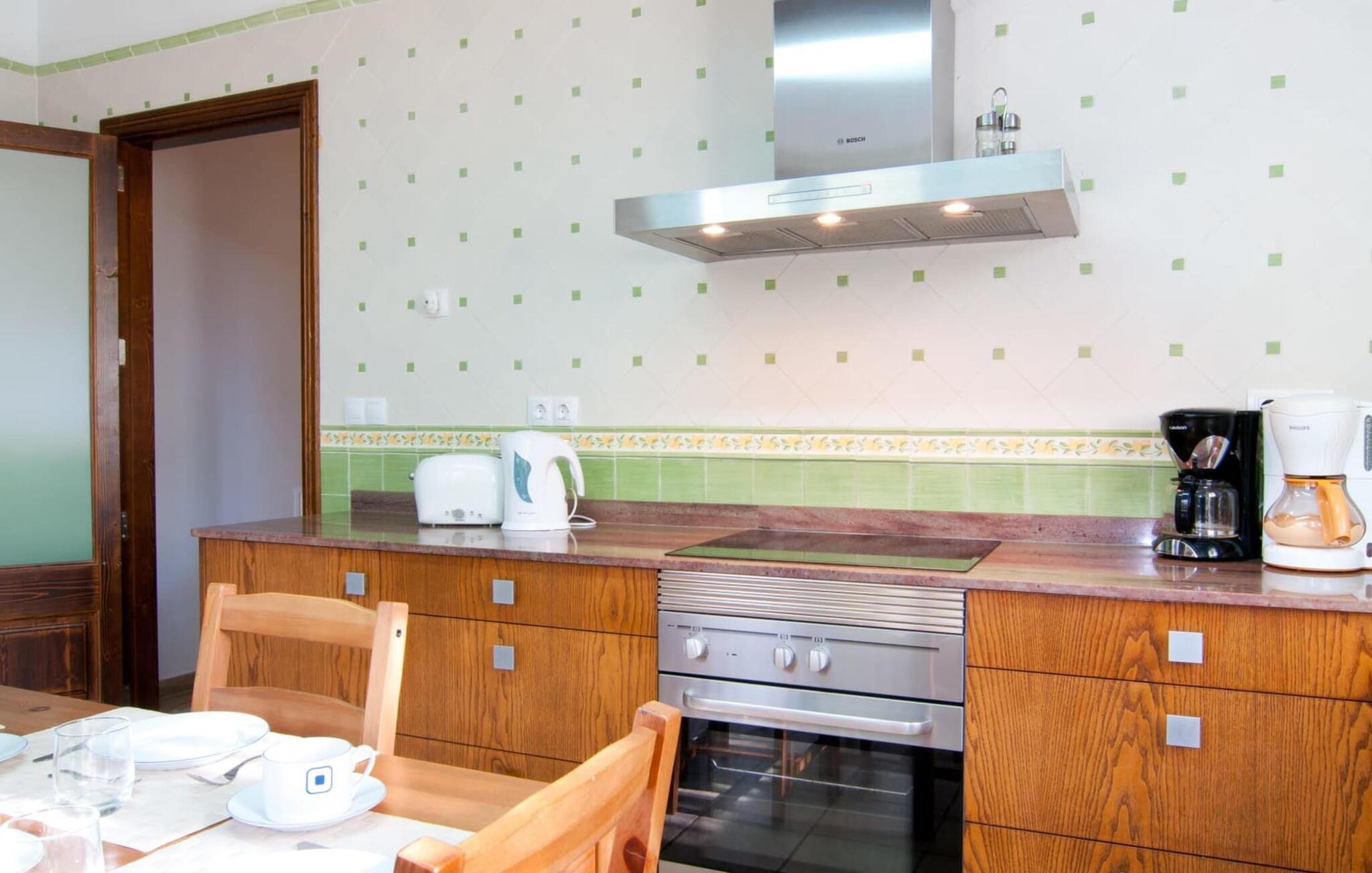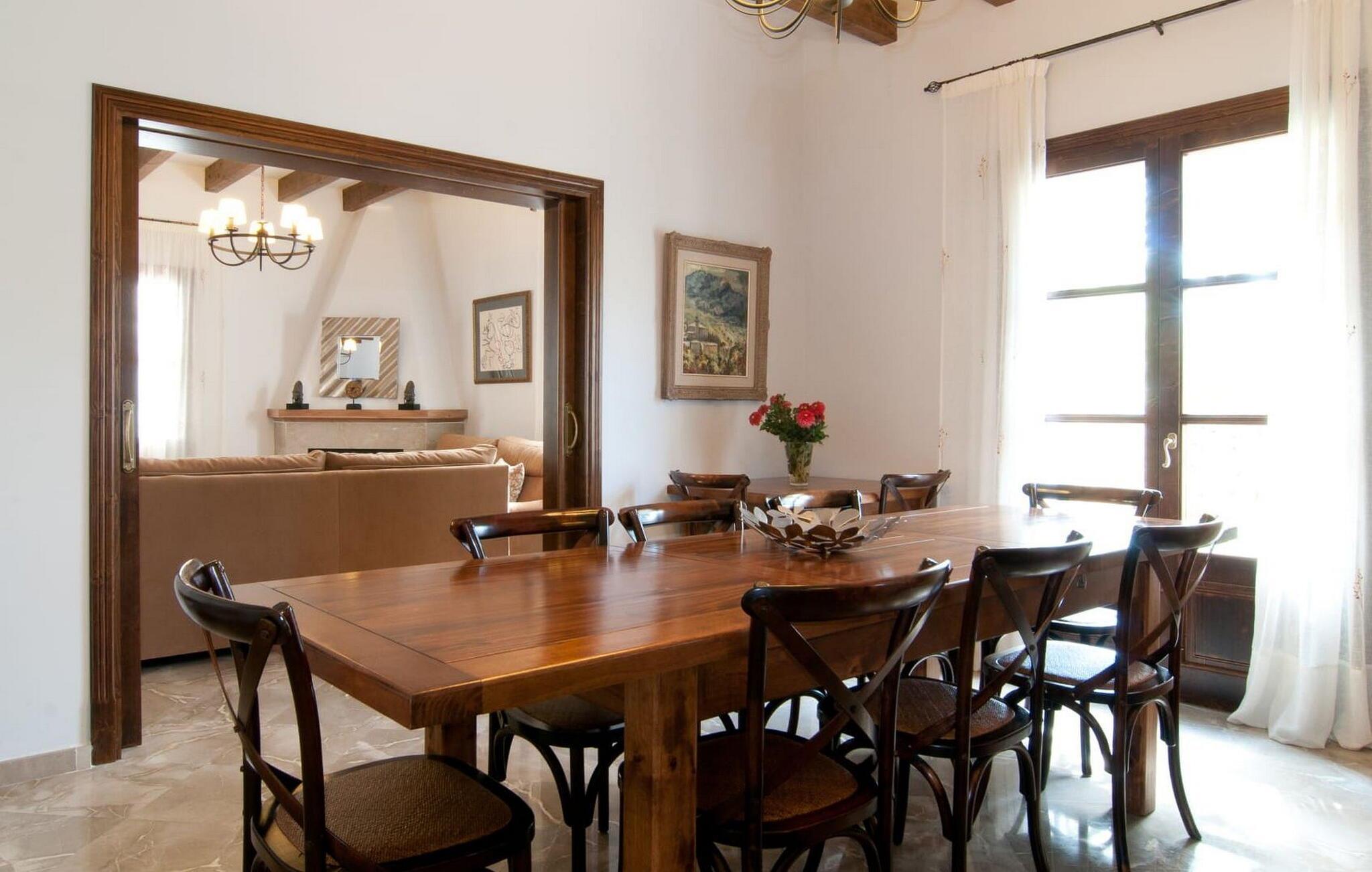 Indenfor har alle værelser aircondition for maksimal komfort. Den rummelige opholds- og spisestue med en hyggelig brændeovn skaber en varm og indbydende atmosfære. Det fuldt udstyrede køkken er ideelt til at tilberede lækre måltider. Villaen har seks dobbeltværelser, hver med eget badeværelse, plus et ekstra toilet, hvilket gør denne villa perfekt til grupper eller familier.