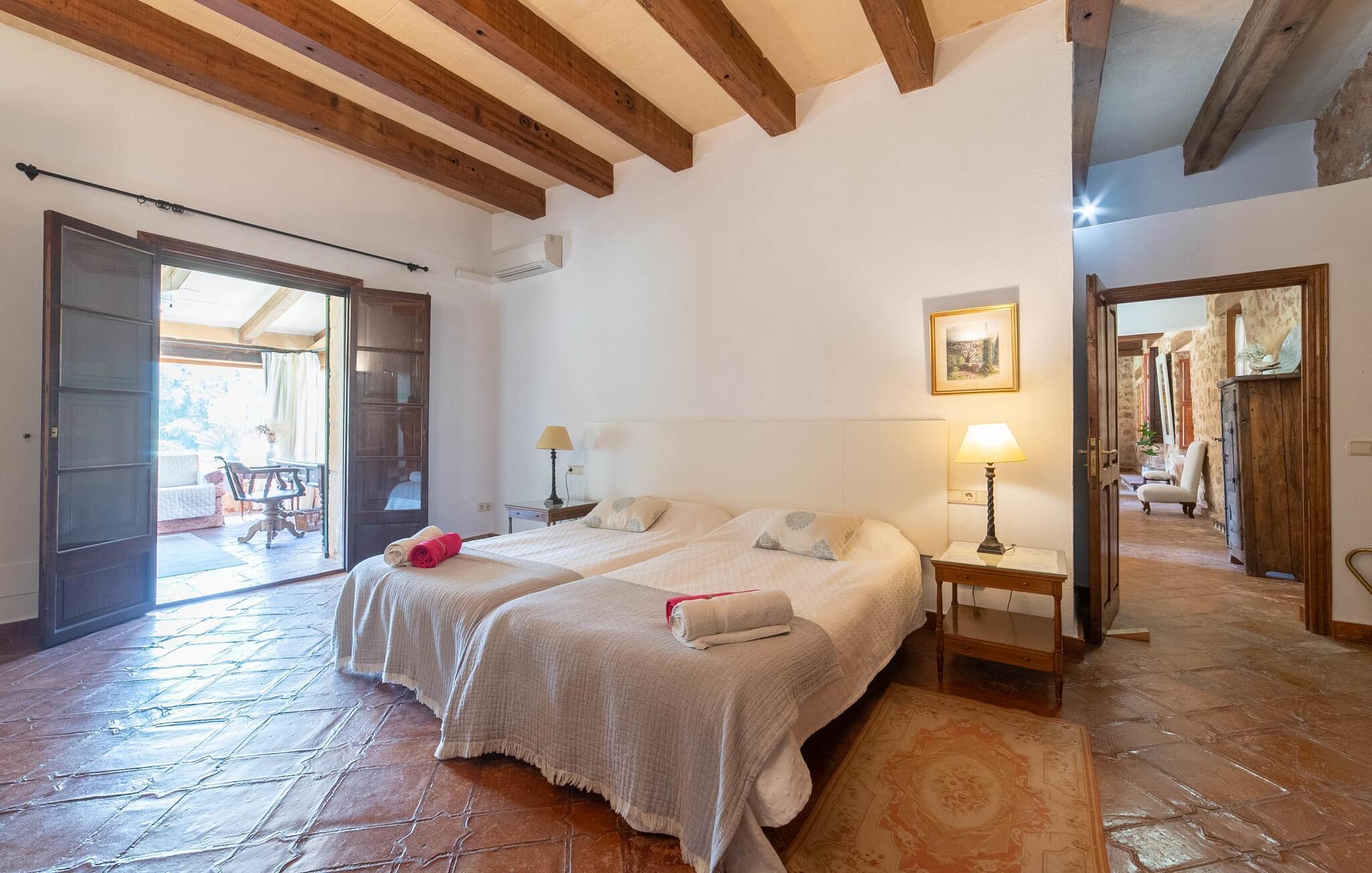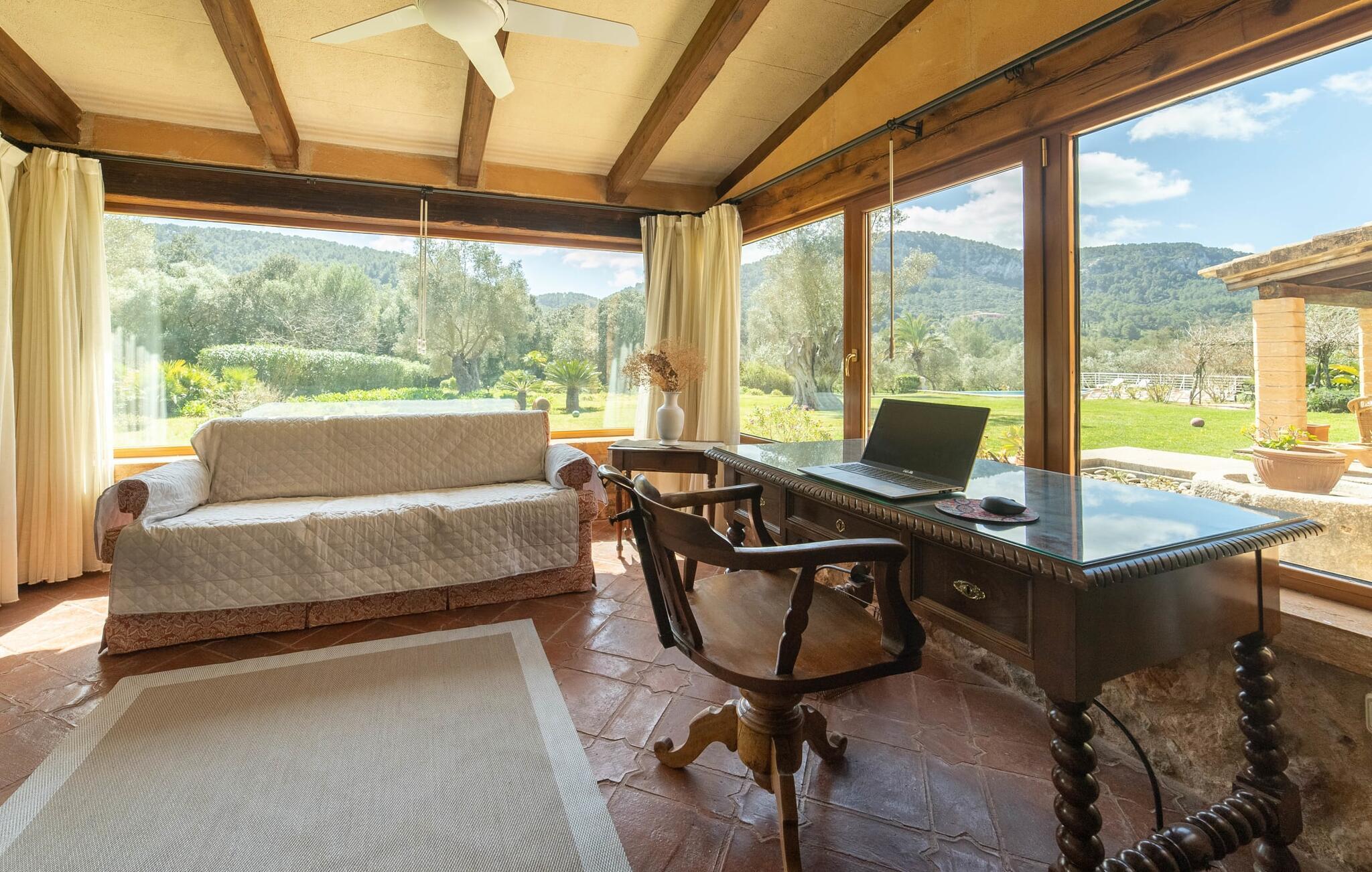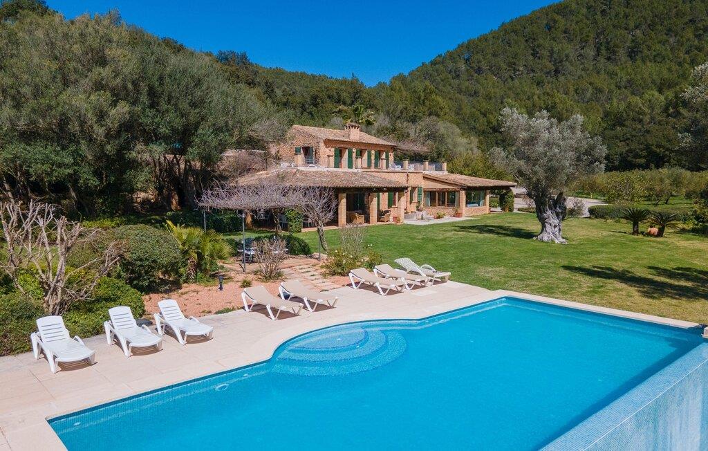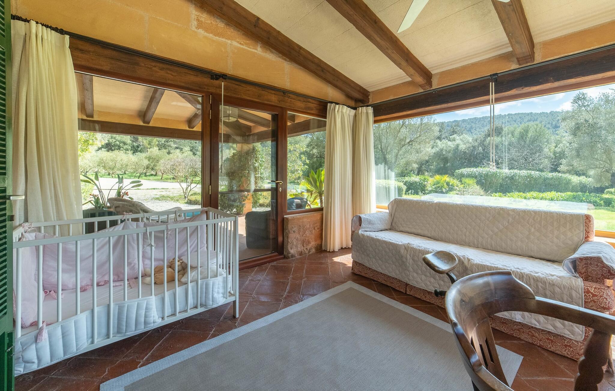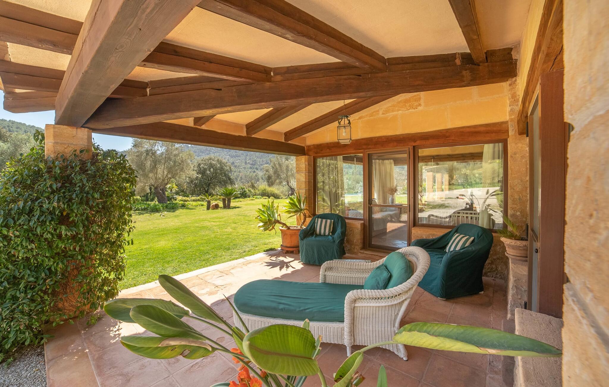Oplev fuldstændig privatliv og betagende udsigt over bjergene i denne smukt designede bondegård på Mallorca. Omgivet af frodig middelhavsvegetation og modne træer er den indbydende atmosfære ideel for alle aldre. Ejendommen har stilfulde terrasseområder, både åbne og overdækkede, perfekt til afslapning udenfor. Nyd en dukkert i den lavvandede pool eller spil sport på stedets paddle-tennisbane, et unikt tilbud. Liggestole på poolterrassen er et behageligt sted at slappe af under middelhavssolen. Ejendommen var oprindeligt en olivenfarm og vedligeholdes stadig af personale til olivenproduktion og anlægsinspektioner. Det rummelige hus, udstyret med aircondition og gulvvarme, byder på masser af plads til individuel nydelse. Traditionelle terracotta-fliser, synlige bjælkelofter og naturstenselementer understreger den hyggelige atmosfære. Stuen med pejs og fjernsyn samt fuldt udstyret køkken med spiseplads er perfekte til sammenkomster. Stuehuset har seks soveværelser - fire dobbeltværelser og to singler - samt fire badeværelser og et gæstetoilet for at sikre privatlivets fred for alle gæster. En separat boligenhed består af et af soveværelserne med dobbeltsenge, et badeværelse og en lille stue med integreret køkken. En udendørs sauna giver wellness og giver jeres ferieoplevelse et afslappende præg. Dette eksklusive bondehus i natursten ligger i smukke landlige omgivelser midt i Tramuntana-bjergene. Esporles med butikker, flere restauranter og barer kan nås på 5 minutter i bil, den nærmeste strand på cirka 20 minutter.