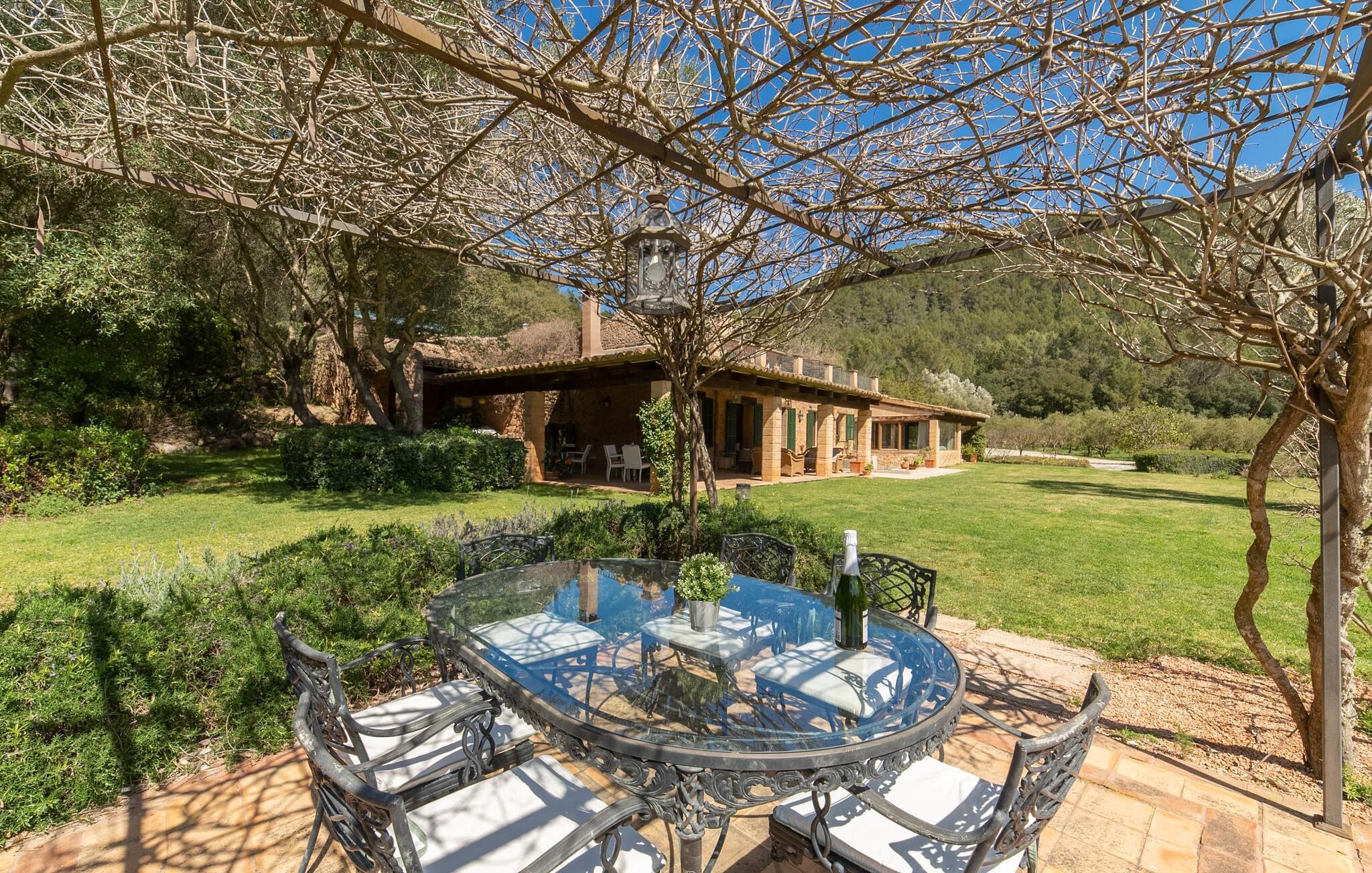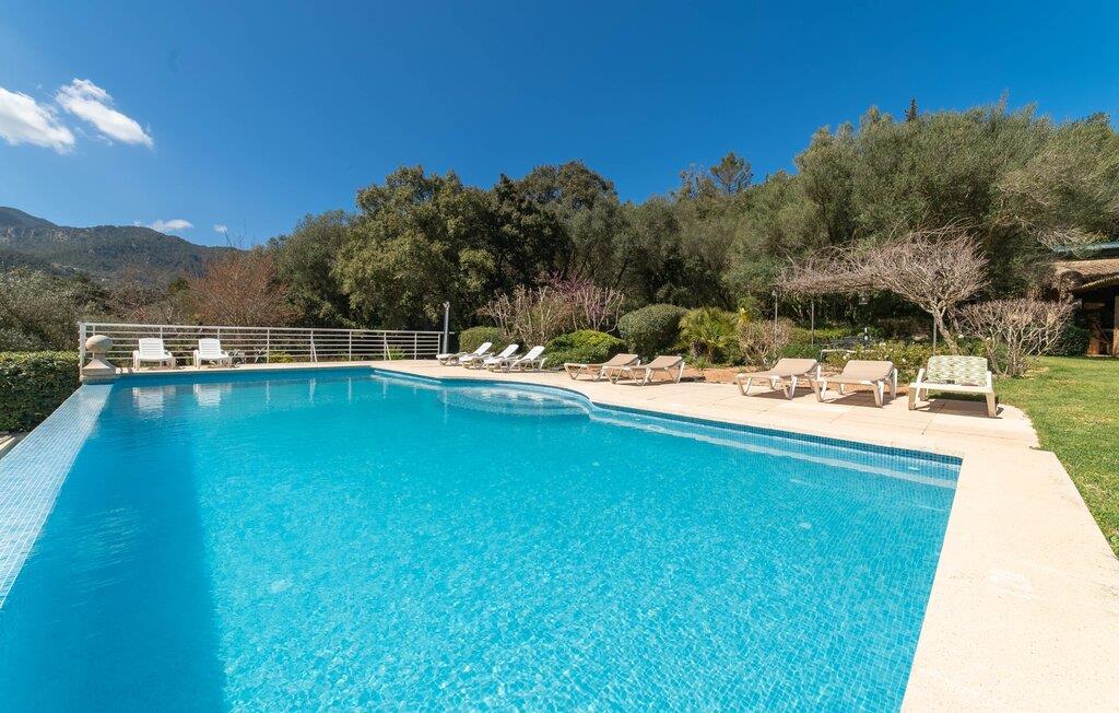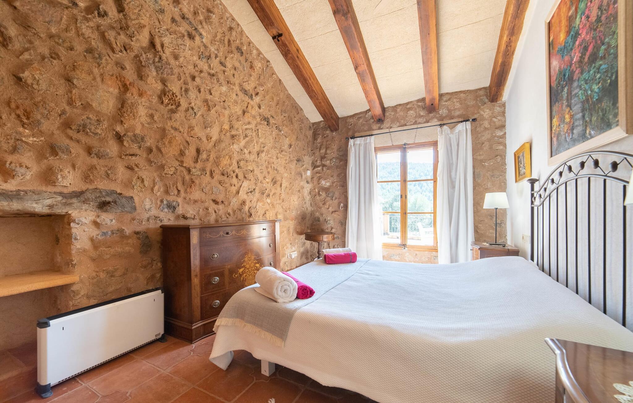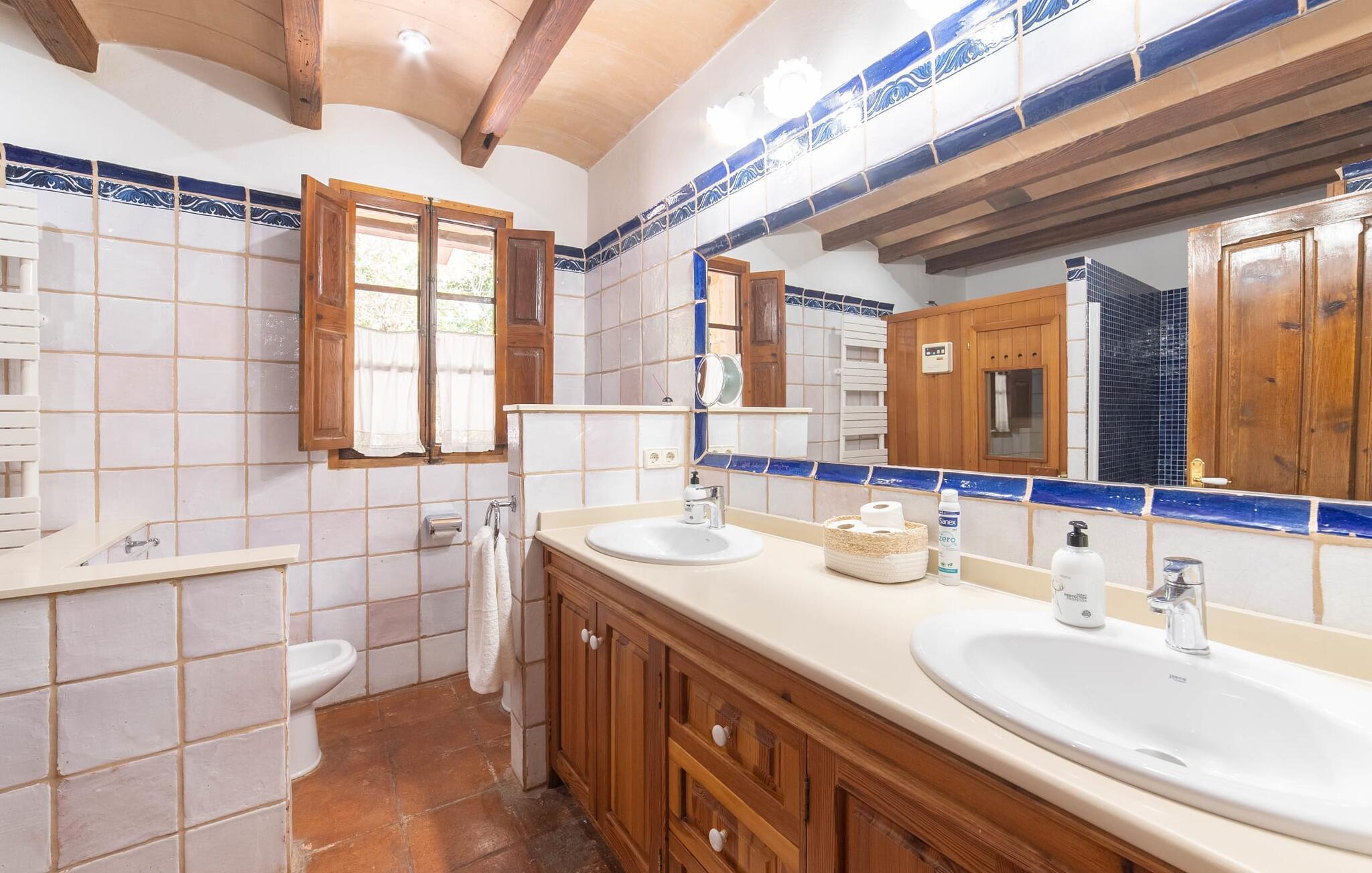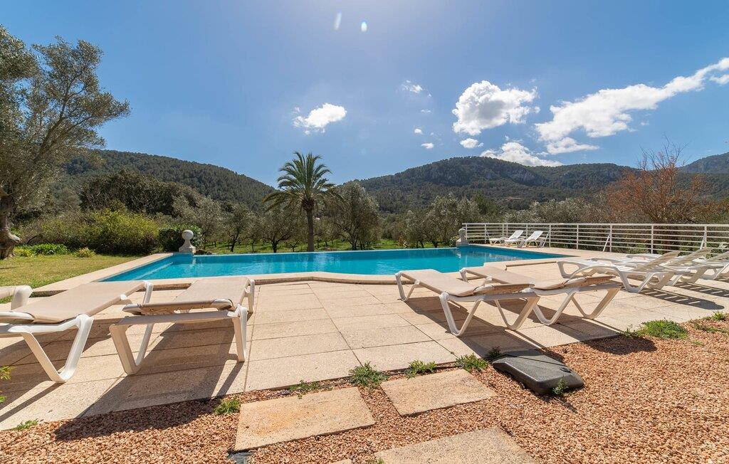 Oplev fuldstændig privatliv og betagende udsigt over bjergene i denne smukt designede bondegård på Mallorca. Omgivet af frodig middelhavsvegetation og modne træer er den indbydende atmosfære ideel for alle aldre. Ejendommen har stilfulde terrasseområder, både åbne og overdækkede, perfekt til afslapning udenfor. Nyd en dukkert i den lavvandede pool eller spil sport på stedets paddle-tennisbane, et unikt tilbud. Liggestole på poolterrassen er et behageligt sted at slappe af under middelhavssolen. Ejendommen var oprindeligt en olivenfarm og vedligeholdes stadig af personale til olivenproduktion og anlægsinspektioner. Det rummelige hus, udstyret med aircondition og gulvvarme, byder på masser af plads til individuel nydelse. Traditionelle terracotta-fliser, synlige bjælkelofter og naturstenselementer understreger den hyggelige atmosfære. Stuen med pejs og fjernsyn samt fuldt udstyret køkken med spiseplads er perfekte til sammenkomster. Stuehuset har seks soveværelser - fire dobbeltværelser og to singler - samt fire badeværelser og et gæstetoilet for at sikre privatlivets fred for alle gæster. En separat boligenhed består af et af soveværelserne med dobbeltsenge, et badeværelse og en lille stue med integreret køkken. En udendørs sauna giver wellness og giver jeres ferieoplevelse et afslappende præg. Dette eksklusive bondehus i natursten ligger i smukke landlige omgivelser midt i Tramuntana-bjergene. Esporles med butikker, flere restauranter og barer kan nås på 5 minutter i bil, den nærmeste strand på cirka 20 minutter.