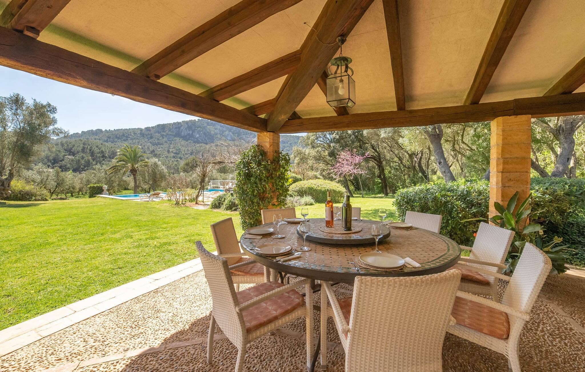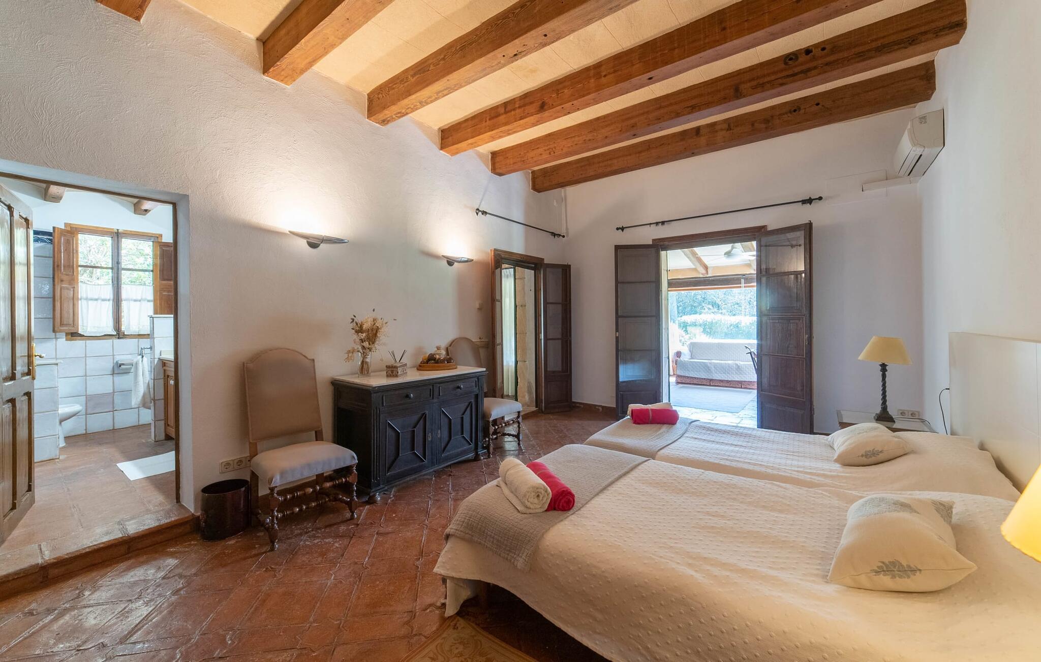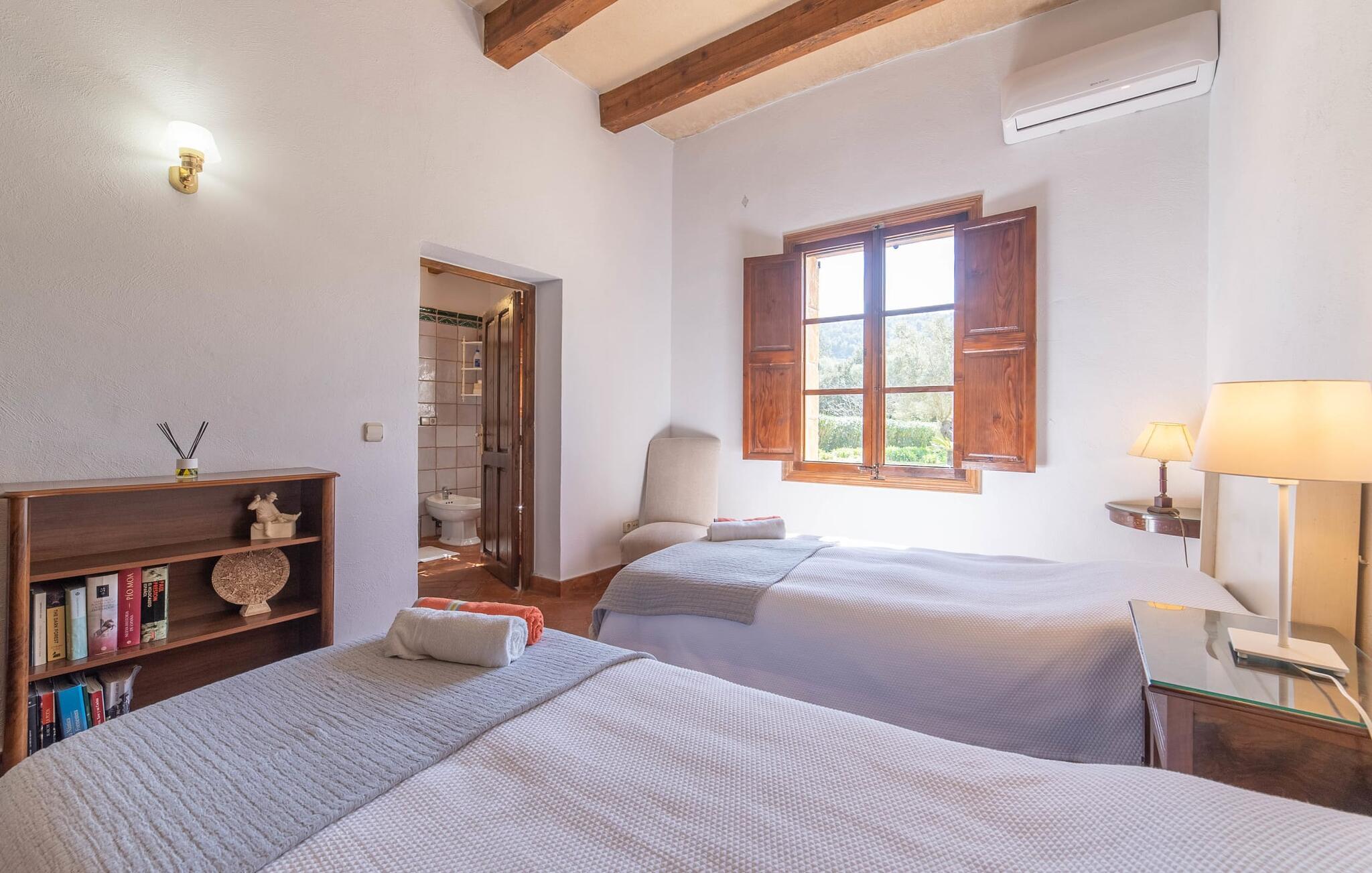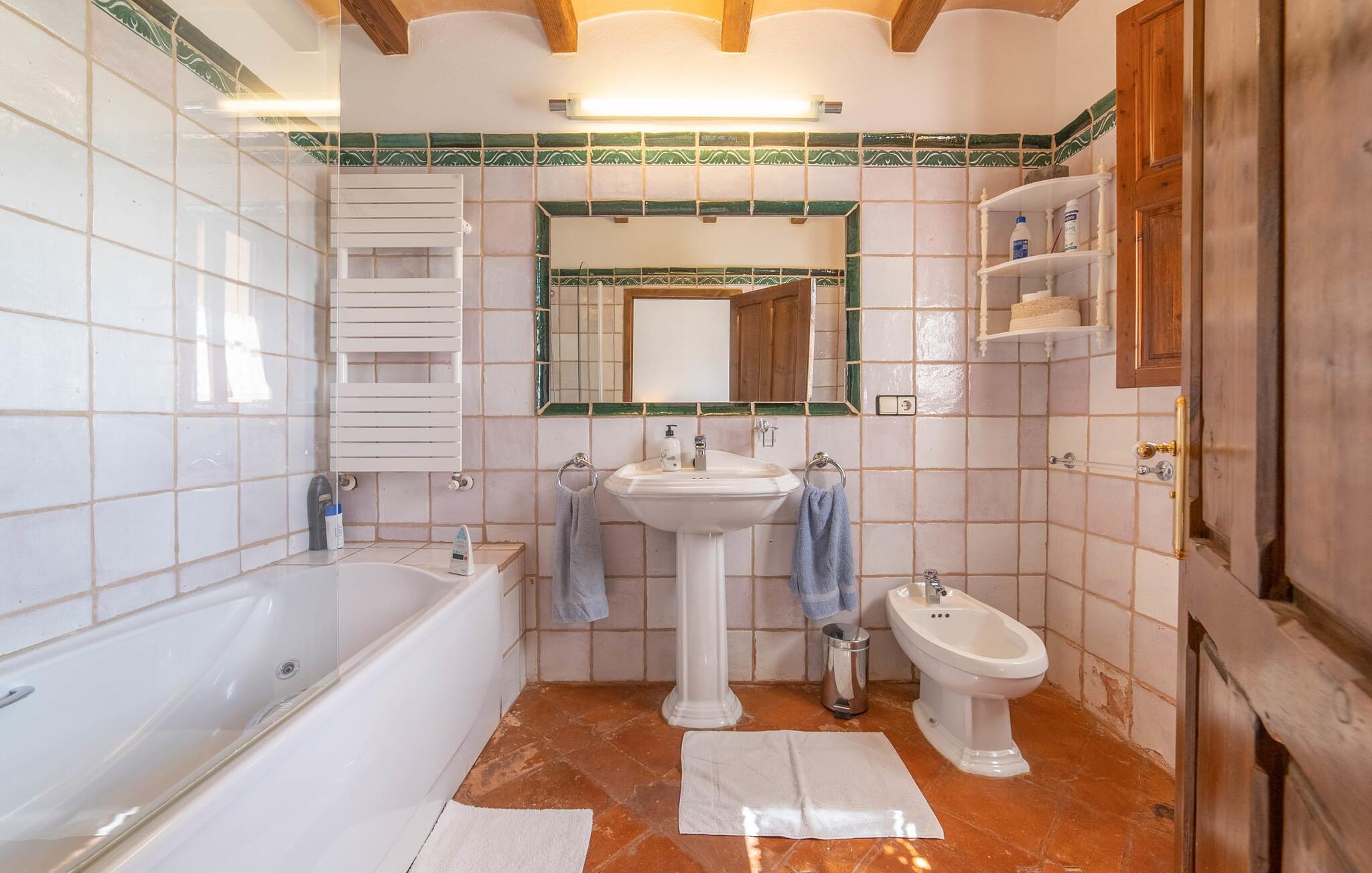 Oplev fuldstændig privatliv og betagende udsigt over bjergene i denne smukt designede bondegård på Mallorca. Omgivet af frodig middelhavsvegetation og modne træer er den indbydende atmosfære ideel for alle aldre. Ejendommen har stilfulde terrasseområder, både åbne og overdækkede, perfekt til afslapning udenfor. Nyd en dukkert i den lavvandede pool eller spil sport på stedets paddle-tennisbane, et unikt tilbud. Liggestole på poolterrassen er et behageligt sted at slappe af under middelhavssolen. Ejendommen var oprindeligt en olivenfarm og vedligeholdes stadig af personale til olivenproduktion og anlægsinspektioner. Det rummelige hus, udstyret med aircondition og gulvvarme, byder på masser af plads til individuel nydelse. Traditionelle terracotta-fliser, synlige bjælkelofter og naturstenselementer understreger den hyggelige atmosfære. Stuen med pejs og fjernsyn samt fuldt udstyret køkken med spiseplads er perfekte til sammenkomster. Stuehuset har seks soveværelser - fire dobbeltværelser og to singler - samt fire badeværelser og et gæstetoilet for at sikre privatlivets fred for alle gæster. En separat boligenhed består af et af soveværelserne med dobbeltsenge, et badeværelse og en lille stue med integreret køkken. En udendørs sauna giver wellness og giver jeres ferieoplevelse et afslappende præg. Dette eksklusive bondehus i natursten ligger i smukke landlige omgivelser midt i Tramuntana-bjergene. Esporles med butikker, flere restauranter og barer kan nås på 5 minutter i bil, den nærmeste strand på cirka 20 minutter.