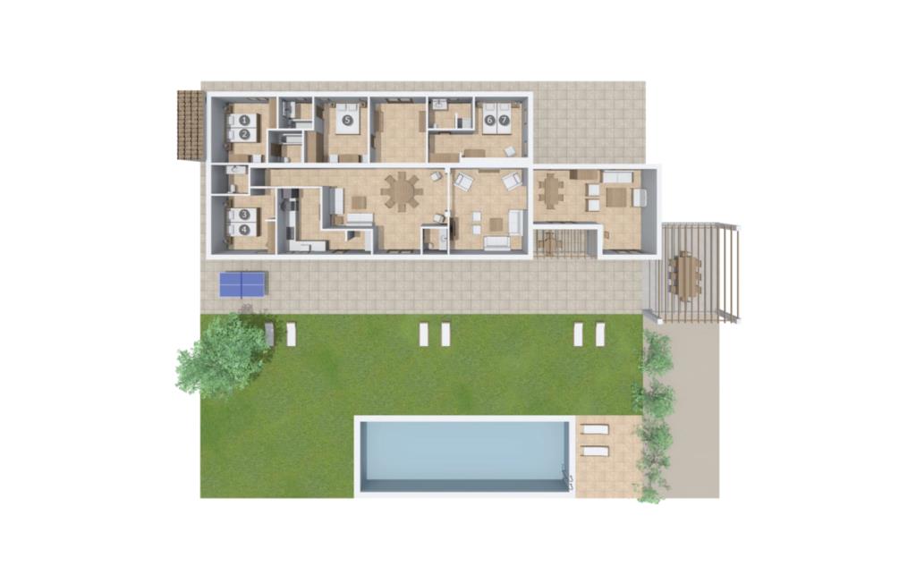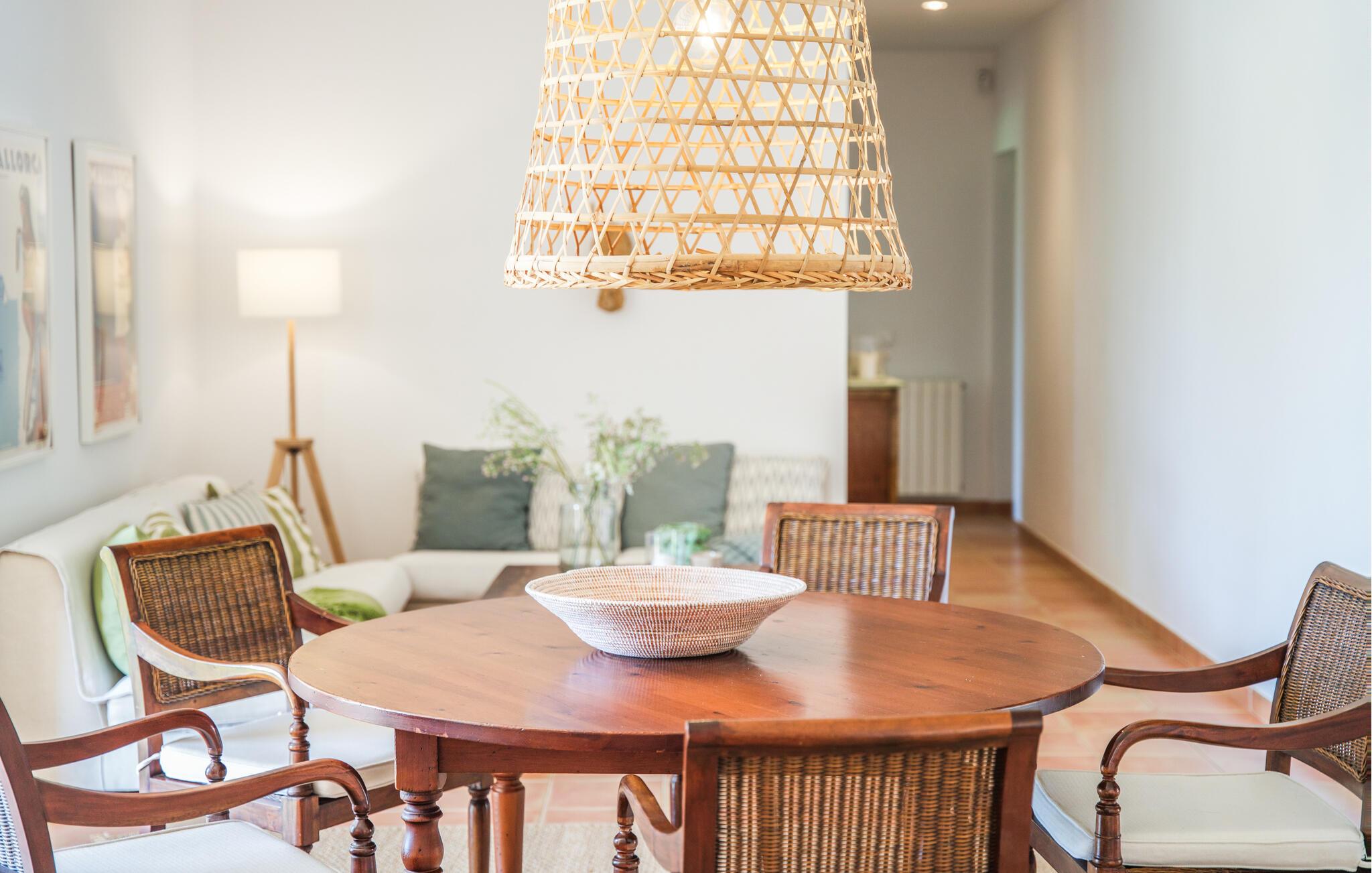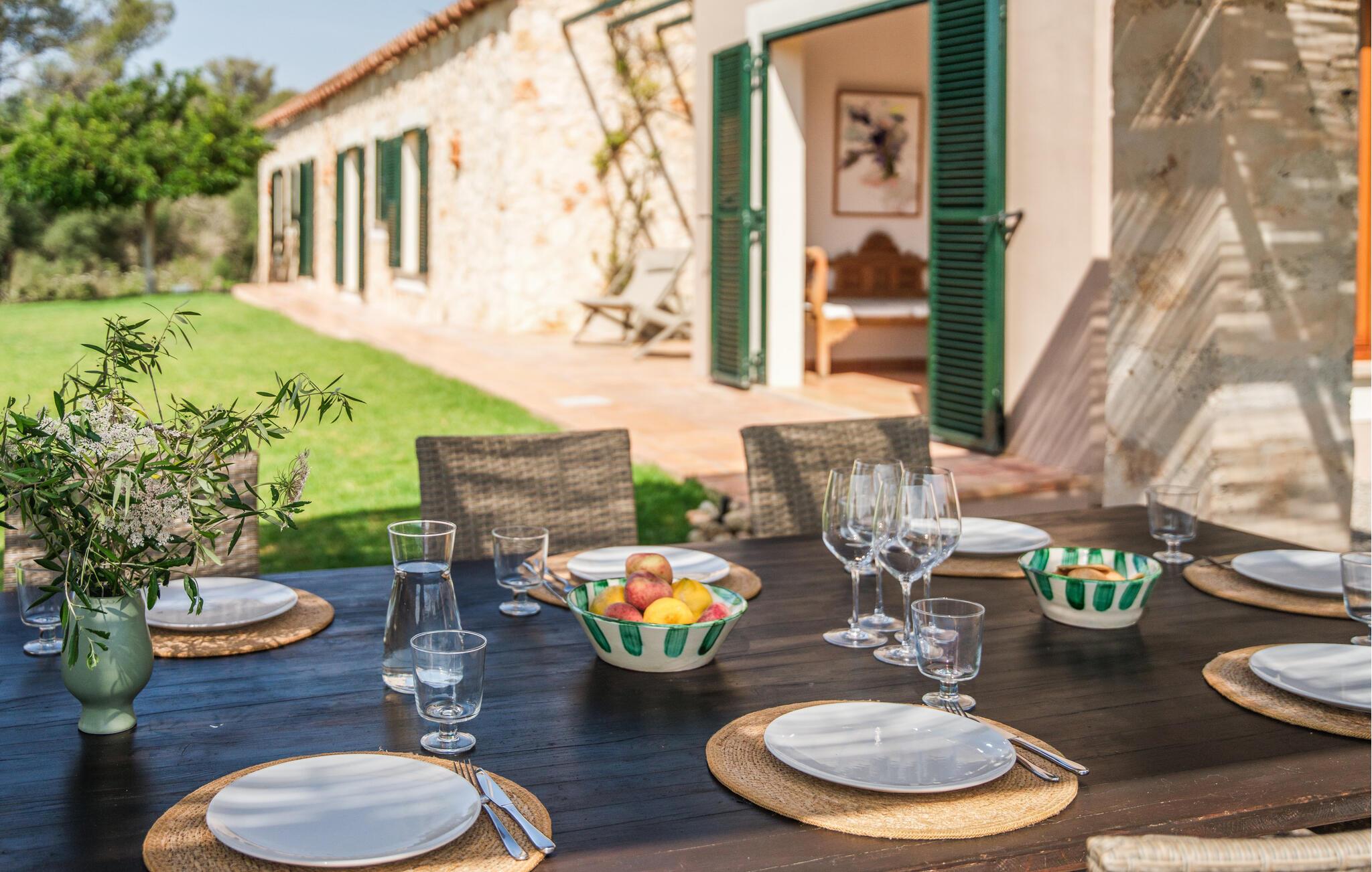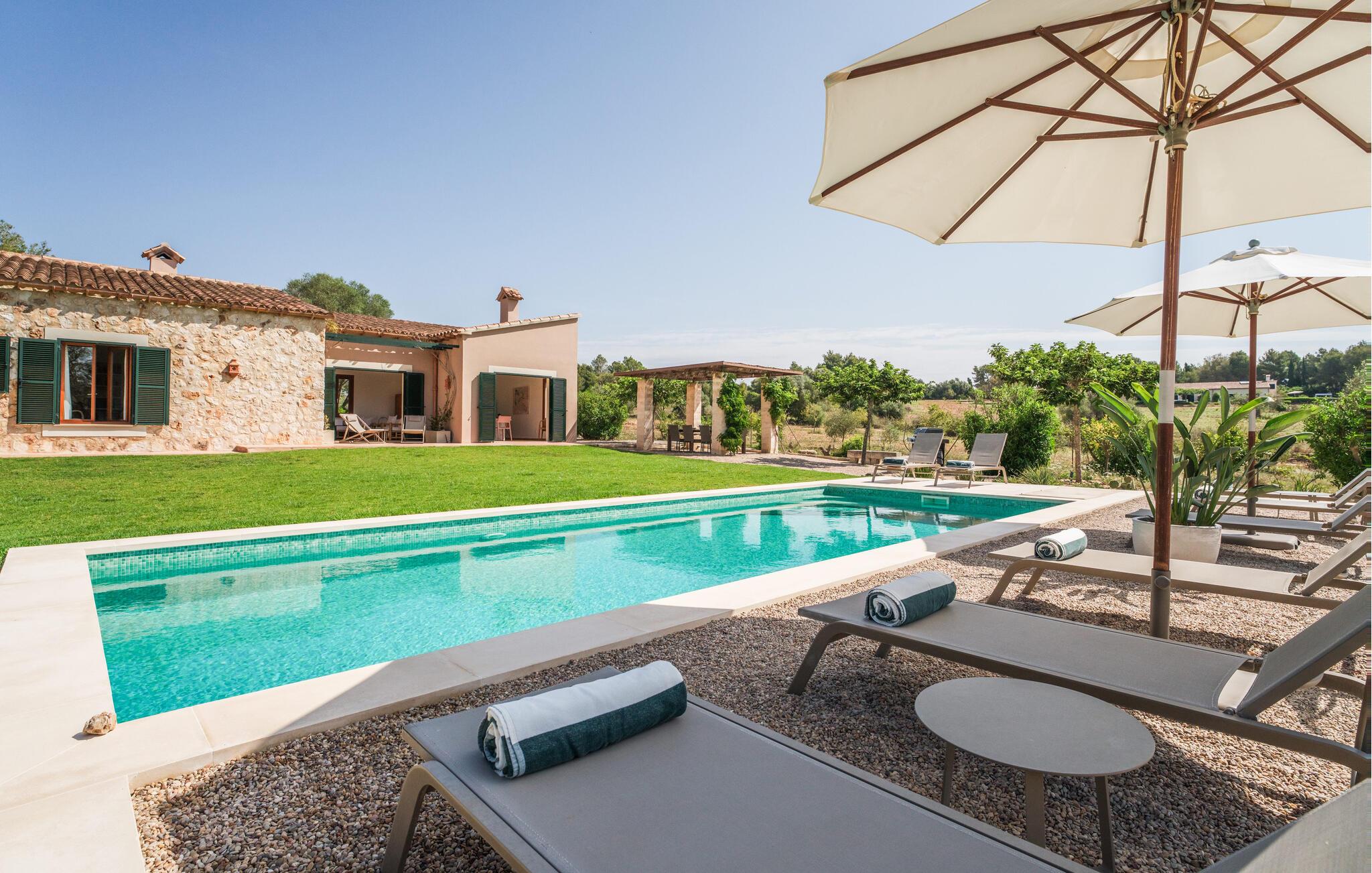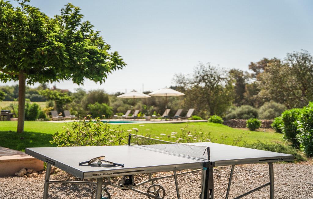 Villaen “Sa Tanca” ligger meget stille og idyllisk i den smukke østlige del af Mallorca, hvor de blidt stigende bakker i Serra Levanten præger et typisk middelhavslandskab, enestående smukt kystlandskab. Her kan I nyde jeres privatliv uden at føle jer begrænset af mure eller hegn. Den lange pool er omgivet af græsplæner, hvor I kan slappe af i solen, og børnene kan løbe rundt og lege. Høje hække giver ekstra komfort og ser attraktive ud på samme tid. Der er en særlig smuk sydvendt siddeplads foran huset. Herfra har I en fantastisk udsigt over haven og kan også fuldt ud nyde Middelhavslyset. Om morgenen eller sent om aftenen – det er et smukt sted med en faktor. I kan slappe af ved det runde spisebord eller nyde et måltid sammen. Om aftenen kan I fejre solide grillfester og tilberede og nyde friske regionale specialiteter på grillen. Poolen er let tilgængelig via en stige. For at beskytte jer, hvis UV-strålingen bliver for stærk, er der to parasoller til rådighed. Uanset tidspunktet på dagen er der altid en luftig, naturlig skygge på ejendommen for at nyde de smukke omgivelser. Der er en parkeringsplads til jeres bil foran huset. I husets lysfyldte interiør kan I forvente et boligareal på 302 m². Lyse vægge harmonerer med terracotta fliserne samt trævinduer og møbler med deres smukke, farverige stoffer. Udvalgte billeder på væggene forskønner rummene. Denne dygtige sammensætning skaber en særlig smagfuld og hyggelig stemning, hvor I hurtigt føler jer hjemme. En stor kombineret stue/spisestue med lille bibliotek og pejs opfylder alle jeres indendørs afslapningsbehov. Et andet indbydende sted at sidde og nyde er en slags vinterhave, som helt kan åbnes til en overdækket terrasse i de varmere måneder og er udstyret med en ekstra sofa og spisebord. Det rummelige, moderne køkken er fuldt udstyret og byder på alt det nødvendige til jeres ferie. Faciliteterne omfatter en opvaskemaskine, en kedel, en italiensk kaffemaskine og en filterkaffemaskine. Fire slående renoverede og klimatiserede soveværelser, hver med sit eget badeværelse, fuldender de afslappende funktioner i dette feriehus. Badeværelserne er lyse og venlige. For nemheds skyld er strygejern og hårtørrer tilgængelige. Fra villaen "Sa Tanca" er der mindre end 4 km til den nærmeste kystby Portocristo, med sin egen fejende havn og strandbugter, over hvilken der er en smuk promenade med butikker, caféer, barer og restauranter. Der er også et ugentligt marked, der er værd at se, og flere store, velassorterede supermarkeder til jeres daglige behov. En udflugt, som I bestemt bør tage på i Portocristo, er de såkaldte Caves of Drac, en unik drypstensgrotte med Europas største underjordiske sø. Ud over denne lille by er der også adskillige fantastiske strande inden for rækkevidde. De er alle fine hvide sandstrande, og de fleste har lavvandet adgang til havet. Villaen tilbyder et ideelt udgangspunkt for en varieret badeferie. Den smukt beliggende villa "Sa Tanca" ligger mindre end 4 km fra porten til den maleriske havneby Portocristo. Talrige strande, de såkaldte "Calas de Mallorca", er meget nemme at nå. Portocristo ligger kun omkring 5 minutter væk i bil, og her finder I alt, hvad I behøver for at shoppe og tilbringe en aften. Bemærk venligst, at denne ejendom ikke accepterer ungdomsgrupper eller polterabender. En ungdomsgruppe på denne ejendom består af personer under 30 år. Book ikke denne ejendom, hvis I er en ungdomsgruppe eller en polterabendgruppe, da jeres reservation vil blive afvist, når den er booket, hvilket også kan være tilfældet ved ankomst til ejendommen eller under jeres ophold, og I vil ikke modtage en refusion.