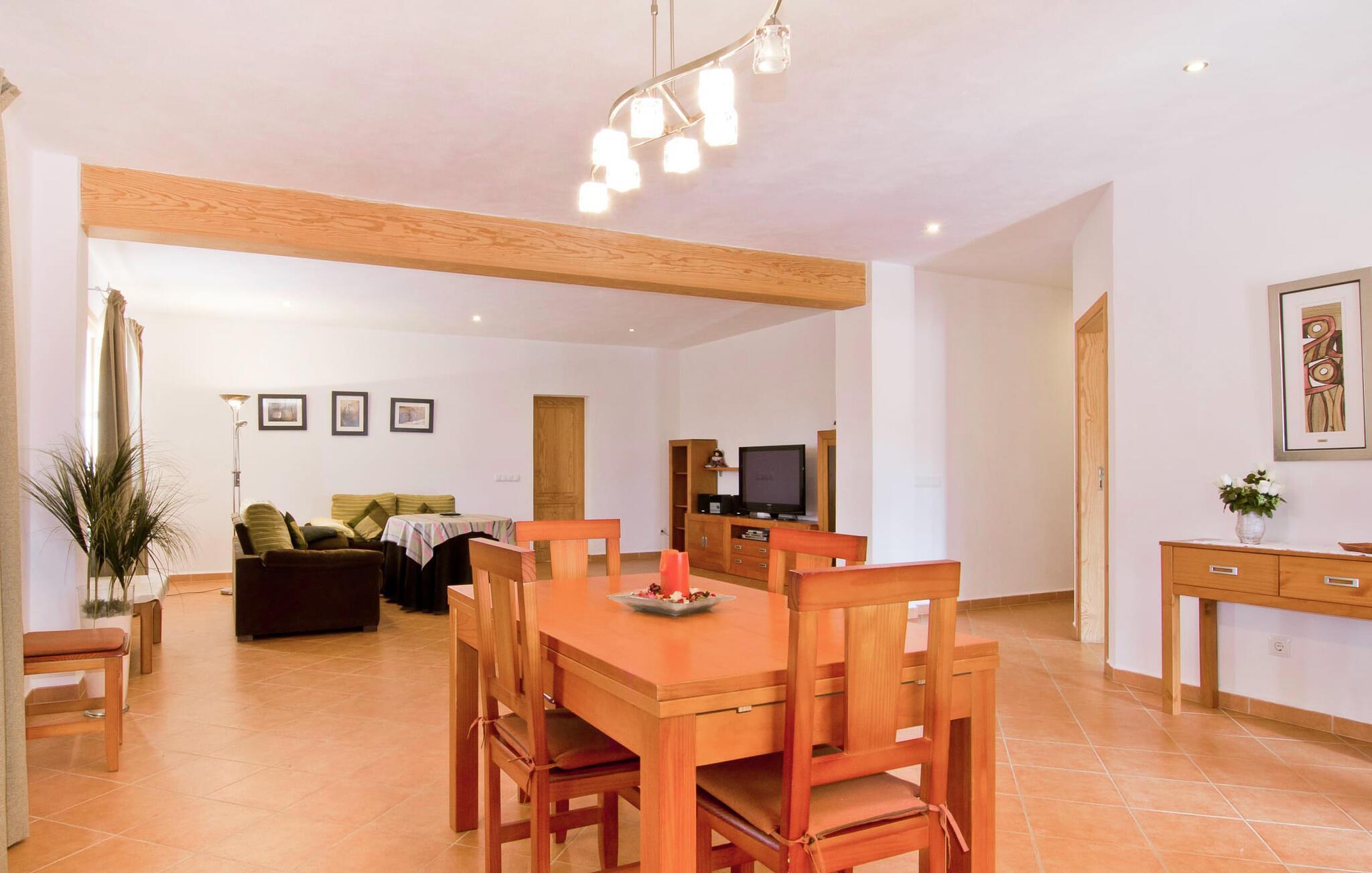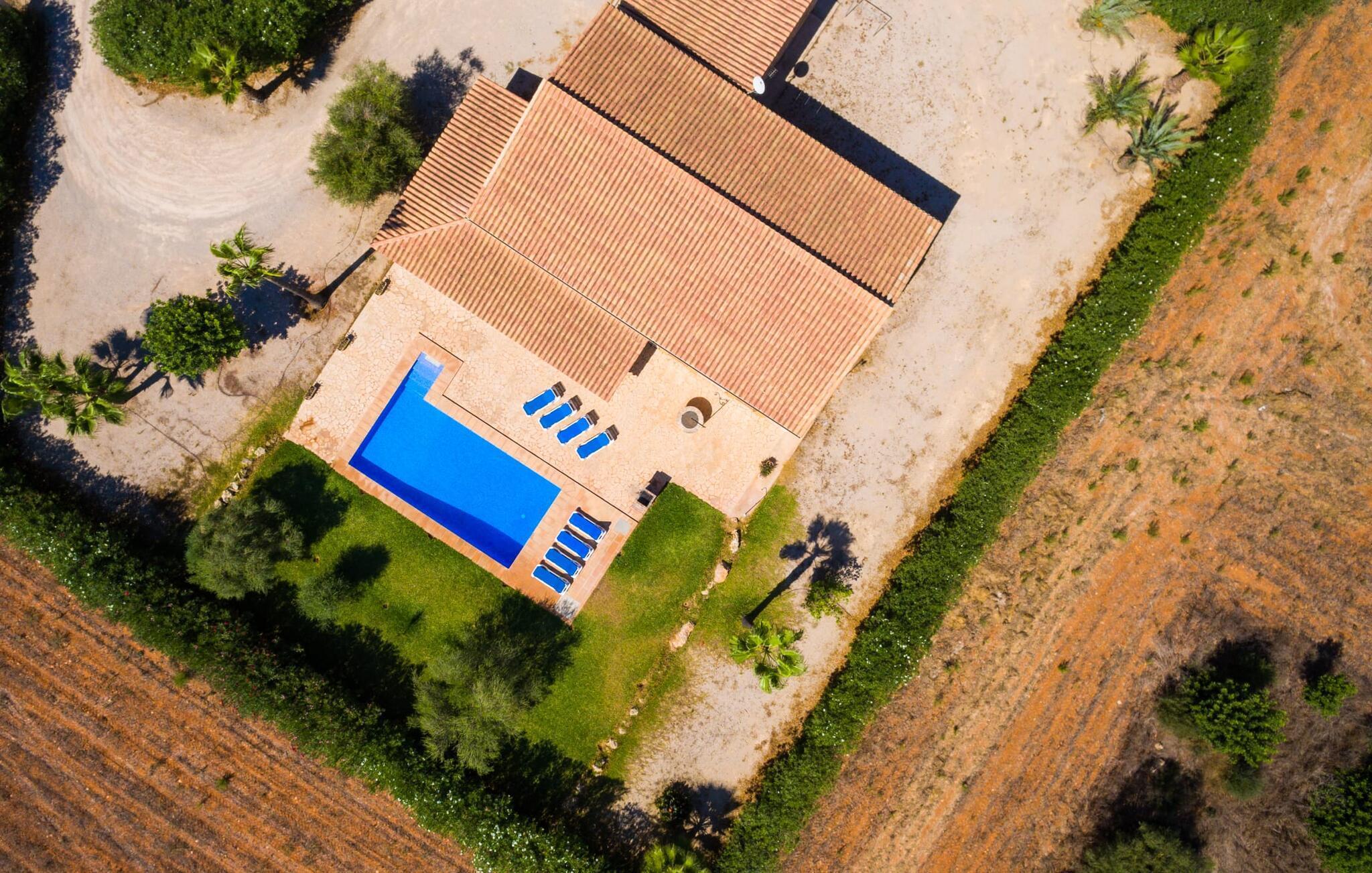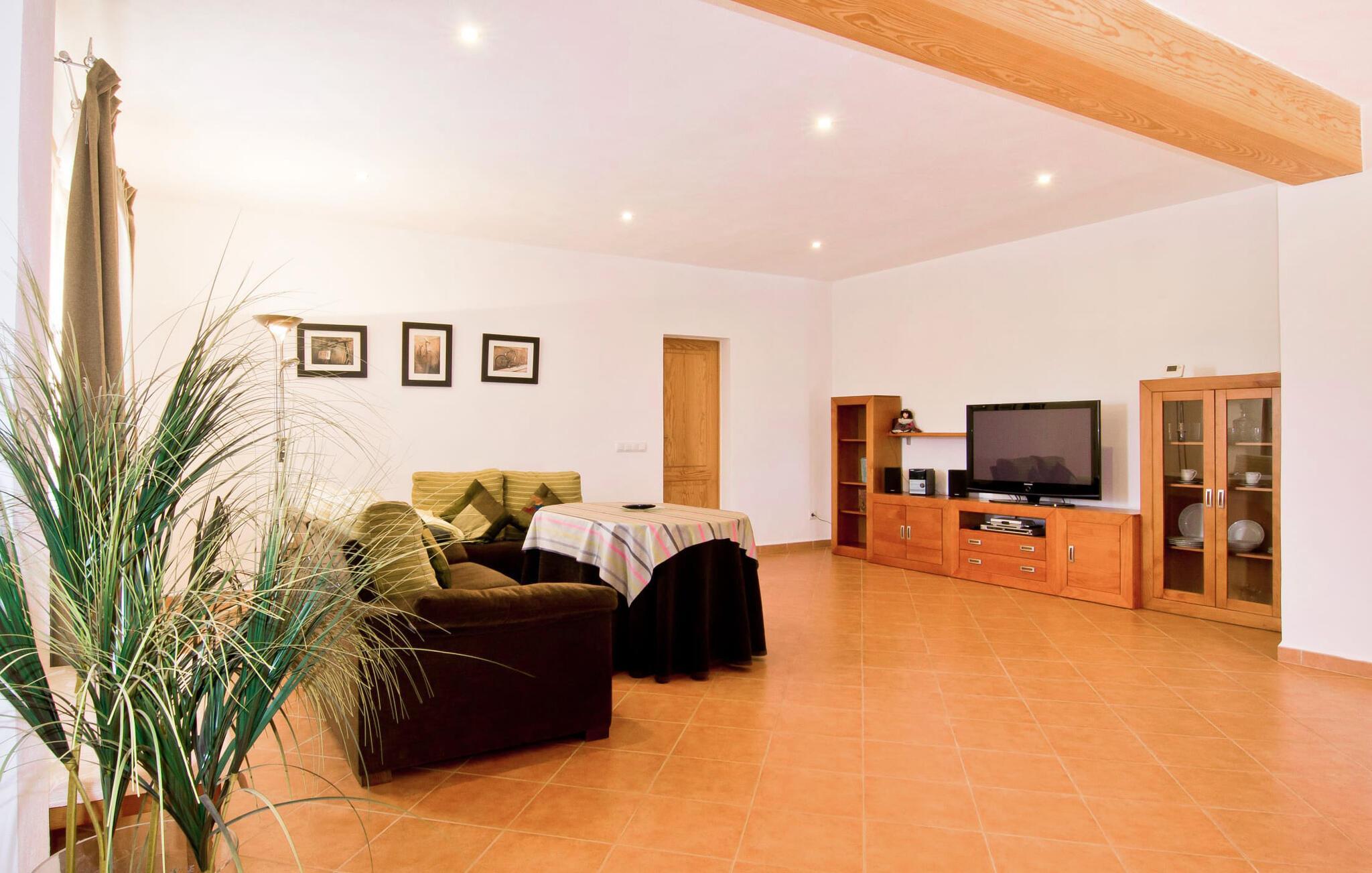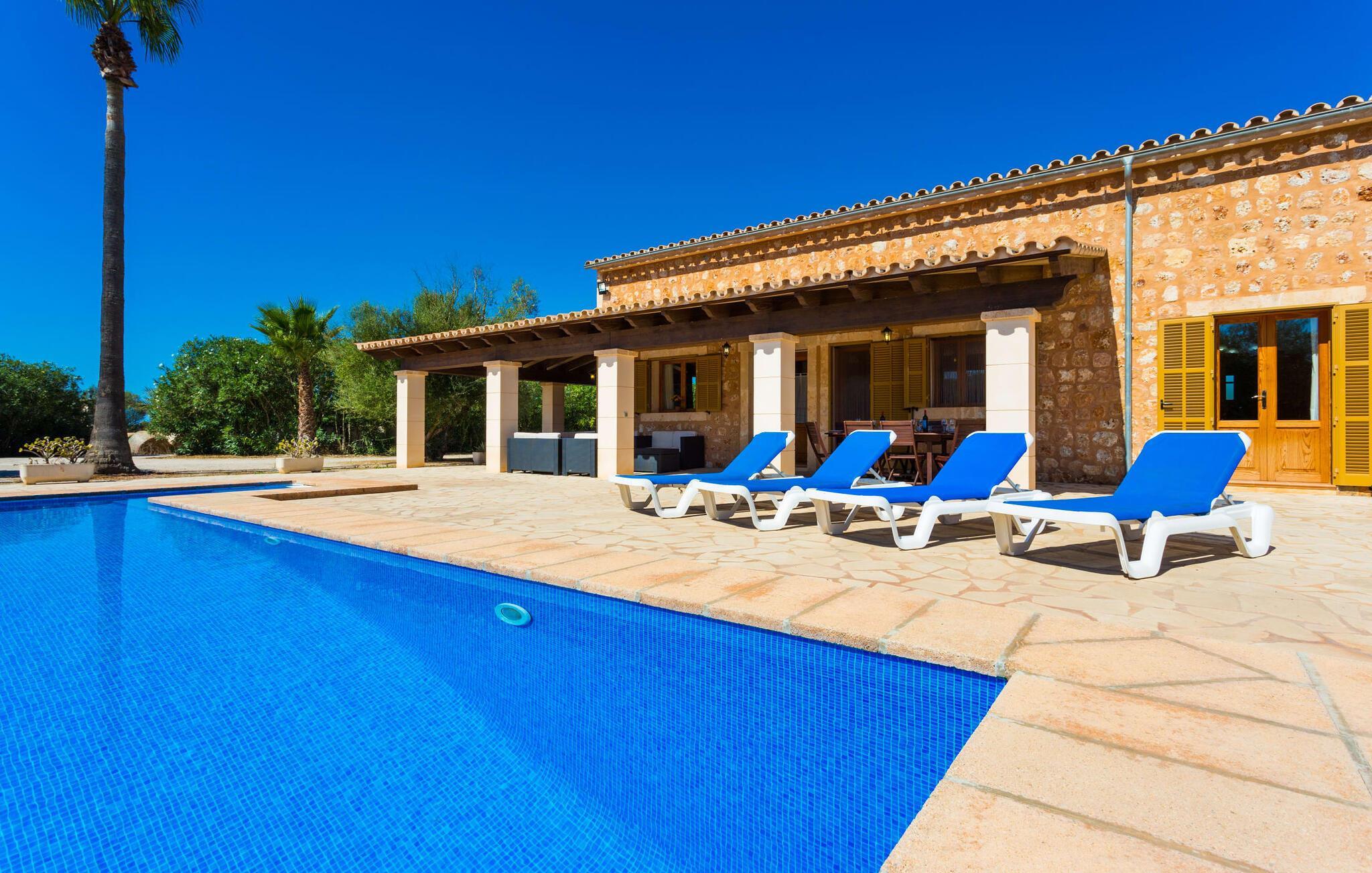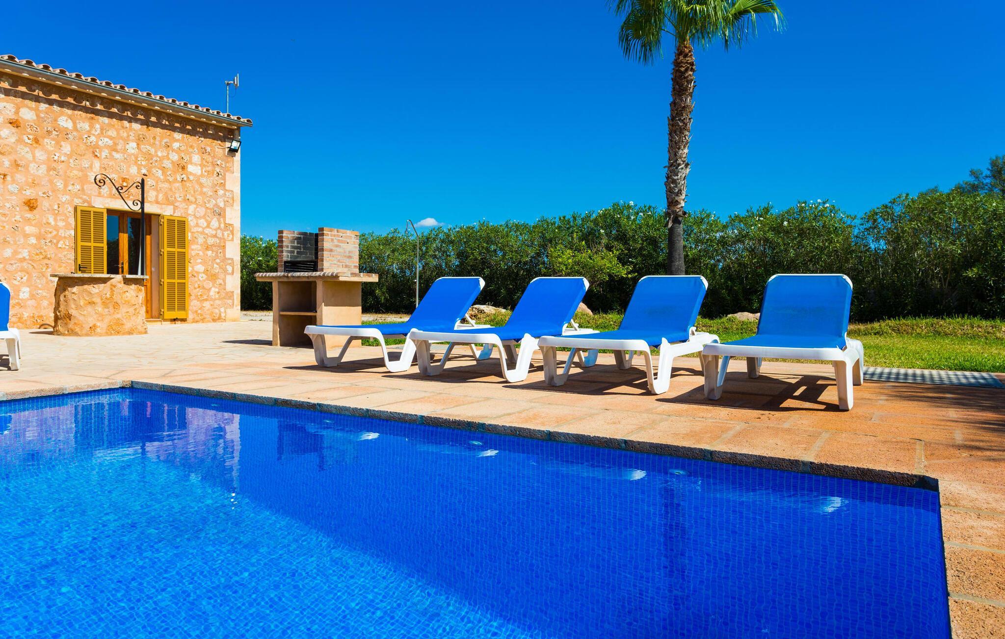 Atmosfærisk beliggende mellem en tæt hæk af middelhavsbuske byder villaen "Sa Vinya Gran" sine gæster velkommen i en behagelig landlig og rolig atmosfære. På forsiden af ejendommen er der let grus, som er omkranset af terrasser dekoreret med naturstensplader i den bagerste del af haven. Den store pool ligger foran den overdækkede terrasse, omgivet af et flisebelagt område til solbadning og græsplæne. Store palmer pryder dette centrale udendørsområde og giver det en rustik, maritim flair. Poolen med komfortable trin er dekoreret med lyseblå mosaiksten. Her finder I også en udendørs bruser og et badekar. De otte moderne liggestole giver masser af muligheder for at slappe af mellem forfriskende dukkert i poolen, måske med en kølig drink eller en lille snack. Afhængigt af tidspunktet på dagen byder haven på lidt kølende skygge for at undslippe varmen. Medfølgende børn kan slippe dampen og lege på græsplænen og i poolen uden at forlade deres forældre ude af syne. Den overdækkede del af terrassen, der støder op til ejendommen, byder på et solidt spisebord. Nyd en hyggelig middag med en atmosfærisk udsigt over haven og den dybblå himmel. Om aftenen inviterer den indbyggede grill til grillmiddag. I kan finde lækre, friske regionale ingredienser hele dagen lang og tilberede og tilberede dem over kullene efter jeres smag. Som sædvanlig træder man direkte ind i huset fra terrassen, hvis enestående design afspejler udendørsområdets klare og stilrene linjer. Farverne og materialerne harmonerer perfekt og giver alle rum en vidunderlig hyggelig og indbydende rummelighed. Selvom I er mæt i denne villa, vil I altid have mulighed for at finde et roligt og ugeneret privat område. Flere og flere mennesker sætter pris på dette luksuriøse rum, især på ferie. Den rummelige stue/alrum giver jer mulighed for at slappe af på to komfortable sofaer, måske med en god bog eller endda en underholdende film, da det er her det store fladskærms-satellit-tv er placeret. Nyd en hyggelig middag indendørs ved det udvidelige spisebord. Det moderne køkken byder på alt hvad I behøver til jeres daglige behov, er udstyret til en høj standard og har masser af plads. Her finder I endnu et – mere uformelt – mindre spisebord. Faciliteterne omfatter en italiensk kaffemaskine og en elkedel. Rummelige og æstetisk designede soveværelser inviterer til refleksion og afslapning. For at sikre optimal afslapning er rummene fri for unødvendige dikkedarer. Der er to senge, der måler 1,50 x 1,90 m og fire senge, der måler 0,90 x 1,90 m. To store og luksuriøse badeværelser med naturligt lys og moderne indretning tilbyder komfort. Værelserne har strygejern og hårtørrer, så I behøver ikke at tage dem med. I kan tage en kort dagstur til blandt andet den smukke havn i den tidligere fiskerby Colonia de Sant Jordi (19 km). Hvis I kan lide at besøge stranden, er Villa "Sa Vinya Gran" perfekt for jer. De smukkeste strande på sydøstkysten – som den familievenlige Es Trenc strand – kan hurtigt nås med lejebil. Hvis I ønsker det, kan I udforske en af de mange forskellige bugter hver dag. Efter en begivenhedsrig dag kan I vende tilbage til jeres afslappende ferievilla og tilbringe aftenen efter jeres ønsker. Villaen "Sa Vinya Gran" med sit rummelige interiør er smukt beliggende i landlige omgivelser på en smuk og ugeneret ejendom, kun 10 minutter i bil sydøst for Campos. I Campos finder I barer, restauranter og butikker til jeres daglige behov. Fra villaen er der kun en kort køretur til Mallorcas sydlige strande. Lufthavnen ligger lidt over en halv times kørsel væk.