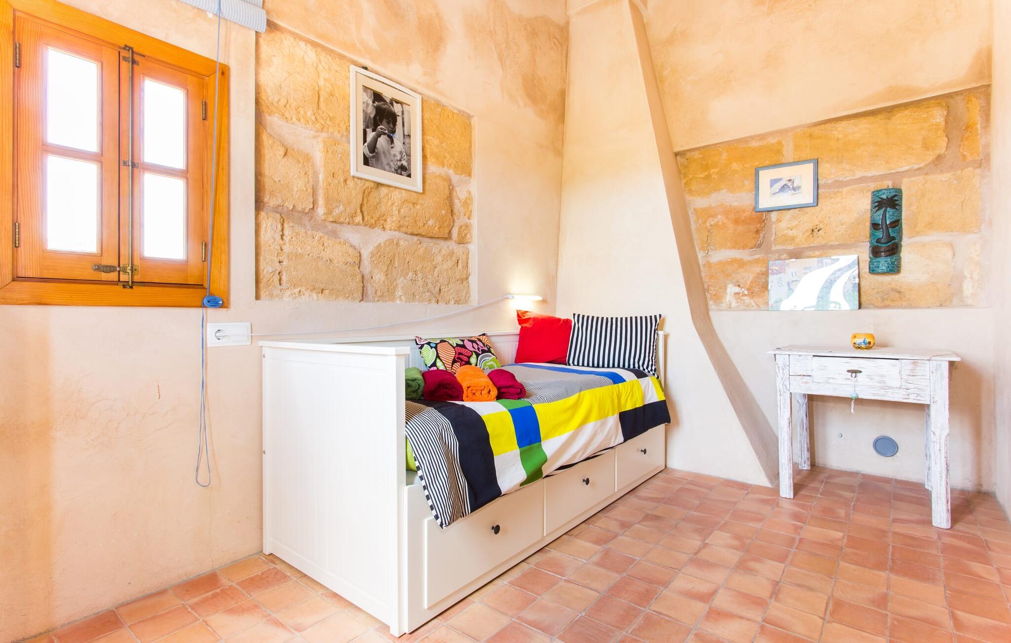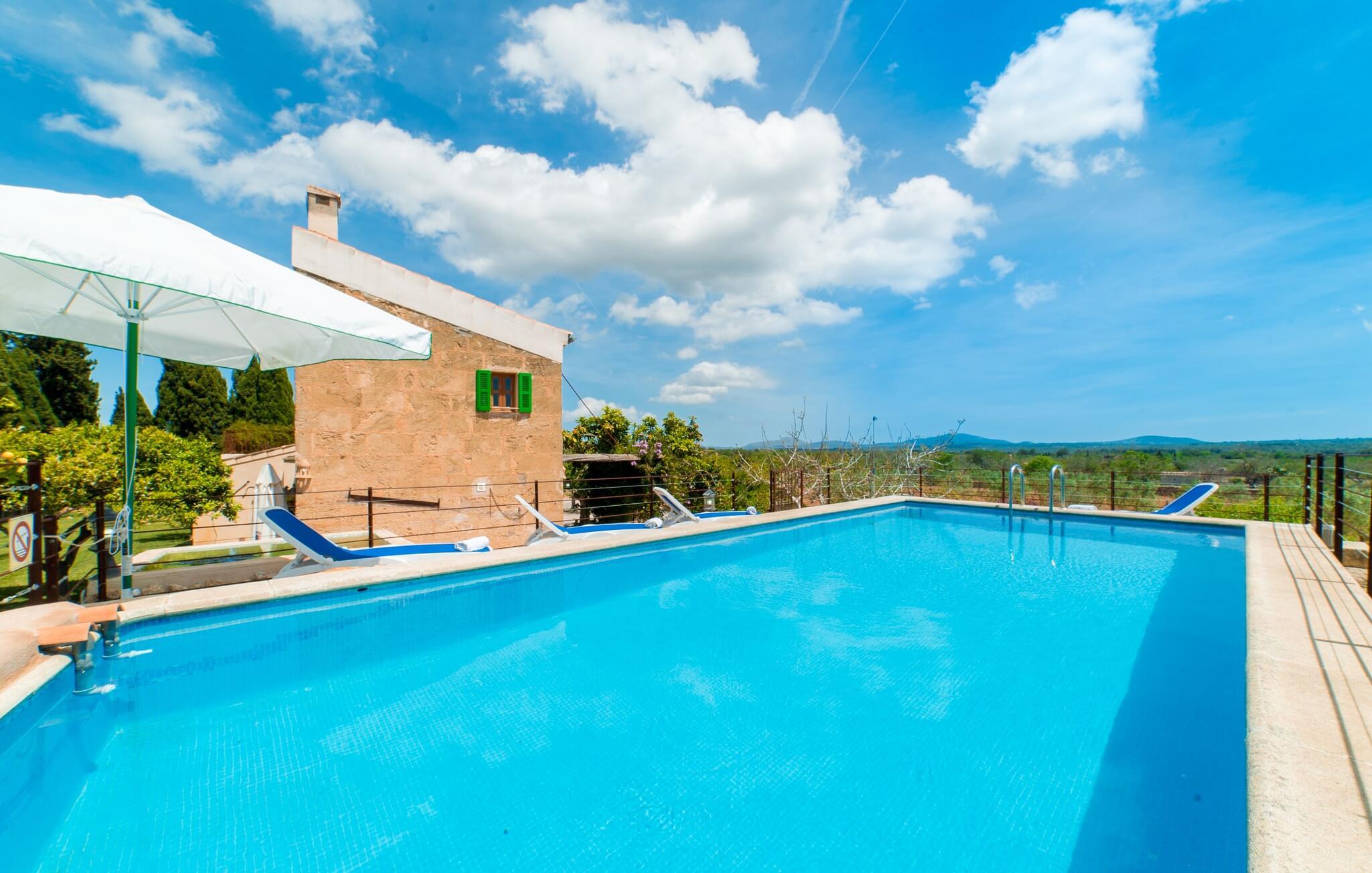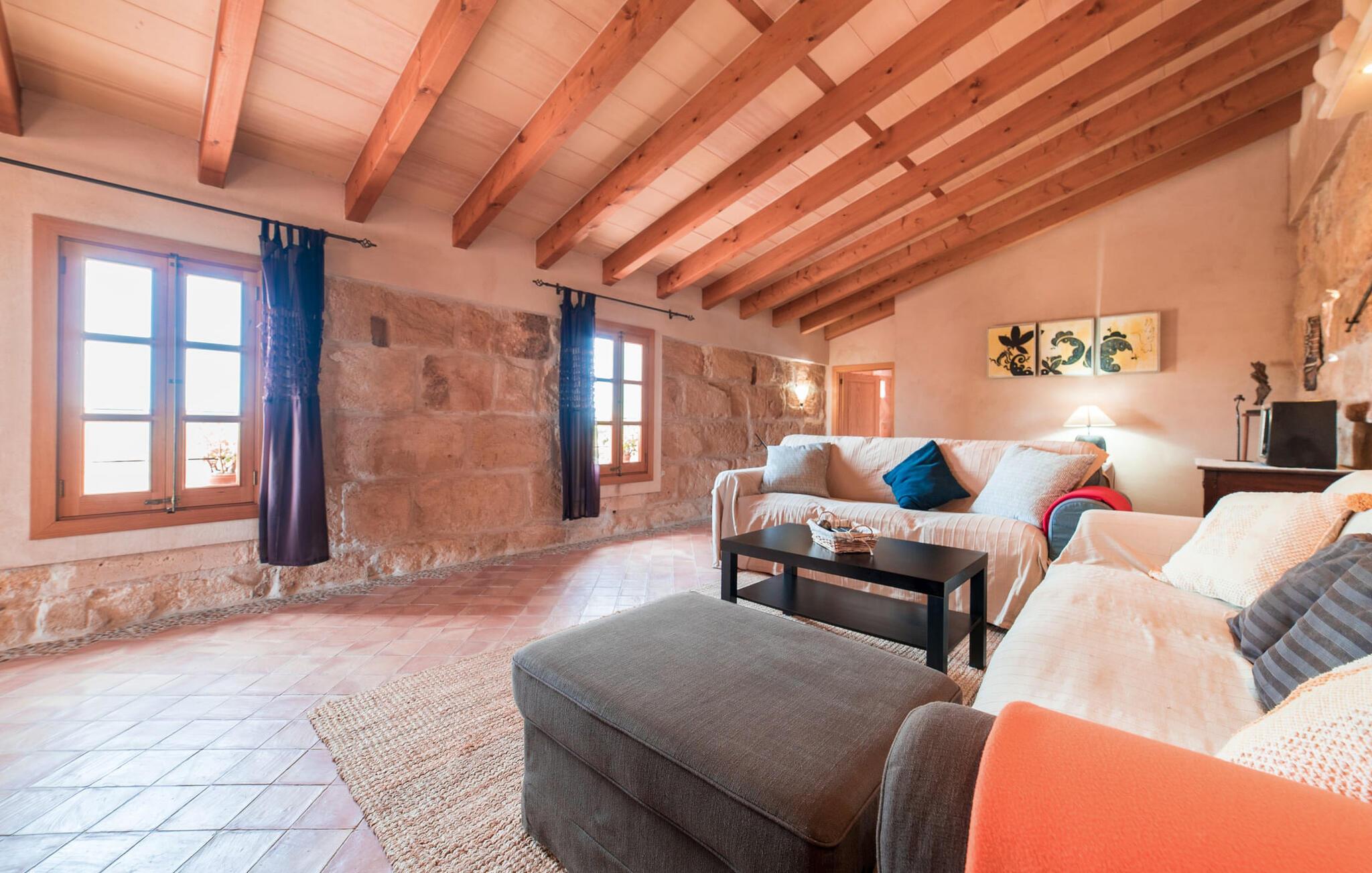 Leder I efter en autentisk mallorcansk ferie i idylliske, landlige omgivelser? Også en elegant stemning? Så tag et øjeblik og lær villaen "Sa Vinyasa Des Compte" lidt bedre at kende. Dette er en ejendom, der nemt opfylder alle disse krav, men der er meget mere her end det, så lad os venligst introducere jer til nogle af de finere detaljer. Bygningen ser ud, som om den altid har været en del af det lokale landskab, omgivet af høje nåletræer på den ene side og marker og haver på den anden. Oliventræerne på ejendommen udstråler middelhavskarakter. Dette storslåede terræn er ideelt til alle typer af afslappede udendørsaktiviteter. Langs hele villaens forside løber en overdækket stenpladeterrasse, som er ideel til hverdagen på ferien. Nyd jeres måltider sammen her ved det elegante spisebord og nyd udsigten over det omkringliggende landskab. Bare vær forberedt på at slappe af. Træskodder på vinduerne, en antik udseende stenfacade, et luftigt bambusudhæng og antikke dekorative elementer skaber en unik atmosfære, der inviterer jer til at blive hængende. Et par trin fører til den hævede pool, som er placeret i villaens tidligere vandtank. I kan til enhver tid komme her for at tage en forfriskende svømmetur i vandet eller nyde den varme middelhavssol på solterrassen. Bag huset er der en have med frugttræer og en stor græsplæne, hvor børnene kan lege af hjertens lyst. Der er også en muret grill, hvor I kan grille alle mulige lækkerier og nyde dem med hele besætningen, præcis som I forventer af en ferie. Det mest interessante ved denne villa er, at den har en økologisk køkkenhave, og selv træerne er vedligeholdt på en miljøvenlig måde. Derudover er der også høns i villaen, så I får friske æg om morgenen. Der er endda en venlig kat på ejendommen. Når I træder ind i boligen, vil I bemærke, at ejerne har lagt en stor indsats og sans for detaljerne i at skabe et usædvanligt indbydende miljø. Fusionen af moderne æstetisk design med ægte traditionelle elementer giver rummene en atmosfære fuld af charme og stil. Stedets autentiske karakter understreges af sandstensvægge og unikke antikviteter, som gør det til et ægte blikfang. Og hele interiøret har en smuk balance mellem dekorative gulvfliser og klassiske synlige loftsbjælker. Hoveddøren fører ind i stueetagens spisestue, hvis I ønsker at spise indenfor. Og på køligere aftener kan I tænde pejsen for at gøre det endnu hyggeligere. Til højre er der et hyggeligt soveværelse og et rummeligt badeværelse, der er flot og farverigt indrettet - bruseren bruger endda solopvarmet vand. Til venstre er køkkenet, som er udstyret med højkvalitets apparater til jeres komfort, herunder en kedel og en filterkaffemaskine. Dette er et fantastisk sted at prøve nogle traditionelle spanske opskrifter, mens I er på ferie og måske servere dem til resten af gruppen for at nyde. Den øverste etage er i det væsentlige ét stort rum, opdelt i forskellige rum gennem den smarte placering af et indbygget skab. Den hyggelige, airconditionerede stue er stedet at slappe af efter en lang dag med ferie. Hvis I vil, kan I se en god film på tv eller dvd. Soveværelserne ovenpå, et enkelt- og et dobbeltværelse, har hver deres egen karakteristiske stil, men begge er ideelle til en god nats søvn. Dobbeltværelset åbner direkte ud til den rummelige tagterrasse, som byder på en vidunderlig udsigt i alle retninger. Originale møbler lavet af forsendelsespaller er det perfekte sted at sidde udenfor om aftenen og nyde et godt glas vin. Enkeltværelset er farverigt indrettet og vil helt sikkert være det værelse, som yngre feriegæster ønsker at bo i. I kan købe dagligvarer og andre fornødenheder i Santa Margalida, hvor der er talrige supermarkeder, konditorier og restauranter. Vi anbefaler især morgenmadsbaren "El Sol" på stranden i Son Serra de Marina (ca. 15 km); Nyd en stilfuld brunch med udsigt over stranden og vandet, og der er endda livemusik om søndagen. Can Picafort har stadig fornemmelsen af en kystlandsby, hvor I kan gå en lang tur på promenaden langs den blege sandstrand, der strækker sig nordpå til Port d'Alcúdia. Barer, restauranter, butikker og endda natklubber sikrer en ferie, I aldrig vil glemme. Den autentiske mallorcanske villa "Sa Vinyasa Des Compte" er gemt væk på en 28.000 m² stor grund, kun 2 km syd for den lille by Santa Margalida på den nordlige del af øen. Den rolige beliggenhed er ideel for naturelskere. Sineu ligger 15 minutters kørsel derfra, og smukke Inca kan nås på cirka 25 minutter. Kystbyen Can Picafort ligger kun 11 km væk. Tag dertil for at nyde havet og shoppe dagligvarer og andre daglige fornødenheder.