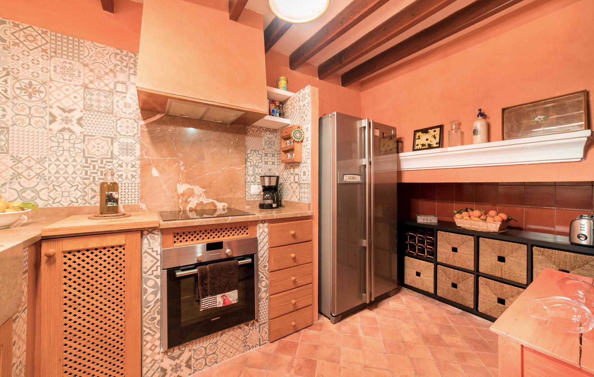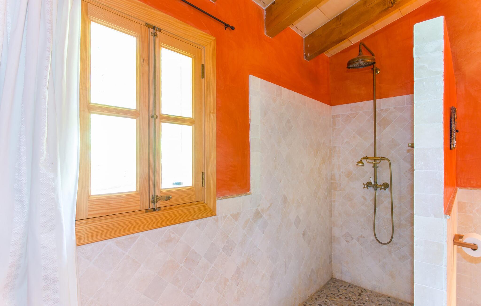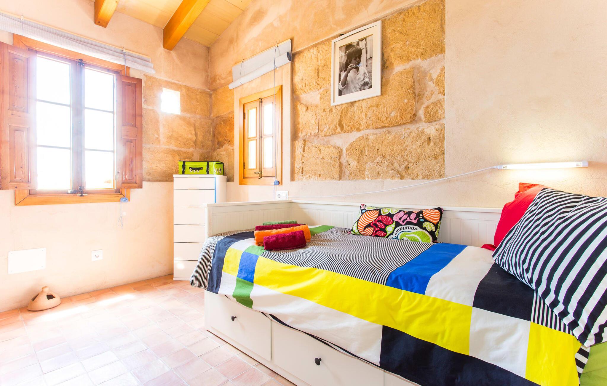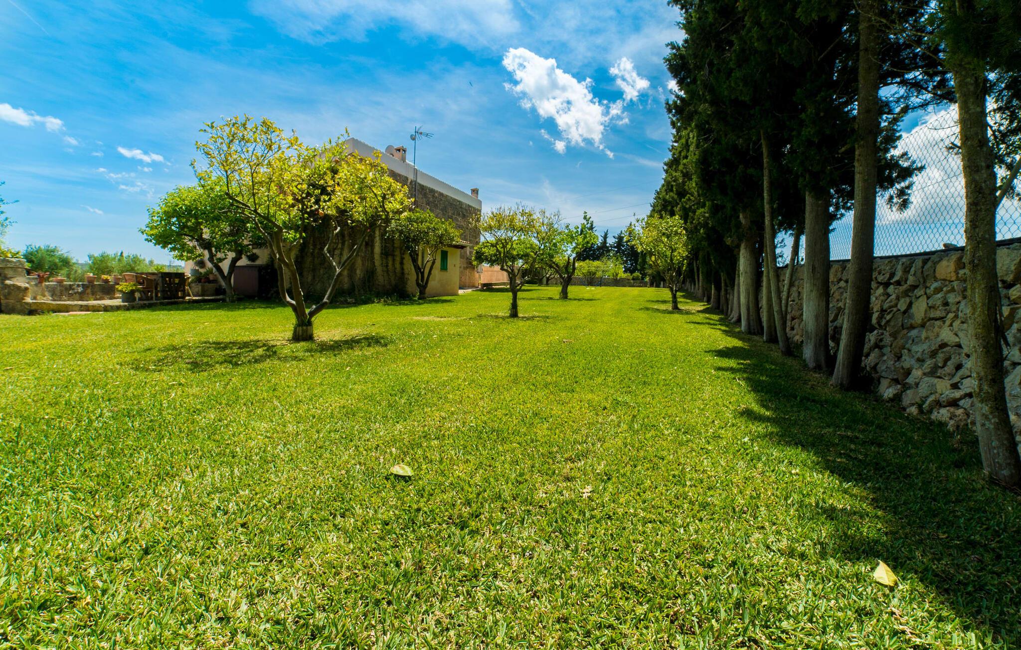Leder I efter en autentisk mallorcansk ferie i idylliske, landlige omgivelser? Også en elegant stemning? Så tag et øjeblik og lær villaen "Sa Vinyasa Des Compte" lidt bedre at kende. Dette er en ejendom, der nemt opfylder alle disse krav, men der er meget mere her end det, så lad os venligst introducere jer til nogle af de finere detaljer. Bygningen ser ud, som om den altid har været en del af det lokale landskab, omgivet af høje nåletræer på den ene side og marker og haver på den anden. Oliventræerne på ejendommen udstråler middelhavskarakter. Dette storslåede terræn er ideelt til alle typer af afslappede udendørsaktiviteter. Langs hele villaens forside løber en overdækket stenpladeterrasse, som er ideel til hverdagen på ferien. Nyd jeres måltider sammen her ved det elegante spisebord og nyd udsigten over det omkringliggende landskab. Bare vær forberedt på at slappe af. Træskodder på vinduerne, en antik udseende stenfacade, et luftigt bambusudhæng og antikke dekorative elementer skaber en unik atmosfære, der inviterer jer til at blive hængende. Et par trin fører til den hævede pool, som er placeret i villaens tidligere vandtank. I kan til enhver tid komme her for at tage en forfriskende svømmetur i vandet eller nyde den varme middelhavssol på solterrassen. Bag huset er der en have med frugttræer og en stor græsplæne, hvor børnene kan lege af hjertens lyst. Der er også en muret grill, hvor I kan grille alle mulige lækkerier og nyde dem med hele besætningen, præcis som I forventer af en ferie. Det mest interessante ved denne villa er, at den har en økologisk køkkenhave, og selv træerne er vedligeholdt på en miljøvenlig måde. Derudover er der også høns i villaen, så I får friske æg om morgenen. Der er endda en venlig kat på ejendommen. Når I træder ind i boligen, vil I bemærke, at ejerne har lagt en stor indsats og sans for detaljerne i at skabe et usædvanligt indbydende miljø. Fusionen af moderne æstetisk design med ægte traditionelle elementer giver rummene en atmosfære fuld af charme og stil. Stedets autentiske karakter understreges af sandstensvægge og unikke antikviteter, som gør det til et ægte blikfang. Og hele interiøret har en smuk balance mellem dekorative gulvfliser og klassiske synlige loftsbjælker. Hoveddøren fører ind i stueetagens spisestue, hvis I ønsker at spise indenfor. Og på køligere aftener kan I tænde pejsen for at gøre det endnu hyggeligere. Til højre er der et hyggeligt soveværelse og et rummeligt badeværelse, der er flot og farverigt indrettet - bruseren bruger endda solopvarmet vand. Til venstre er køkkenet, som er udstyret med højkvalitets apparater til jeres komfort, herunder en kedel og en filterkaffemaskine. Dette er et fantastisk sted at prøve nogle traditionelle spanske opskrifter, mens I er på ferie og måske servere dem til resten af gruppen for at nyde. Den øverste etage er i det væsentlige ét stort rum, opdelt i forskellige rum gennem den smarte placering af et indbygget skab. Den hyggelige, airconditionerede stue er stedet at slappe af efter en lang dag med ferie. Hvis I vil, kan I se en god film på tv eller dvd. Soveværelserne ovenpå, et enkelt- og et dobbeltværelse, har hver deres egen karakteristiske stil, men begge er ideelle til en god nats søvn. Dobbeltværelset åbner direkte ud til den rummelige tagterrasse, som byder på en vidunderlig udsigt i alle retninger. Originale møbler lavet af forsendelsespaller er det perfekte sted at sidde udenfor om aftenen og nyde et godt glas vin. Enkeltværelset er farverigt indrettet og vil helt sikkert være det værelse, som yngre feriegæster ønsker at bo i. I kan købe dagligvarer og andre fornødenheder i Santa Margalida, hvor der er talrige supermarkeder, konditorier og restauranter. Vi anbefaler især morgenmadsbaren "El Sol" på stranden i Son Serra de Marina (ca. 15 km); Nyd en stilfuld brunch med udsigt over stranden og vandet, og der er endda livemusik om søndagen. Can Picafort har stadig fornemmelsen af en kystlandsby, hvor I kan gå en lang tur på promenaden langs den blege sandstrand, der strækker sig nordpå til Port d'Alcúdia. Barer, restauranter, butikker og endda natklubber sikrer en ferie, I aldrig vil glemme. Den autentiske mallorcanske villa "Sa Vinyasa Des Compte" er gemt væk på en 28.000 m² stor grund, kun 2 km syd for den lille by Santa Margalida på den nordlige del af øen. Den rolige beliggenhed er ideel for naturelskere. Sineu ligger 15 minutters kørsel derfra, og smukke Inca kan nås på cirka 25 minutter. Kystbyen Can Picafort ligger kun 11 km væk. Tag dertil for at nyde havet og shoppe dagligvarer og andre daglige fornødenheder.