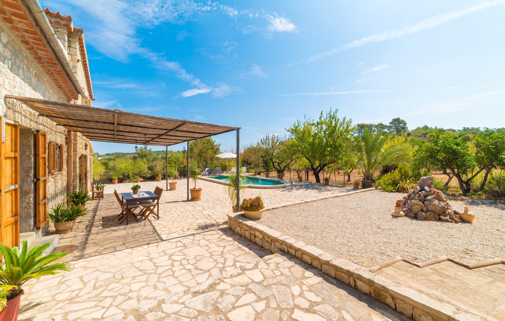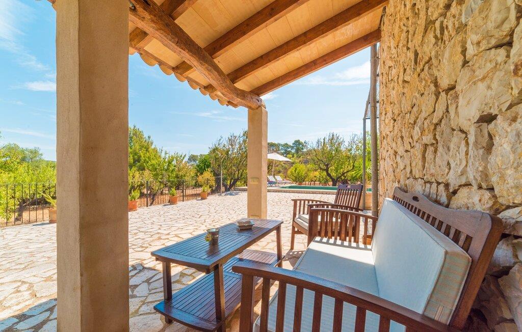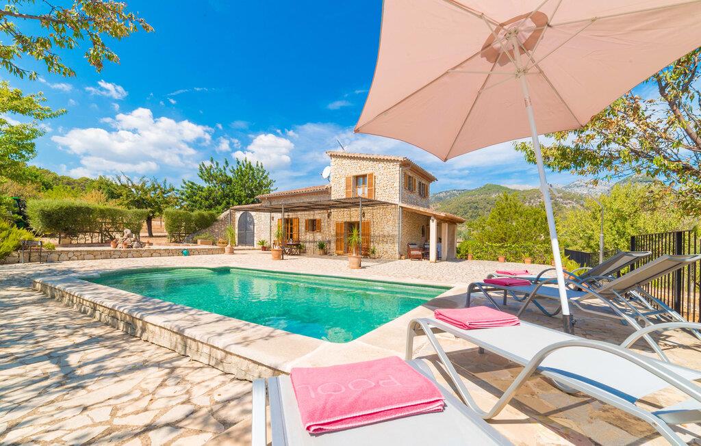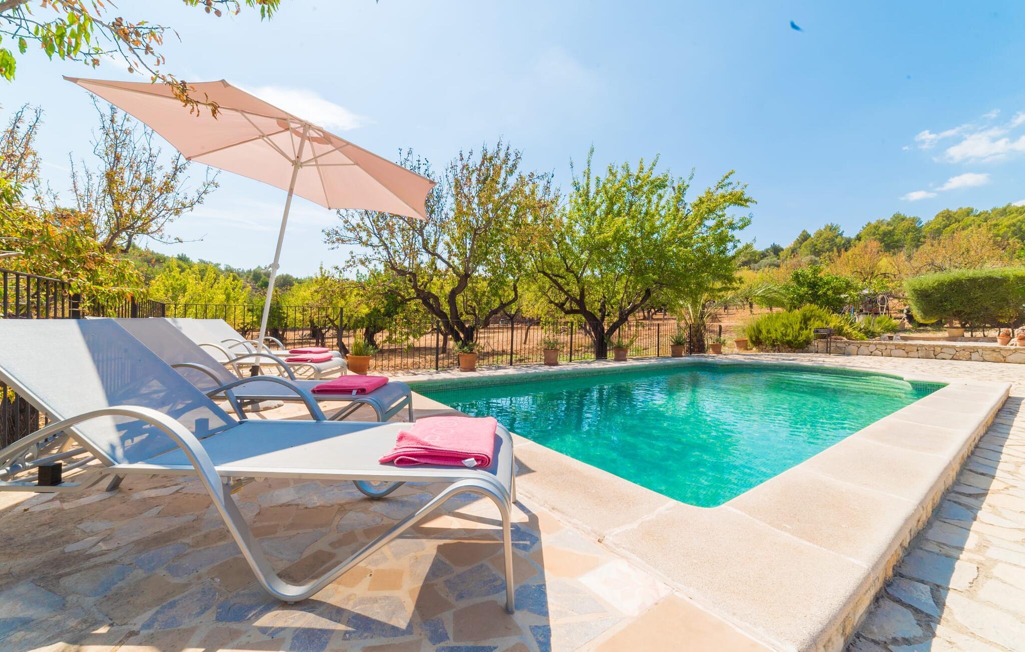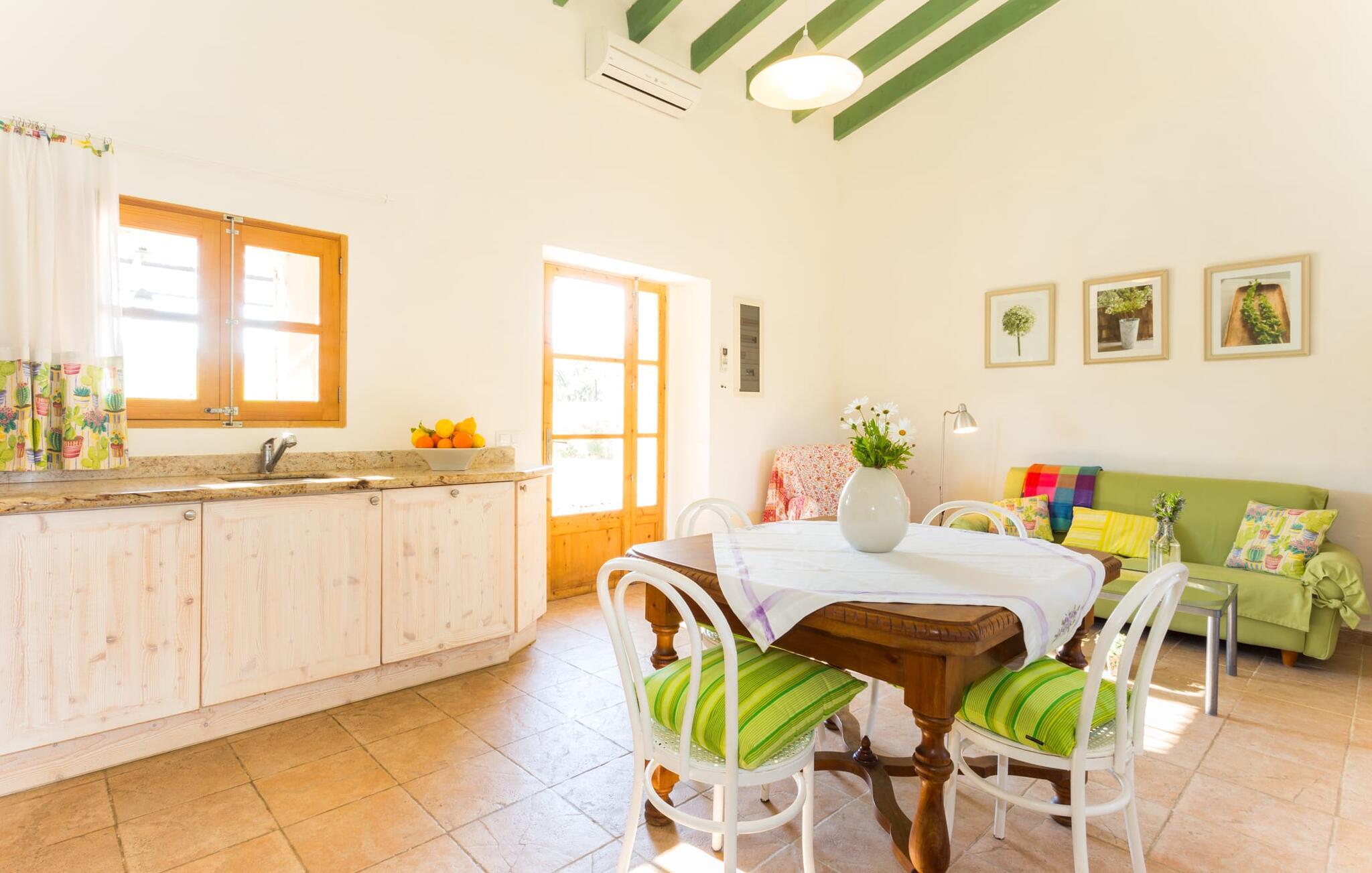 Naturstensvillaen "Sa Volta" byder sine gæster velkommen i en vidunderlig landlig idyl og omgivet af fortryllende middelhavscharme. Denne ekstraordinært venlige atmosfære får nytilkomne med det samme lyst til at blive. Udearealet i dette feriehus er præget af store terrassearealer beklædt med natursten og masser af grønt, som dekorativt indrammer dette maleriske billede. Poolen, som det centrale element i udendørsområdet, er et sandt blikfang med sine skinnende grønne mosaikfliser. Den har en dybde på op til 2,10 m og er meget let tilgængelig via trapper. På varme dage kan I forfriske jer dejligt i det kølende vand - og derefter slappe af i solen på de medfølgende liggestole og måske slet ikke lave noget. I er trods alt på ferie. Den medfølgende parasol beskytter jer mod overdreven UV-stråling. Huset byder på andre attraktive siddemuligheder fra solrige til halvskygge til skyggefulde. Med i alt syv muligheder for udendørs siddepladser er der stor variation, og alle vil finde deres personlige yndlingssted. Terrassen ved huset er et dejligt sted at nyde jeres måltider sammen. Afhængigt af tidspunktet på dagen byder dette sted på forskellige udsigter, der ændrer sig med solens position. Hver af dem har sin egen charme og vil give jer timevis af fornøjelse. Det indre af huset giver også en indbydende atmosfære. En høj og lyse stue/spisestue, designet med lyse og muntre farver og møbler, med et integreret køkken udgør det primære opholdsrum. Især den forfriskende grøn farve fremstår som et tilbagevendende element forskellige steder og giver den i forvejen hyggelige flair et ekstra harmonisk præg. Her finder I et hyggeligt sofahjørne, et lille spisebord til indendørs måltider og et fuldt udstyret, L-formet køkken, der byder på alt hvad I behøver til jeres daglige behov med brødrister, filterkaffemaskine og elkedel. Hvilken morgenlykke: at lave en aromatisk kop kaffe, blot træde ud af døren og stå under den åbne, dybblå himmel. En attraktiv trappe fører til husets første sal og byder på to charmerende, romantiske og moderne soveværelser. Ekstremt originale designelementer i sengenes hovedender giver rummene en meget individuel og meget stilfuld karakter. Det moderne design fortsætter konsekvent i badeværelset og byder på dagslys og møbler af høj kvalitet. Et strygejern og en hårtørrer er bekvemt tilgængelige og behøver ikke at medbringes i jeres bagage. Den lille villa "Sa Volta" ligger roligt i udkanten af Selva på den nordlige del af øen. Det er omgivet af smuk natur. Byens centrum ligger kun 10 minutters gang væk. Nær den maleriske bjerglandsby Caimari (1,4 km) ligger huset tæt på de imponerende Tramuntana-bjerge. De smukke bugter og strande på den nordlige og østlige del af øen kan også nemt nås i bil fra dette feriehus. Turen til lufthavnen tager 35 minutter. Så tæt på naturen og alligevel bekvemt placeret, kan I tilbringe en varieret og fuldstændig tilfredsstillende ferie i villaen "Sa Volta".