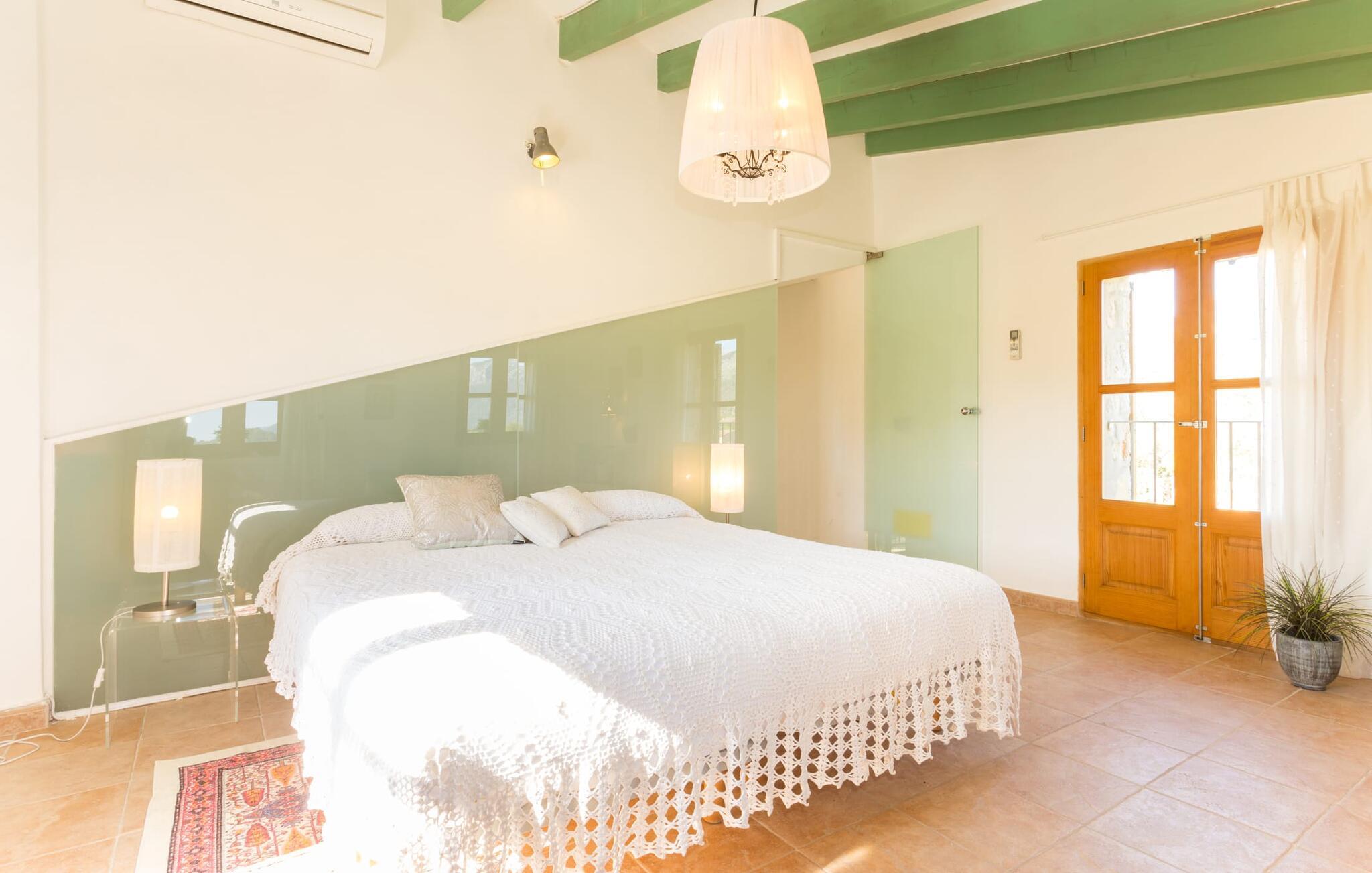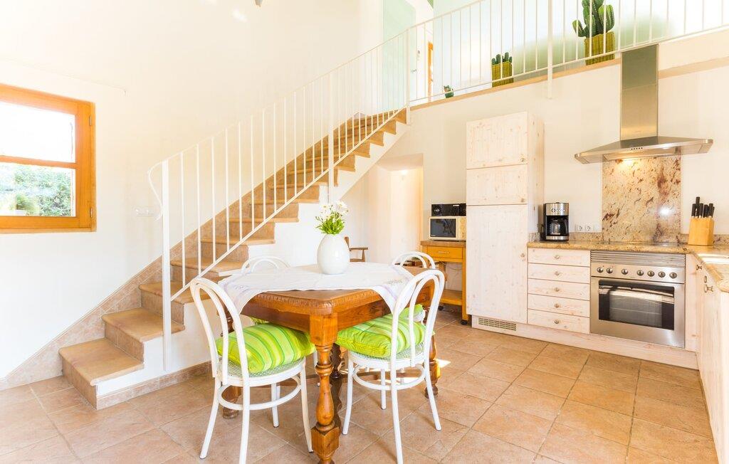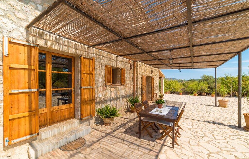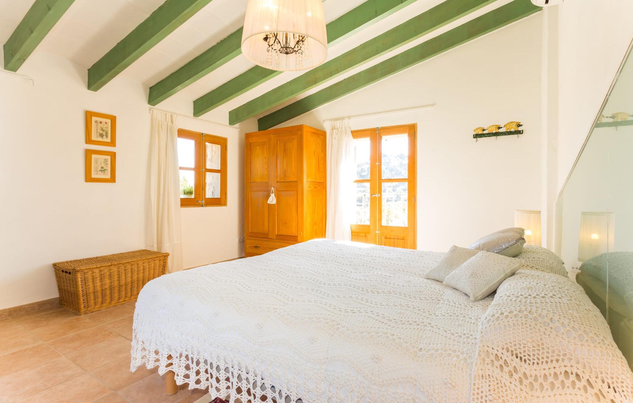 Naturstensvillaen "Sa Volta" byder sine gæster velkommen i en vidunderlig landlig idyl og omgivet af fortryllende middelhavscharme. Denne ekstraordinært venlige atmosfære får nytilkomne med det samme lyst til at blive. Udearealet i dette feriehus er præget af store terrassearealer beklædt med natursten og masser af grønt, som dekorativt indrammer dette maleriske billede. Poolen, som det centrale element i udendørsområdet, er et sandt blikfang med sine skinnende grønne mosaikfliser. Den har en dybde på op til 2,10 m og er meget let tilgængelig via trapper. På varme dage kan I forfriske jer dejligt i det kølende vand - og derefter slappe af i solen på de medfølgende liggestole og måske slet ikke lave noget. I er trods alt på ferie. Den medfølgende parasol beskytter jer mod overdreven UV-stråling. Huset byder på andre attraktive siddemuligheder fra solrige til halvskygge til skyggefulde. Med i alt syv muligheder for udendørs siddepladser er der stor variation, og alle vil finde deres personlige yndlingssted. Terrassen ved huset er et dejligt sted at nyde jeres måltider sammen. Afhængigt af tidspunktet på dagen byder dette sted på forskellige udsigter, der ændrer sig med solens position. Hver af dem har sin egen charme og vil give jer timevis af fornøjelse. Det indre af huset giver også en indbydende atmosfære. En høj og lyse stue/spisestue, designet med lyse og muntre farver og møbler, med et integreret køkken udgør det primære opholdsrum. Især den forfriskende grøn farve fremstår som et tilbagevendende element forskellige steder og giver den i forvejen hyggelige flair et ekstra harmonisk præg. Her finder I et hyggeligt sofahjørne, et lille spisebord til indendørs måltider og et fuldt udstyret, L-formet køkken, der byder på alt hvad I behøver til jeres daglige behov med brødrister, filterkaffemaskine og elkedel. Hvilken morgenlykke: at lave en aromatisk kop kaffe, blot træde ud af døren og stå under den åbne, dybblå himmel. En attraktiv trappe fører til husets første sal og byder på to charmerende, romantiske og moderne soveværelser. Ekstremt originale designelementer i sengenes hovedender giver rummene en meget individuel og meget stilfuld karakter. Det moderne design fortsætter konsekvent i badeværelset og byder på dagslys og møbler af høj kvalitet. Et strygejern og en hårtørrer er bekvemt tilgængelige og behøver ikke at medbringes i jeres bagage. Den lille villa "Sa Volta" ligger roligt i udkanten af Selva på den nordlige del af øen. Det er omgivet af smuk natur. Byens centrum ligger kun 10 minutters gang væk. Nær den maleriske bjerglandsby Caimari (1,4 km) ligger huset tæt på de imponerende Tramuntana-bjerge. De smukke bugter og strande på den nordlige og østlige del af øen kan også nemt nås i bil fra dette feriehus. Turen til lufthavnen tager 35 minutter. Så tæt på naturen og alligevel bekvemt placeret, kan I tilbringe en varieret og fuldstændig tilfredsstillende ferie i villaen "Sa Volta".