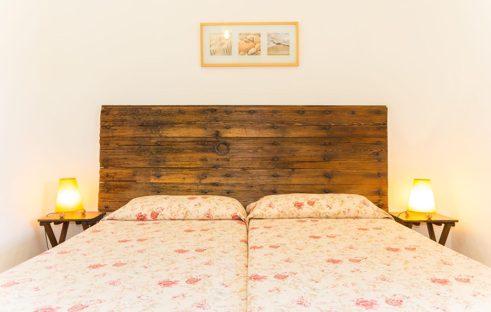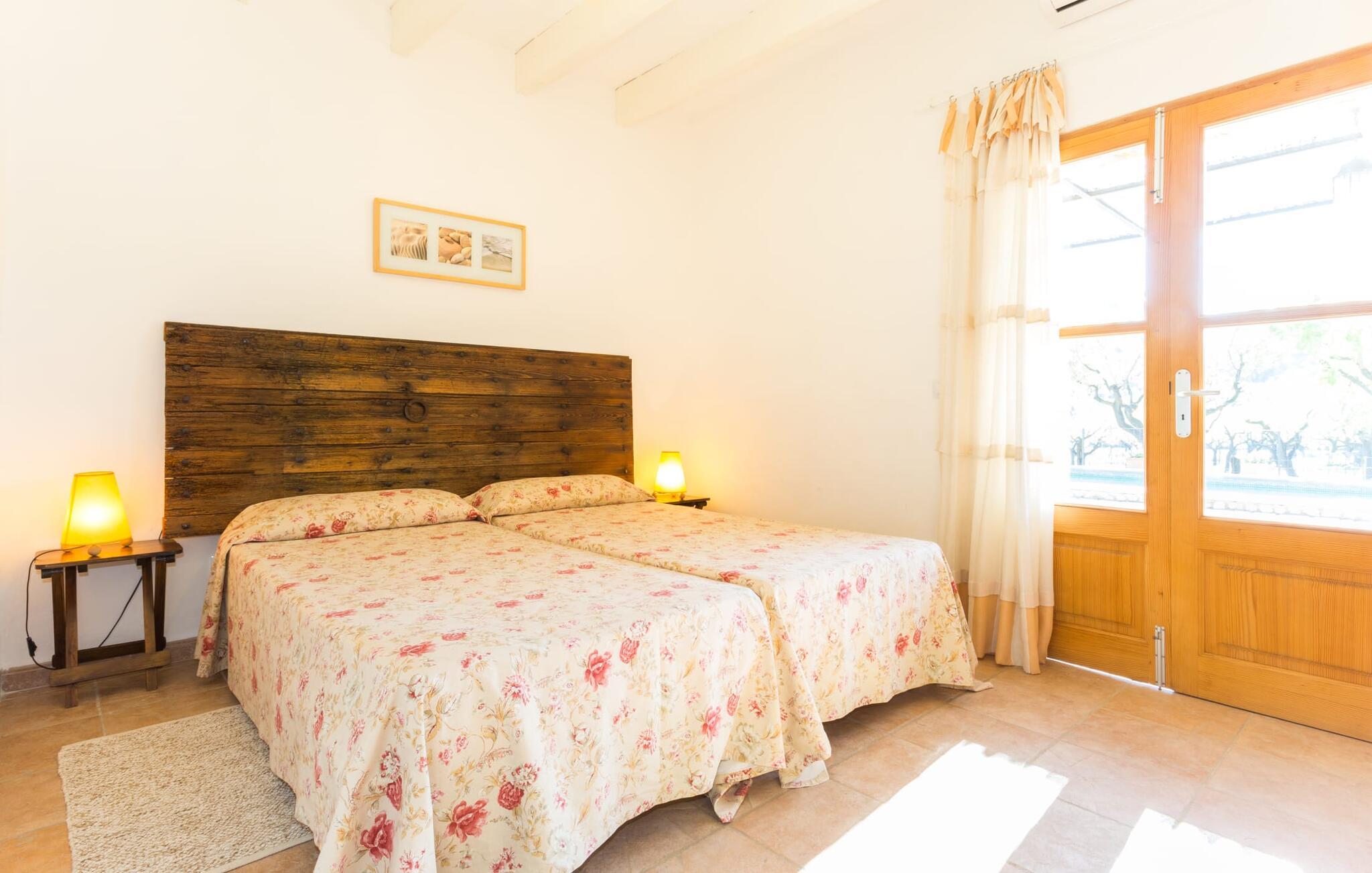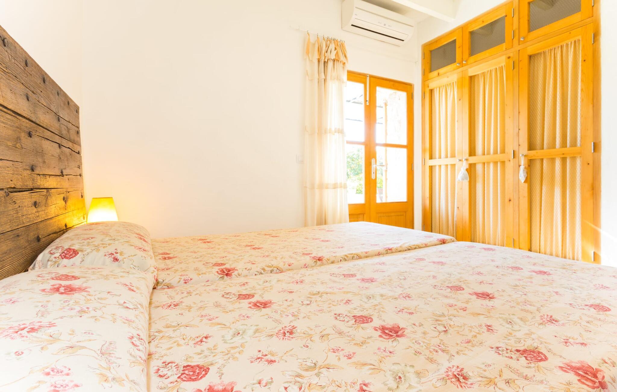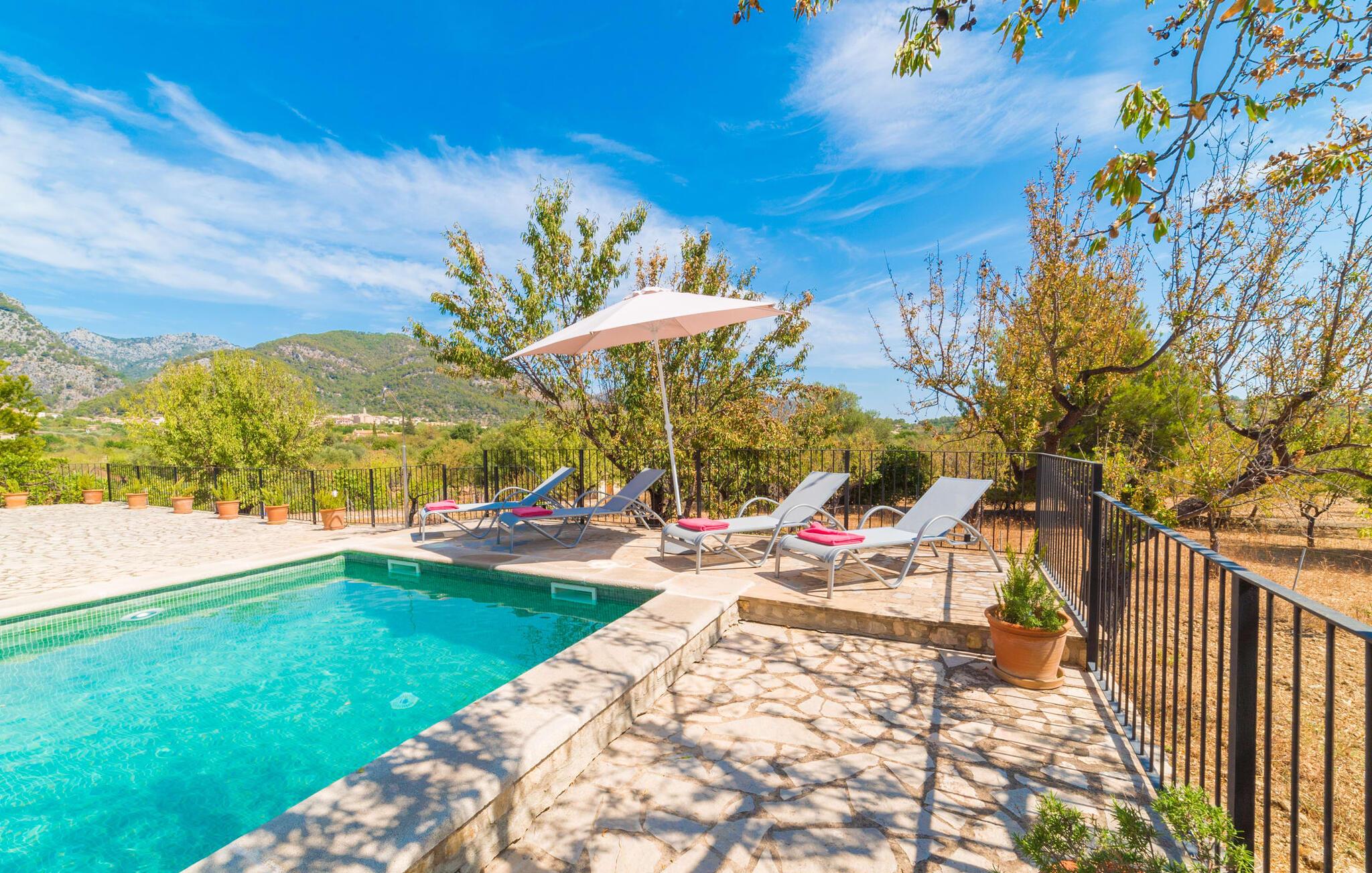 Naturstensvillaen "Sa Volta" byder sine gæster velkommen i en vidunderlig landlig idyl og omgivet af fortryllende middelhavscharme. Denne ekstraordinært venlige atmosfære får nytilkomne med det samme lyst til at blive. Udearealet i dette feriehus er præget af store terrassearealer beklædt med natursten og masser af grønt, som dekorativt indrammer dette maleriske billede. Poolen, som det centrale element i udendørsområdet, er et sandt blikfang med sine skinnende grønne mosaikfliser. Den har en dybde på op til 2,10 m og er meget let tilgængelig via trapper. På varme dage kan I forfriske jer dejligt i det kølende vand - og derefter slappe af i solen på de medfølgende liggestole og måske slet ikke lave noget. I er trods alt på ferie. Den medfølgende parasol beskytter jer mod overdreven UV-stråling. Huset byder på andre attraktive siddemuligheder fra solrige til halvskygge til skyggefulde. Med i alt syv muligheder for udendørs siddepladser er der stor variation, og alle vil finde deres personlige yndlingssted. Terrassen ved huset er et dejligt sted at nyde jeres måltider sammen. Afhængigt af tidspunktet på dagen byder dette sted på forskellige udsigter, der ændrer sig med solens position. Hver af dem har sin egen charme og vil give jer timevis af fornøjelse. Det indre af huset giver også en indbydende atmosfære. En høj og lyse stue/spisestue, designet med lyse og muntre farver og møbler, med et integreret køkken udgør det primære opholdsrum. Især den forfriskende grøn farve fremstår som et tilbagevendende element forskellige steder og giver den i forvejen hyggelige flair et ekstra harmonisk præg. Her finder I et hyggeligt sofahjørne, et lille spisebord til indendørs måltider og et fuldt udstyret, L-formet køkken, der byder på alt hvad I behøver til jeres daglige behov med brødrister, filterkaffemaskine og elkedel. Hvilken morgenlykke: at lave en aromatisk kop kaffe, blot træde ud af døren og stå under den åbne, dybblå himmel. En attraktiv trappe fører til husets første sal og byder på to charmerende, romantiske og moderne soveværelser. Ekstremt originale designelementer i sengenes hovedender giver rummene en meget individuel og meget stilfuld karakter. Det moderne design fortsætter konsekvent i badeværelset og byder på dagslys og møbler af høj kvalitet. Et strygejern og en hårtørrer er bekvemt tilgængelige og behøver ikke at medbringes i jeres bagage. Den lille villa "Sa Volta" ligger roligt i udkanten af Selva på den nordlige del af øen. Det er omgivet af smuk natur. Byens centrum ligger kun 10 minutters gang væk. Nær den maleriske bjerglandsby Caimari (1,4 km) ligger huset tæt på de imponerende Tramuntana-bjerge. De smukke bugter og strande på den nordlige og østlige del af øen kan også nemt nås i bil fra dette feriehus. Turen til lufthavnen tager 35 minutter. Så tæt på naturen og alligevel bekvemt placeret, kan I tilbringe en varieret og fuldstændig tilfredsstillende ferie i villaen "Sa Volta".