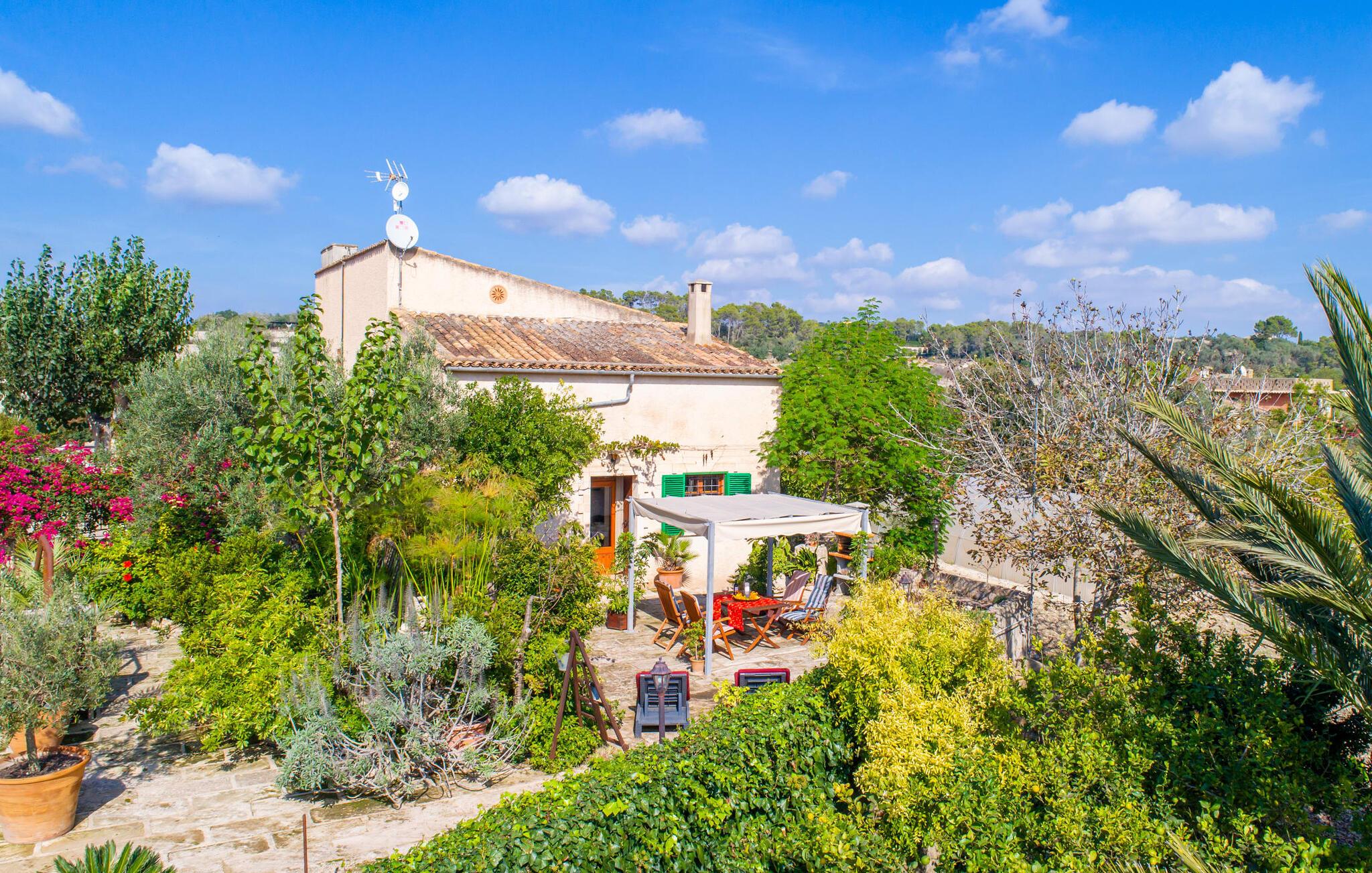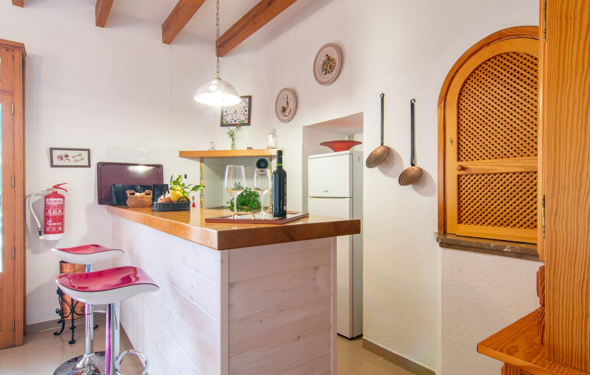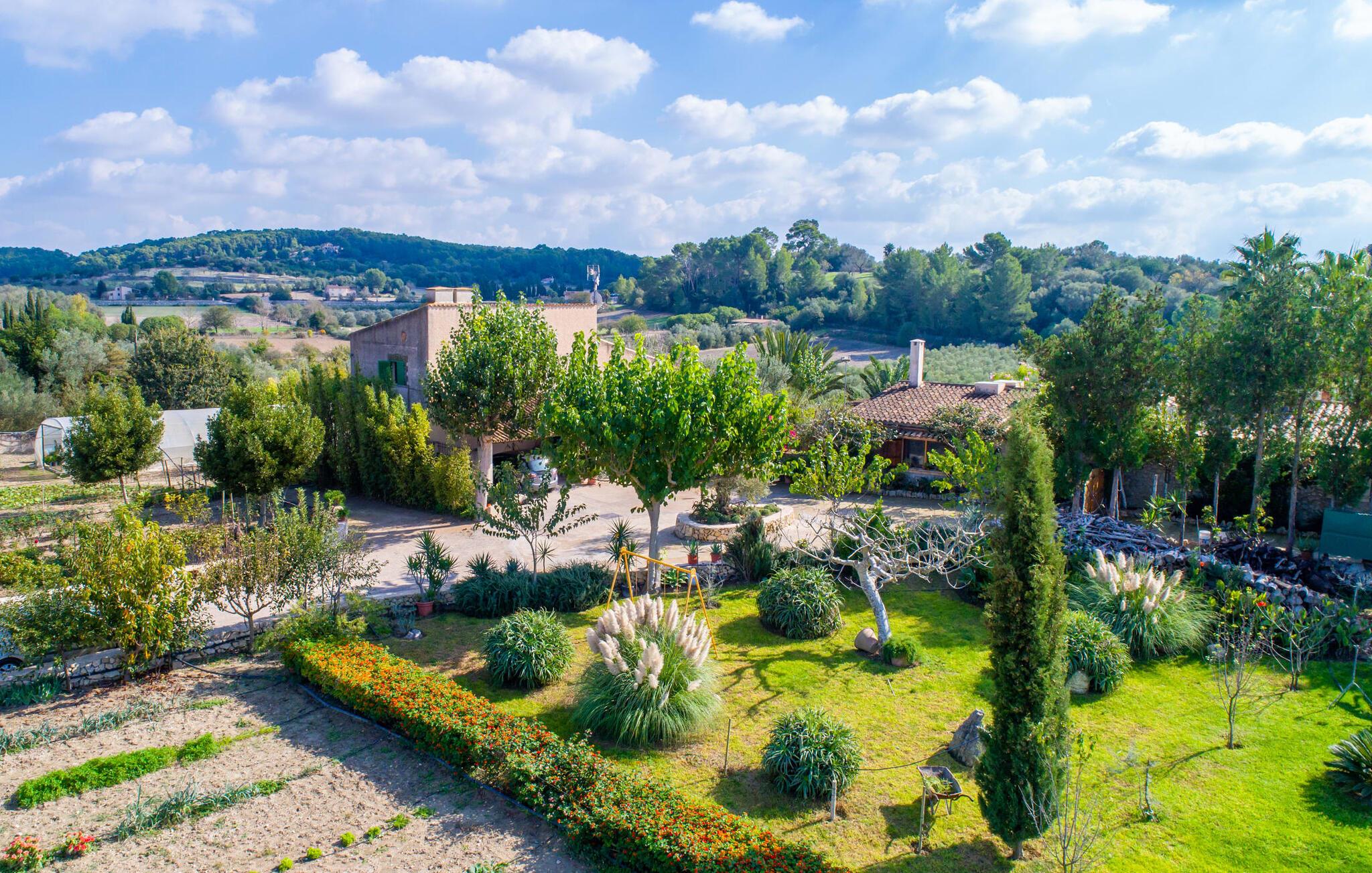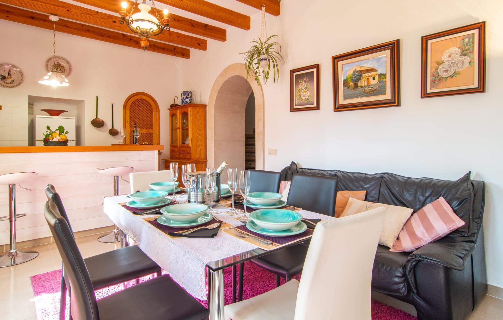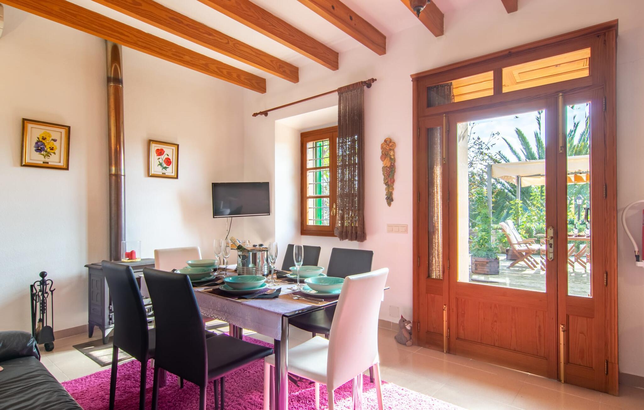 Muntert indbydende og usædvanligt hyggeligt - det beskriver villaen "Sabor de Cas Ferrer" meget godt. Takket være de farverige og kærligt udvalgte detaljer kombineret med fortryllende grønt rundt omkring, skinner det lille, blankpudsede hus med en helt speciel glans. Udearealet er perfekt til vandelskere, da den vidunderligt glitrende pool med sin imponerende længde på 16 m ikke kun byder på forfriskende afkøling på varme dage, men også mulighed for at svømme et par længder. For en velfortjent pause efter svømning kan I finde jer tilpas på en liggestol eller den store verandagynge. Og når det er tid til middag, kan I gå direkte til den smukke, overdækkede spiseplads. Nu skal I bare fyre op i grillen og begynde at tilberede jeres kulinariske delikatesser. Et godt glas vin, selskab med jeres kære - det er alt hvad I behøver for en perfekt aften! Det indre af villaen er lige så hyggeligt. Kærligt indrettet og fuld af farverige små detaljer, den fælles opholds- og spisestue med åbent køkken inviterer jer til at blive hængende. Lige meget om I tilbereder et lækkert måltid med jeres familie i det veludstyrede køkken eller døser i sofaen, mens de andre sludrer livligt i den store spiseplads. Takket være de korte afstande kan jeres familie hurtigt samles – præcis som de skal på ferie. Og hvis I har brug for lidt privatliv, kan I trygt trække jer tilbage til et af de smukke soveværelser. Også her skaber lyst træ og en rustik stemning den ultimative behagelig atmosfære. I kan putte jer i puderne, nyde den vidunderlige ro i de landlige omgivelser og slumre til næste morgen. De to badeværelser i rustik, typisk middelhavsstil inviterer jer til at tage et forfriskende brusebad. Villaens smukke, landlige beliggenhed vil helt sikkert appellere til ivrige vandrere og vandrere. Små opdagelsesture eller lange vandreture vil helt sikkert have nogle overraskelser i vente. Efter blot 3 km gåtur når I den lille by Montuiri, som ikke kun byder på en historisk interessant bymidte inklusive et arkæologisk museum, men også udstråler den fortryllende flair af en typisk mallorcinsk by. Men storbyfølelsen tager ikke lang tid at nå frem, for I kan nå øens hovedstad Palma de Mallorca på en halv time via landevejen. Her kan I finde stort set alt hvad hjertet begærer. Måske en tur dertil kan kombineres med et par afslappende timer på stranden? Platja de Palma eller Es Penyo er næsten på vej. Det er værd at pakke badetøjet og en lille picnic og efter en livlig spadseretur gennem byen, slappe af i sandet og lytte til havets brusen. Den fortryllende villa "Sabor de Cas Ferrer" har en fantastisk, idyllisk beliggenhed på en smukt anlagt ejendom i centrum af den baleariske ø. Den nærliggende by Montuiri ligger kun 3,5 km væk. Her finder I en hæveautomat, et ugentligt marked og nogle små butikker. Supermarkedet ligger også kun 4,7 km væk. Til svømmeture skal I kun køre 26 eller 28 km til smukke sandstrande som Platja de Palma eller Es Plenyo.