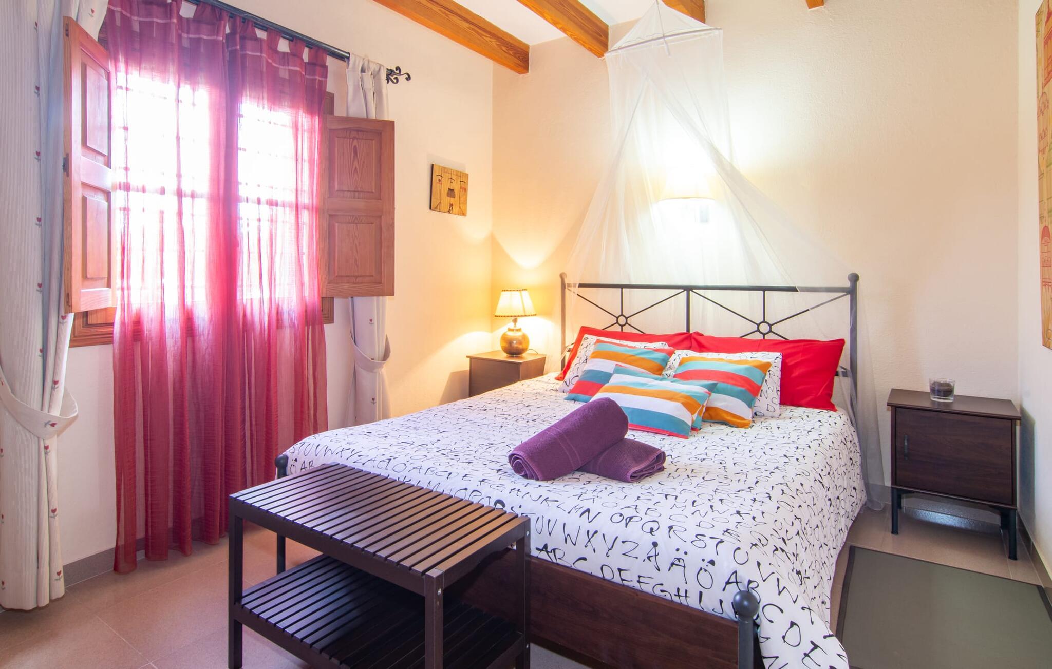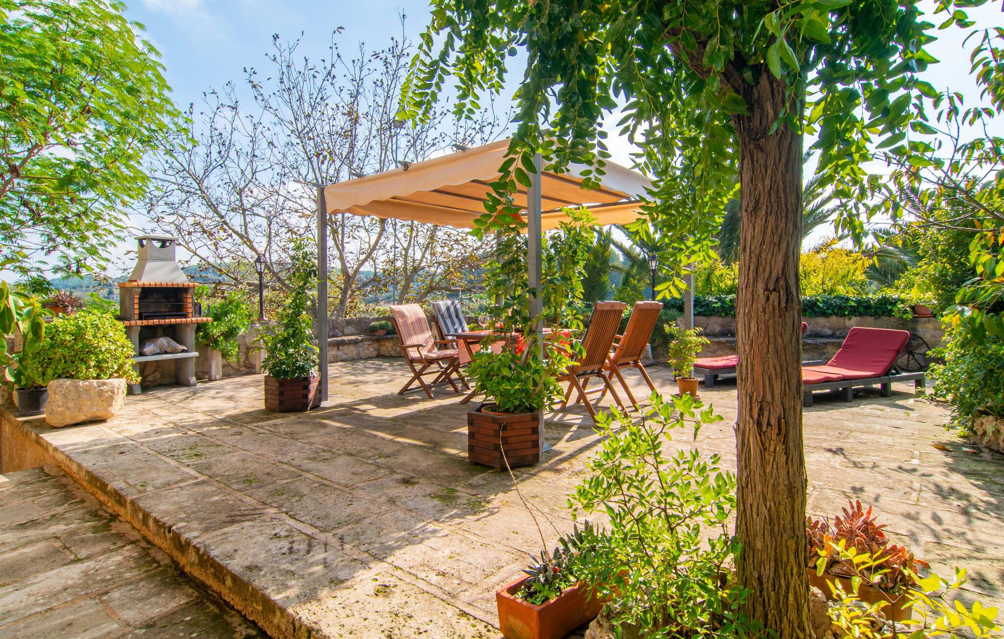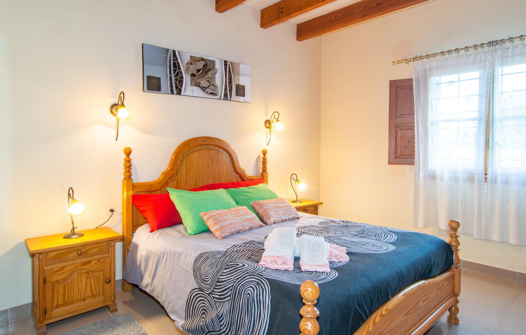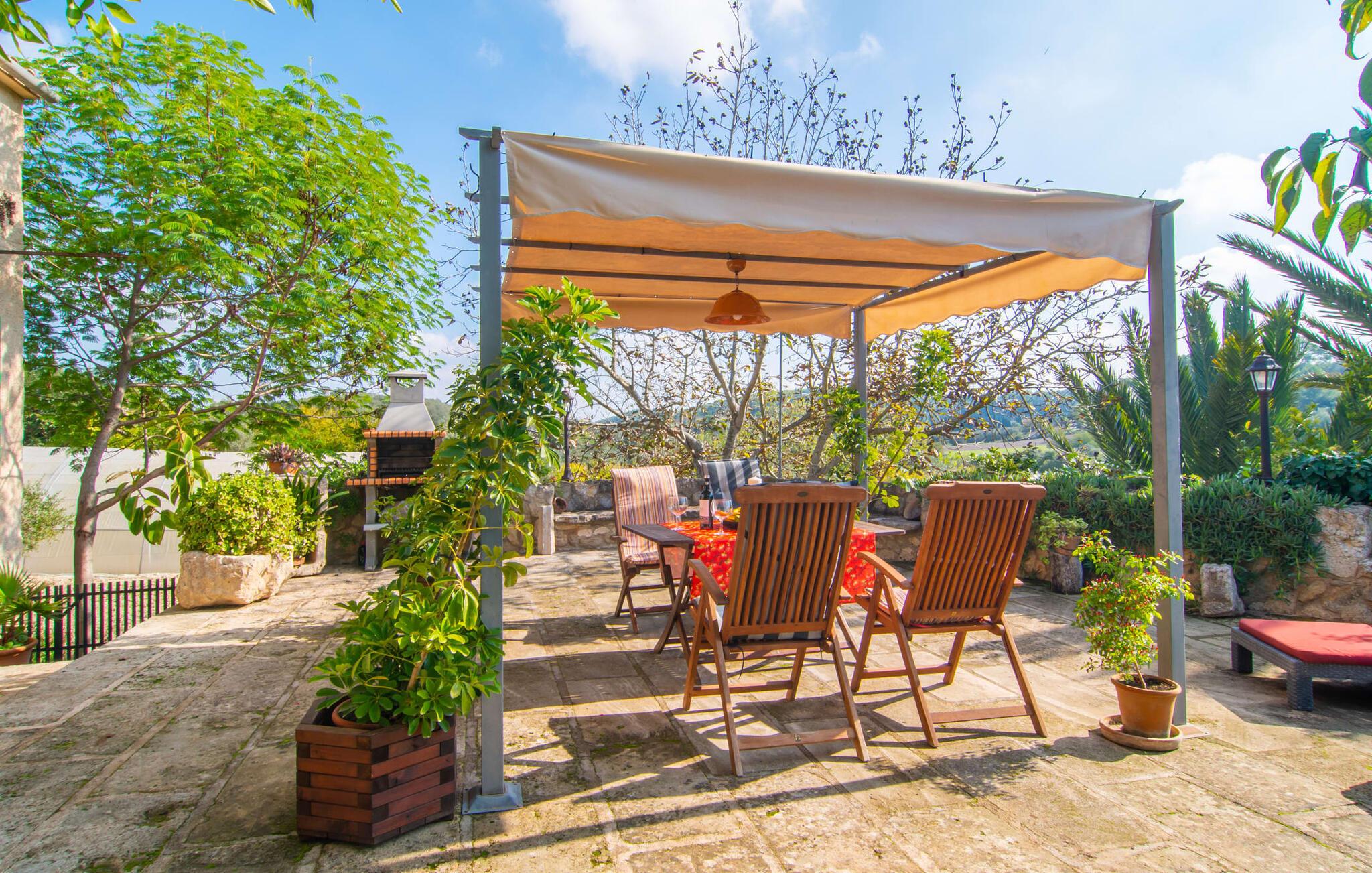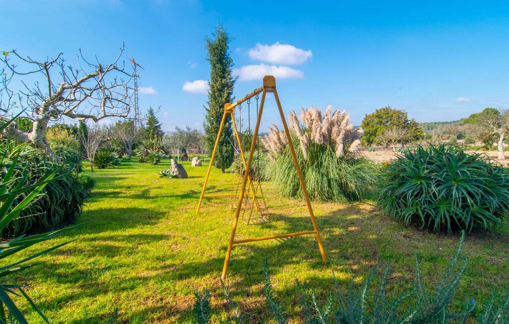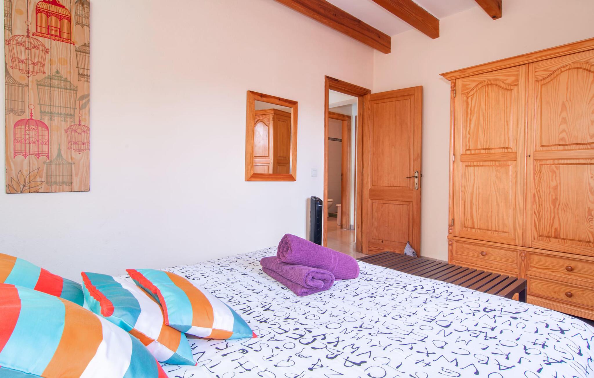 Muntert indbydende og usædvanligt hyggeligt - det beskriver villaen "Sabor de Cas Ferrer" meget godt. Takket være de farverige og kærligt udvalgte detaljer kombineret med fortryllende grønt rundt omkring, skinner det lille, blankpudsede hus med en helt speciel glans. Udearealet er perfekt til vandelskere, da den vidunderligt glitrende pool med sin imponerende længde på 16 m ikke kun byder på forfriskende afkøling på varme dage, men også mulighed for at svømme et par længder. For en velfortjent pause efter svømning kan I finde jer tilpas på en liggestol eller den store verandagynge. Og når det er tid til middag, kan I gå direkte til den smukke, overdækkede spiseplads. Nu skal I bare fyre op i grillen og begynde at tilberede jeres kulinariske delikatesser. Et godt glas vin, selskab med jeres kære - det er alt hvad I behøver for en perfekt aften! Det indre af villaen er lige så hyggeligt. Kærligt indrettet og fuld af farverige små detaljer, den fælles opholds- og spisestue med åbent køkken inviterer jer til at blive hængende. Lige meget om I tilbereder et lækkert måltid med jeres familie i det veludstyrede køkken eller døser i sofaen, mens de andre sludrer livligt i den store spiseplads. Takket være de korte afstande kan jeres familie hurtigt samles – præcis som de skal på ferie. Og hvis I har brug for lidt privatliv, kan I trygt trække jer tilbage til et af de smukke soveværelser. Også her skaber lyst træ og en rustik stemning den ultimative behagelig atmosfære. I kan putte jer i puderne, nyde den vidunderlige ro i de landlige omgivelser og slumre til næste morgen. De to badeværelser i rustik, typisk middelhavsstil inviterer jer til at tage et forfriskende brusebad. Villaens smukke, landlige beliggenhed vil helt sikkert appellere til ivrige vandrere og vandrere. Små opdagelsesture eller lange vandreture vil helt sikkert have nogle overraskelser i vente. Efter blot 3 km gåtur når I den lille by Montuiri, som ikke kun byder på en historisk interessant bymidte inklusive et arkæologisk museum, men også udstråler den fortryllende flair af en typisk mallorcinsk by. Men storbyfølelsen tager ikke lang tid at nå frem, for I kan nå øens hovedstad Palma de Mallorca på en halv time via landevejen. Her kan I finde stort set alt hvad hjertet begærer. Måske en tur dertil kan kombineres med et par afslappende timer på stranden? Platja de Palma eller Es Penyo er næsten på vej. Det er værd at pakke badetøjet og en lille picnic og efter en livlig spadseretur gennem byen, slappe af i sandet og lytte til havets brusen. Den fortryllende villa "Sabor de Cas Ferrer" har en fantastisk, idyllisk beliggenhed på en smukt anlagt ejendom i centrum af den baleariske ø. Den nærliggende by Montuiri ligger kun 3,5 km væk. Her finder I en hæveautomat, et ugentligt marked og nogle små butikker. Supermarkedet ligger også kun 4,7 km væk. Til svømmeture skal I kun køre 26 eller 28 km til smukke sandstrande som Platja de Palma eller Es Plenyo.