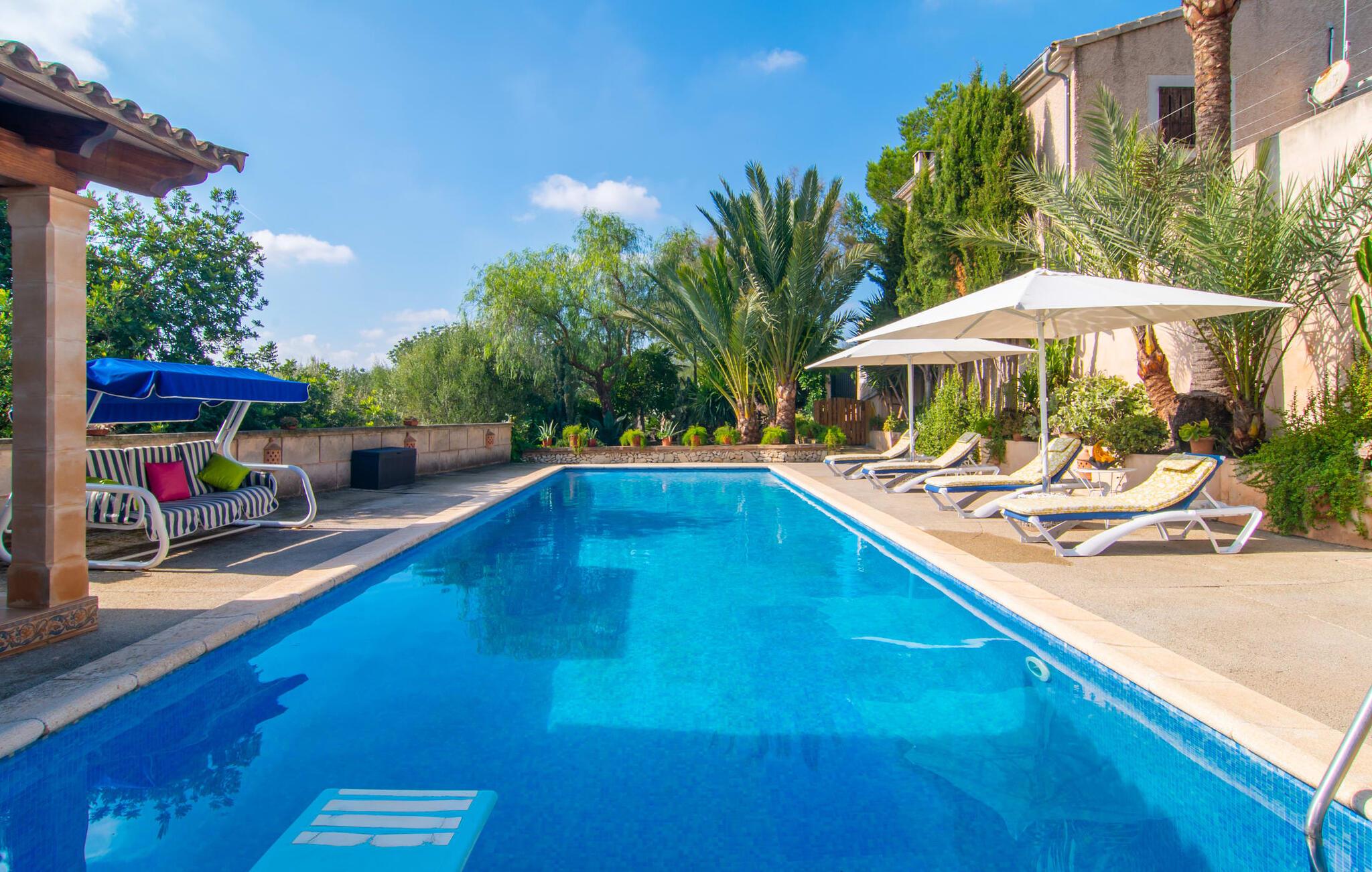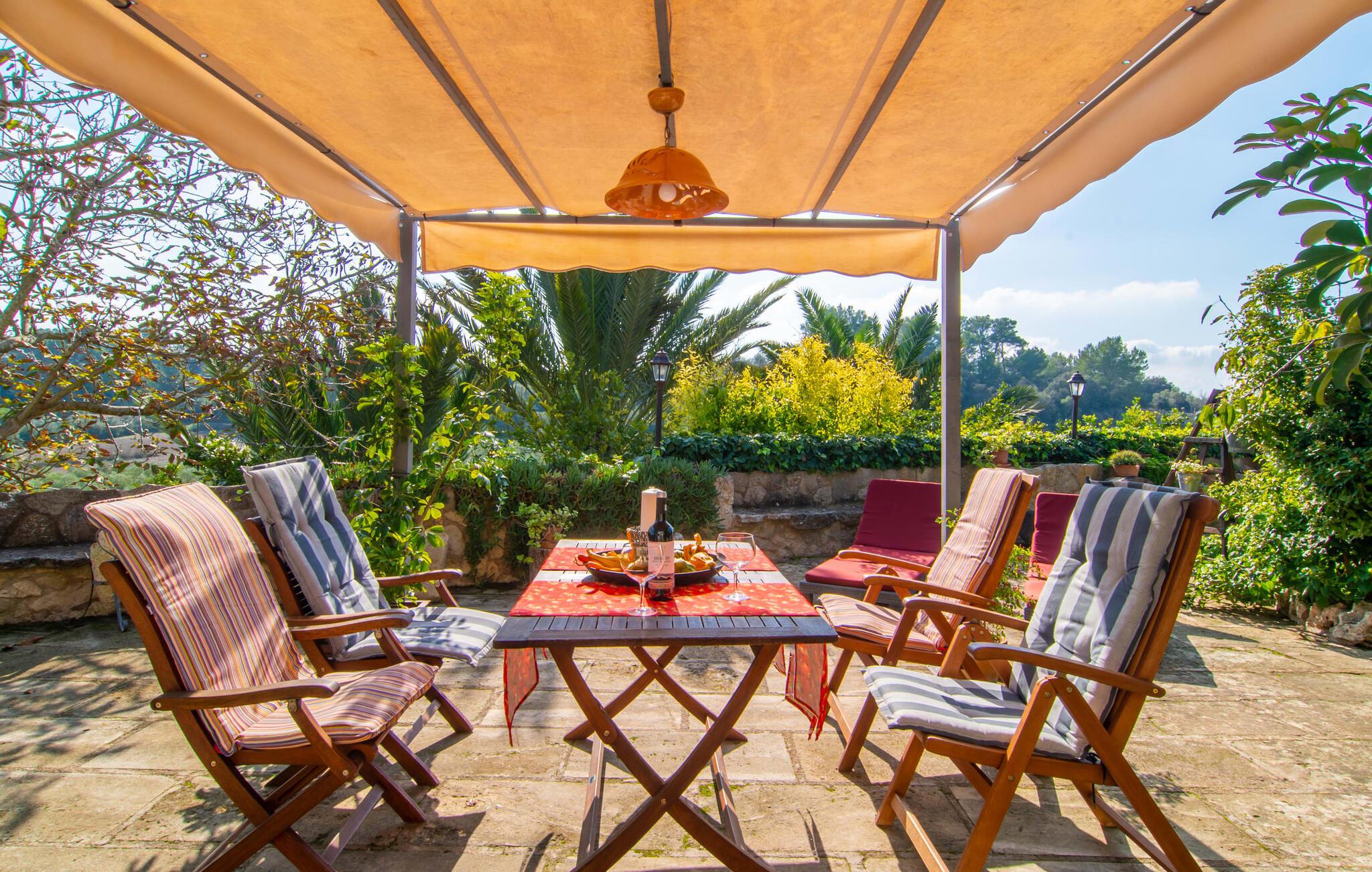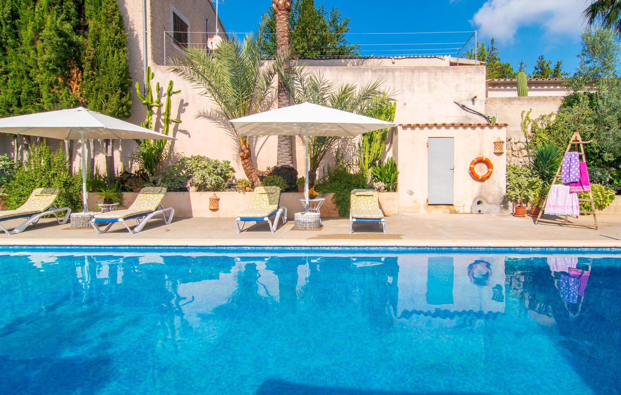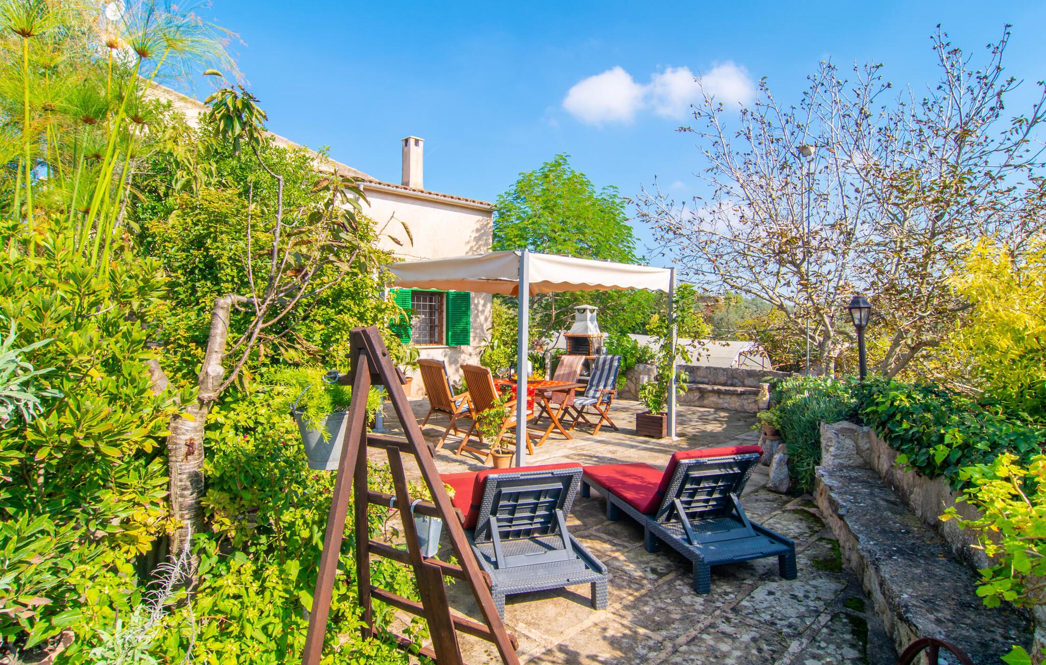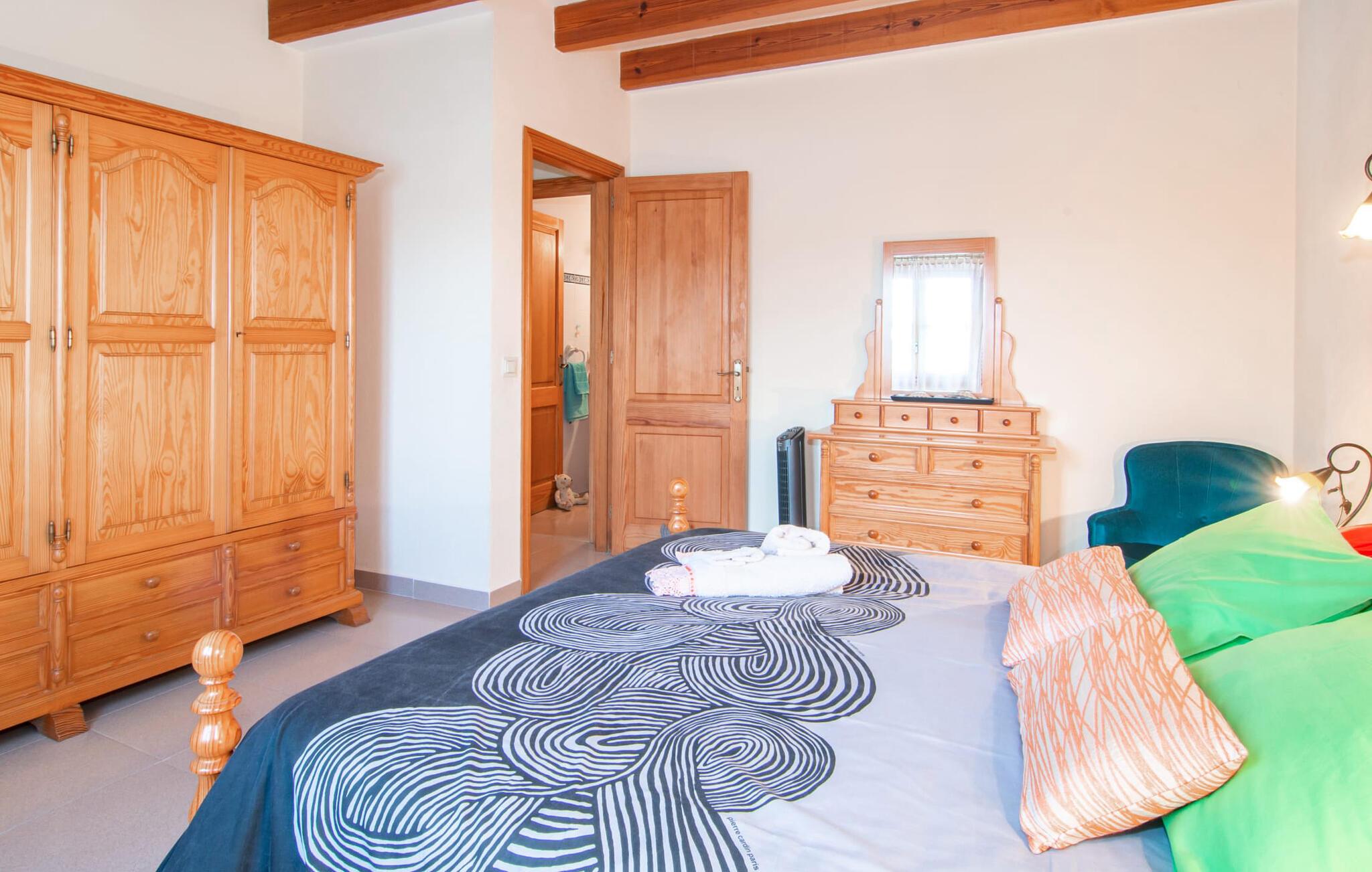 Muntert indbydende og usædvanligt hyggeligt - det beskriver villaen "Sabor de Cas Ferrer" meget godt. Takket være de farverige og kærligt udvalgte detaljer kombineret med fortryllende grønt rundt omkring, skinner det lille, blankpudsede hus med en helt speciel glans. Udearealet er perfekt til vandelskere, da den vidunderligt glitrende pool med sin imponerende længde på 16 m ikke kun byder på forfriskende afkøling på varme dage, men også mulighed for at svømme et par længder. For en velfortjent pause efter svømning kan I finde jer tilpas på en liggestol eller den store verandagynge. Og når det er tid til middag, kan I gå direkte til den smukke, overdækkede spiseplads. Nu skal I bare fyre op i grillen og begynde at tilberede jeres kulinariske delikatesser. Et godt glas vin, selskab med jeres kære - det er alt hvad I behøver for en perfekt aften! Det indre af villaen er lige så hyggeligt. Kærligt indrettet og fuld af farverige små detaljer, den fælles opholds- og spisestue med åbent køkken inviterer jer til at blive hængende. Lige meget om I tilbereder et lækkert måltid med jeres familie i det veludstyrede køkken eller døser i sofaen, mens de andre sludrer livligt i den store spiseplads. Takket være de korte afstande kan jeres familie hurtigt samles – præcis som de skal på ferie. Og hvis I har brug for lidt privatliv, kan I trygt trække jer tilbage til et af de smukke soveværelser. Også her skaber lyst træ og en rustik stemning den ultimative behagelig atmosfære. I kan putte jer i puderne, nyde den vidunderlige ro i de landlige omgivelser og slumre til næste morgen. De to badeværelser i rustik, typisk middelhavsstil inviterer jer til at tage et forfriskende brusebad. Villaens smukke, landlige beliggenhed vil helt sikkert appellere til ivrige vandrere og vandrere. Små opdagelsesture eller lange vandreture vil helt sikkert have nogle overraskelser i vente. Efter blot 3 km gåtur når I den lille by Montuiri, som ikke kun byder på en historisk interessant bymidte inklusive et arkæologisk museum, men også udstråler den fortryllende flair af en typisk mallorcinsk by. Men storbyfølelsen tager ikke lang tid at nå frem, for I kan nå øens hovedstad Palma de Mallorca på en halv time via landevejen. Her kan I finde stort set alt hvad hjertet begærer. Måske en tur dertil kan kombineres med et par afslappende timer på stranden? Platja de Palma eller Es Penyo er næsten på vej. Det er værd at pakke badetøjet og en lille picnic og efter en livlig spadseretur gennem byen, slappe af i sandet og lytte til havets brusen. Den fortryllende villa "Sabor de Cas Ferrer" har en fantastisk, idyllisk beliggenhed på en smukt anlagt ejendom i centrum af den baleariske ø. Den nærliggende by Montuiri ligger kun 3,5 km væk. Her finder I en hæveautomat, et ugentligt marked og nogle små butikker. Supermarkedet ligger også kun 4,7 km væk. Til svømmeture skal I kun køre 26 eller 28 km til smukke sandstrande som Platja de Palma eller Es Plenyo.