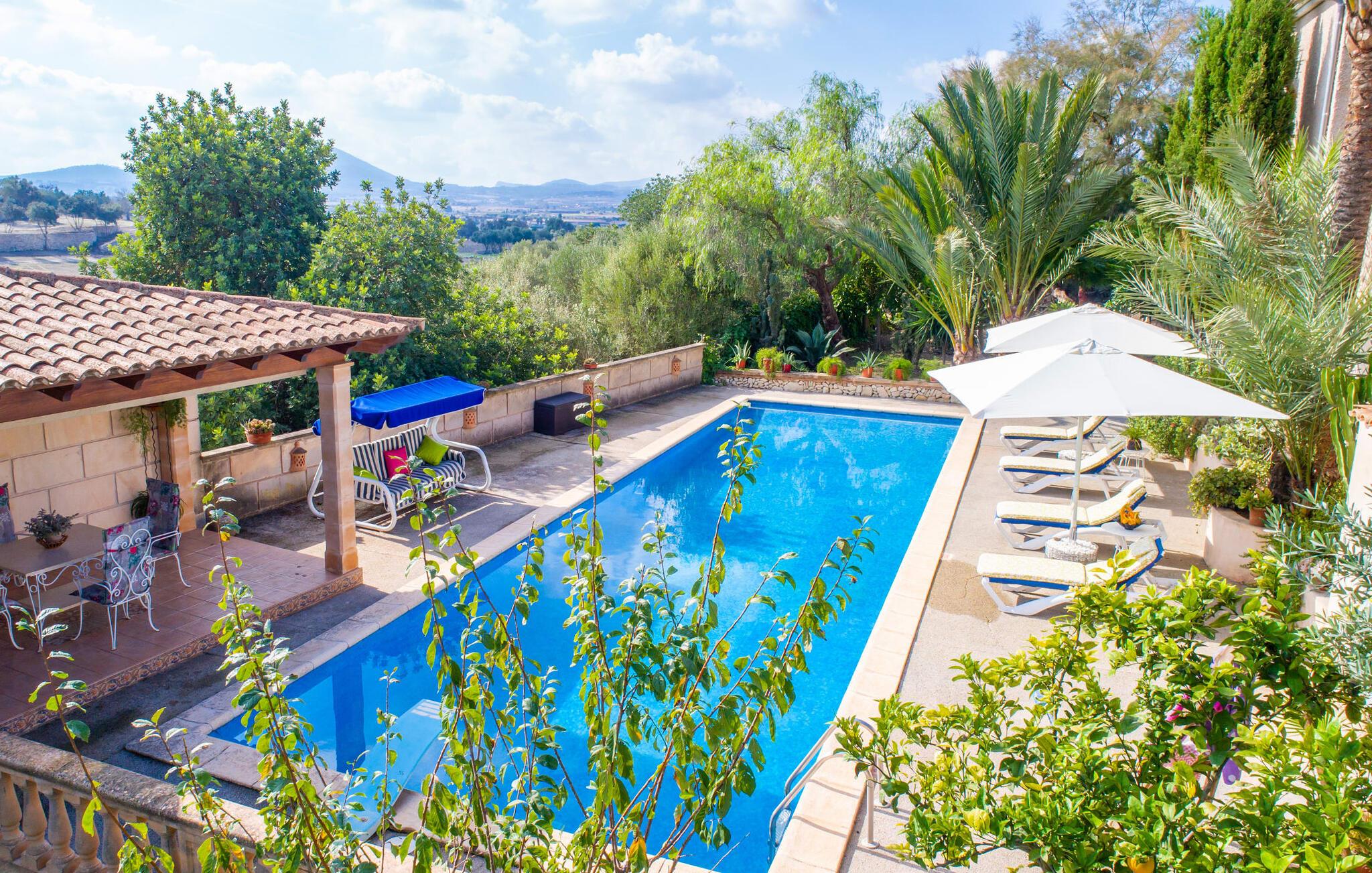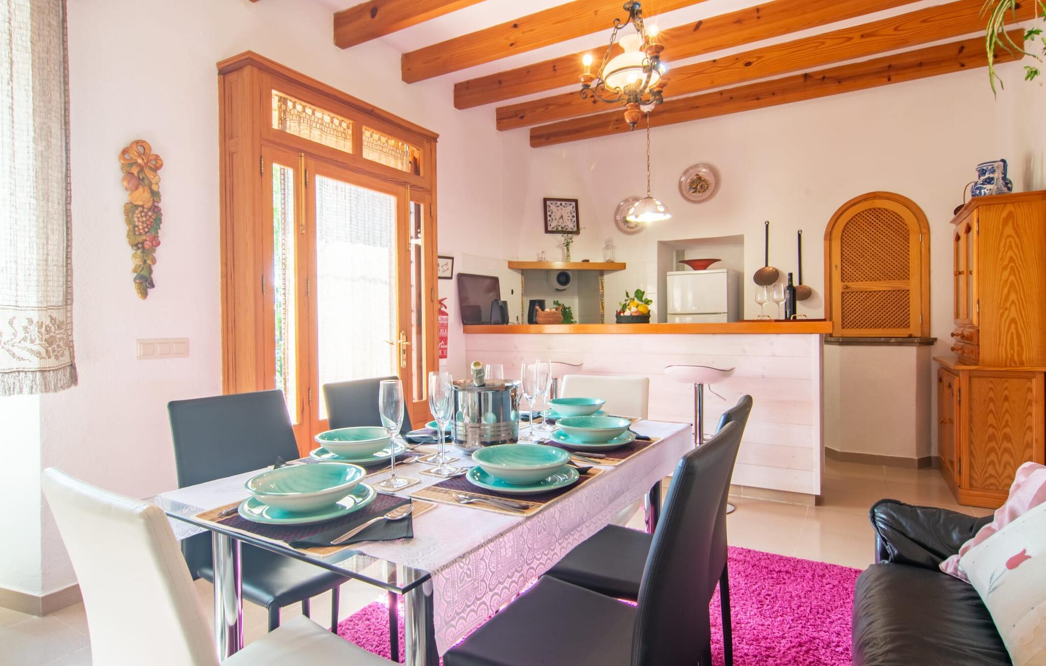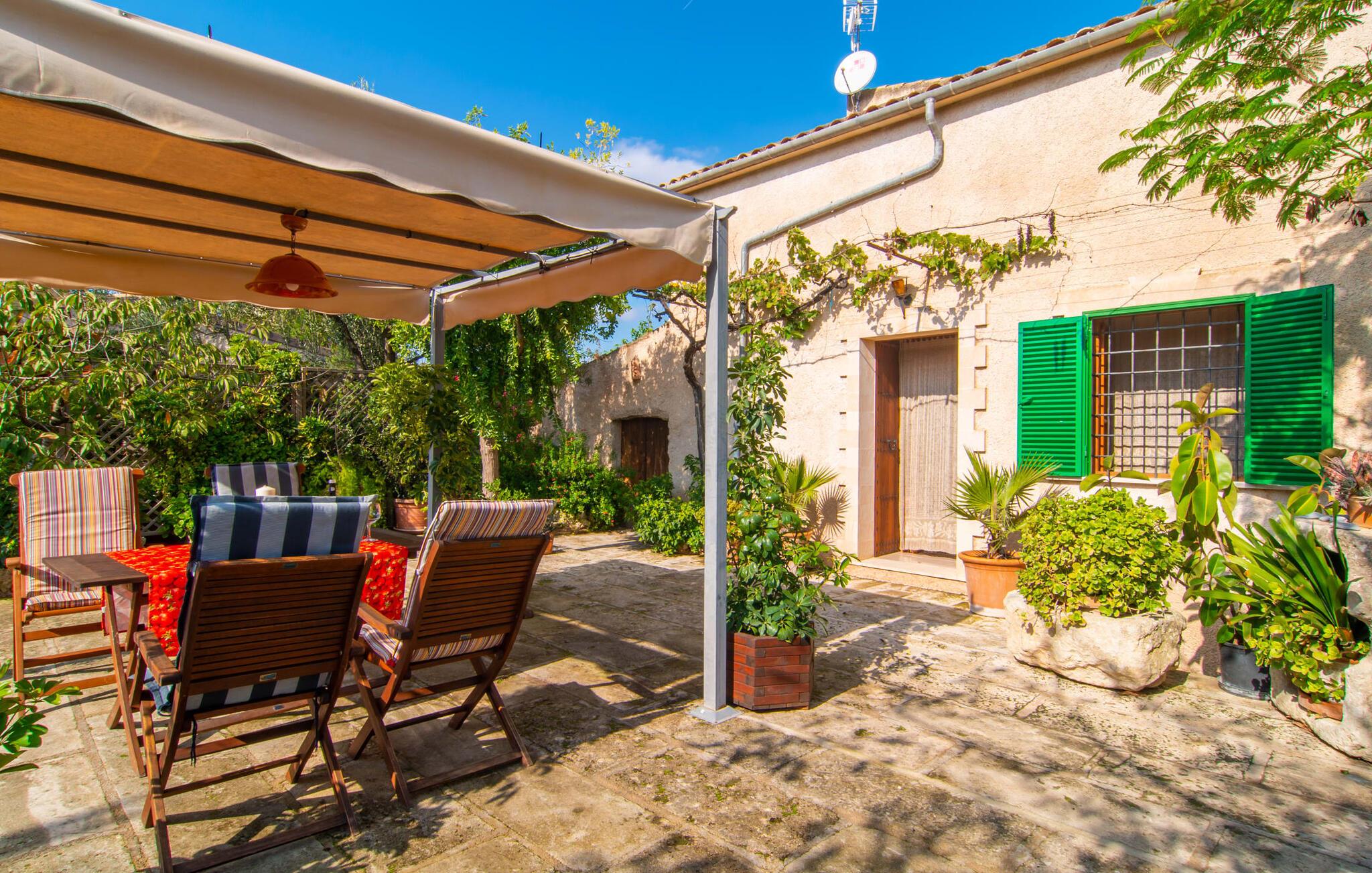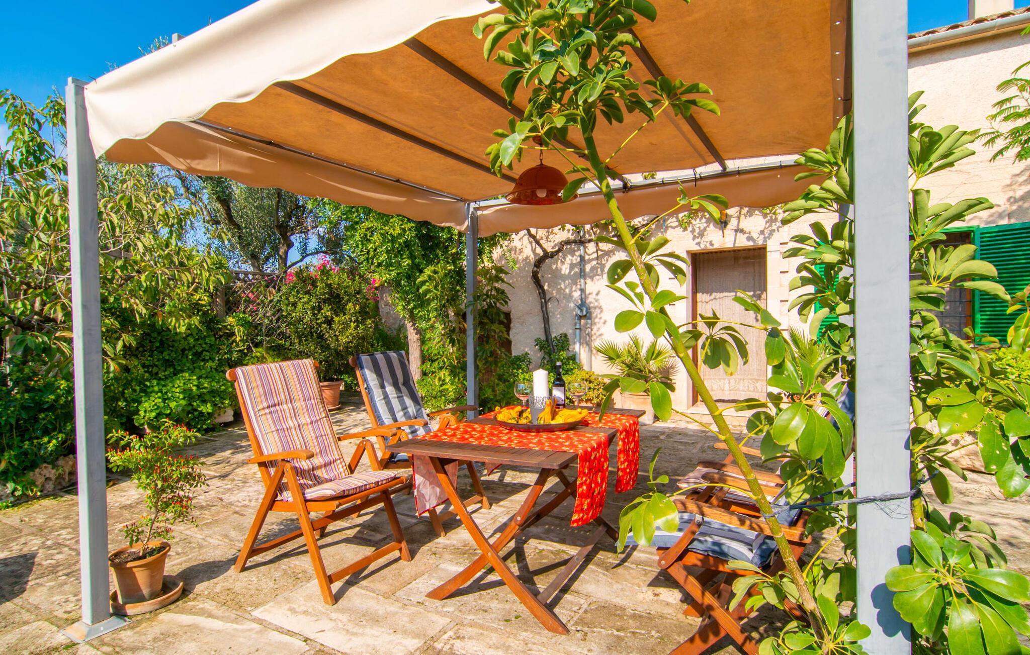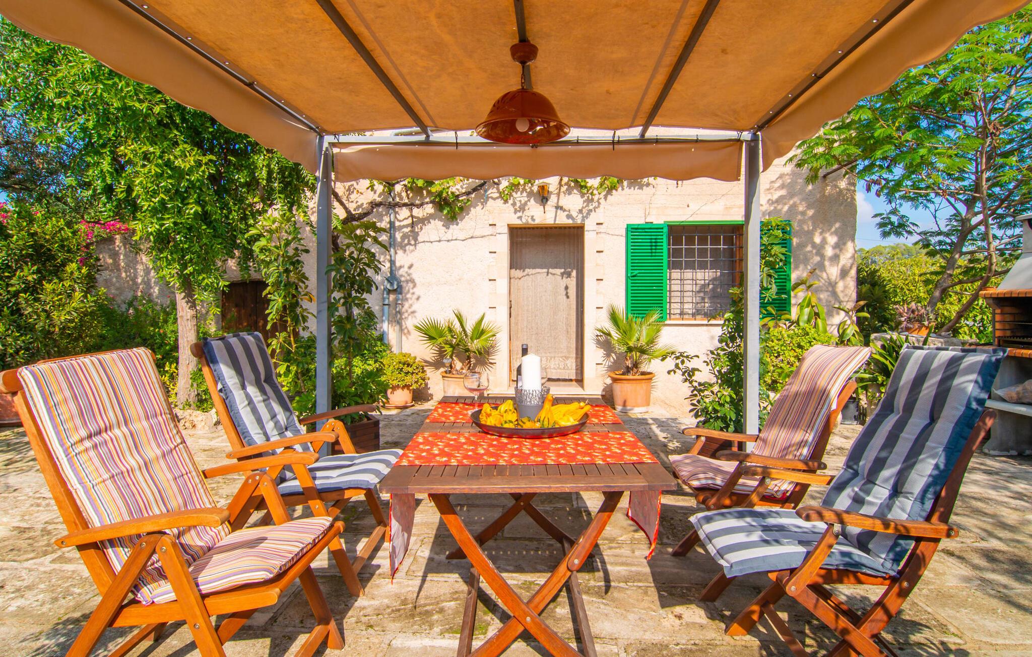 Muntert indbydende og usædvanligt hyggeligt - det beskriver villaen "Sabor de Cas Ferrer" meget godt. Takket være de farverige og kærligt udvalgte detaljer kombineret med fortryllende grønt rundt omkring, skinner det lille, blankpudsede hus med en helt speciel glans. Udearealet er perfekt til vandelskere, da den vidunderligt glitrende pool med sin imponerende længde på 16 m ikke kun byder på forfriskende afkøling på varme dage, men også mulighed for at svømme et par længder. For en velfortjent pause efter svømning kan I finde jer tilpas på en liggestol eller den store verandagynge. Og når det er tid til middag, kan I gå direkte til den smukke, overdækkede spiseplads. Nu skal I bare fyre op i grillen og begynde at tilberede jeres kulinariske delikatesser. Et godt glas vin, selskab med jeres kære - det er alt hvad I behøver for en perfekt aften! Det indre af villaen er lige så hyggeligt. Kærligt indrettet og fuld af farverige små detaljer, den fælles opholds- og spisestue med åbent køkken inviterer jer til at blive hængende. Lige meget om I tilbereder et lækkert måltid med jeres familie i det veludstyrede køkken eller døser i sofaen, mens de andre sludrer livligt i den store spiseplads. Takket være de korte afstande kan jeres familie hurtigt samles – præcis som de skal på ferie. Og hvis I har brug for lidt privatliv, kan I trygt trække jer tilbage til et af de smukke soveværelser. Også her skaber lyst træ og en rustik stemning den ultimative behagelig atmosfære. I kan putte jer i puderne, nyde den vidunderlige ro i de landlige omgivelser og slumre til næste morgen. De to badeværelser i rustik, typisk middelhavsstil inviterer jer til at tage et forfriskende brusebad. Villaens smukke, landlige beliggenhed vil helt sikkert appellere til ivrige vandrere og vandrere. Små opdagelsesture eller lange vandreture vil helt sikkert have nogle overraskelser i vente. Efter blot 3 km gåtur når I den lille by Montuiri, som ikke kun byder på en historisk interessant bymidte inklusive et arkæologisk museum, men også udstråler den fortryllende flair af en typisk mallorcinsk by. Men storbyfølelsen tager ikke lang tid at nå frem, for I kan nå øens hovedstad Palma de Mallorca på en halv time via landevejen. Her kan I finde stort set alt hvad hjertet begærer. Måske en tur dertil kan kombineres med et par afslappende timer på stranden? Platja de Palma eller Es Penyo er næsten på vej. Det er værd at pakke badetøjet og en lille picnic og efter en livlig spadseretur gennem byen, slappe af i sandet og lytte til havets brusen. Den fortryllende villa "Sabor de Cas Ferrer" har en fantastisk, idyllisk beliggenhed på en smukt anlagt ejendom i centrum af den baleariske ø. Den nærliggende by Montuiri ligger kun 3,5 km væk. Her finder I en hæveautomat, et ugentligt marked og nogle små butikker. Supermarkedet ligger også kun 4,7 km væk. Til svømmeture skal I kun køre 26 eller 28 km til smukke sandstrande som Platja de Palma eller Es Plenyo.