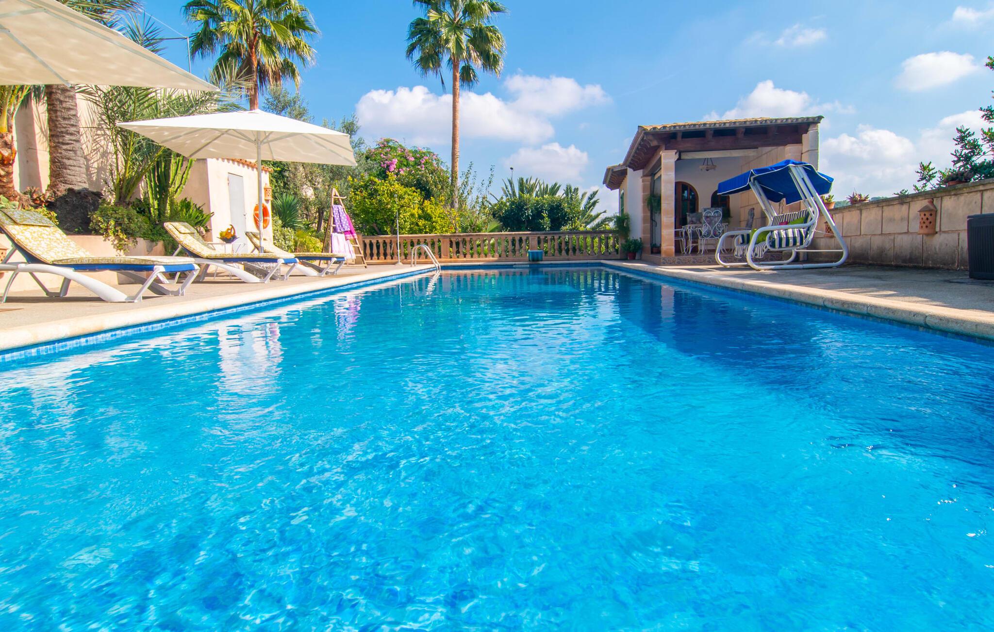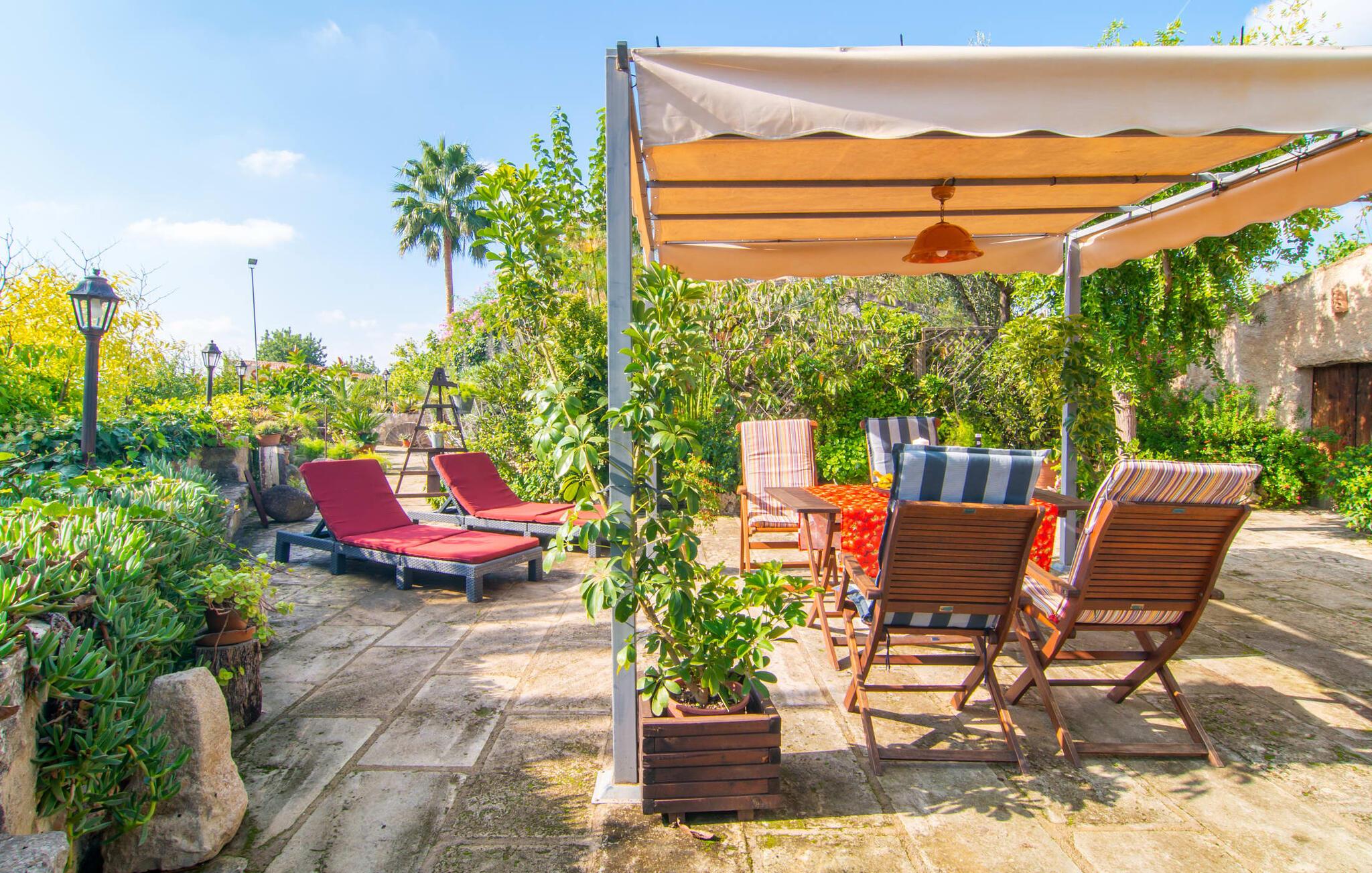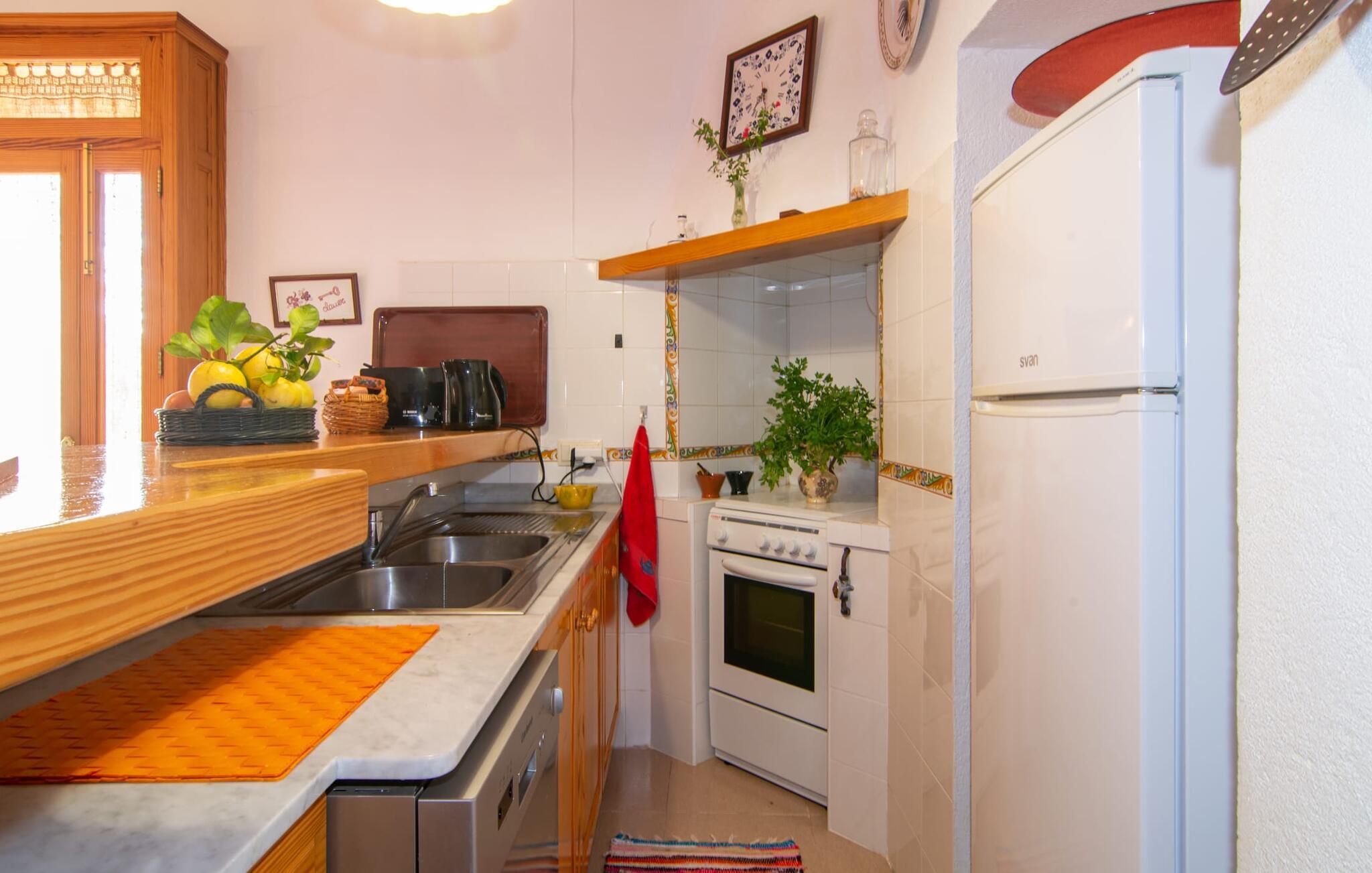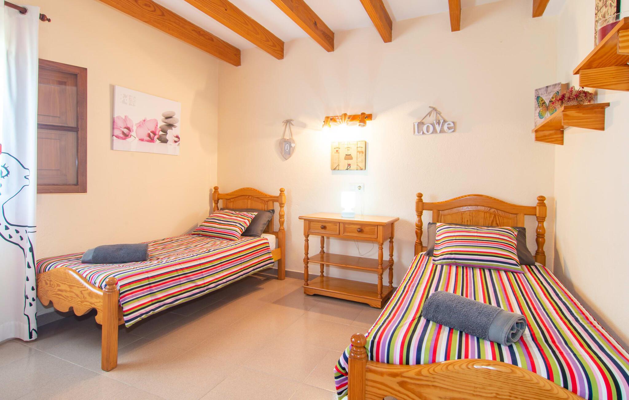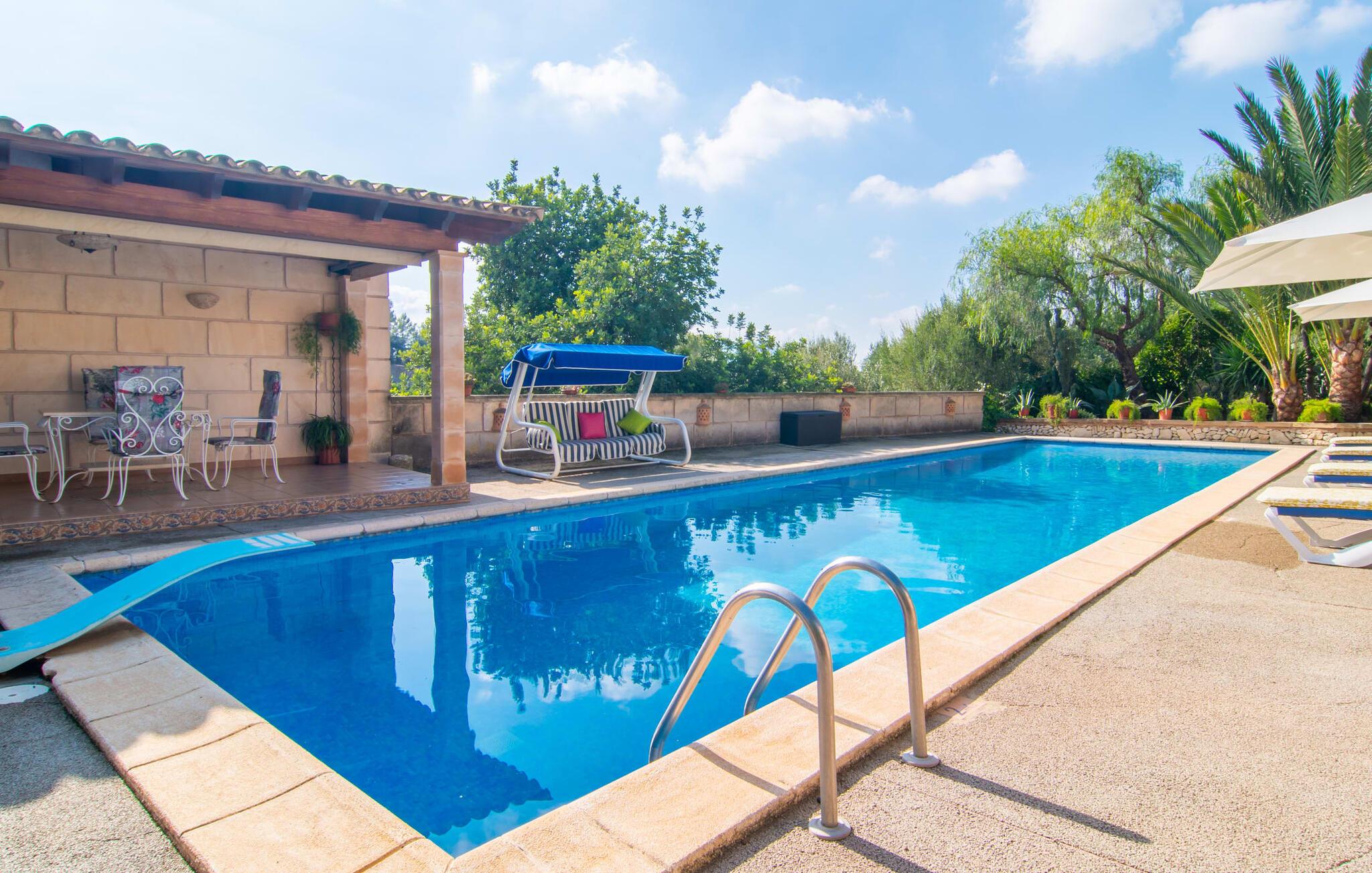 Muntert indbydende og usædvanligt hyggeligt - det beskriver villaen "Sabor de Cas Ferrer" meget godt. Takket være de farverige og kærligt udvalgte detaljer kombineret med fortryllende grønt rundt omkring, skinner det lille, blankpudsede hus med en helt speciel glans. Udearealet er perfekt til vandelskere, da den vidunderligt glitrende pool med sin imponerende længde på 16 m ikke kun byder på forfriskende afkøling på varme dage, men også mulighed for at svømme et par længder. For en velfortjent pause efter svømning kan I finde jer tilpas på en liggestol eller den store verandagynge. Og når det er tid til middag, kan I gå direkte til den smukke, overdækkede spiseplads. Nu skal I bare fyre op i grillen og begynde at tilberede jeres kulinariske delikatesser. Et godt glas vin, selskab med jeres kære - det er alt hvad I behøver for en perfekt aften! Det indre af villaen er lige så hyggeligt. Kærligt indrettet og fuld af farverige små detaljer, den fælles opholds- og spisestue med åbent køkken inviterer jer til at blive hængende. Lige meget om I tilbereder et lækkert måltid med jeres familie i det veludstyrede køkken eller døser i sofaen, mens de andre sludrer livligt i den store spiseplads. Takket være de korte afstande kan jeres familie hurtigt samles – præcis som de skal på ferie. Og hvis I har brug for lidt privatliv, kan I trygt trække jer tilbage til et af de smukke soveværelser. Også her skaber lyst træ og en rustik stemning den ultimative behagelig atmosfære. I kan putte jer i puderne, nyde den vidunderlige ro i de landlige omgivelser og slumre til næste morgen. De to badeværelser i rustik, typisk middelhavsstil inviterer jer til at tage et forfriskende brusebad. Villaens smukke, landlige beliggenhed vil helt sikkert appellere til ivrige vandrere og vandrere. Små opdagelsesture eller lange vandreture vil helt sikkert have nogle overraskelser i vente. Efter blot 3 km gåtur når I den lille by Montuiri, som ikke kun byder på en historisk interessant bymidte inklusive et arkæologisk museum, men også udstråler den fortryllende flair af en typisk mallorcinsk by. Men storbyfølelsen tager ikke lang tid at nå frem, for I kan nå øens hovedstad Palma de Mallorca på en halv time via landevejen. Her kan I finde stort set alt hvad hjertet begærer. Måske en tur dertil kan kombineres med et par afslappende timer på stranden? Platja de Palma eller Es Penyo er næsten på vej. Det er værd at pakke badetøjet og en lille picnic og efter en livlig spadseretur gennem byen, slappe af i sandet og lytte til havets brusen. Den fortryllende villa "Sabor de Cas Ferrer" har en fantastisk, idyllisk beliggenhed på en smukt anlagt ejendom i centrum af den baleariske ø. Den nærliggende by Montuiri ligger kun 3,5 km væk. Her finder I en hæveautomat, et ugentligt marked og nogle små butikker. Supermarkedet ligger også kun 4,7 km væk. Til svømmeture skal I kun køre 26 eller 28 km til smukke sandstrande som Platja de Palma eller Es Plenyo.