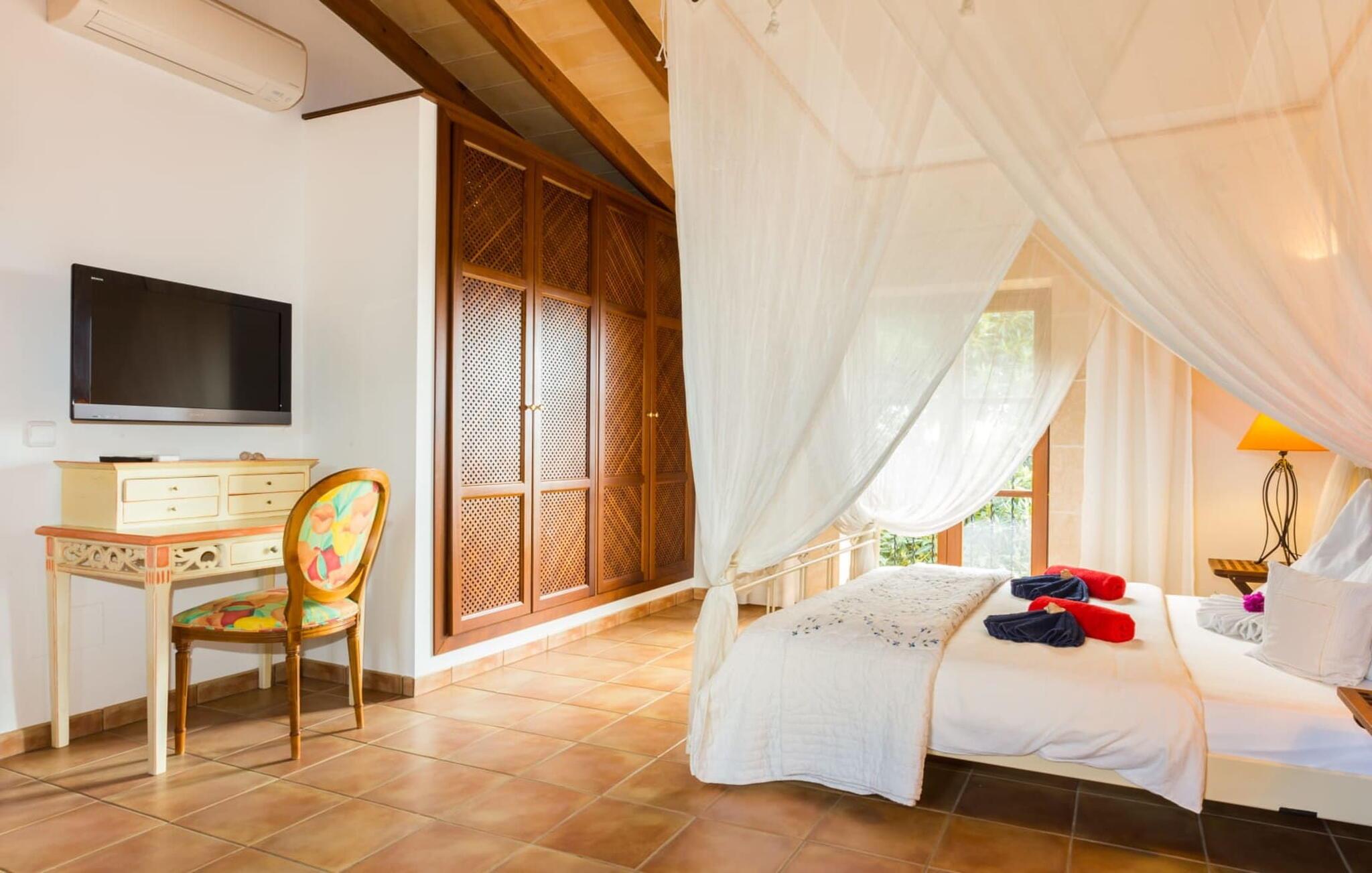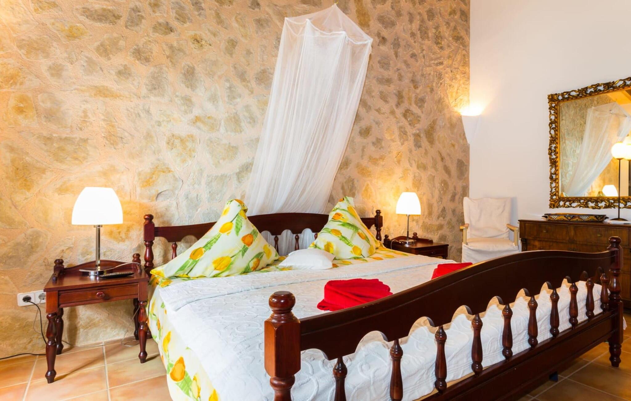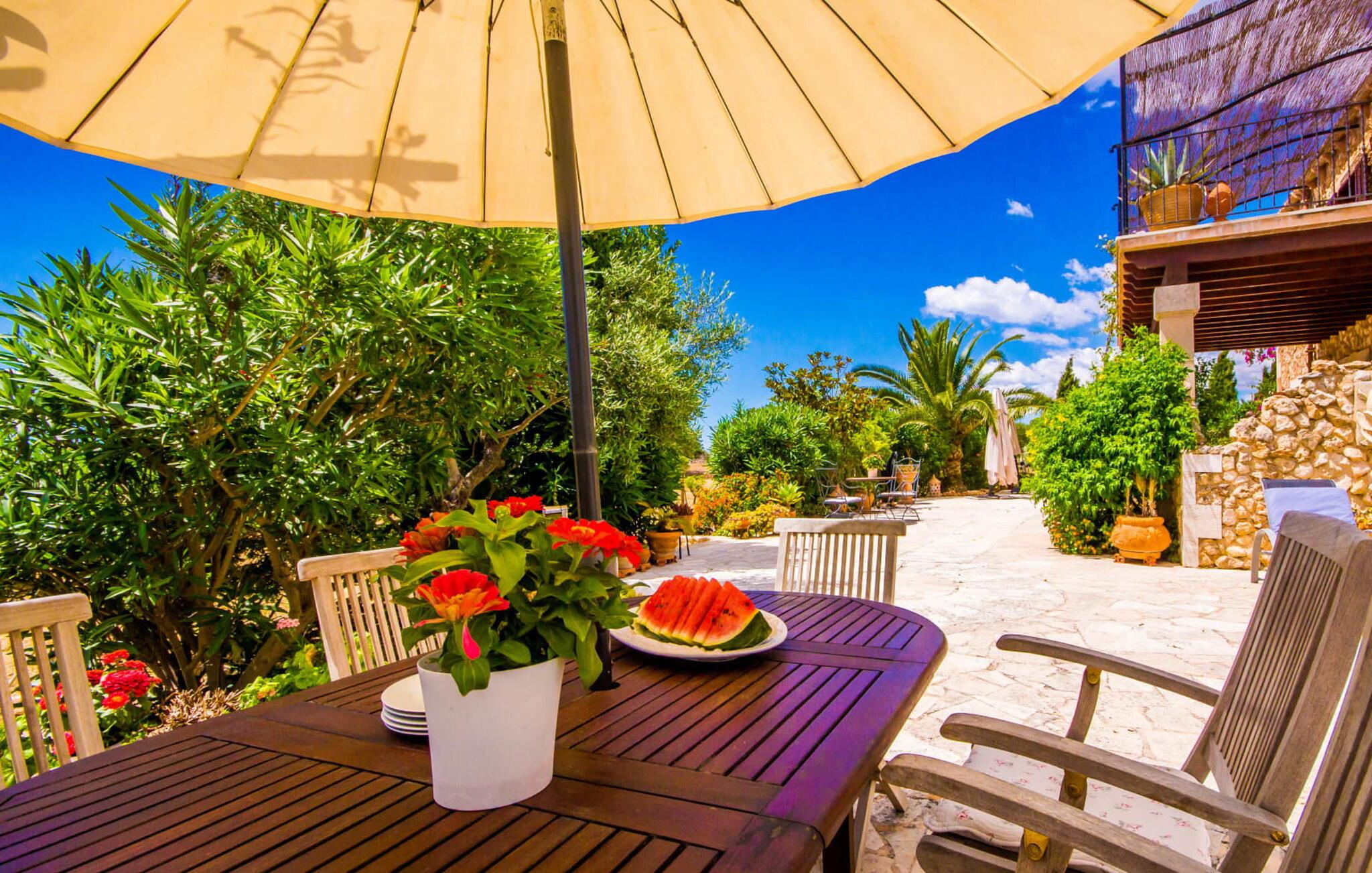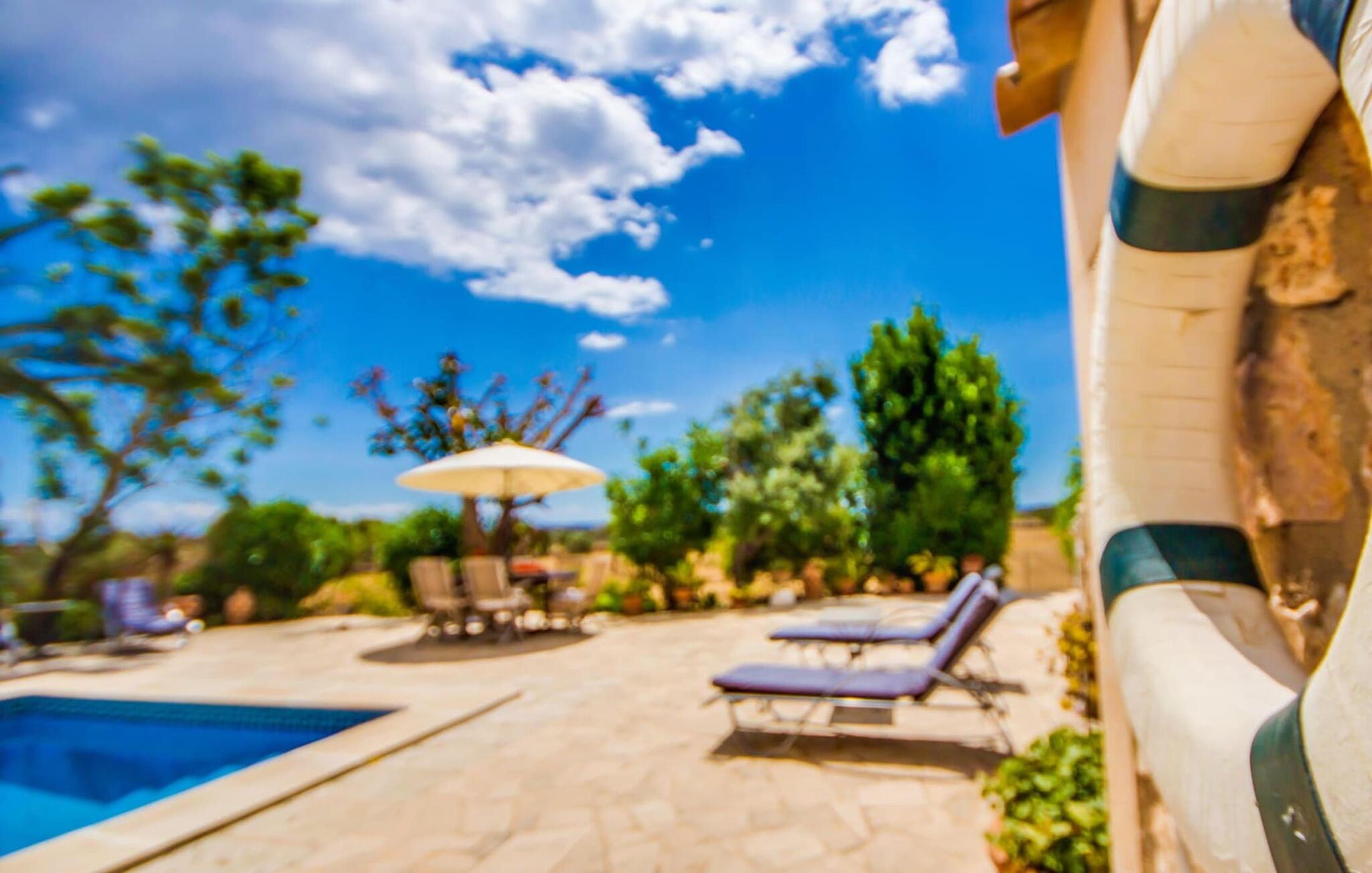 Den betagende finca "Salida del Sol" er designet i stil med en mallorcansk herregård og byder på møbler af høj kvalitet i rolige omgivelser. Ejendommen er omgivet af smukt anlagte middelhavshaver og byder på rolige steder at slappe af, herunder en charmerende trægynge. Poolen, med indgang i græsk stil og mosaikdesign, suppleres af en naturstenterrasse udstyret med komfortable liggestole, panoramaudsigt over havet og delvis skygge. Nyd aftenen og lav en lækker grillmad med udsigt over havet. Indvendigt har villaen et rummeligt interiør med håndlavede fliser og fint teaktræ. Hovedsalen har pejs, selvom centralvarme og aircondition sørger for komfort hele året rundt. Opholdsstuen støder op til et moderne, fuldt udstyret køkken. Villaen består af fire generøse soveværelser, hver med en fantastisk havudsigt og adgang til terrasser. Med fire stilfulde badeværelser, heraf to en-suite, kombinerer ejendommen moderne komfort med fokus på afslapning. "Salida del Sol" byder på fred, smukke omgivelser og et strejf af middelhavskultur. Den yderst eksklusive finca "Salida del Sol" ligger på en blid bjergskråning mellem Son Carrio og kysten og byder på en vidunderlig udsigt over havet. På trods af den meget rolige beliggenhed er de omkringliggende landsbyer med velassorterede butikker og supermarkeder nemme at nå. Oplev søndagsmarkedet i kystbyen Porto Cristo. Sandstrandene på østkysten, herunder nogle fantastiske naturlige strande, er kun en kort køretur væk. Fire kendte golfbaner ligger kun få minutter væk i bil.