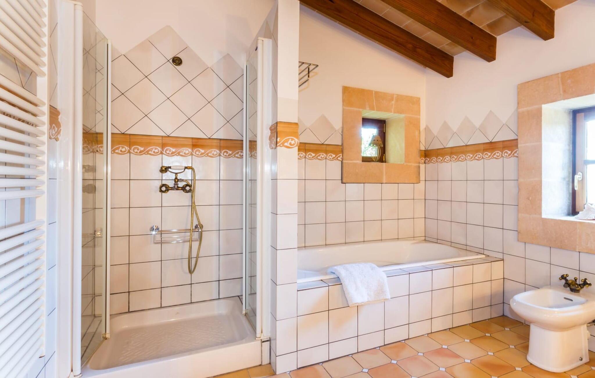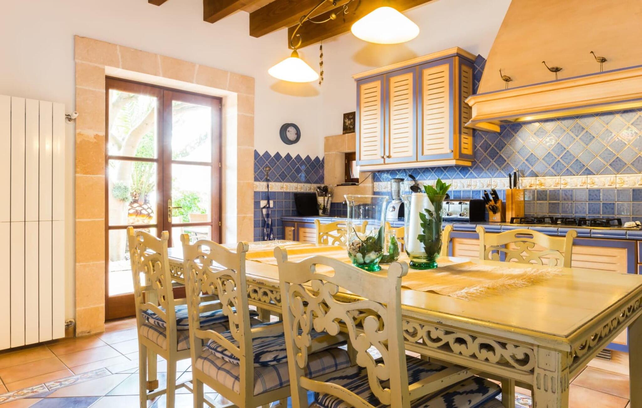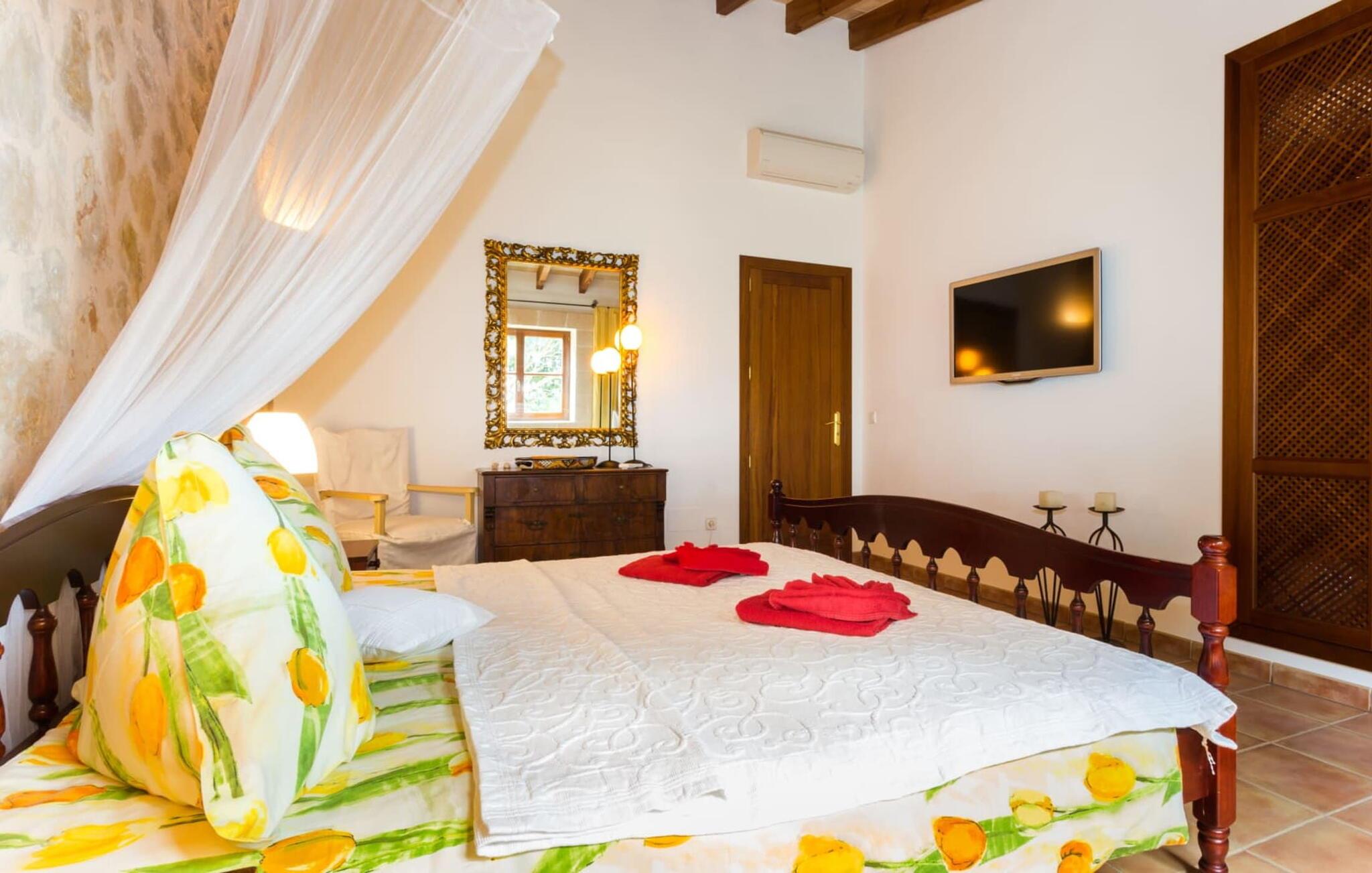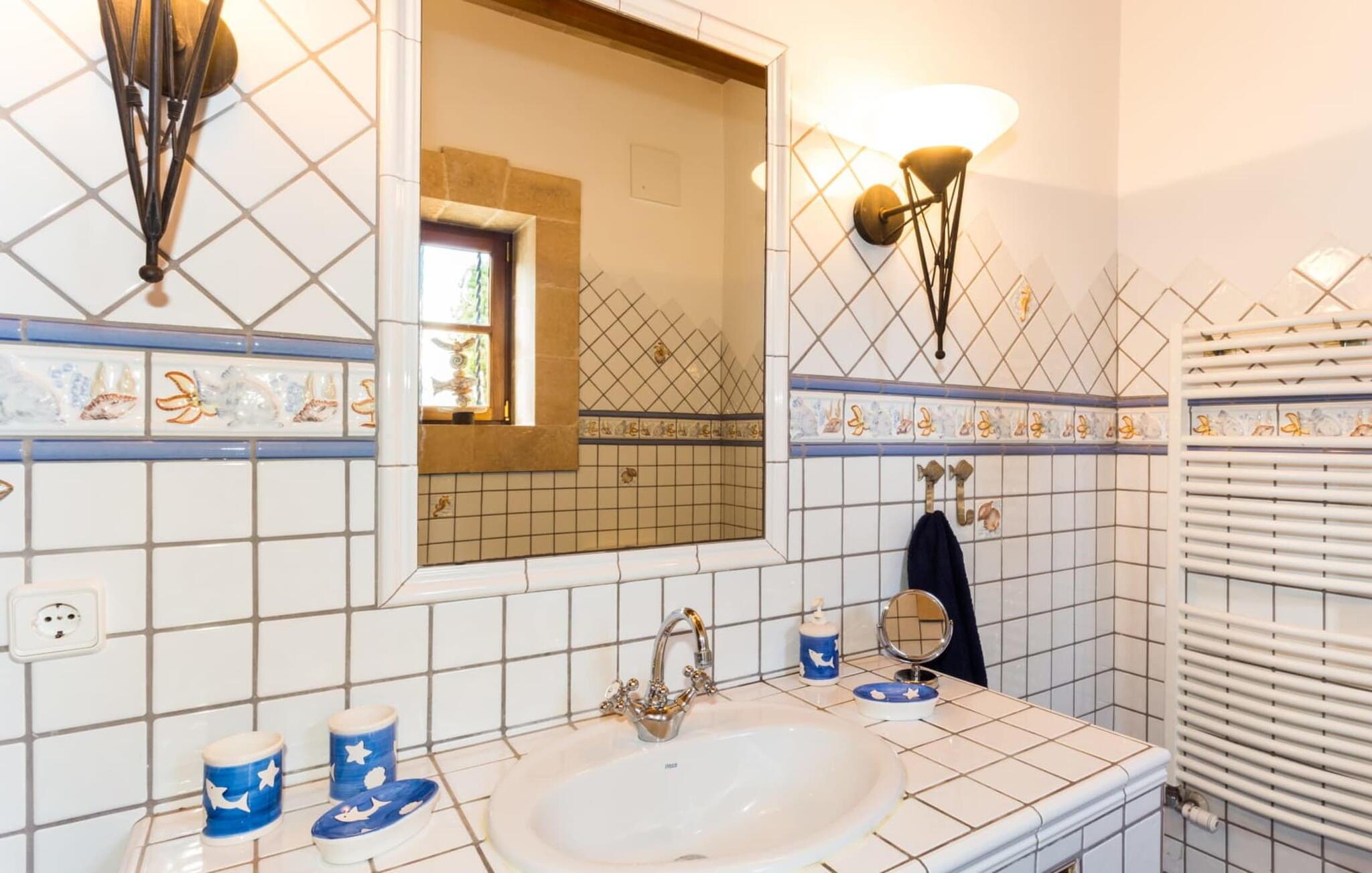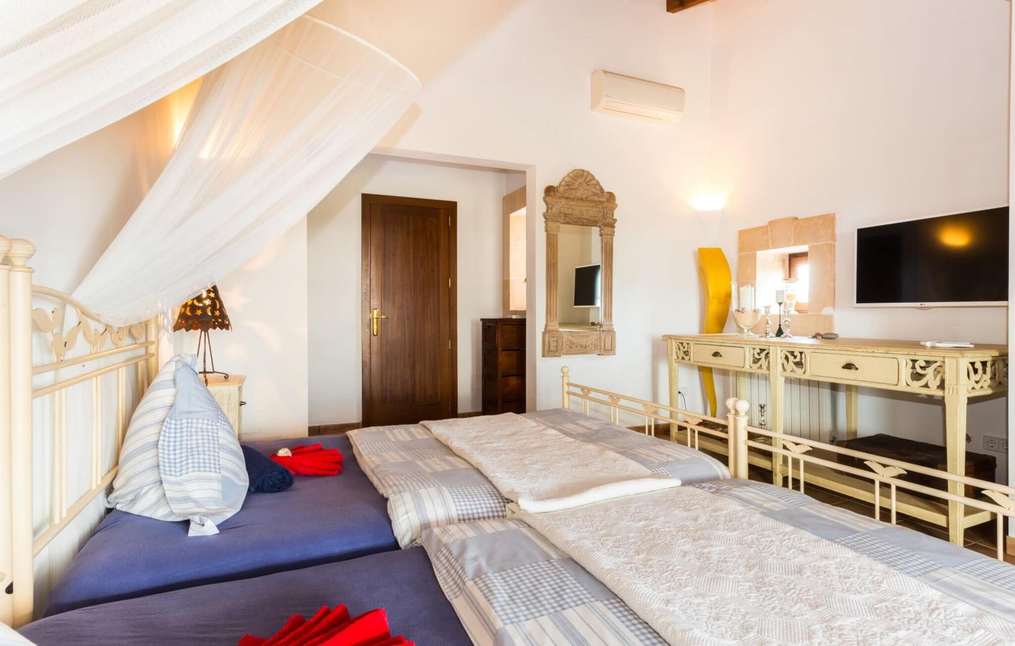 Den betagende finca "Salida del Sol" er designet i stil med en mallorcansk herregård og byder på møbler af høj kvalitet i rolige omgivelser. Ejendommen er omgivet af smukt anlagte middelhavshaver og byder på rolige steder at slappe af, herunder en charmerende trægynge. Poolen, med indgang i græsk stil og mosaikdesign, suppleres af en naturstenterrasse udstyret med komfortable liggestole, panoramaudsigt over havet og delvis skygge. Nyd aftenen og lav en lækker grillmad med udsigt over havet. Indvendigt har villaen et rummeligt interiør med håndlavede fliser og fint teaktræ. Hovedsalen har pejs, selvom centralvarme og aircondition sørger for komfort hele året rundt. Opholdsstuen støder op til et moderne, fuldt udstyret køkken. Villaen består af fire generøse soveværelser, hver med en fantastisk havudsigt og adgang til terrasser. Med fire stilfulde badeværelser, heraf to en-suite, kombinerer ejendommen moderne komfort med fokus på afslapning. "Salida del Sol" byder på fred, smukke omgivelser og et strejf af middelhavskultur. Den yderst eksklusive finca "Salida del Sol" ligger på en blid bjergskråning mellem Son Carrio og kysten og byder på en vidunderlig udsigt over havet. På trods af den meget rolige beliggenhed er de omkringliggende landsbyer med velassorterede butikker og supermarkeder nemme at nå. Oplev søndagsmarkedet i kystbyen Porto Cristo. Sandstrandene på østkysten, herunder nogle fantastiske naturlige strande, er kun en kort køretur væk. Fire kendte golfbaner ligger kun få minutter væk i bil.