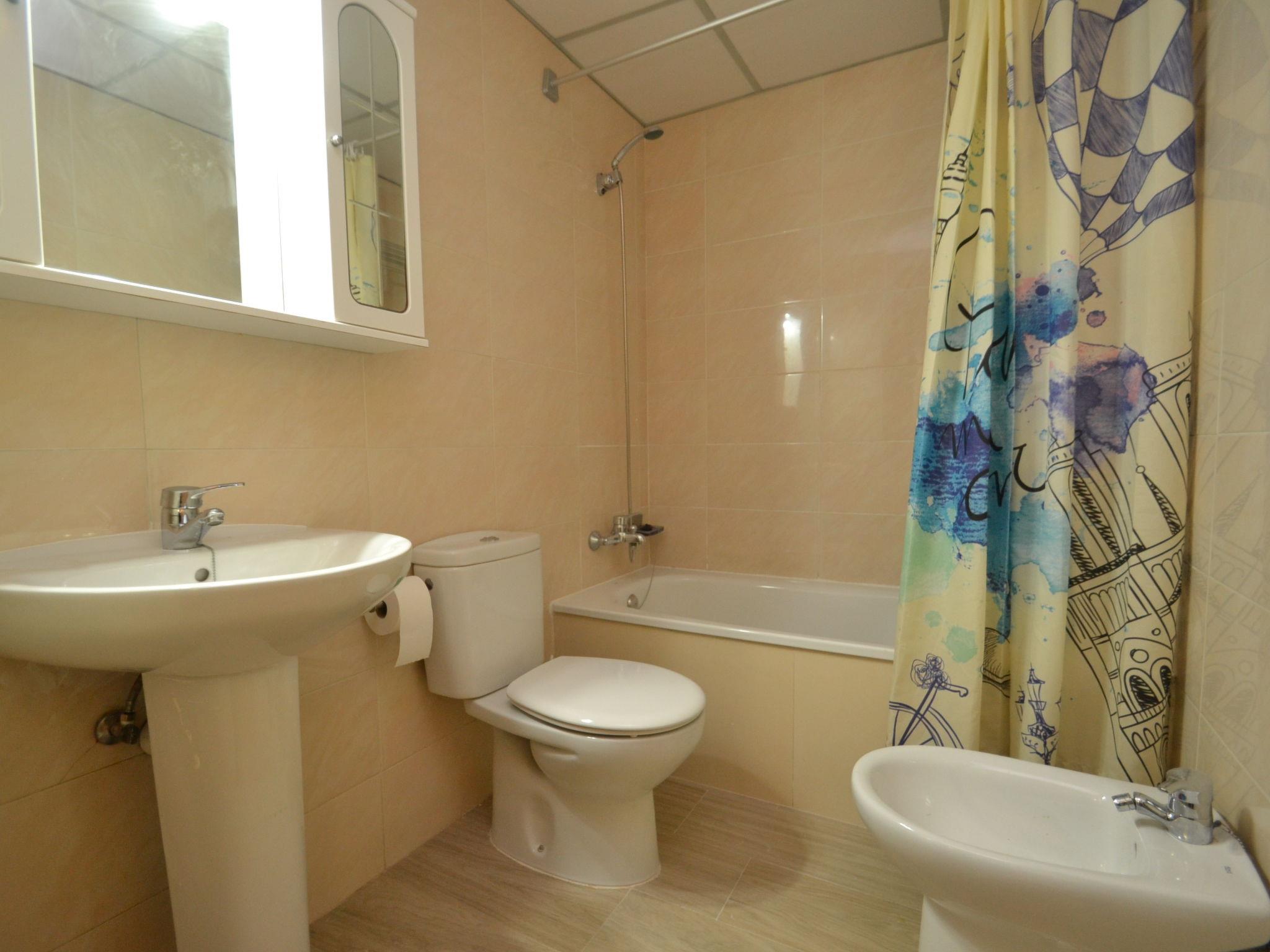 "Catalunya 7", 3-room apartment 50 m2 on 1st floor. Simple and practical furnishings: living/dining room with sliding door with 1 sofabed (130 cm, length 190 cm), digital TV and fan. Exit to the terrace. 1 room with 2 beds (90 cm, length 190 cm). Exit to the terrace. 1 room with 1 x 2 bunk beds (90 cm, length 190 cm). Exit to the terrace. Open kitchen (oven, 4 ceramic glass hob hotplates, toaster, kettle, microwave). Bath/WC. No heating option. Terrace 30 m2. Terrace furniture. Facilities: washing machine, iron, hair dryer. HUTT-006405 // Reg. Nr.: ESFCTU00004302400041221700000000000000000HUTT-0064051