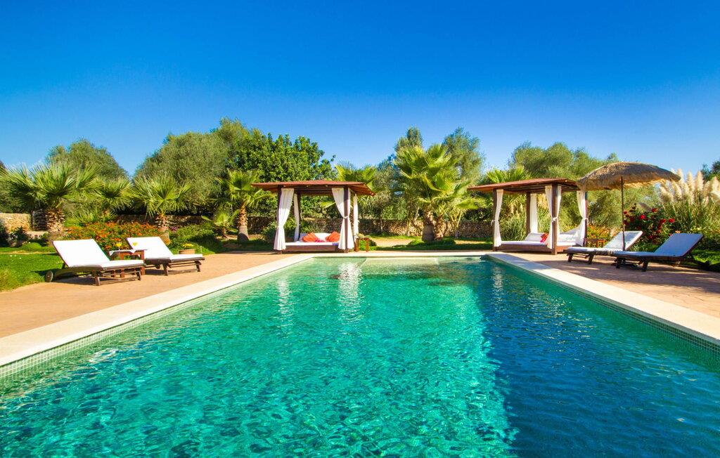 Denne fantastiske villa "Salva" i det sydlige Mallorca er en sand blanding af traditionel charme og moderne komfort. Beliggende i en 1.500 m² stor have designet som en park, tilbyder det et roligt tilflugtssted med masser af plads til at slappe af under modne træer. Fokus er på den store, højdejusterbare pool, omgivet af en rummelig terrasse med højkvalitets liggestole og to balinesiske senge, perfekt til at slappe af med en bog og en drink. Flere terrasser, herunder en tagterrasse, byder på idylliske steder at nyde de rolige omgivelser. Villaens elegante naturstensfacade smelter problemfrit ind i det mallorcanske landskab og bidrager til dens tidløse charme. Indvendigt kombinerer villaen traditionelle og moderne elementer for at skabe en hjemlig, indbydende atmosfære. Det byder på masser af boligareal og har tre hyggelige soveværelser, hver med aircondition og to badeværelser. Et soveværelse i åbent plan i atriumstil har et uigennemsigtigt gardin i stedet for en dør. Den åbne planløsning og spisestue og et moderne, fuldt udstyret køkken sikrer et behageligt ophold med alt hvad I behøver for den perfekte ferie med selvforplejning. Denne stenvilla ligger i en eventyrlig beliggenhed ikke langt fra de betagende strande i Es Trenc med dens strandbarer og Es Caragol. Huset har en virkelig idyllisk, typisk mallorcansk beliggenhed og er perfekt til dem, der leder efter en salig oplevelse. Der er indkøbsmuligheder i Porreres og Campos. I begge byer finder I store supermarkeder samt nogle fremragende restauranter. Det ugentlige marked i Porreres, som finder sted hver tirsdag morgen (ca. 6 km væk), er bestemt et besøg værd.