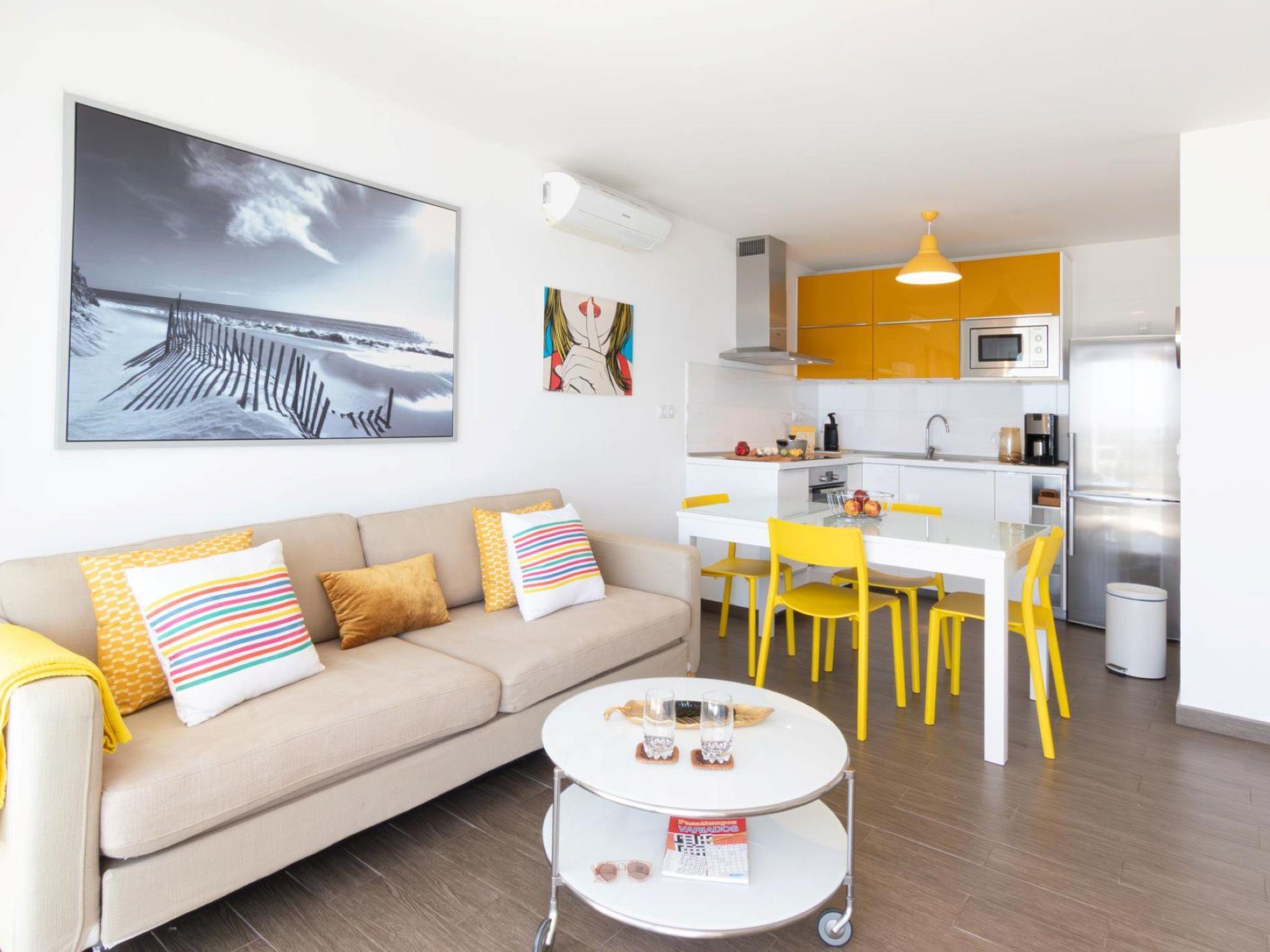 "Nueva Suecia 515", 3-room apartment. Object suitable for 4 adults. Very practical and cosy furnishings: living/dining room with TV, flat screen and air conditioning. Exit to the terrace. 1 room with 1 double bed (150 cm, length 200 cm). 1 room with 2 beds (90 cm, length 190 cm). Open kitchen (oven, dishwasher, 4 ceramic glass hob hotplates, toaster, kettle, microwave, freezer, electric coffee machine) with dining table. Shower/WC. Parquet floors. Porch. Terrace furniture. Very beautiful panoramic view of the sea. Facilities: washing machine, dryer, children's high chair, baby cot for up to 2 year olds, hair dryer. Internet (WiFi). Please note: non-smokers only. 2024-T21634