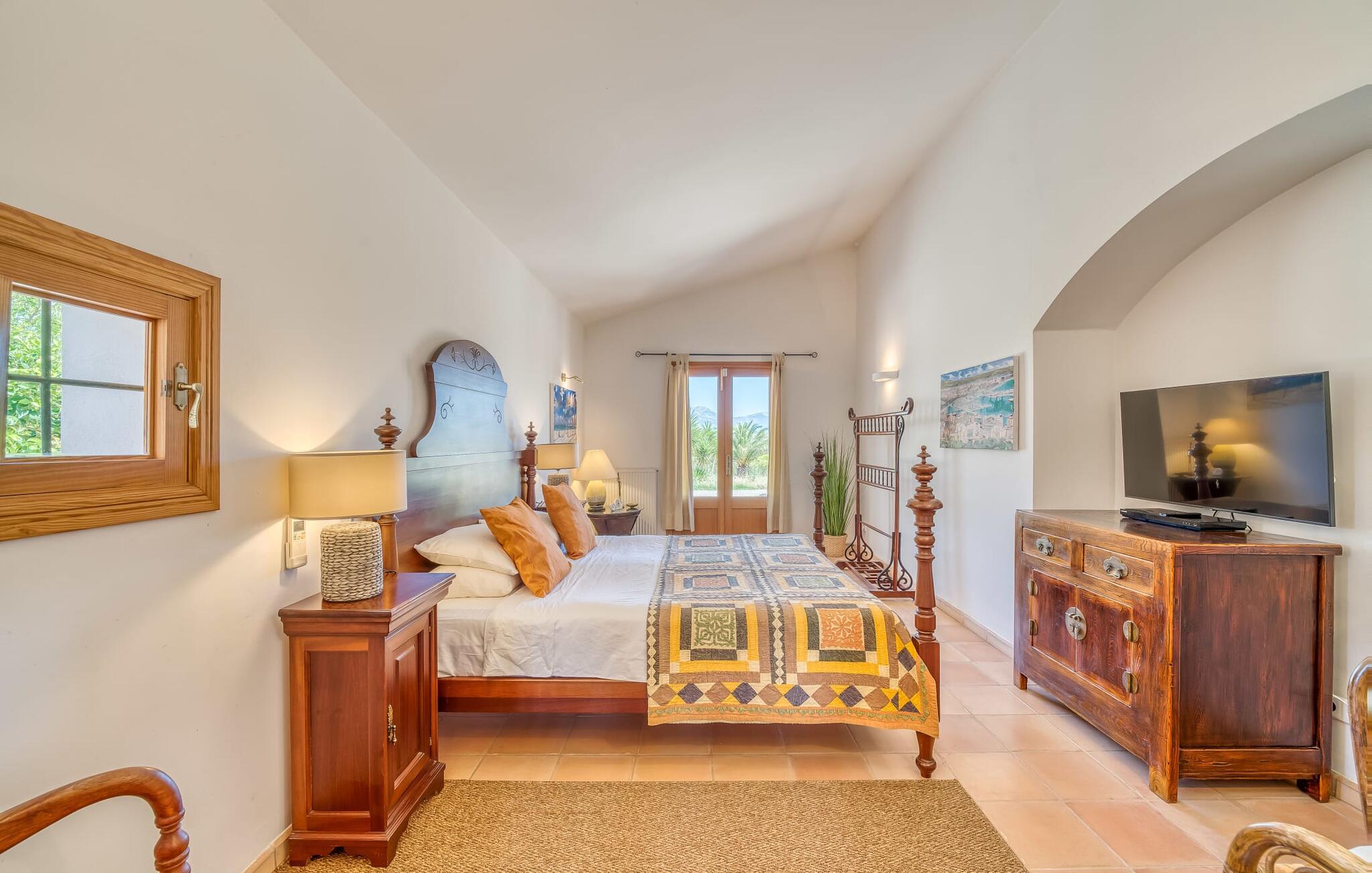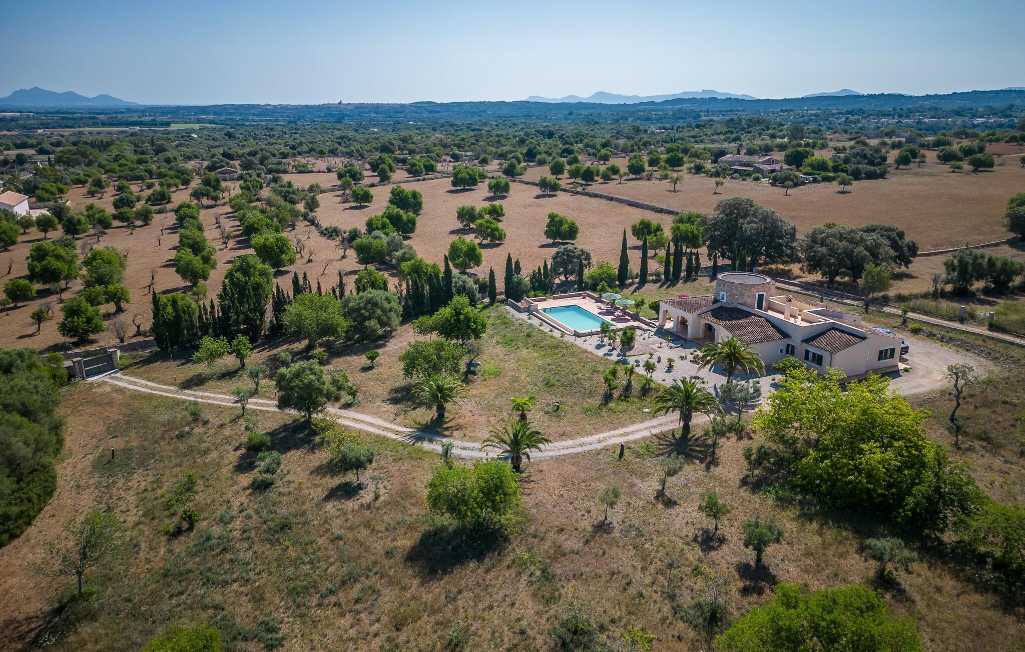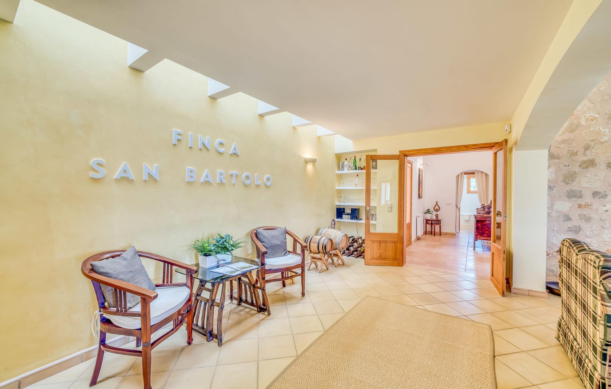 Det arkitektonisk enestående feriehus "San Bartolo" ligger i et landligt område i centrum af Mallorca. Dets udendørs område imponerer med en stor, lavvandet infinity-pool og en indbydende solterrasse, omgivet af en lav naturstensmur. Den komfortabelt indrettede, overdækkede terrasse på huset er udstyret med en smuk udendørs spiseplads og en mobil gasgrill. Terrassen er forbundet med husets indre gennem flere glasdøre. Slap af her i skyggen, nyd den lette brise og en smuk udsigt over den velholdte middelhavshave. I baggrunden åbner udsigten sig over det idylliske landskab hele vejen til Tramuntana-bjergene. Det er lige stedet for uforglemmelige middage med levende lys på de lange, varme sommernætter, som Middelhavet er berømt for. Interiøret i det rummelige feriehus forkæler sine gæster med en attraktiv rumindretning, der giver plads til op til seks personer. Gulv-til-loft glasdøre giver det åbne hovedområde masser af naturligt lys. Møblerne af høj kvalitet og den smagfulde indretning skaber en behagelig atmosfære. Det rummelige køkken i landlig stil er fuldt udstyret og smukt indrettet med traditionelle elementer. De tre soveområder er individuelt designet og har alle aircondition. Der er også to badeværelser og et gæstetoilet. Den buede trappe i opholdsrummet fører til et meget smukt tårnværelse. Den er ideel til at læse eller arbejde uforstyrret på hjemmekontoret. Når I træder ind på den tilstødende tagterrasse, vil I blive overrasket over den vidunderlige udsigt over middelhavslandskabet. Det er meget muligt, at I forlader "San Bartolo" og slutter jer til den lange liste af gæster, som vil tage smukke minder med sig fra deres ferie på Mallorca. Landstedet ligger 5 minutters kørsel fra Lllubí i hjertet af Mallorca. Stedet byder på flere barer, restauranter og butikker til jeres daglige behov. Strandene i Playa de Muro og Can Picafort er 20-25 minutter væk i bil. Bemærk venligst, at denne ejendom ikke accepterer ungdomsgrupper eller polterabender. En ungdomsgruppe på denne ejendom består af personer under 30 år. Book ikke denne ejendom, hvis I er en ungdomsgruppe eller polterabend, da jeres reservation vil blive afvist, når den er booket, hvilket også kan være tilfældet ved ankomst til ejendommen eller under jeres ophold, og I vil ikke modtage en refusion.