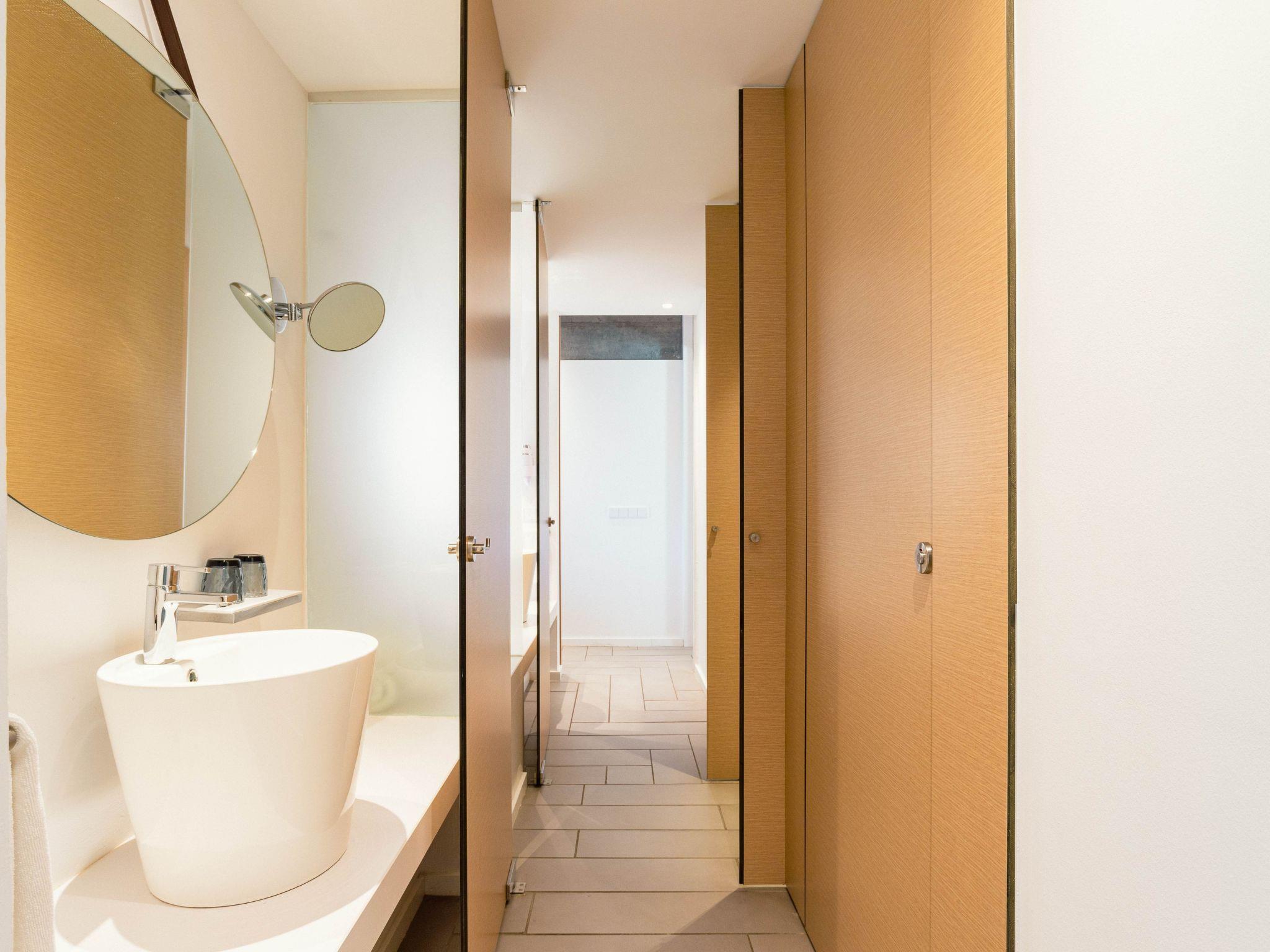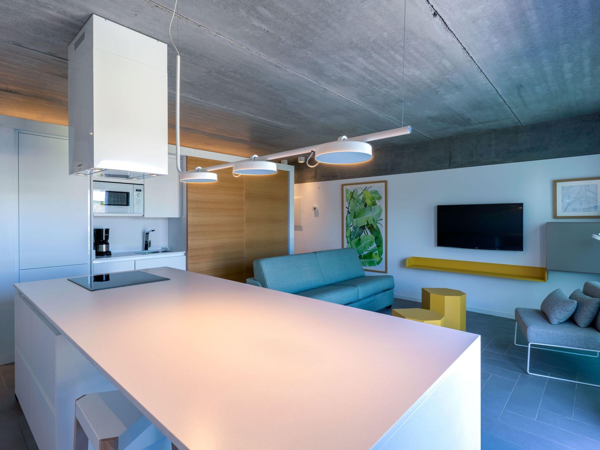 The terrace is equipped with a table, chairs, parasol, a colourful daybed and is surrounded by greenery, giving you the intimacy and privacy you are looking for. You can make use of the communal infinity pool which is located in the centre of the complex next to the square.