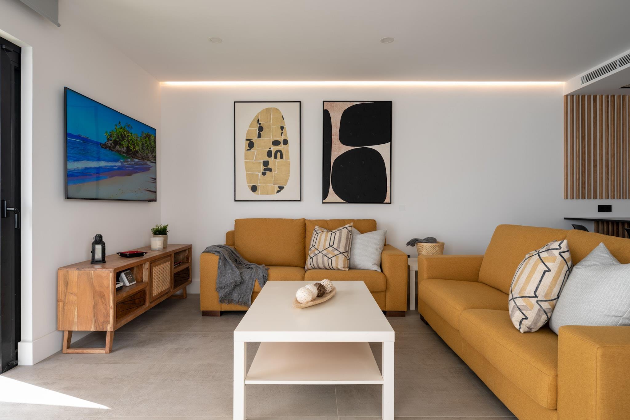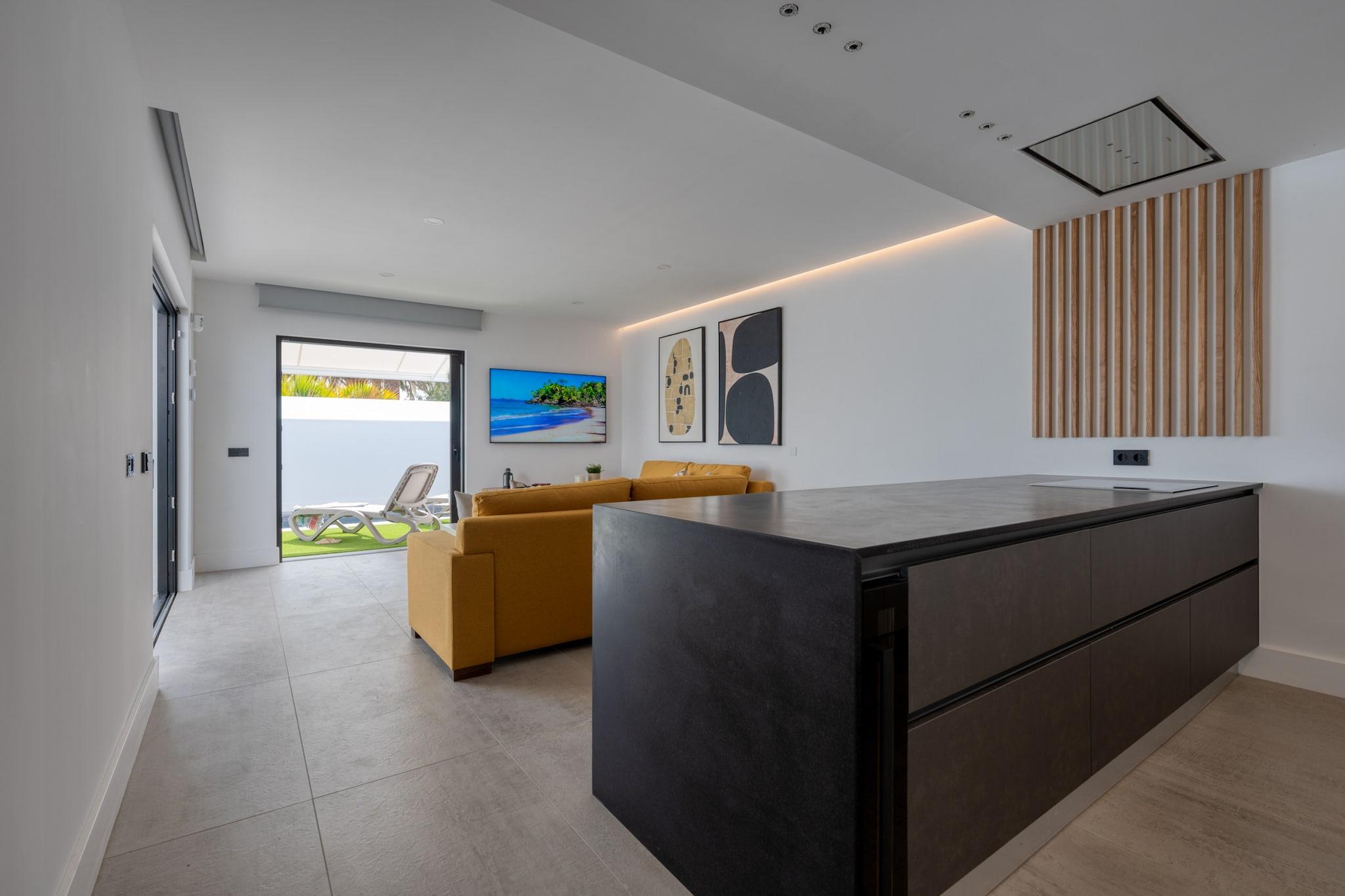 Denne fantastiske, nyligt renoverede hytte tilbyder det ultimative tilflugtssted for store familier eller grupper, der søger privatliv og ro på Gran Canaria. Med en rummelig planløsning omfatter ejendommen fem soveværelser, der kan rumme op til 13 gæster. Det store soveværelse har en king-size seng, mens de andre værelser tilbyder en blanding af enkelt- og dobbeltsenge, alle med aircondition og en-suite badeværelser. Stuen er udstyret med komfortable sofaer og et 65" smart-tv med internationale kanaler. Gæsterne kan nyde den store opvarmede pool, udendørs siddepladser og et spillerum med pool, bordtennis, bordfodbold, et fitnesscenter og en legeplads. Kæledyr er tilladt efter anmodning mod et tillægsgebyr, og huset ligger i et fredeligt boligområde. Ejendommen er ideelt beliggende i Maspalomas, kun en kort køretur fra den berømte Maspalomas-strand og Playa del Inglés. Det er også tæt på lokale supermarkeder, restauranter og butikker. Med 2 minutters kørsel til det nærmeste supermarked og nem adgang til store attraktioner, kombinerer beliggenheden bekvemmelighed og sindsro. Ejendommen ligger kun 7 minutter i bil fra Maspalomas Strand, og tilbyder gæsterne en perfekt balance mellem afslapning og udforskning. Det fuldt udstyrede køkken omfatter elektrisk kogeplade, ovn, køleskab, blender, brødrister og både Nespresso- og filterkaffemaskiner. For ekstra bekvemmelighed er der et spisekammer med et stort køleskab, ekstra fryser i garagen og en rummelig terrasse med to udendørs spiseborde. Den store, opvarmede pool (valgfri service) sikrer, at gæsterne kan nyde solbadning året rundt.
