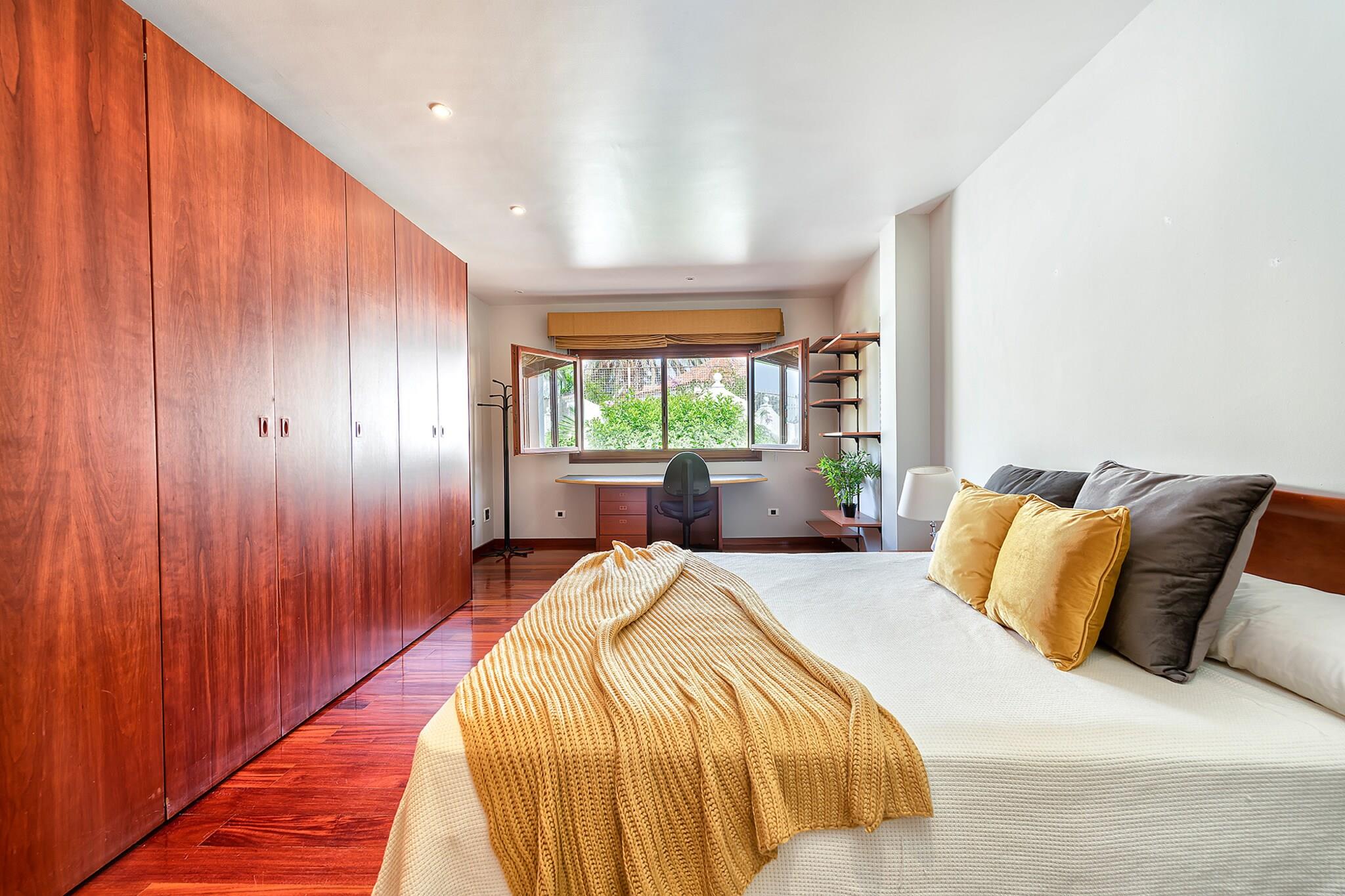 Denne charmerende bungalow tilbyder et roligt tilflugtssted i et fredeligt boligkompleks, komplet med en fælles pool og tennisbane. Ejendommen har et soveværelse med en dobbeltseng og loftsventilator samt en sovesofa i opholds-/spiseområdet, der kan rumme yderligere to gæster. Med højhastigheds-Wi-Fi, et smart-tv med internationale kanaler, aircondition i stuen og et fuldt udstyret køkken med opvaskemaskine og vaskemaskine giver denne bungalow et komfortabelt og moderne ophold. Den private terrasse med spiseplads og grill er ideel til udendørs måltider og afslapning. Det er også kæledyrsvenligt og tillader én hund mod et ekstra gebyr, hvilket gør det perfekt til familier eller små grupper. Beliggende i et roligt område, er bungalowen kun 200 meter fra et supermarked og restauranter, som tilbyder nem adgang til daglige fornødenheder. Et indkøbscenter, bowlingbane og ferieattraktioner som Holiday World ligger kun 600 meter væk. Golfentusiaster vil sætte pris på at være kun 950 meter fra den nærmeste golfbane. For strandelskere ligger den smukke Maspalomas-strand kun 3,5 km væk, og lufthavnen ligger 30 minutters kørsel fra ejendommen. Det omkringliggende område byder på et udvalg af restauranter, caféer og barer, der byder på masser af spise- og underholdningsmuligheder. Indvendigt er bungalowen designet med materialer i topkvalitet og store vinduer, der tillader masser af naturligt lys at fylde rummet. Køkkenet er fuldt udstyret, hvilket gør det nemt for gæsterne at tilberede måltider, når det passer dem.