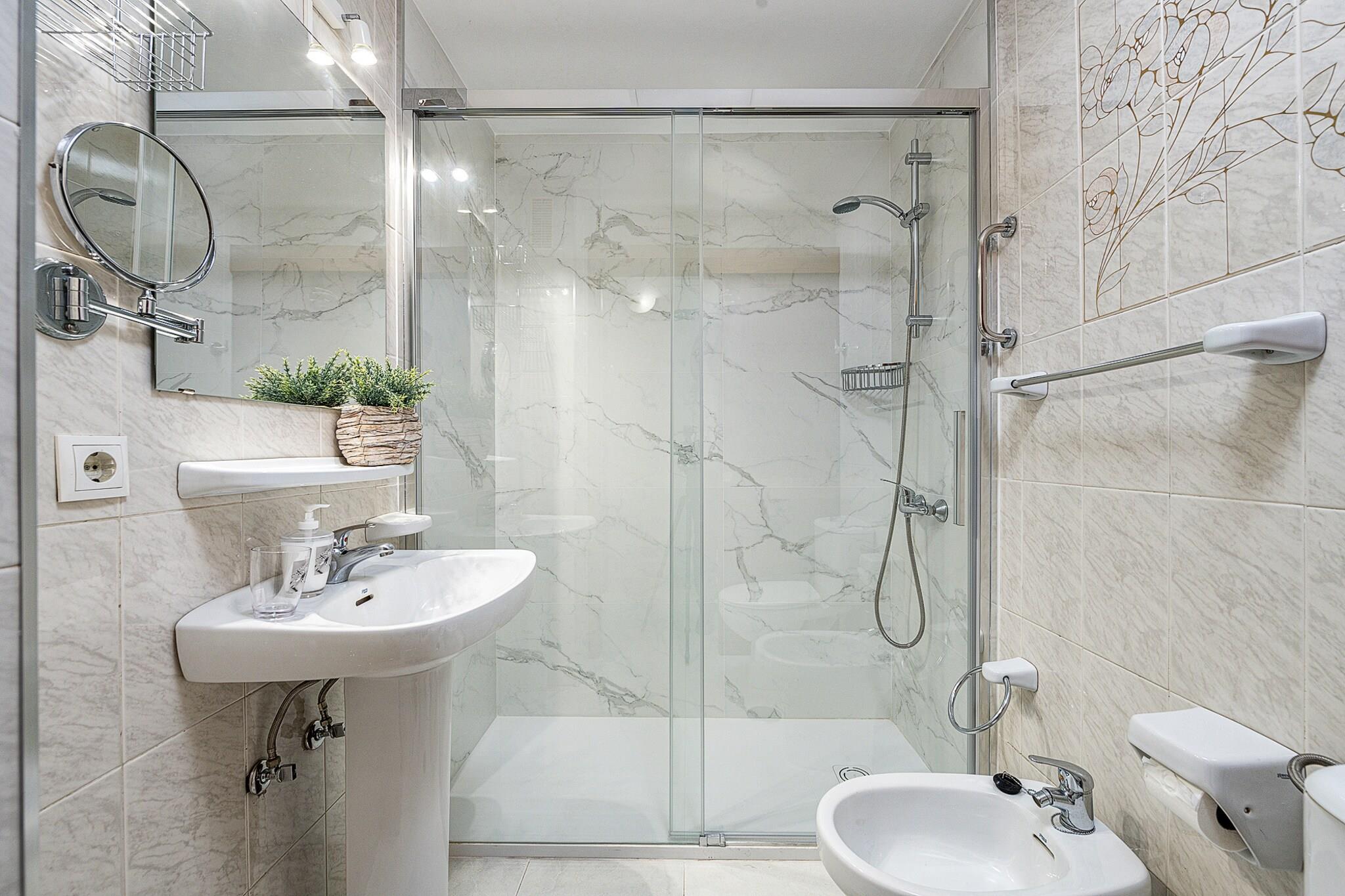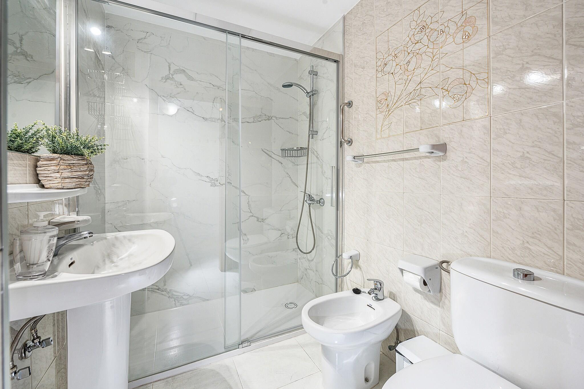 På 5. etage: (Stue(Fjernsyn(fladskærm, Smart-TV), spisebord, sofahjørne), åbent køkken(elkedel, brødrister, kaffemaskine, mikrobølgeovn, køle-fryseskab, Saftpresser, elektriske kogeplader, , Wine glasses), soveværelse(enkeltseng, enkeltseng), badeværelse(bruser, føntørrer)) Internetadgang, Havemøbler, solarium, vaskemaskine, swimmingpool(deles med andre gæster, udendørs), elevator, strygejern, ,