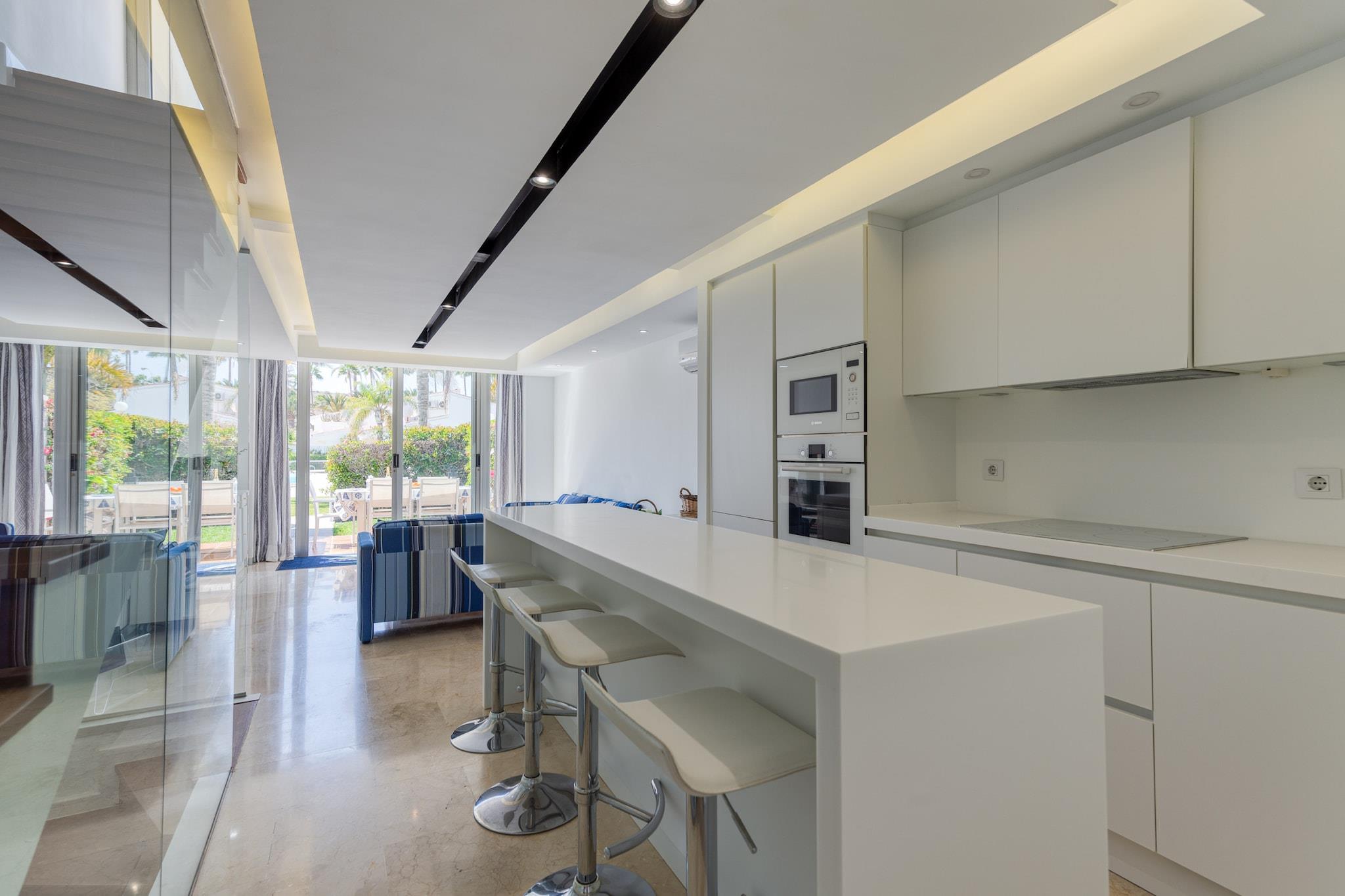 Dette charmerende feriehus tilbyder et behageligt ophold for familier eller små grupper, med kapacitet til at rumme op til 7 gæster. Boligen har tre gode soveværelser, heraf et med dobbeltseng og to med enkeltsenge. Opholdsstuen er udstyret med en sovesofa, hvilket sikrer god plads til alle. Ejendommen er kæledyrsvenlig og byder dine lodne ledsagere velkommen efter anmodning. Derudover inkluderer boligen en privat terrasse med direkte adgang til den fælles pool, hvilket skaber en problemfri indendørs-udendørs opholdsoplevelse. En barneseng og høj stol er tilgængelige efter anmodning, hvilket gør det til et ideelt valg for familier med små børn. Gæsterne vil også nyde højhastigheds-Wi-Fi, aircondition og nem adgang til en legeplads. Beliggende kun 250 meter fra stranden, er dette feriehus i umiddelbar nærhed af vigtige lokale attraktioner. Lystbådehavnen ligger kun 200 meter væk, og tilbyder et fredeligt miljø med nem adgang til vandbaserede aktiviteter. Et supermarked ligger bekvemt 200 meter fra ejendommen, mens restauranter og butikker ligger i kort afstand. Maspalomas-klitterne ligger 10 minutters kørsel derfra, og det livlige Meloneras-område ligger kun 5 minutter i bil, og byder på et væld af spise- og underholdningsmuligheder. Lufthavnen ligger 35,4 km derfra, hvilket sikrer hurtig transport til og fra ejendommen. Feriehuset har et fuldt udstyret køkken med moderne apparater, herunder en opvaskemaskine, hvilket sikrer nem tilberedning af måltider. Badeværelserne er udstyret med brusere, hvilket giver en forfriskende oplevelse efter en dag med udforskning. Et vaskerum tilføjer bekvemmelighed for længere ophold.