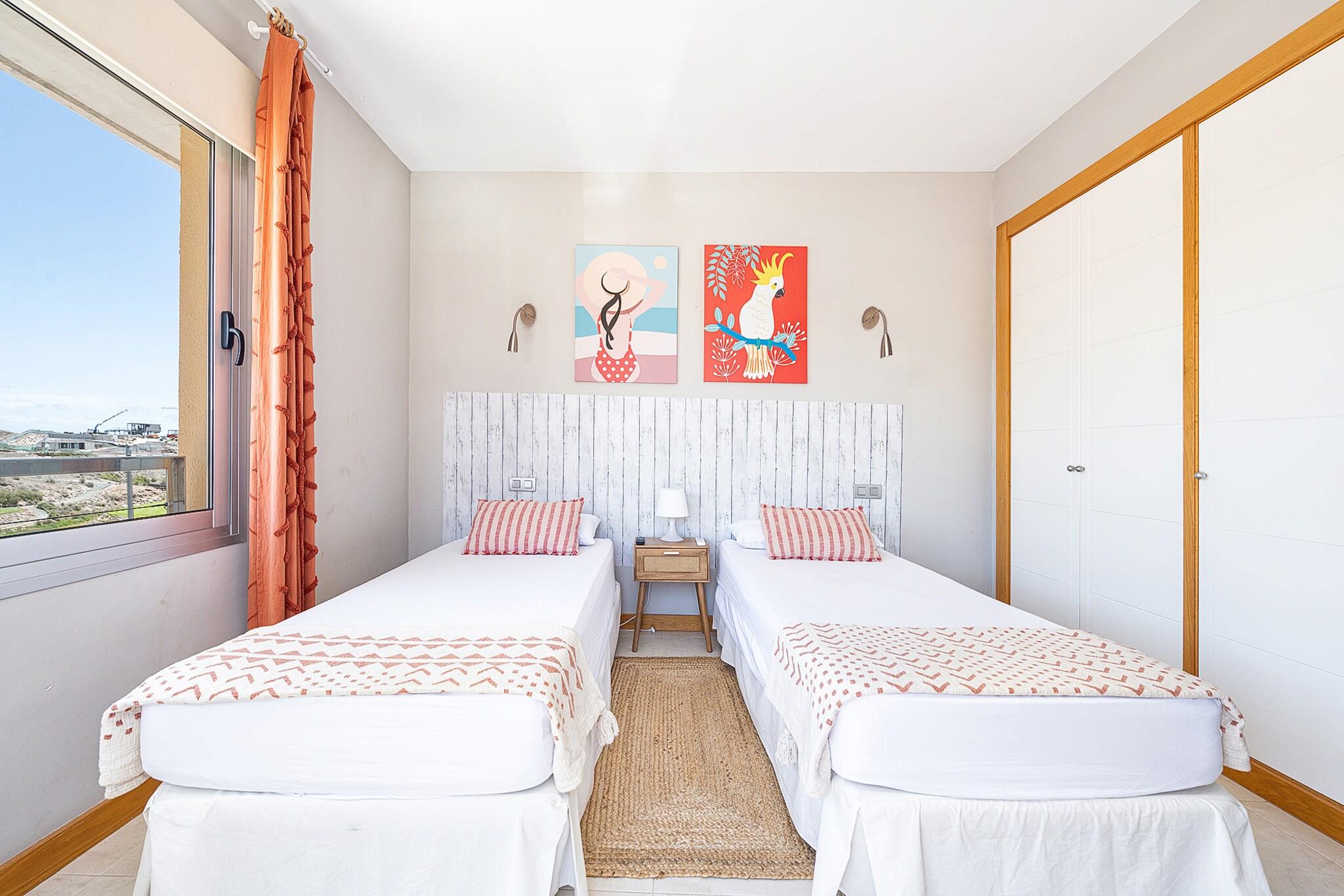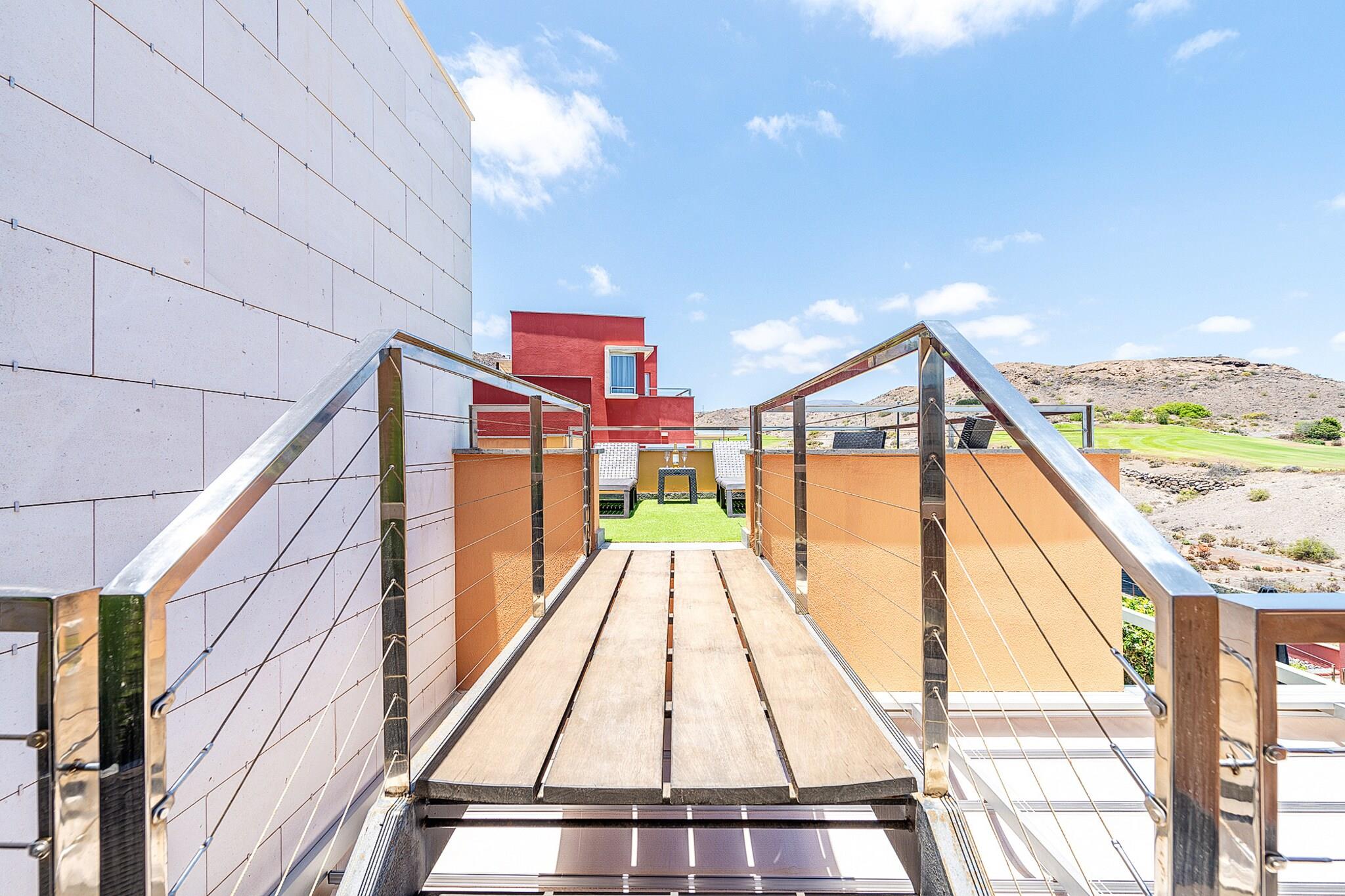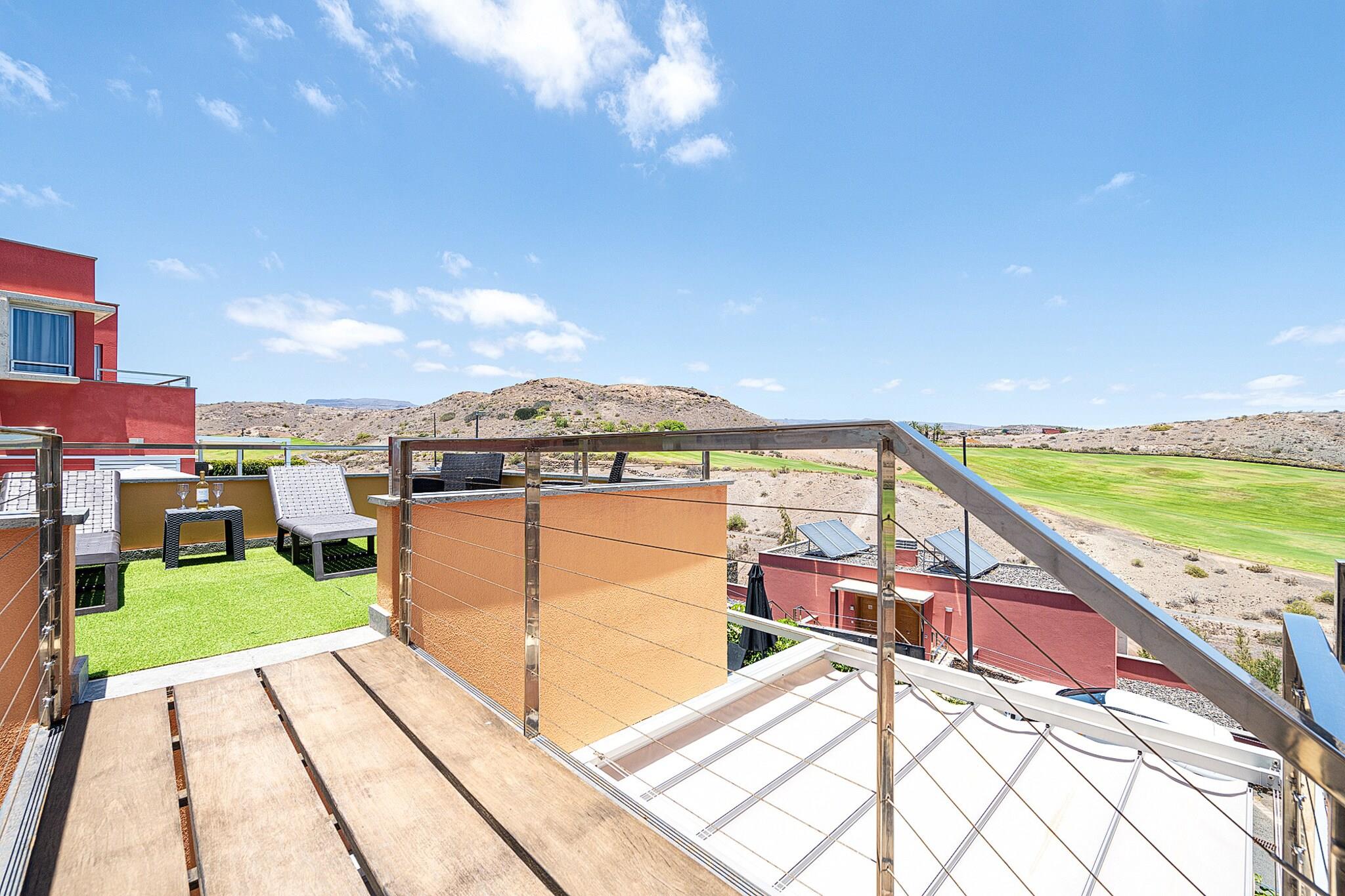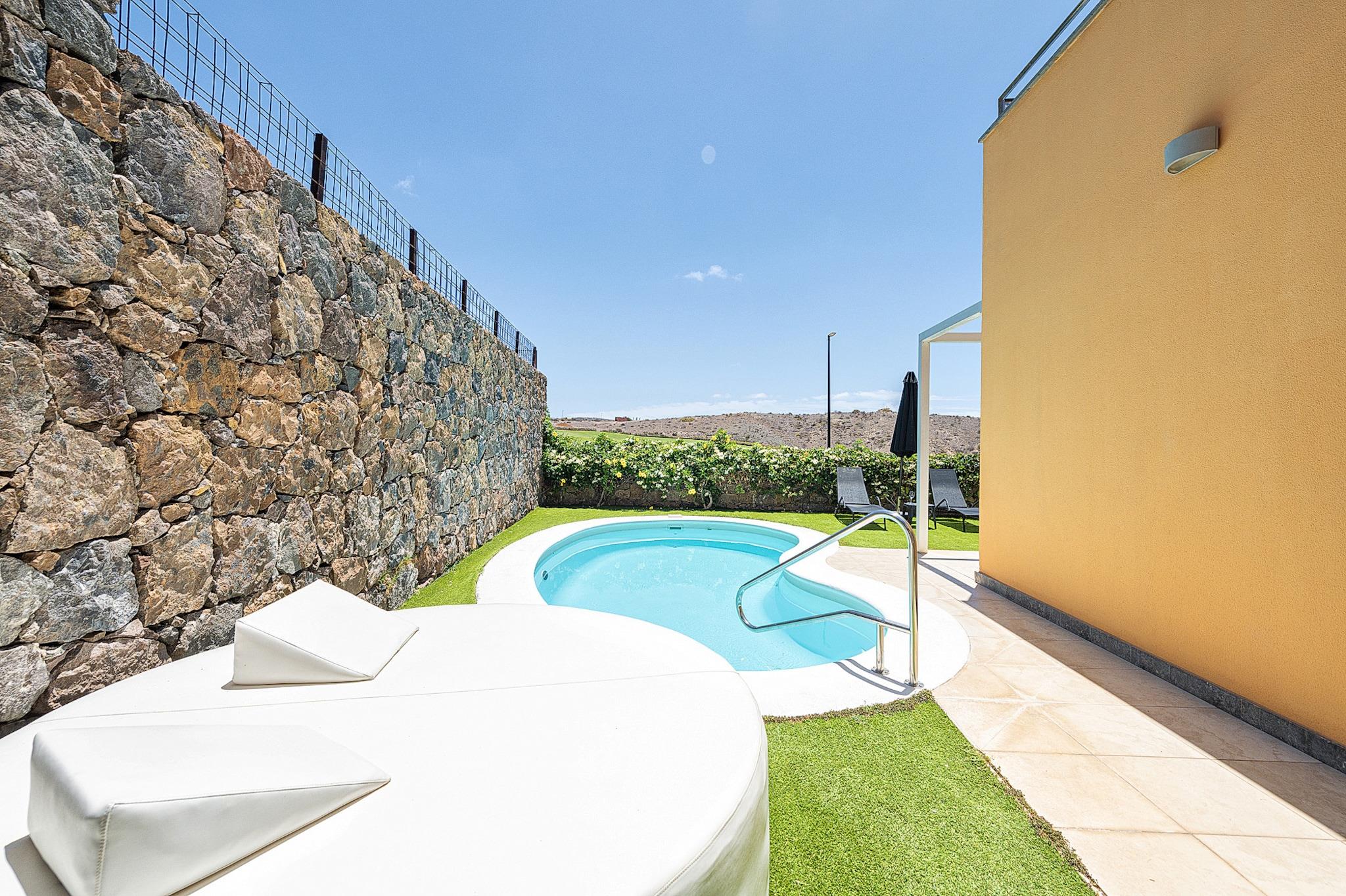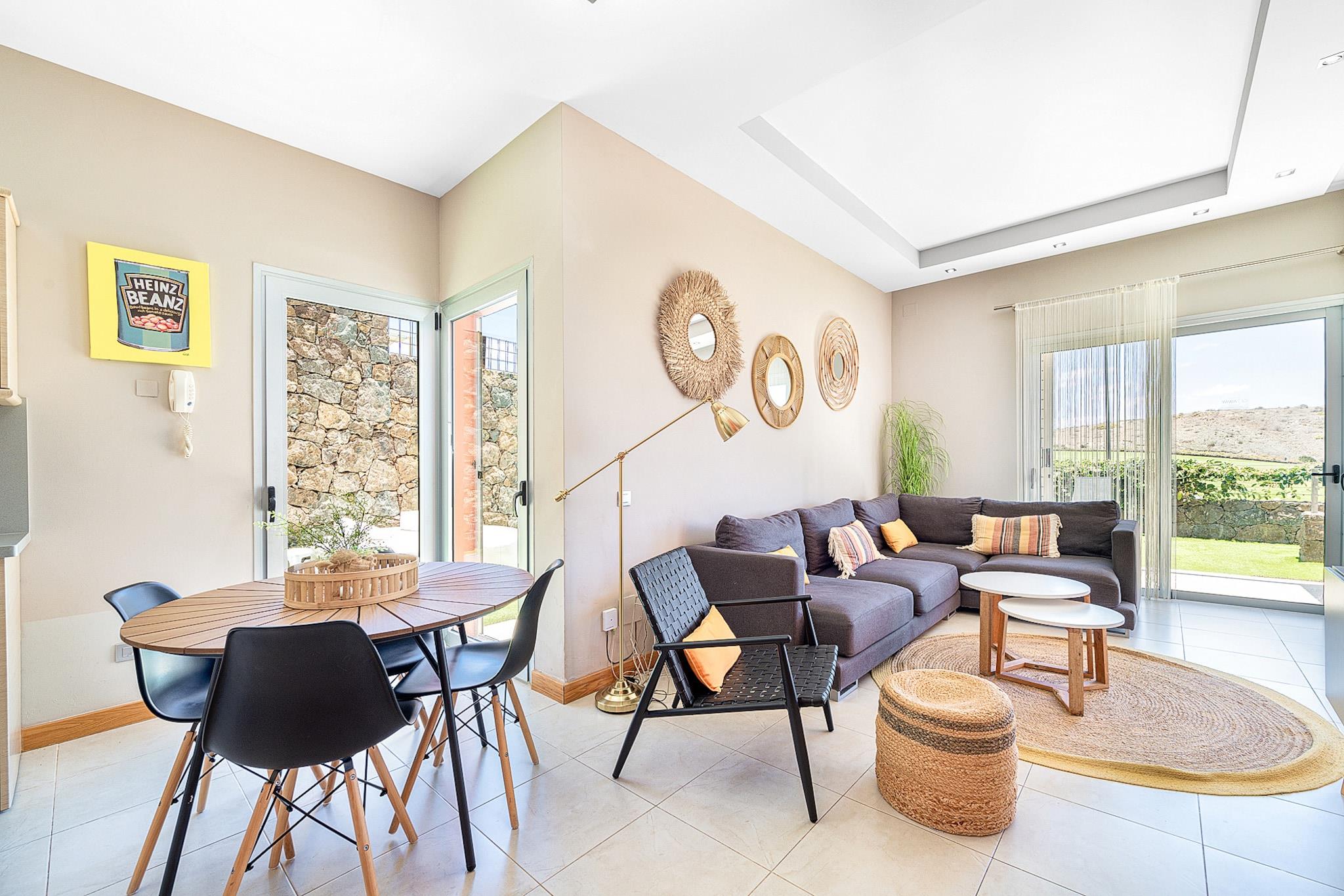 Beliggende i det eksklusive Salobre Golf-resort tilbyder denne lyse 2-værelses villa et enestående ophold for op til 4 gæster i de fredfyldte bakker i San Bartolomé de Tirajana. Med 102 m² veldesignet boligareal er villaen den perfekte blanding af ro, stil og komfort. Ejendommen er omgivet af panoramaudsigt over golfbanen, bjergene og kysten og tilbyder en virkelig privilegeret ramme for en fredelig flugt. Uanset om du leder efter en afslappende ferie eller en aktiv ferie, placerer denne familievenlige villa dig inden for rækkevidde af Gran Canarias bedste strande, fritidsfaciliteter og naturreservater. Villaen er omhyggeligt udstyret til at sikre et luksuriøst og selvforsynende ophold. Indvendigt byder layoutet i åbent plan på et moderne køkken med keramiske kogeplader, et køleskab, ovn, mikroovn, opvaskemaskine og komplet køkkenudstyr - perfekt til fælles måltider og underholdende. Villaen inkluderer også tre tv'er, satellitkanaler, Wi-Fi og aircondition for komplet komfort. Den mesterlige brug af naturligt lys og indendørs-udendørs flow skaber en lys og indbydende atmosfære. Træd udenfor for at nyde en 20 m² stor privat terrasse, en smukt anlagt have og din egen private opvarmede swimmingpool - ideel til at slappe af efter en dag på de nærliggende greens eller kystlinje. Placeringen er lige så imponerende. Du er kun 100 meter fra Salobre Golf, 7 km fra det rolige sand i Playa de Pasito Blanco og kun en kort køretur fra ikoniske steder som Playa de Maspalomas og Playa del Inglés. Nærliggende restauranter såsom Restaurante Sidecar og La Palmera Sur tilbyder lokale retter i topklasse, mens supermarkeder og fritidsparker som Aqualand og HolidayWorld sikrer bekvemmelighed og underholdning for alle.