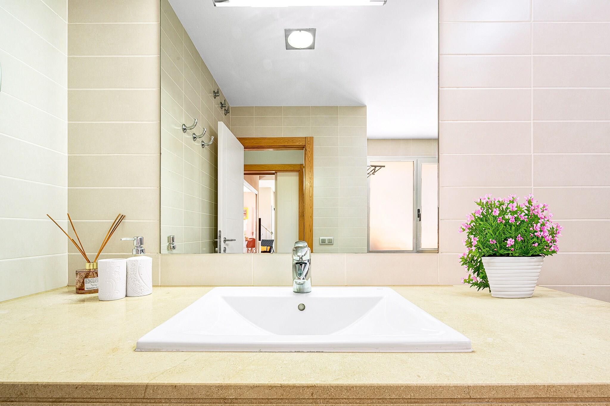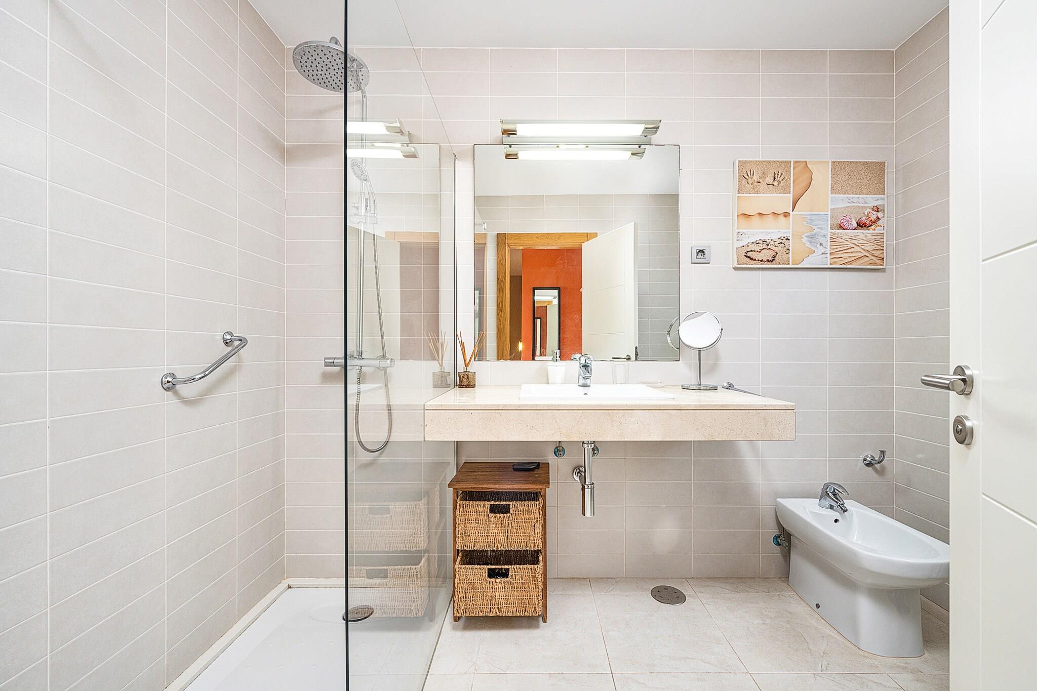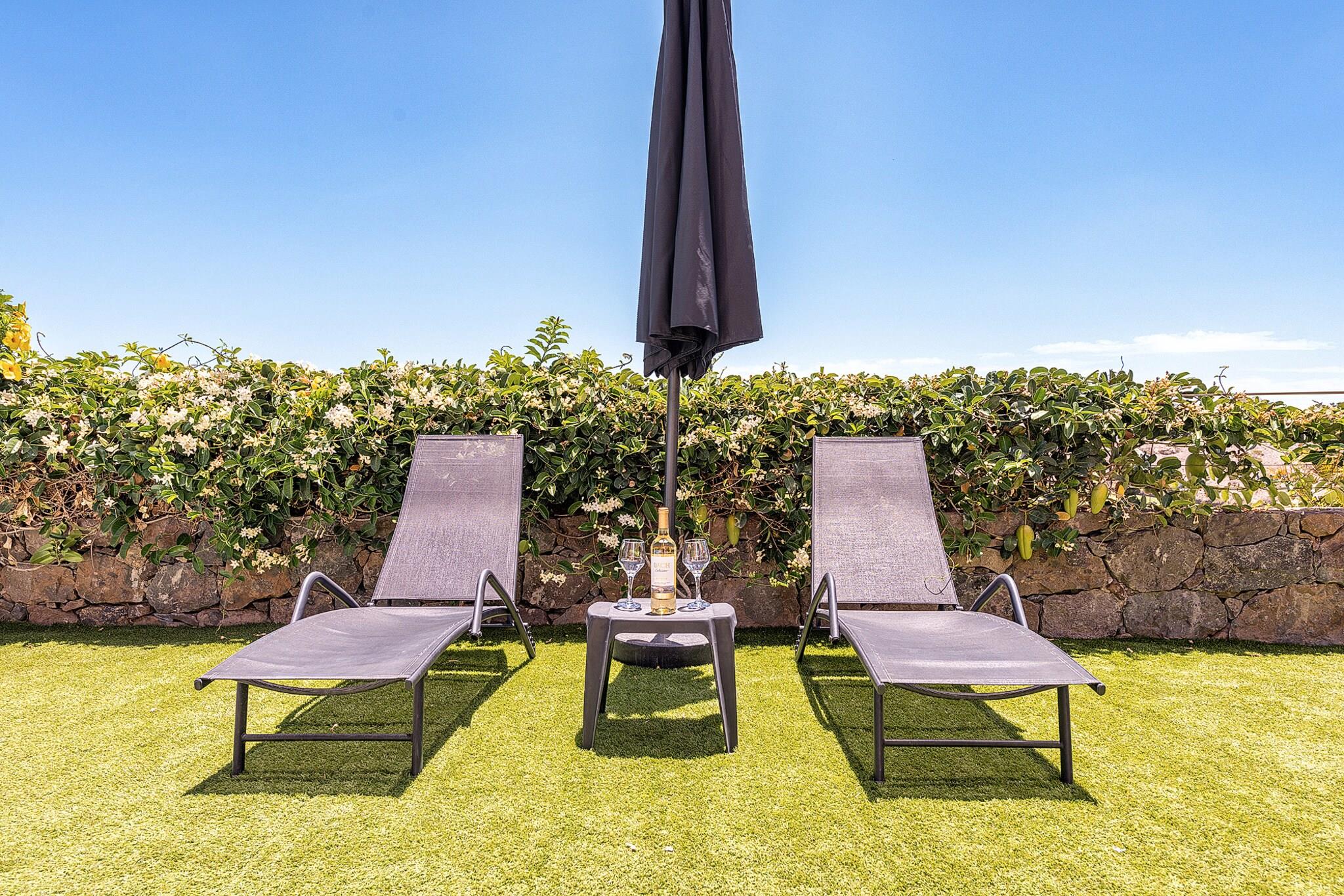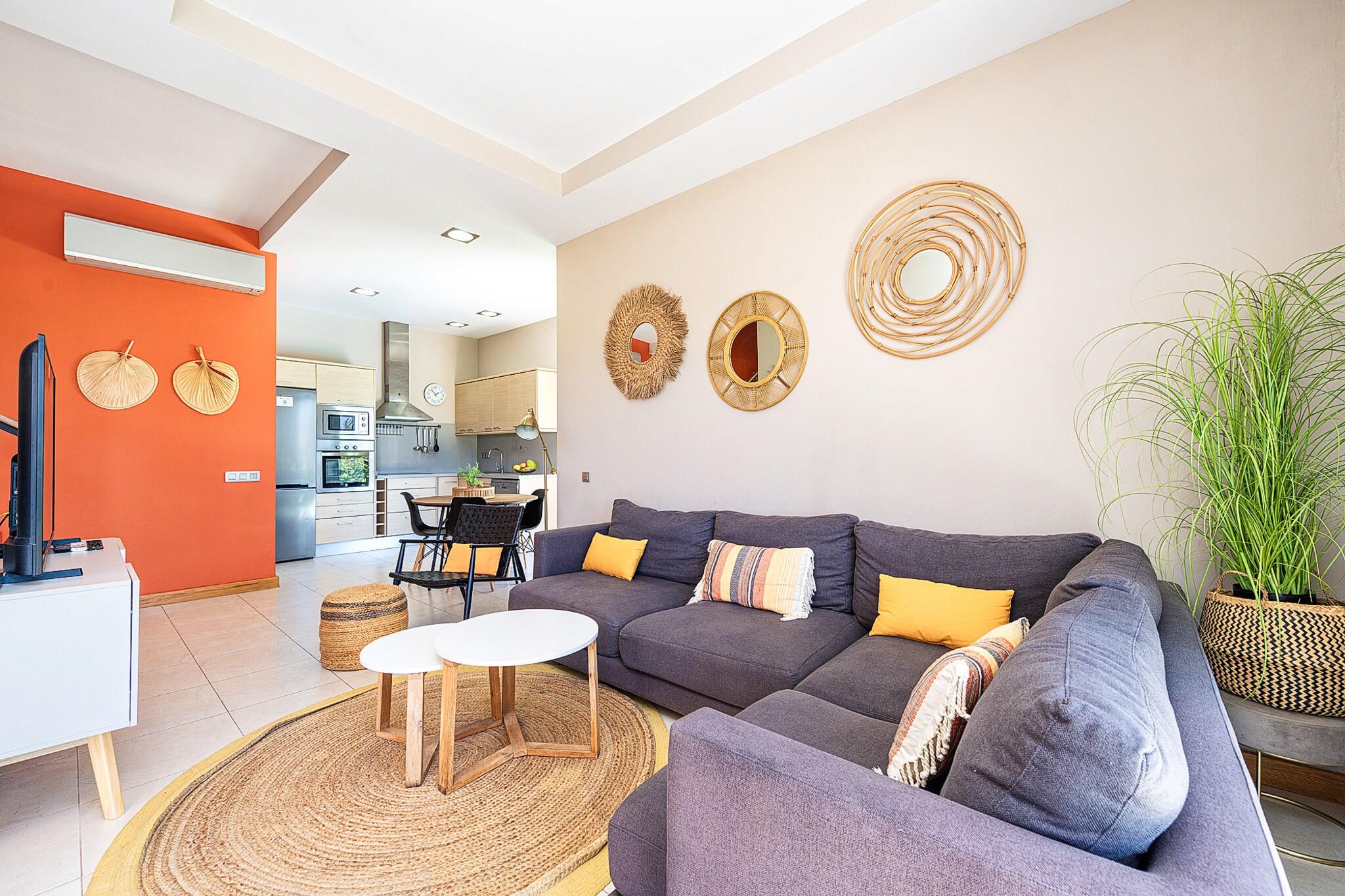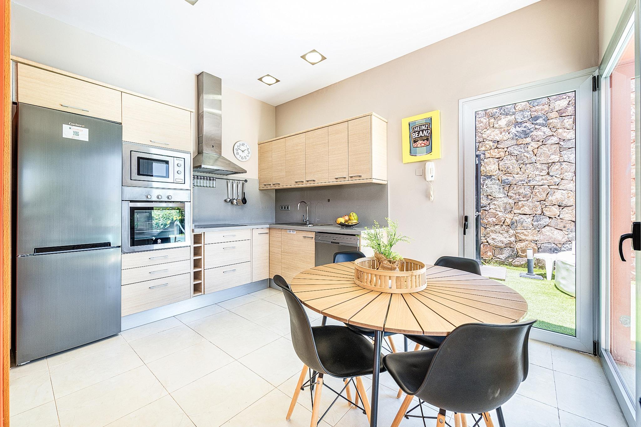 Beliggende i det eksklusive Salobre Golf-resort tilbyder denne lyse 2-værelses villa et enestående ophold for op til 4 gæster i de fredfyldte bakker i San Bartolomé de Tirajana. Med 102 m² veldesignet boligareal er villaen den perfekte blanding af ro, stil og komfort. Ejendommen er omgivet af panoramaudsigt over golfbanen, bjergene og kysten og tilbyder en virkelig privilegeret ramme for en fredelig flugt. Uanset om du leder efter en afslappende ferie eller en aktiv ferie, placerer denne familievenlige villa dig inden for rækkevidde af Gran Canarias bedste strande, fritidsfaciliteter og naturreservater. Villaen er omhyggeligt udstyret til at sikre et luksuriøst og selvforsynende ophold. Indvendigt byder layoutet i åbent plan på et moderne køkken med keramiske kogeplader, et køleskab, ovn, mikroovn, opvaskemaskine og komplet køkkenudstyr - perfekt til fælles måltider og underholdende. Villaen inkluderer også tre tv'er, satellitkanaler, Wi-Fi og aircondition for komplet komfort. Den mesterlige brug af naturligt lys og indendørs-udendørs flow skaber en lys og indbydende atmosfære. Træd udenfor for at nyde en 20 m² stor privat terrasse, en smukt anlagt have og din egen private opvarmede swimmingpool - ideel til at slappe af efter en dag på de nærliggende greens eller kystlinje. Placeringen er lige så imponerende. Du er kun 100 meter fra Salobre Golf, 7 km fra det rolige sand i Playa de Pasito Blanco og kun en kort køretur fra ikoniske steder som Playa de Maspalomas og Playa del Inglés. Nærliggende restauranter såsom Restaurante Sidecar og La Palmera Sur tilbyder lokale retter i topklasse, mens supermarkeder og fritidsparker som Aqualand og HolidayWorld sikrer bekvemmelighed og underholdning for alle.