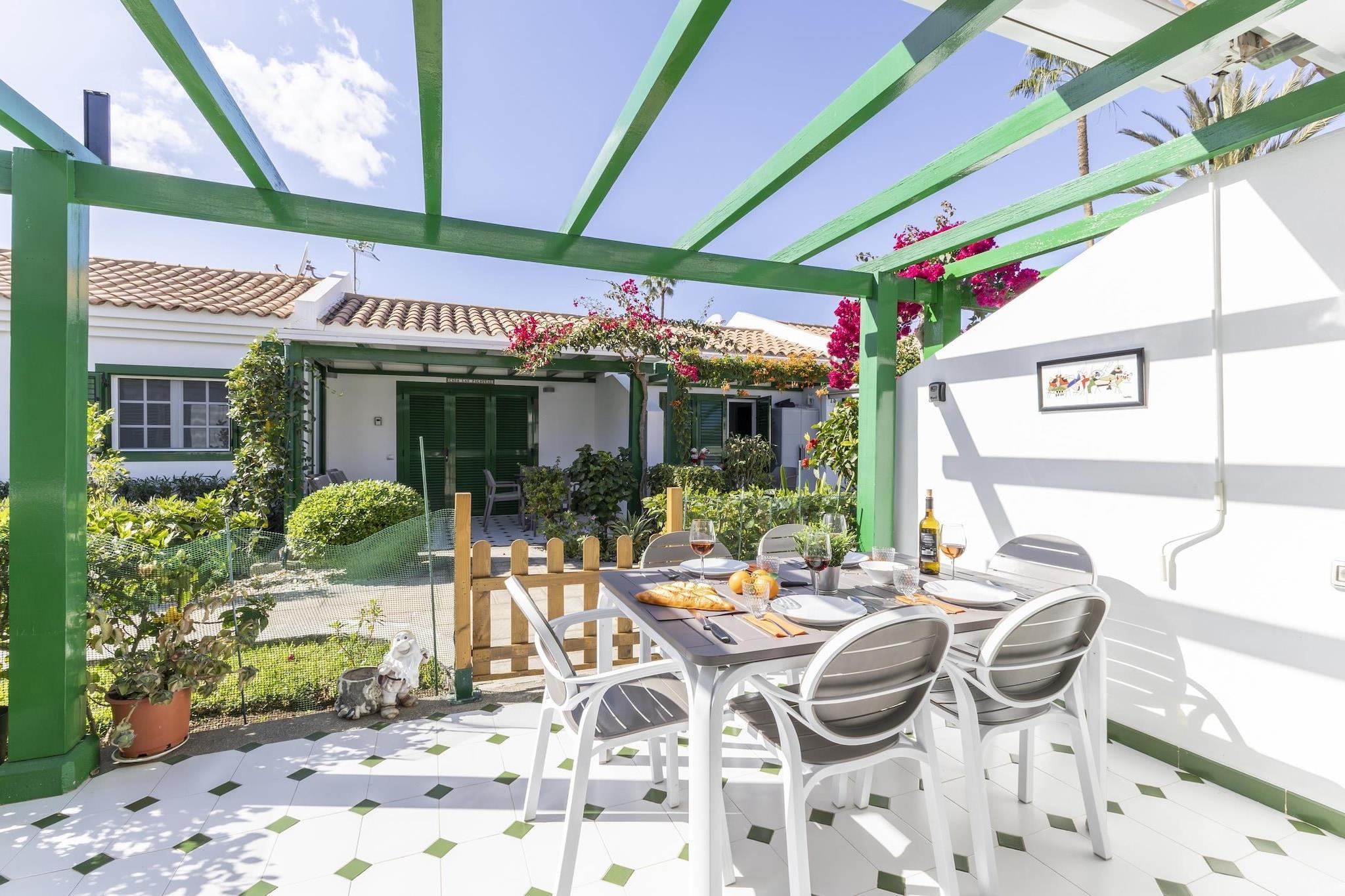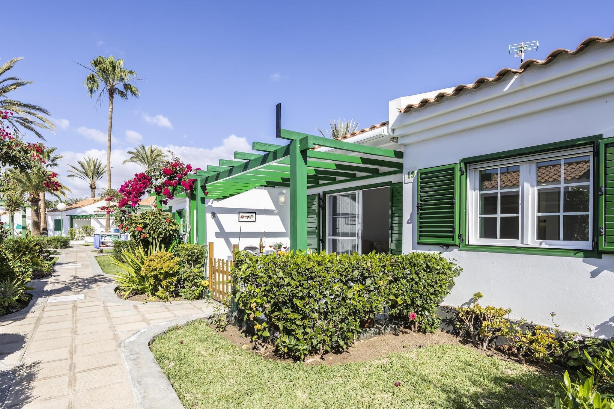 Denne smukt renoverede bungalow med et soveværelse tilbyder et sofistikeret og fredeligt tilflugtssted i hjertet af Campo Internacional. Hjemmet er designet med et moderne præg og er et perfekt fristed for par eller solorejsende, der værdsætter både stil og komfort. Den lyse stue, udstyret med aircondition og et Smart TV, flyder problemfrit over i et moderne åbent køkken, hvor du finder alt fra en espressomaskine til en opvaskemaskine. Dobbeltværelset fungerer som et roligt tilflugtssted, komplet med eget walk-in closet og klimaanlæg for at sikre den perfekte nats søvn efter en dag i solen. Livsstilen her er defineret af dens problemfrie inde-udendørs flow. Gå ud på din private terrasse for at nyde en stille morgenmad i morgenlyset eller et glas vin, mens aftenen sænker sig over palmerne. For de øjeblikke, hvor du vil køle af, har komplekset en fælles swimmingpool omgivet af velholdte haver. Hver detalje er blevet tænkt over for at sikre et problemfrit ophold, herunder et fuldt renoveret badeværelse, vaskeri og en dobbelt sovesofa i stuen for ekstra alsidighed. Beliggenheden er den sande stjerne ved denne ejendom, der placerer dig i en privilegeret position til både fritid og eventyr. Du er kun et minuts gang fra Maspalomas Golfbane, hvilket gør den til en drøm for entusiaster. En behagelig 18-minutters gåtur fører dig til de ikoniske Maspalomas-klitter og den gyldne strand, mens de elegante butikker og strandterrasser på Meloneras Boulevard kun ligger en kort gåtur derfra. Uanset om du søger spændingen i Holiday World eller roen i naturreservaterne, fungerer denne bungalow som den ultimative stilfulde base i det sydlige Gran Canaria.