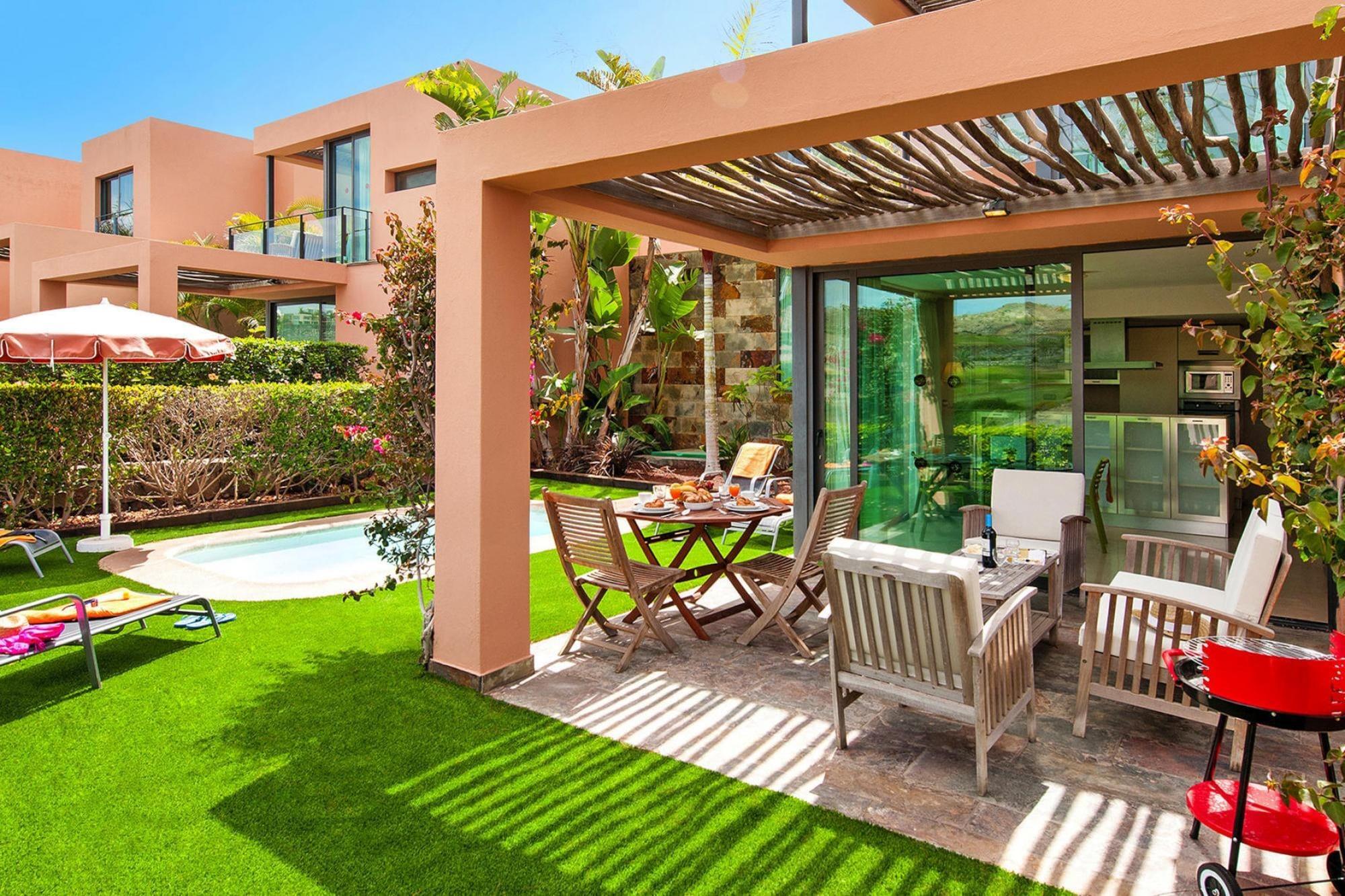 Ferievilla med udendørs pool og et lyst, moderne design med åben stue. Panoramavinduer indtil gulvet efterlader meget lys i huset og giver dig en smuk udsigt over omgivelserne. Hvem vil ikke gerne slappe af på terrassen med en god bog og en kop kaffe og så køle af i poolen? Golfspillere kan forbedre deres handicap under deres ferie, da villaen ligger lige ved golfbanen og som villagæst får du greenfeed-rabat. South Golf Course (18 huller) har en længde på 6.112 meter og et par på 71 slag, North Golf Course (18 huller) har en længde på 5.524 meter og et par på 72 slag. Maspalomas er den ældste badeby på Gran Canarias sydkyst og er kendt for sine enorme klitter, som er seks kilometer lange og en til to kilometer brede. Det 68 meter høje El Faro fyrtårn, bygget i 1889, knejser stolt i luften. Ved fyret ligger en oase kaldet "La Charca", hvor mange vandfugle yngler. Ligesom klitterne har den været under beskyttelse siden 1987. Højdepunkter! Ekstra inkluderet: alle forbrugsbaserede omkostninger, linnedpakke, slutrengøring, WIFI.