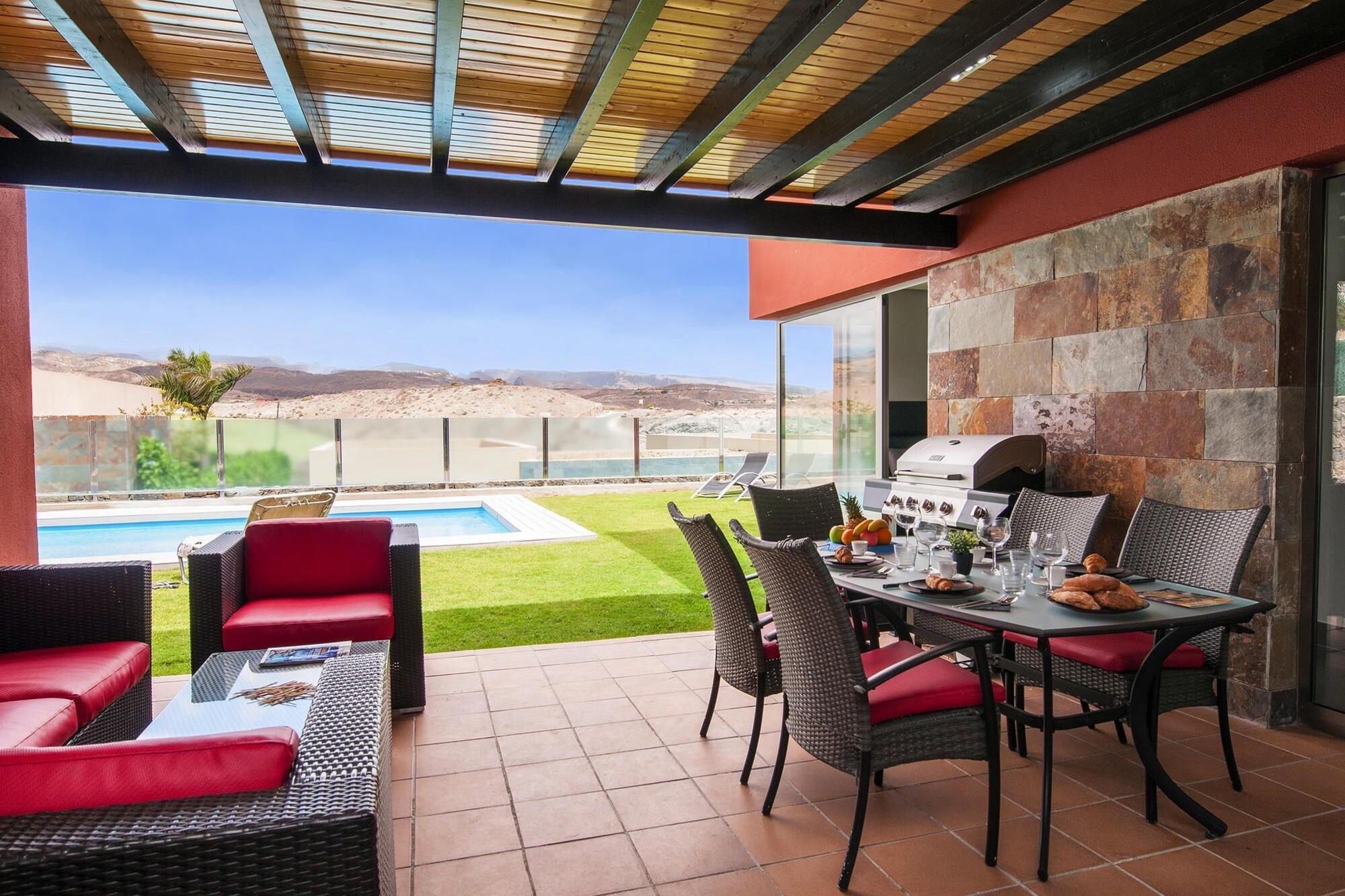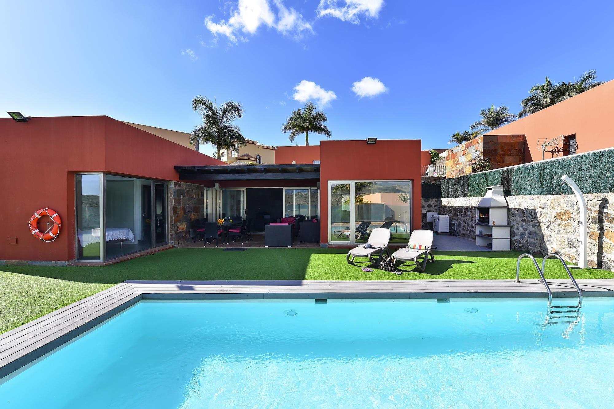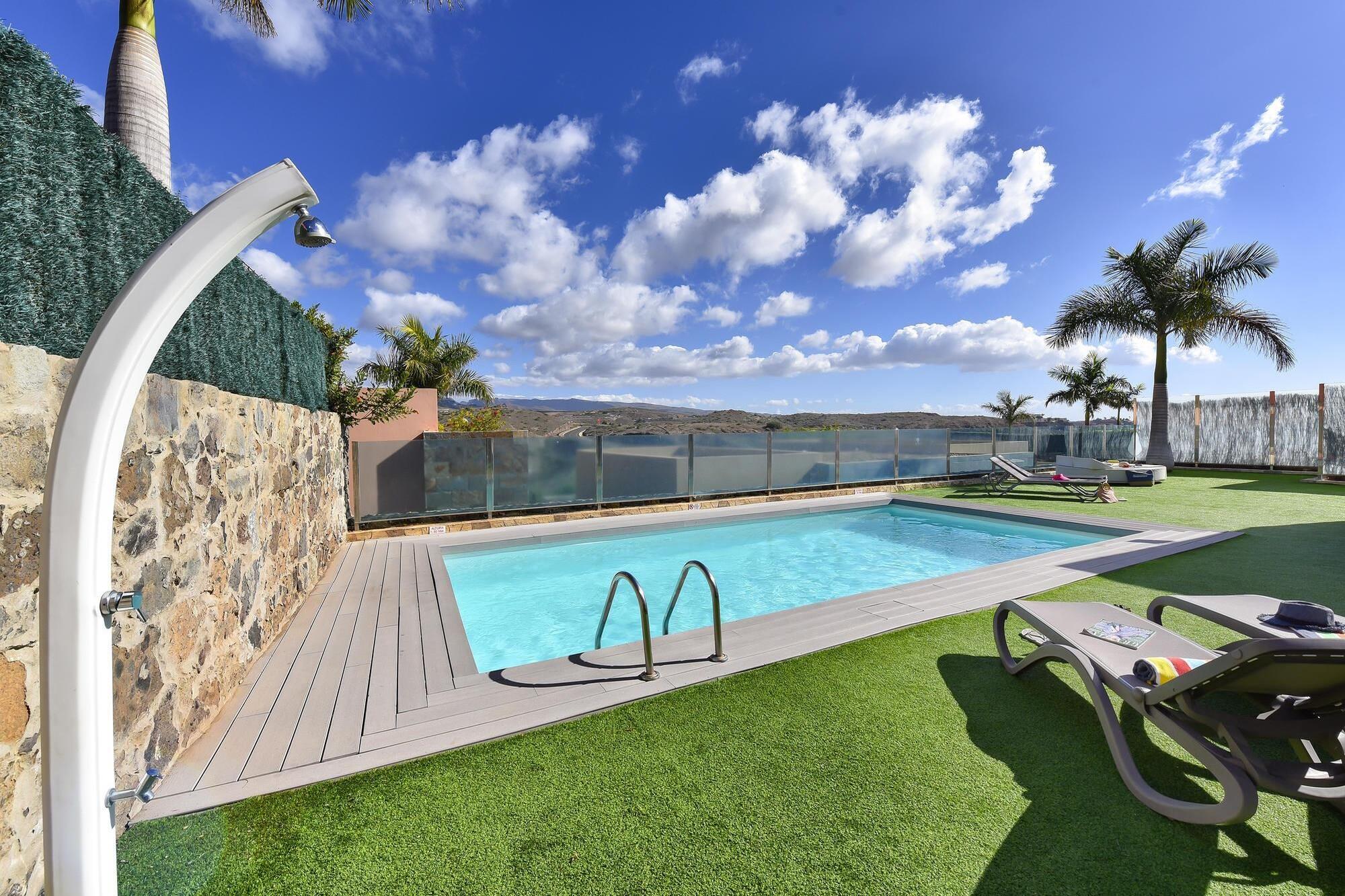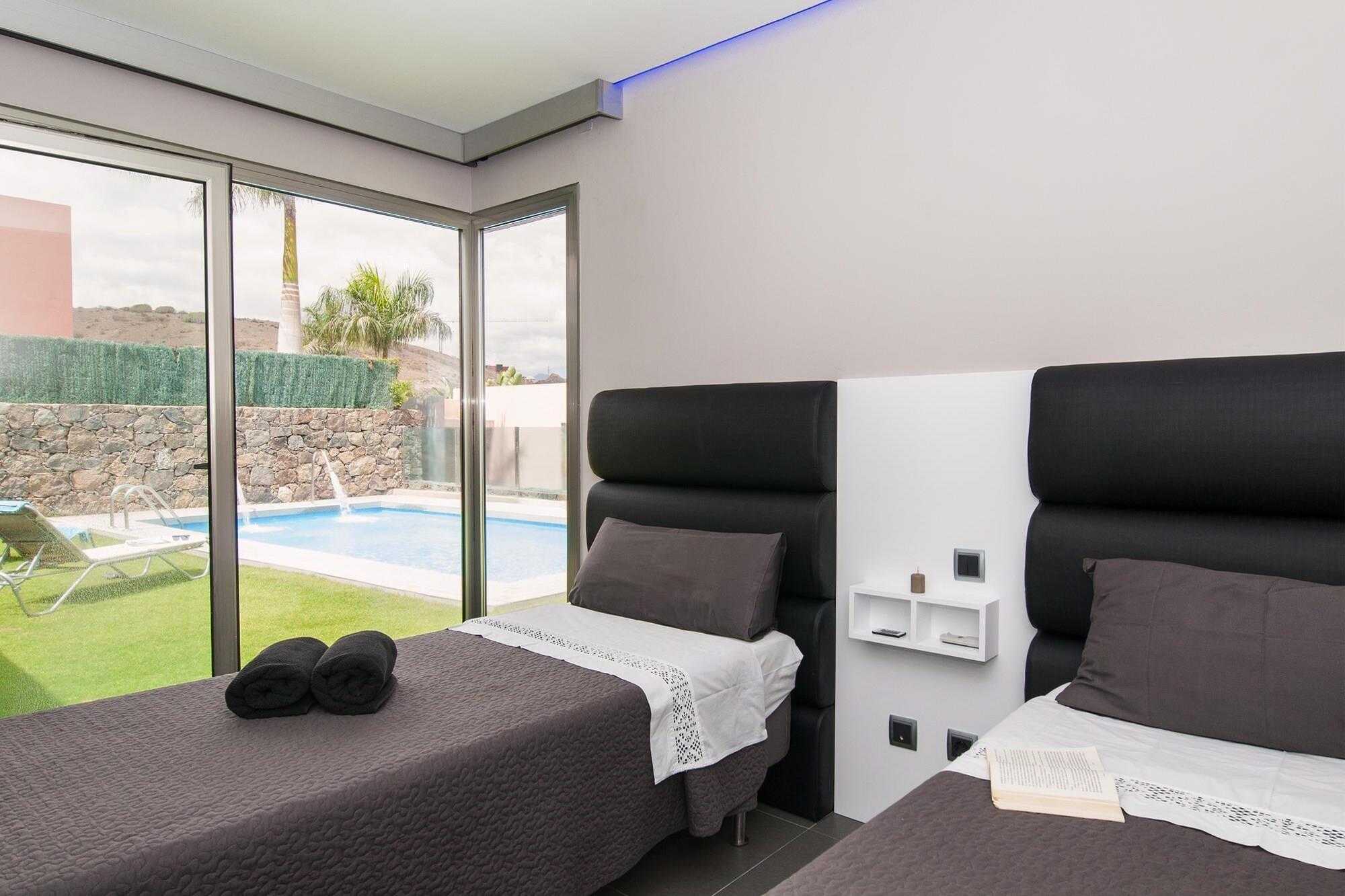 Stueetagen imponerer med sin moderne tærskel og en smuk have med en fantastisk udsigt. Der er ingen tvivl om, at en helt særlig ferie på Gran Canaria er garanteret. Nyd solen ved poolen eller på terrassen. Aircondition og satellit-tv, så intet står i vejen for et ubekymret ophold. Dette eksklusive boligkompleks i udkanten af golfresortet kommer i et unikt landskab i Maspalomas-bjergene. I umiddelbar nærhed kan du dagligt handle i supermarkedet, og i en restaurant vil du blive forkælet med kulinariske lækkerier. De populære turistcentre Maspalomas og Playa del Ingles kan nås på mindre end ti minutter i bil. Gæsterne i villaerne kan benytte de nordlige og sydlige golfbaner. Den sydlige golfbane (18 huller) er et par på 71 slag over 6.112 meter, den nordlige (18 huller) golfbane er 5.524 meter lang og har et par på 72 slag. Ekstra inkluderet: forbrugsbaserede energiomkostninger, sengelinned, håndklæder, slutrengøring og mellemrengøring, velkomstpakke, brødservice, 15 % reduktion af greenfee. Mobilitet: Ikke egnet til personer med begrænset mobilitet
