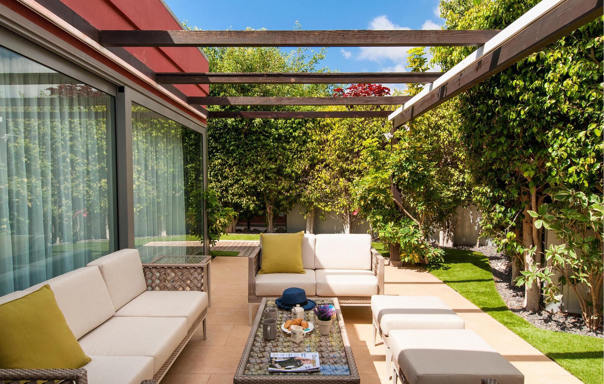 Det elegante udendørsområde er perfekt til at nyde det behagelige kanariske klima fra morgen til aften. Tag en afslappet dukkert i poolen om morgenen, genoplad batterierne på de komfortable liggestole og nyd forfriskende frugtjuicer i loungen. Snak over et glas vin indtil solnedgang, og oplev stemningsfulde grillmiddage på den charmerende terrasse.
