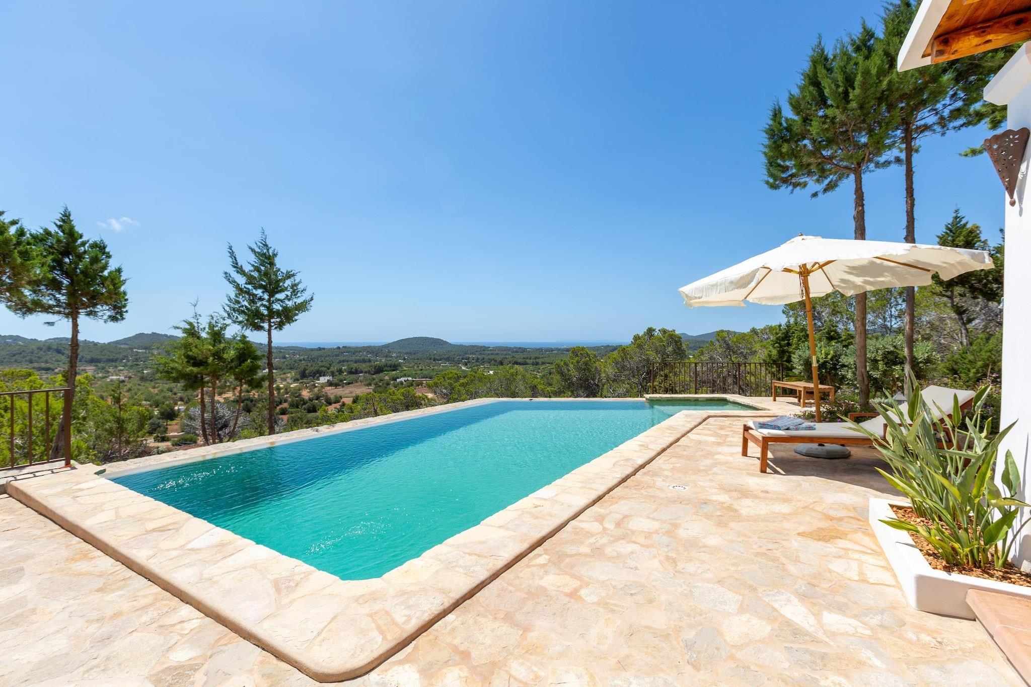 Smukt landsted bygget i stil med de gamle bondehuse, med tykke hvide vægge og lofter af sabinatræ. Det er det ideelle sted at slappe af og udforske denne rolige del af øen. Dette feriehus ligger på toppen af en bakke i et landligt område nær San Carlos. Selvom det kan virke meget isoleret, tager det kun et par minutter i bil at nå landsbyen og Santa Eulalia. Det er meget tæt på nogle af strandene i øst, såsom Aguas Blancas, Cala Llenya, Es Figueral og Cala Boix. Da landstedet ligger på et højere niveau, har det en fantastisk panoramaudsigt over øen og havet. Landstedet har en rummelig og lys stue og spisestue samt køkken. Der er også et vaskerum og et spisekammer. Der er også 3 soveværelser med dobbeltsenge, to komplette badeværelser, et med bruser og et med badekar. Alle tre soveværelser har aircondition. Køkkenet har et stort gaskomfur, opvaskemaskine og er fuldt udstyret. Derudover har det en separat hane til drikkevand. Køkkenet har adgang til den private pool. Stuen har en komfortabel sofa med chaiselong, satellit-tv og yderligere adgang til terrassen. Grunden omkring huset er stor og eksklusiv, uden naboer i nærheden. Ud over den private pool er der også et legeområde med legehuse. Der er også en overdækket terrasse med grill og spiseplads. Ideelt for familier, romantiske øjeblikke eller bare for at nyde en fredelig ferie i et unikt miljø. Kæledyr: Gæster skal kontakte HO for priser og tilgængelighed.