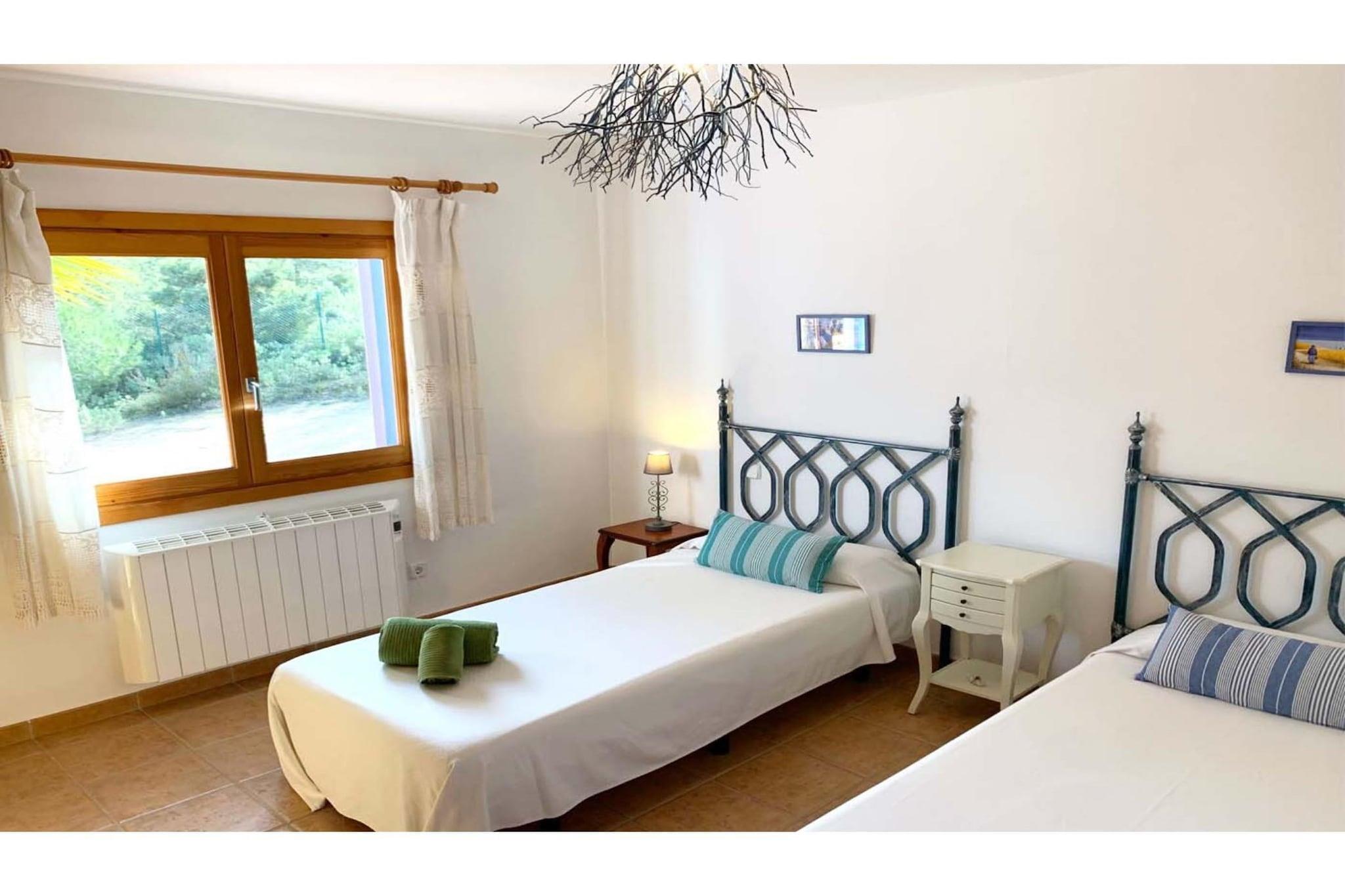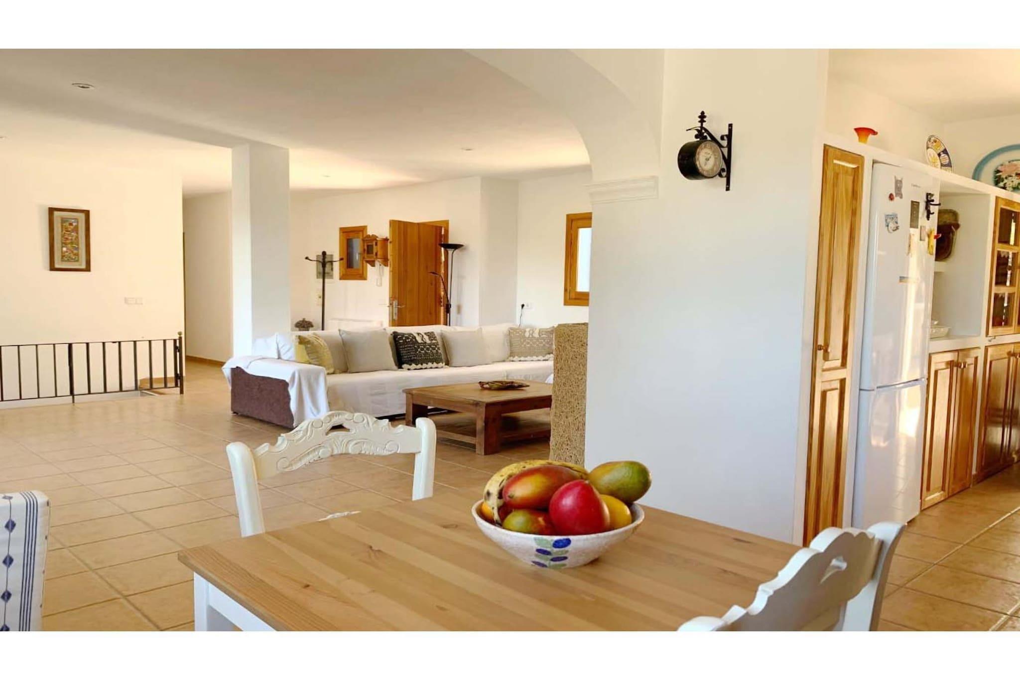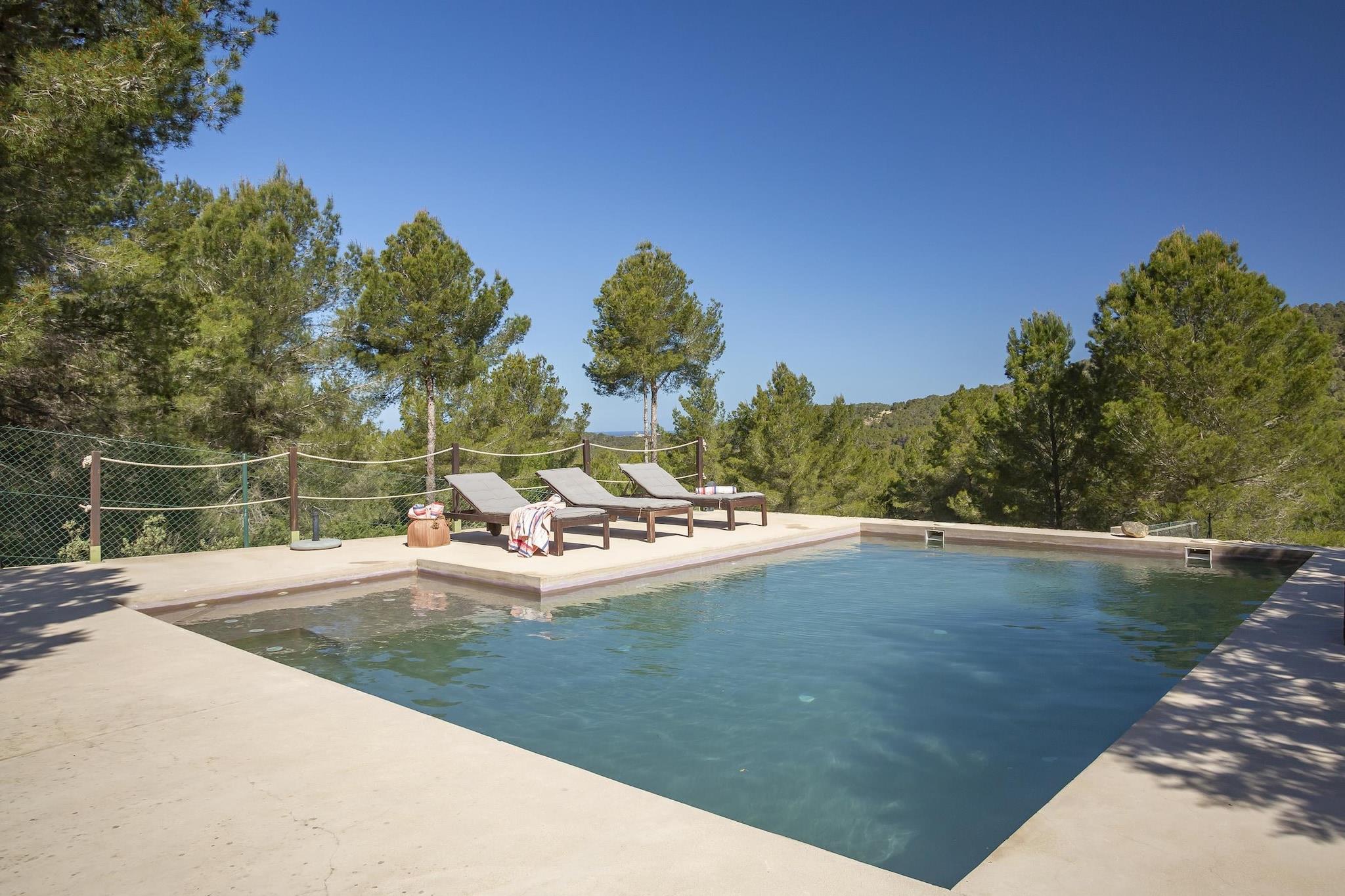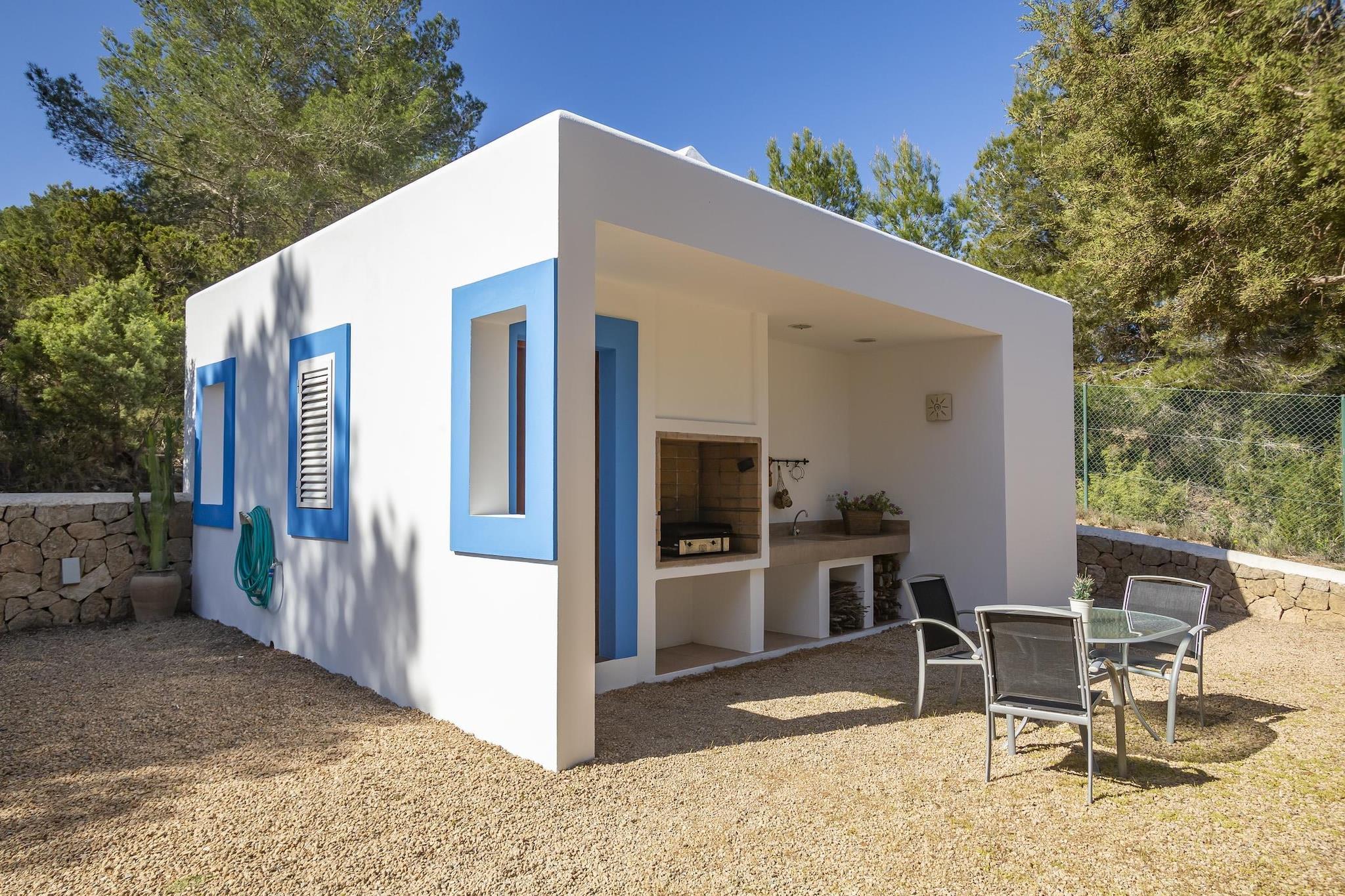Charmerende landsted på 130m2, på en grund på 13000m2, hus i Ibiza-stil med minimalistisk arkitektur, der bevarer friskheden med sine store terrasser og får huset til at smelte fuldstændigt sammen med den omgivende natur. Det har en Ibiza-veranda, hvor man kan nyde morgenmad, frokost eller aftensmad med udsigt over skoven og poolen, og man kan også se havet i det fjerne. Huset har en stor grillplads, omgivet af en fyrreskov, så roen og privatlivets fred gør huset til et særligt sted til afslapning. Det har en privilegeret beliggenhed på grund af sin nærhed til de smukkeste strande i den sydvestlige del af øen, Cala Tarida eller Cala Conta-stranden med de smukkeste solnedgange på øen. Den nærmeste by er San José, hvor man kan finde næsten alt, supermarkeder, banker, apoteker, caféer, fiskehandlere, slagtere, bagerier og et bredt udvalg af barer og restauranter. Den nærmeste restaurant S'Espartar ligger kun 3 minutters gang fra huset, en af de mest traditionelle middelhavsrestauranter i San José kommune. Huset har plads til 6 personer og har 3 dobbeltværelser: et værelse med en dobbeltseng på 1,35 m, et værelse med 2 enkeltsenge på 1,10 m og et tredje værelse med 90 cm senge. Det har to store badeværelser, hvoraf det ene har badekar og et udendørs toilet i nærheden af grillområdet. Fra stuen er der adgang til verandaen, hvor man kan nyde morgenmad, frokost eller aftensmad, samt pool- og grillområdet. Udendørsområdet har en swimmingpool, terrasser, grill, udendørs toilet og vaskeri. Huset har aircondition i alle værelser, wifi, fuldt udstyret køkken, sengelinned, badehåndklæder og poolhåndklæder. Bemærk: Kæledyr er kun tilladt efter anmodning. Kontakt venligst ejeren på forhånd angående tilgængelighed, antallet af tilladte kæledyr og det gældende gebyr, som kan variere afhængigt af kæledyrets type og størrelse.