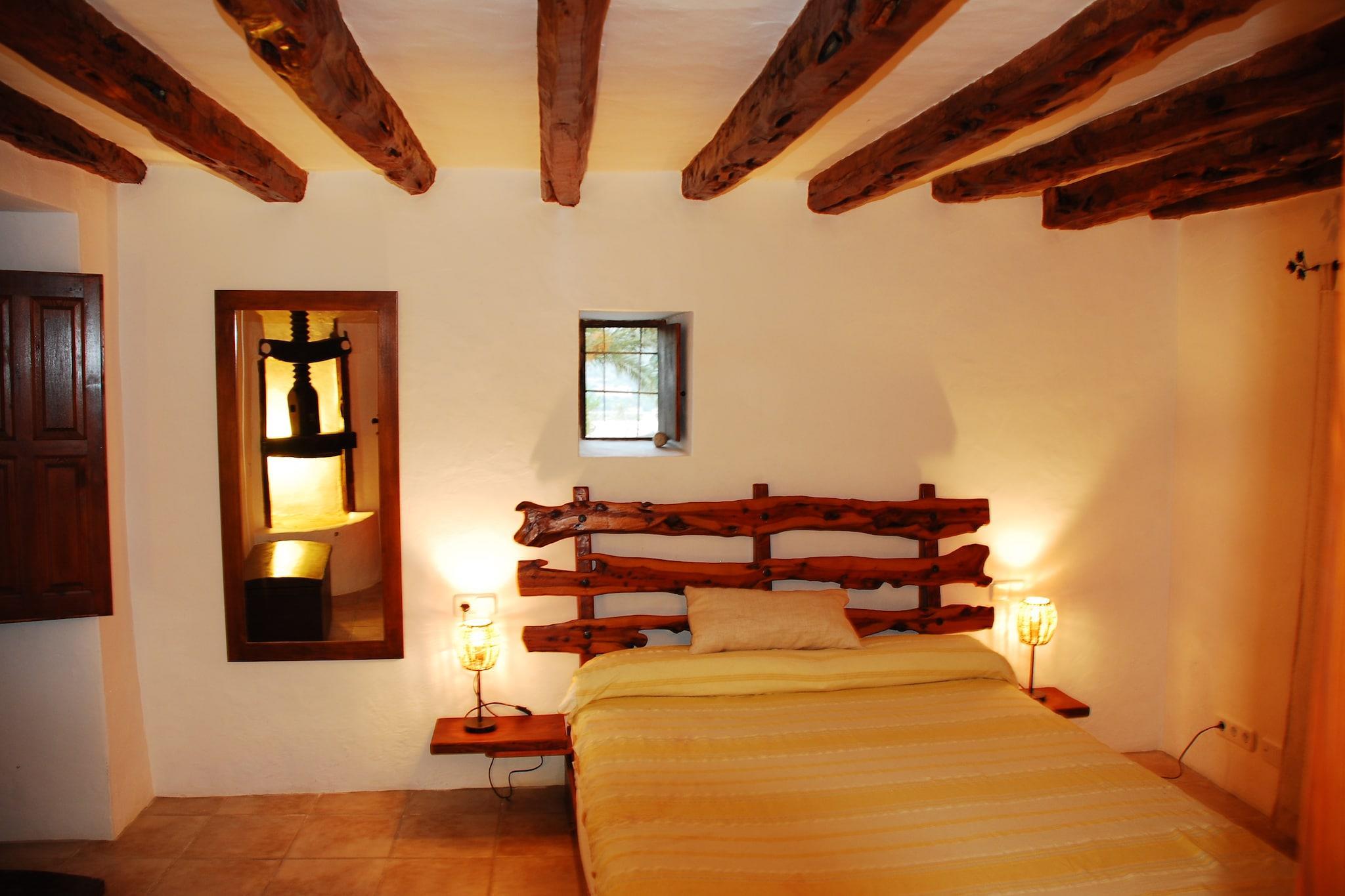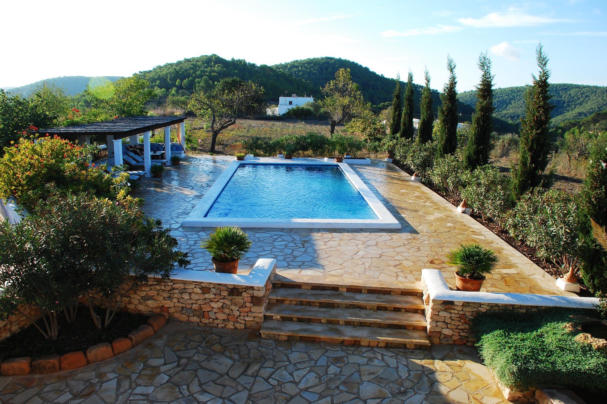 Can Palau er en unik Finca. Finca har en stor natursten terrasse med en (10 x 4 m) swimmingpool. Terrassen har et overdækket område med liggestole og et opholdsområde med udendørs køkken og grill. Der er også en dam. Du når Can Palau gennem en automatisk indgangsport, villaerne ligger inden for gåafstand fra San José med sine attraktive fortovscafeer, restauranter og butikker. De smukke strande Cala Jondal, La Cala Virgen og Es Torrent er alle i nærheden. De franske vinduer fører dig ind i den rustikke møblerede salon med sin L-formede sofa, brændeovn, satellit-tv og trådløs internetforbindelse. Det åbne køkken har en bar og åben pejs. Den er udstyret med gaskomfur, mikroovn, opvaskemaskine og køleskab med fryser. Spisepladsen har stereoanlæg. Der er et andet lille afslappende område over køkkenet. Det store soveværelse har en dobbeltseng, satellit-tv og aircondition og har eget badeværelse med bruser. Der er antikke møbler og et udgang til tagterrassen. Der er to dobbelte soveværelser nedenunder og et soveværelse med dobbeltseng, som har en indbygget antik vinpresse. Det vedlagte badeværelse har et bad med bruser. Der er opbevaringsplads udenfor med en vaskemaskine. Huset har sit eget vandreservoir.