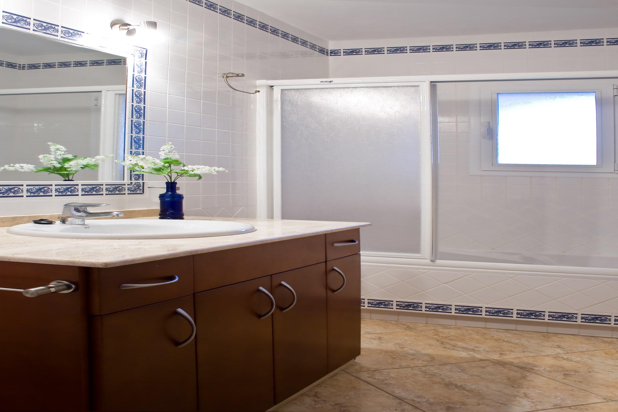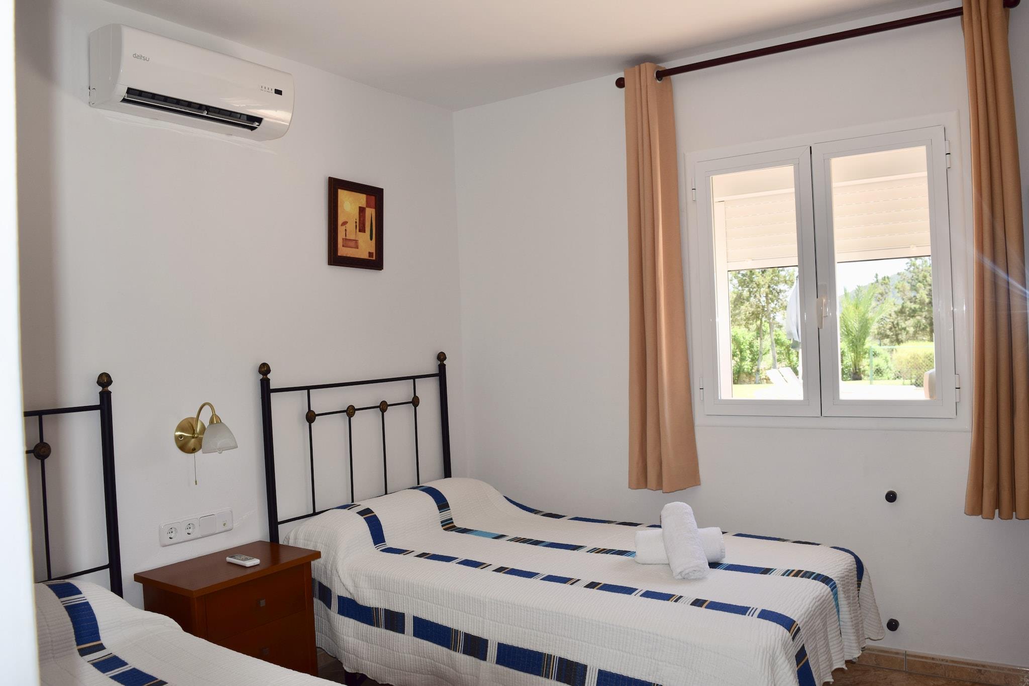 Stueetage: (Stue(Fjernsyn, sofahjørne, DVD-afspiller, CD-afspiller, klimaanlæg), Køkken(kaffemaskine, espressomaskine, ovn, combi-mikroovn, opvaskemaskine , 2x køle-fryseskab), soveværelse(dobbeltseng eller 2 enkeltsenge Senge, klimaanlæg), soveværelse(dobbeltseng eller 2 enkeltsenge Senge, klimaanlæg), badeværelse(badekar eller bruser, håndvask, toilet, bidet), tørretumbler, vaskemaskine, patio, strygebræt, strygejern) På 1. etage: (soveværelse(dobbeltseng(150 x 190 cm), klimaanlæg), Soveværelse med badeværelse(dobbeltseng(180 x 190 cm), bruser, toilet, klimaanlæg), havestue/veranda) swimmingpool(privat, 10 x 5 m., opened from May upto and including Oct)