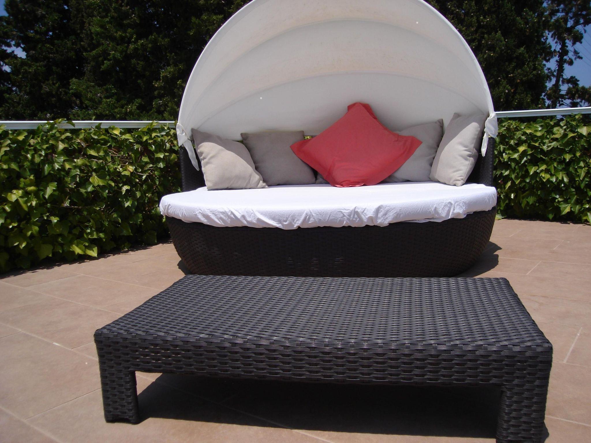 The interior of this holiday home spans a generous 180 m² across two levels, ensuring ample space for comfort and relaxation. On the ground floor, you will find a spacious, open-plan living area that includes a comfortable sofa and an ample dining table with plenty of seating, perfect for gatherings. The modern, fully-equipped kitchen with its latest appliances, including a ceramic hob, oven, large refrigerator, microwave, toaster, and dishwasher, makes cooking a breeze. Also, there's a convenient bathroom with a shower on this level. Upstairs, the house boasts a cozy bedroom with a double bed, two additional bedrooms each with two single beds, and a large bathroom equipped with a bathtub. Each bedroom provides direct access to a terrace, offering a private space to enjoy the outdoors.